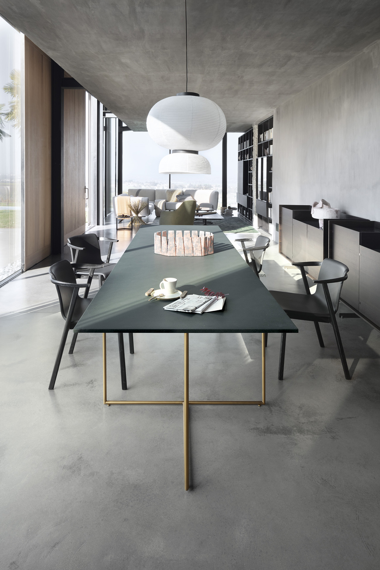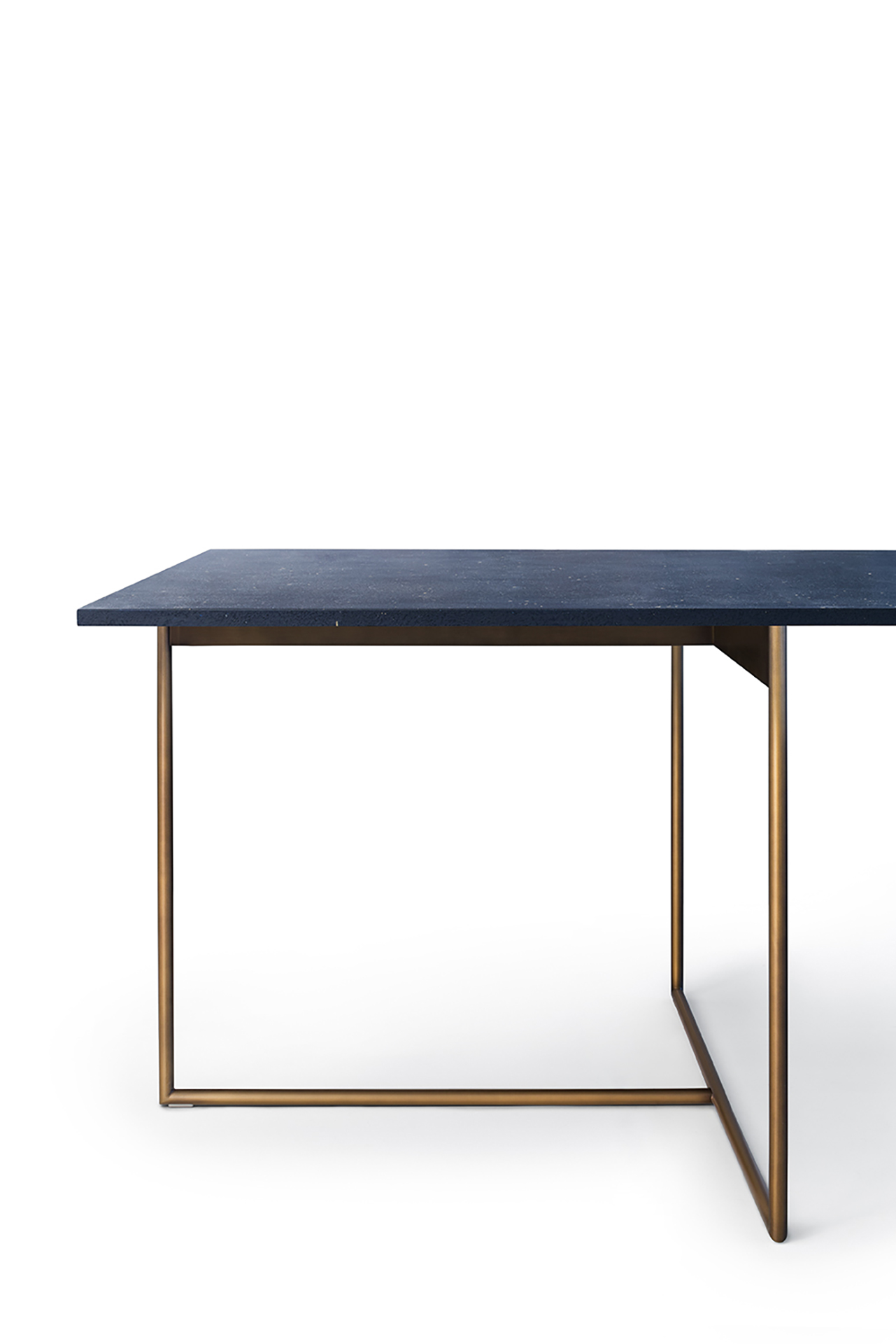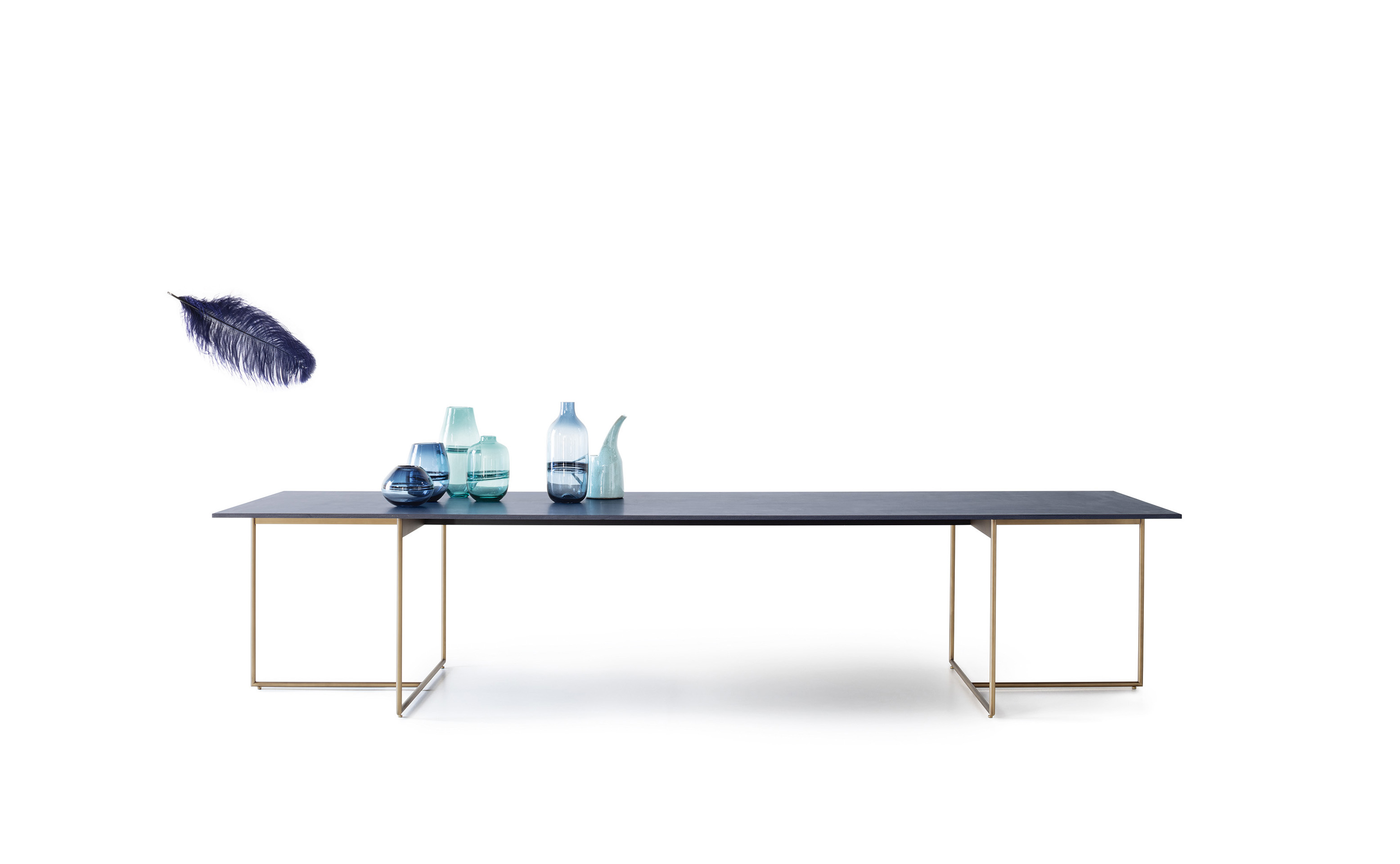 Designed by David Lopez Quincoces, the Alamo table is inspired by the decorative codes of the 40’s when reinterpreted with minimal contemporary style. This table has an art-deco spirit and a magnetic charm for sophisticated and meticulous lines. The designer’s study was focused on the theme of lightness: the elegant structure and the tabletop have essential lines, creating a timeless design object that has been given added appeal by the combination of different materials. The structure is in bronze-coated painted metal while the top presents a brand-new grain-effect top. Made of stratified aluminium, it is characterized by a new and exclusive tactile finish, composed of resin, pigmented marble powder and shavings of precious metals. Proposed in three enticing colour options inspired by natural stone blue Lapislazzuli, green Malachite and black Belgian blue.