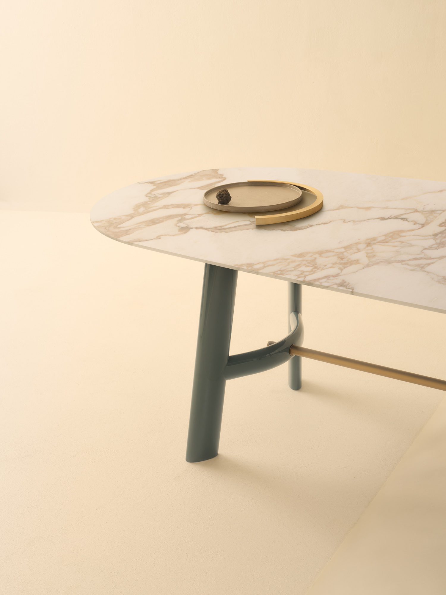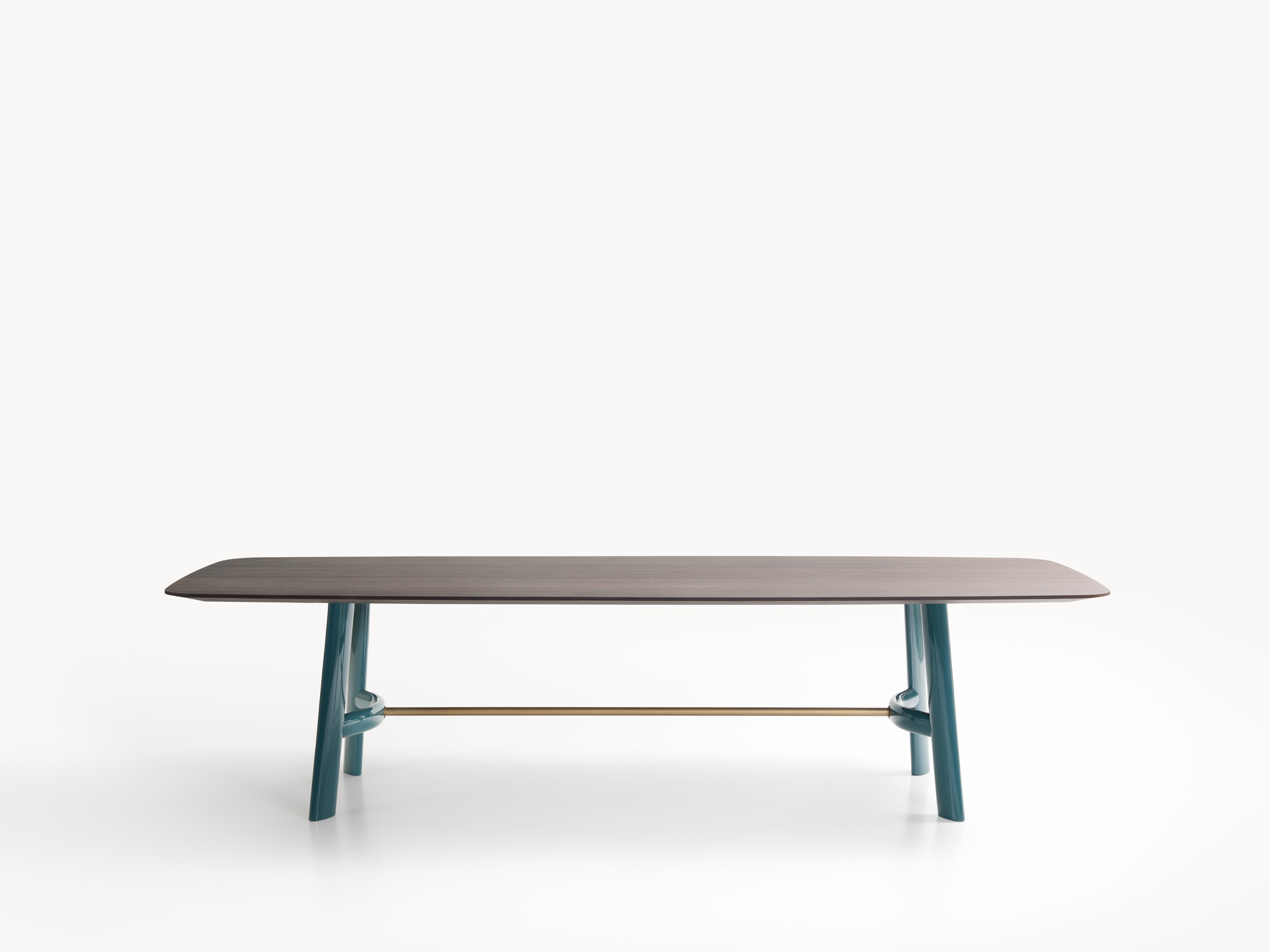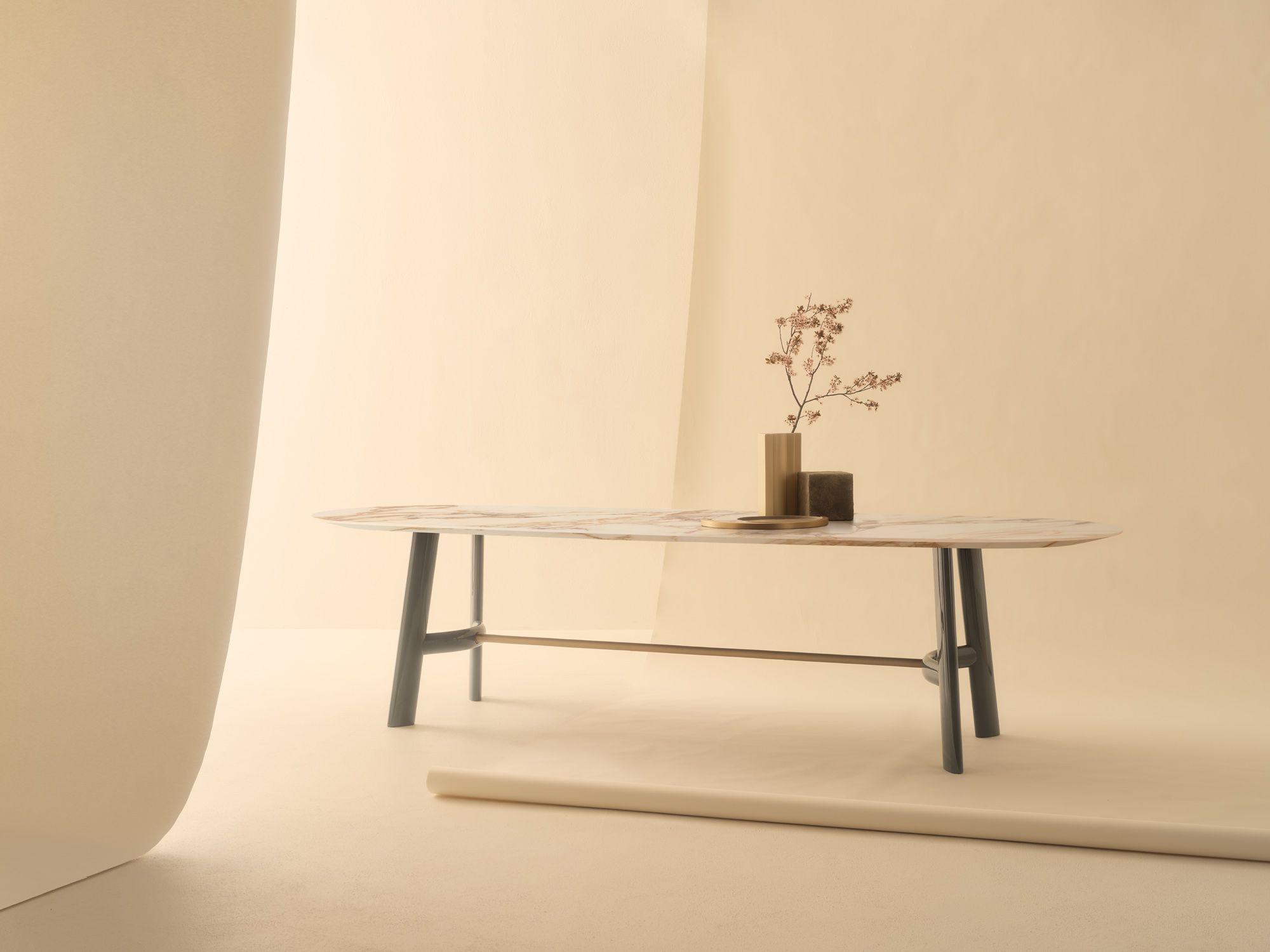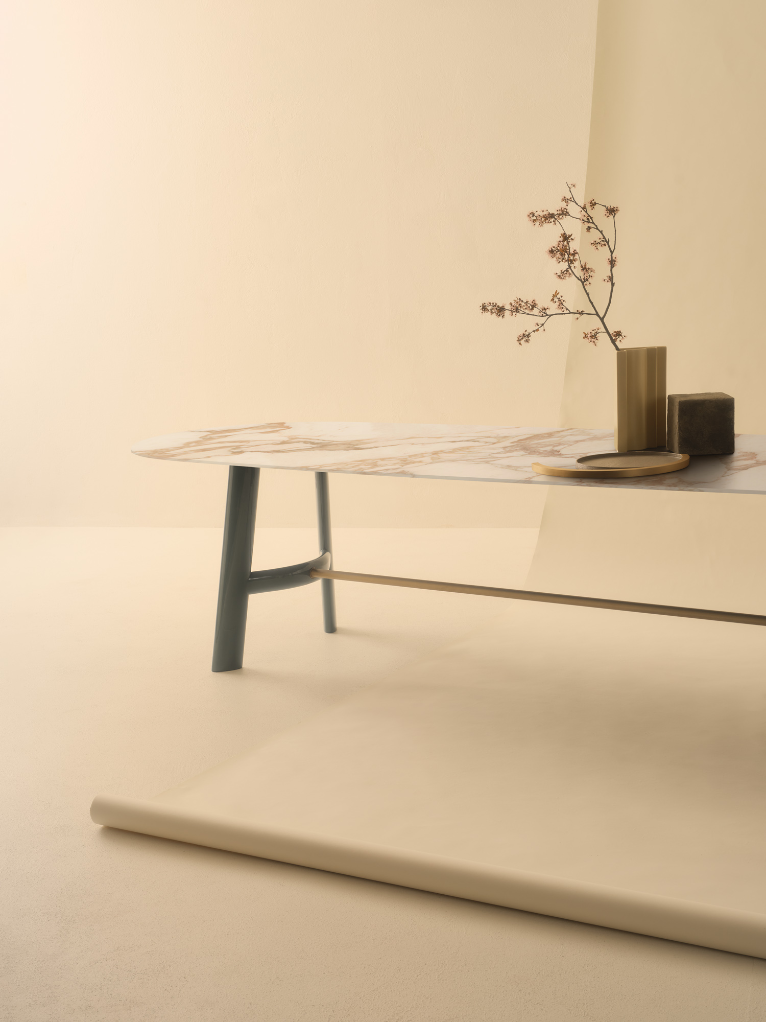 August, designed by Roberto Lazzeroni, embodies the “complex simplicity” of the classic trestle table. Featuring a thin, lightweight top available in various sizes and materials such as marble and wood, it balances elegance with functionality. The patinated bronze trestle supports, connected by a subtly curved wooden crosspiece, express the table’s refined aesthetic. Glossy lacquered legs complement the diverse range of tops, allowing for personalised combinations of matte and glossy finishes that adapt seamlessly to any setting, making each piece uniquely expressive.