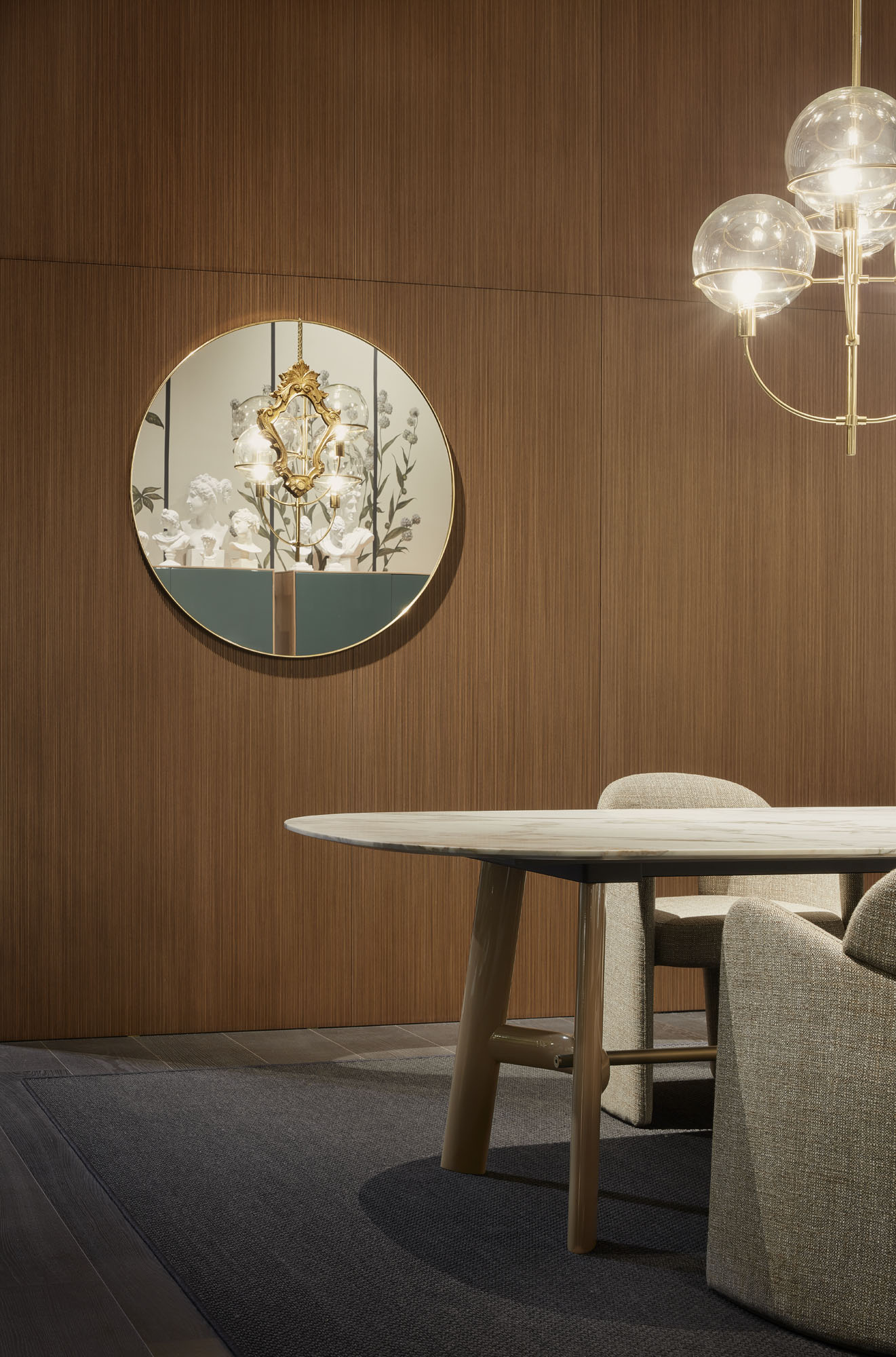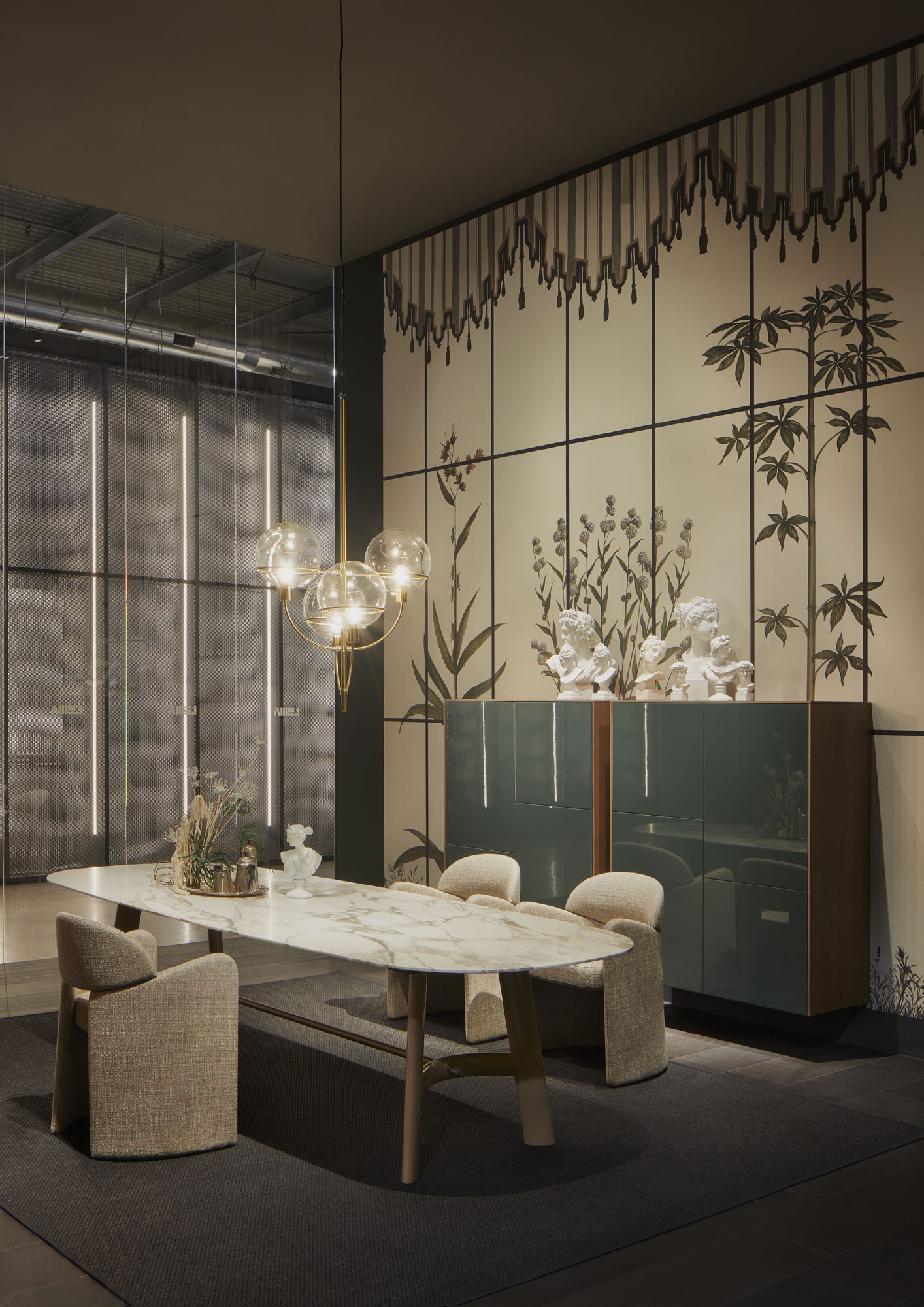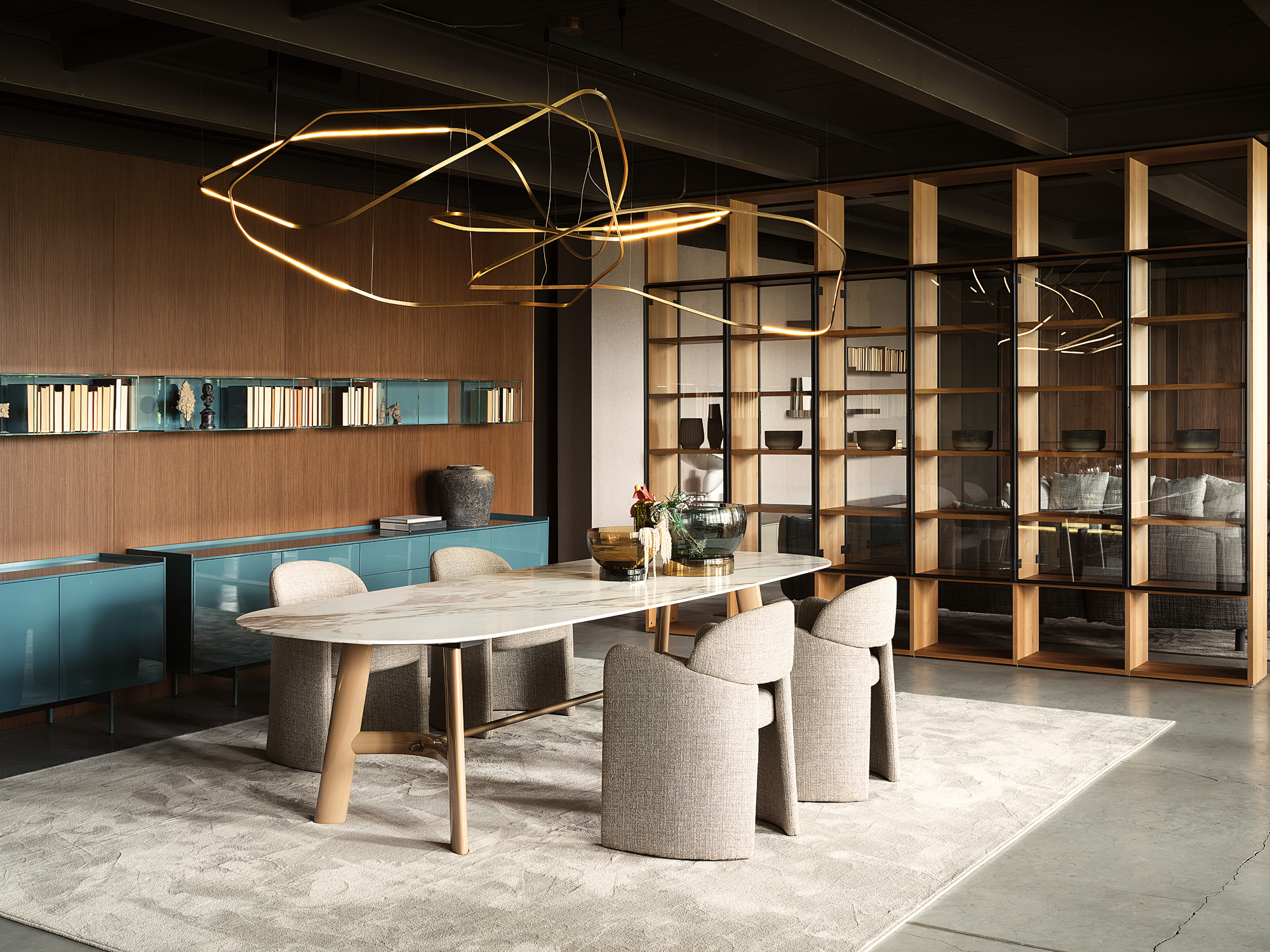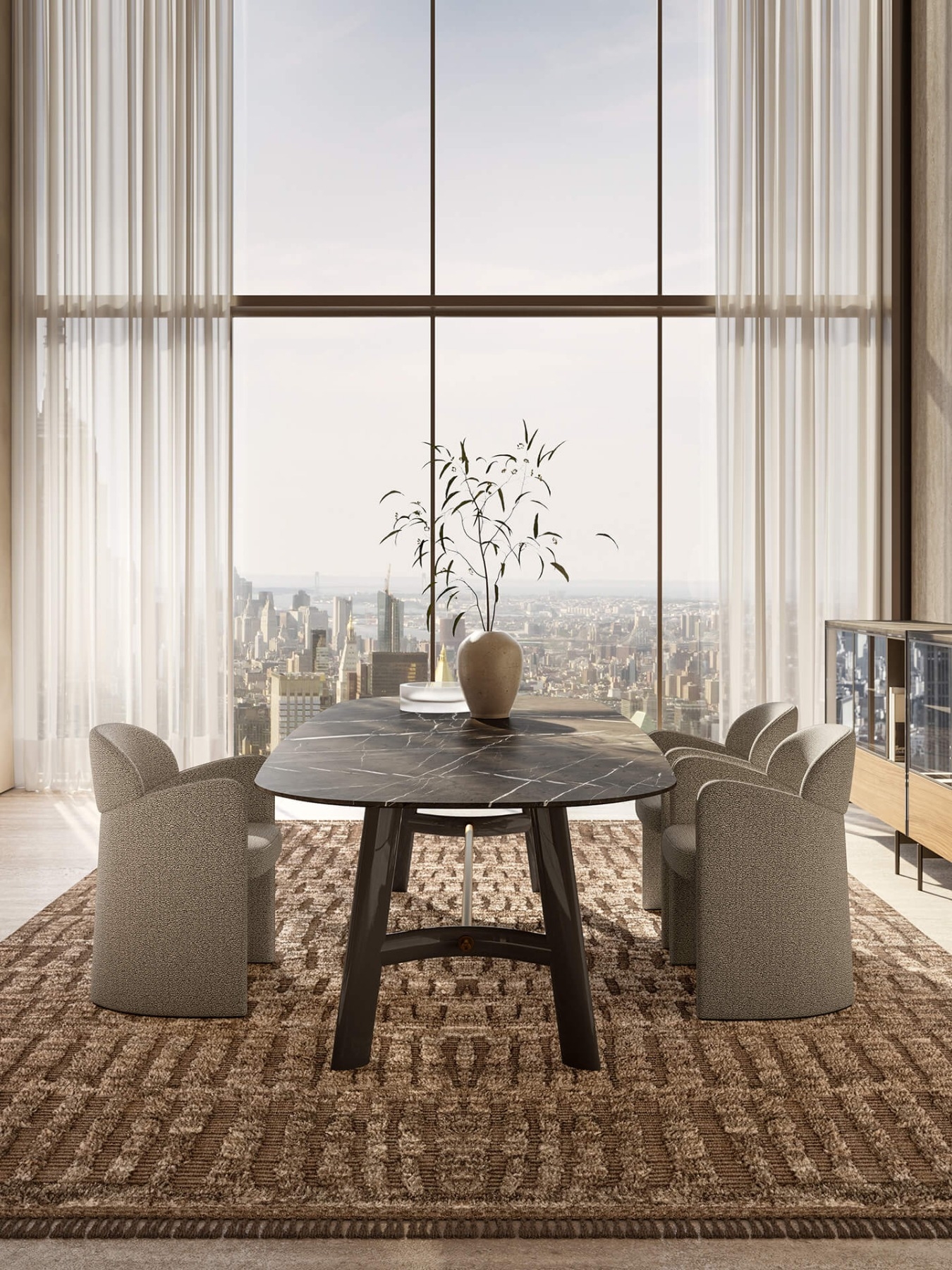 August, designed by Roberto Lazzeroni, embodies the “complex simplicity” of the classic trestle table. Featuring a thin, lightweight top available in various sizes and materials such as marble and wood, it balances elegance with functionality. The patinated bronze trestle supports, connected by a subtly curved wooden crosspiece, express the table’s refined aesthetic. Glossy lacquered legs complement the diverse range of tops, allowing for personalised combinations of matte and glossy finishes that adapt seamlessly to any setting, making each piece uniquely expressive.