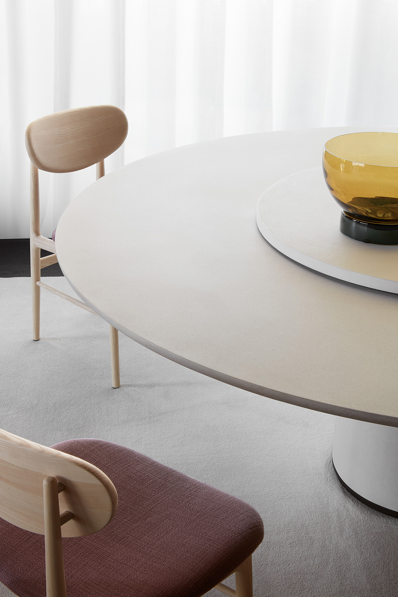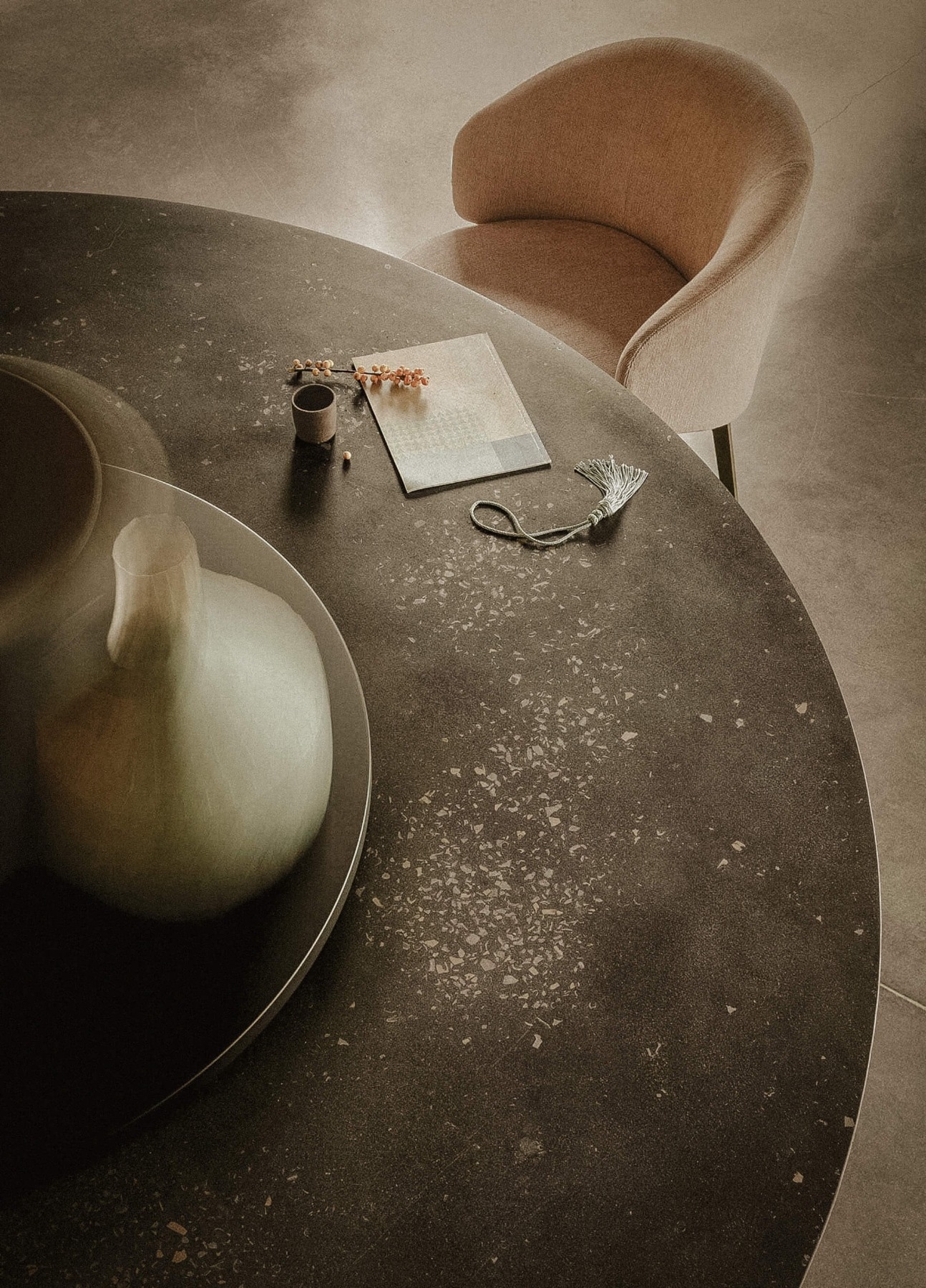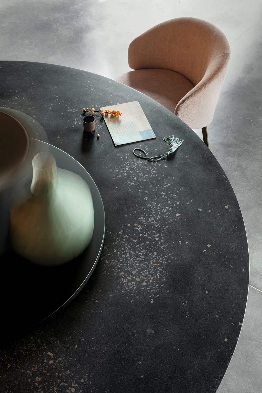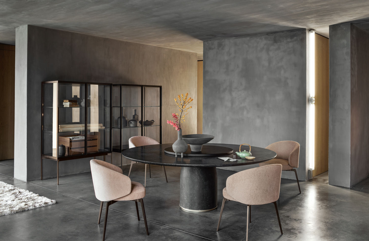 Designed by Chiara Andreatti, the Bulè table fuses the east with the west. With its harmonious and stylistically generous forms, Bulè stands out for its tabletop and central structural base that is made in the sophisticated black Belgian Blue finish. The revolving tray placed on the tabletop is the epitome of oriental culinary culture and modernity. Bulè’s base has been enhanced by a bronze-coated painted metal molding.
