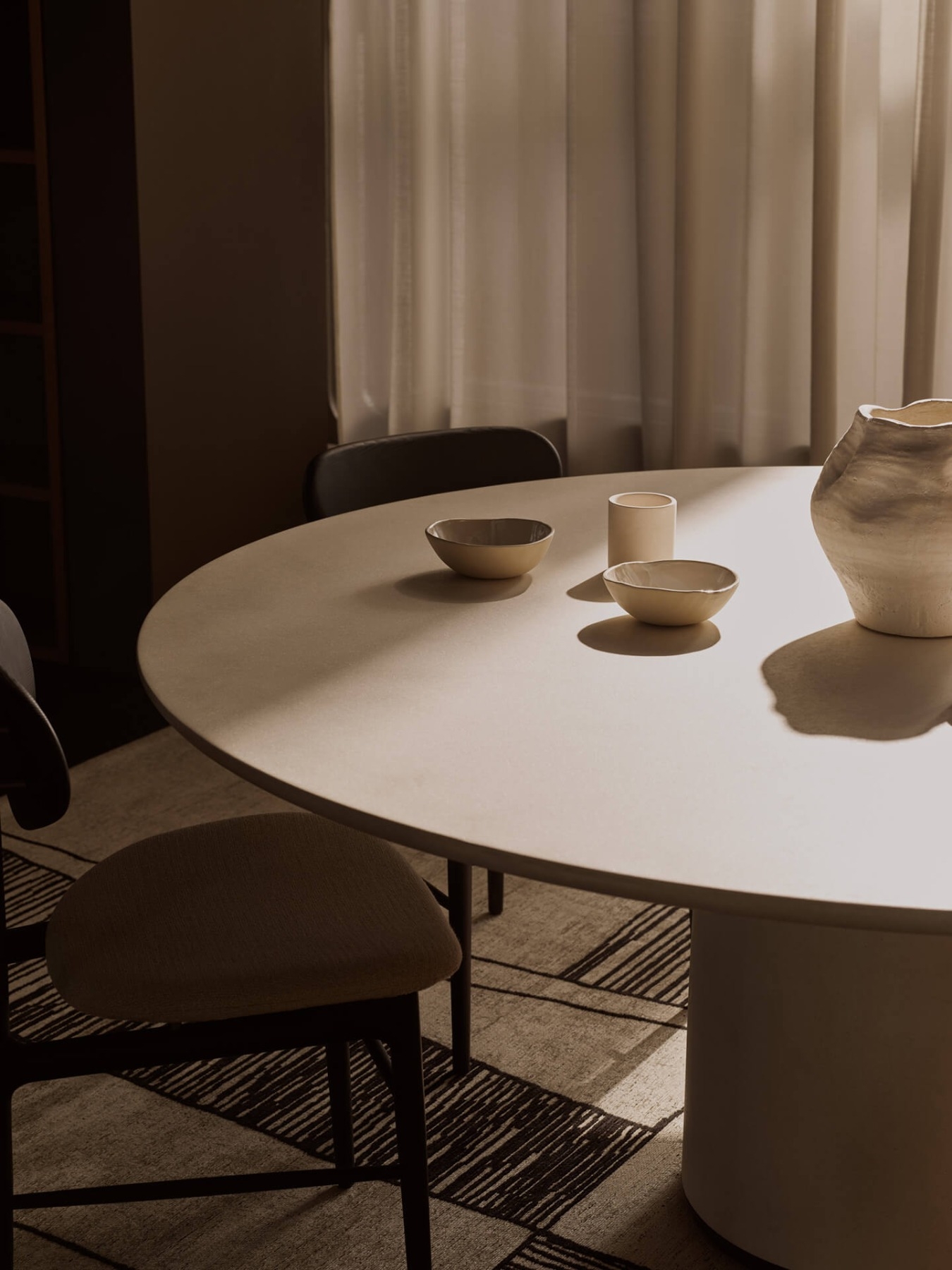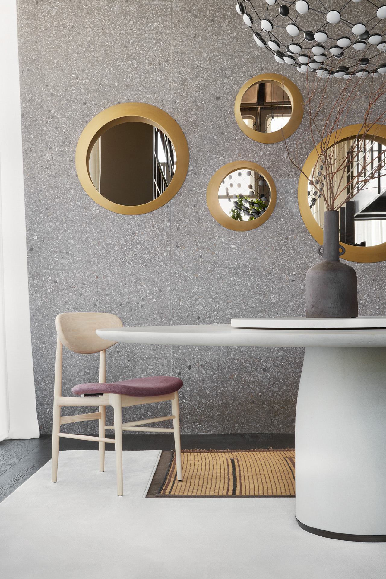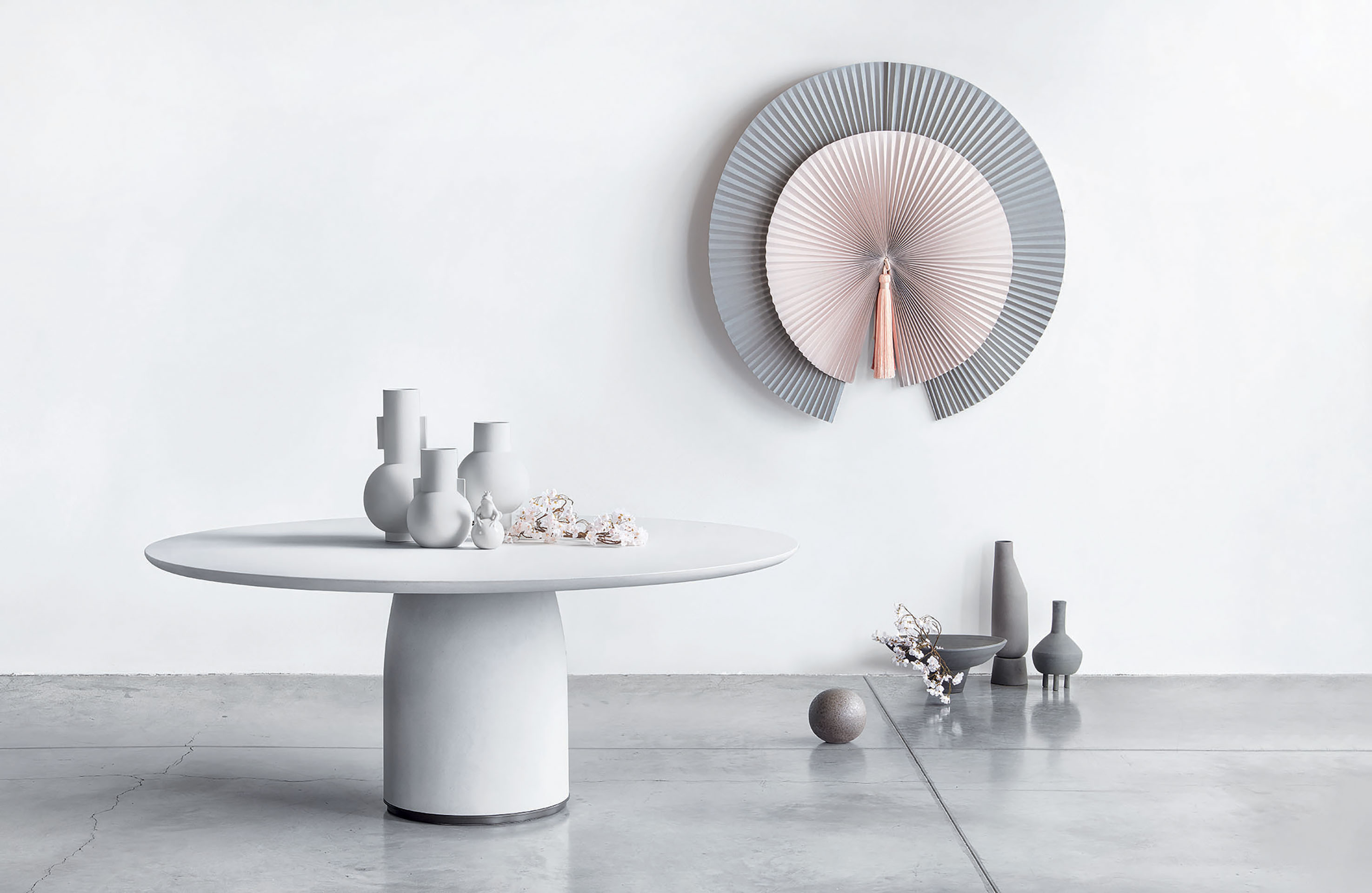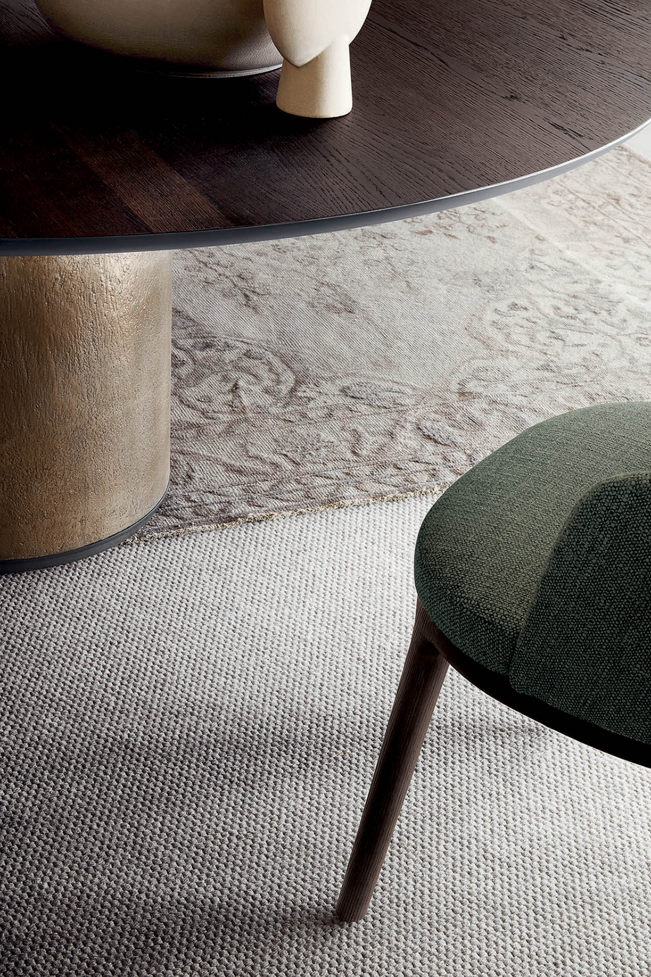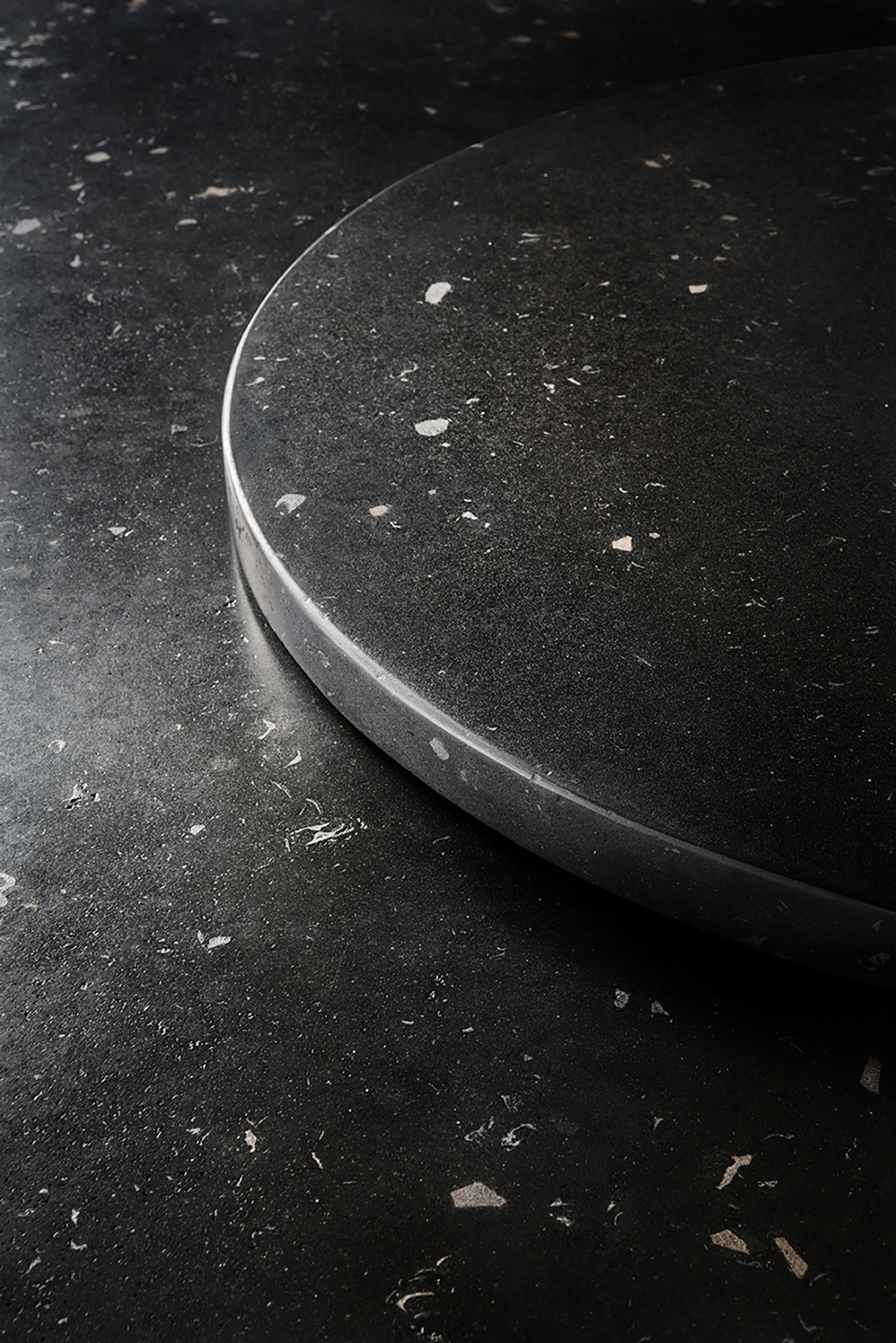 Designed by Chiara Andreatti, the Bulè table fuses the east with the west. With its harmonious and stylistically generous forms, Bulè stands out for its tabletop and central structural base that is made in the sophisticated black Belgian Blue finish. The revolving tray placed on the tabletop is the epitome of oriental culinary culture and modernity. Bulè’s base has been enhanced by a bronze-coated painted metal molding.