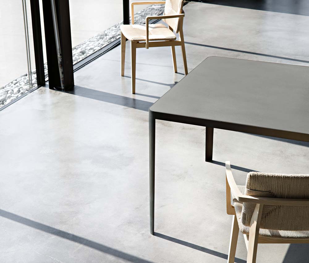 An essential, minimal design and a light frame are the distinguishing design features of the Filo table. It is available in a square or rectangular version, in any of the matt lacquered colors.