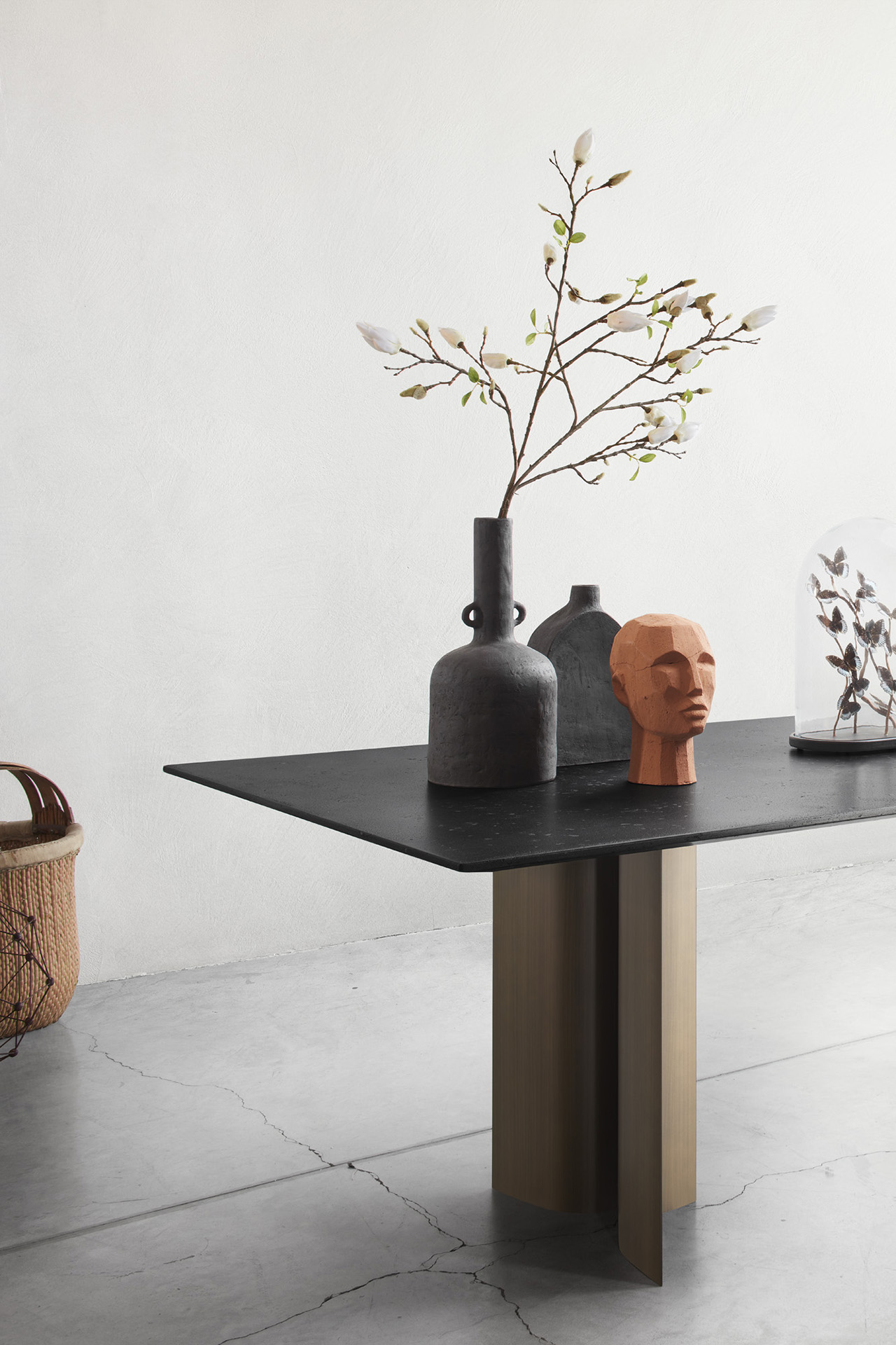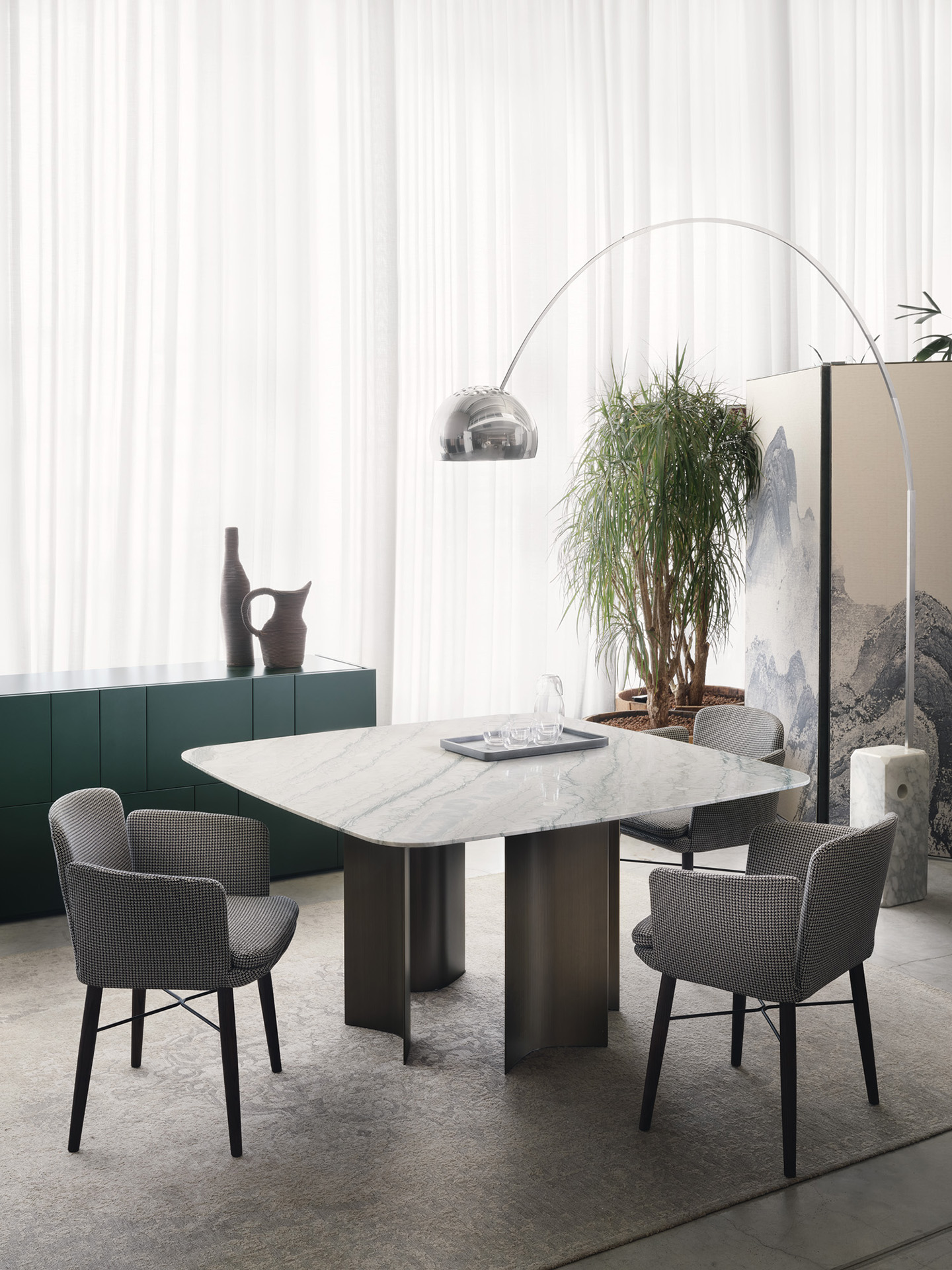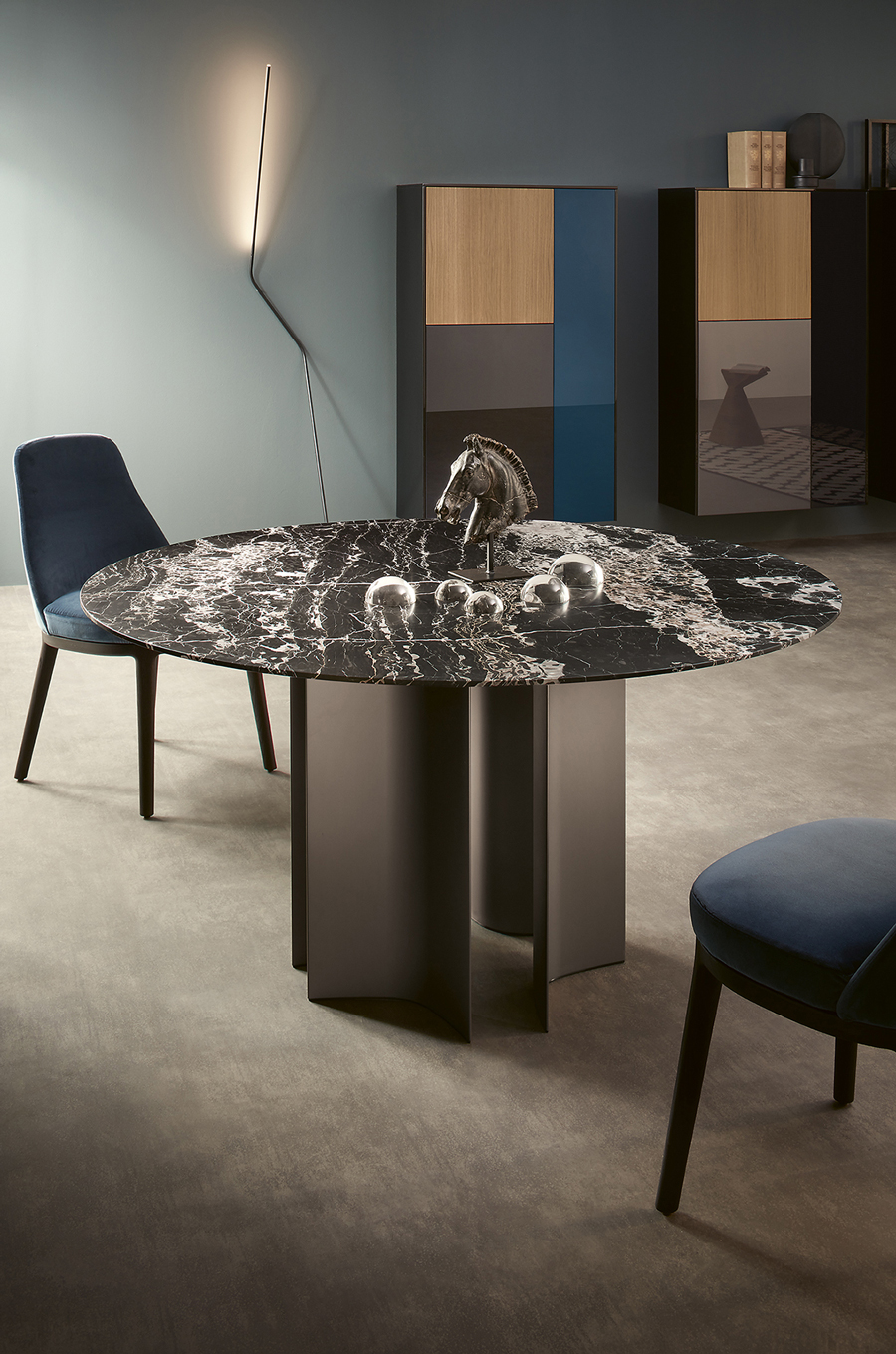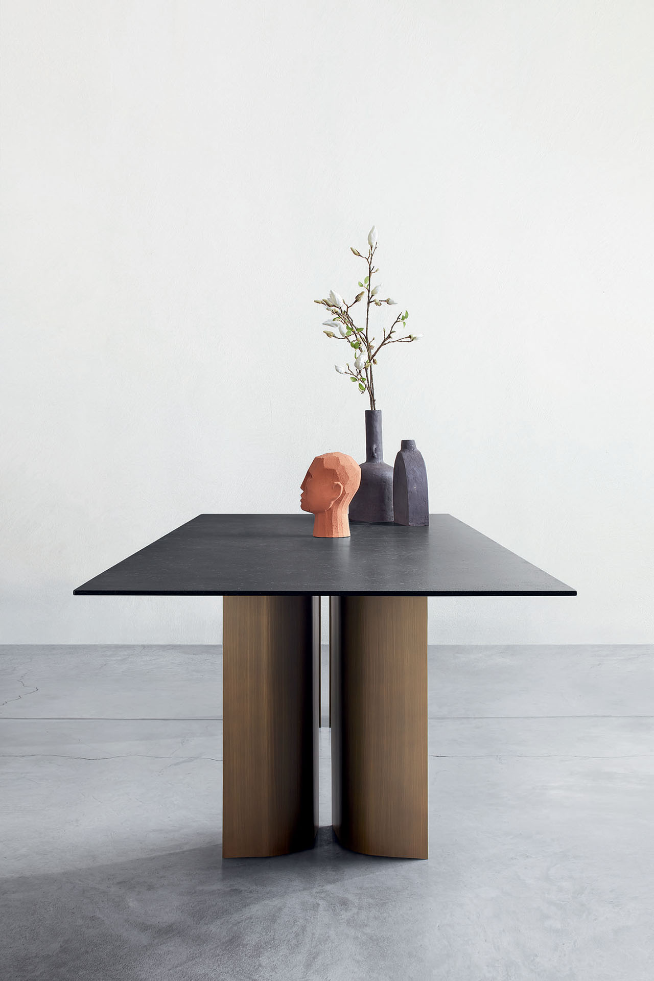 The Gullwing table system, a result of thorough exploration by Gabriele and Oscar Buratti, blends curved lines and diverse materials to create sculptural bases that interact with light and space.