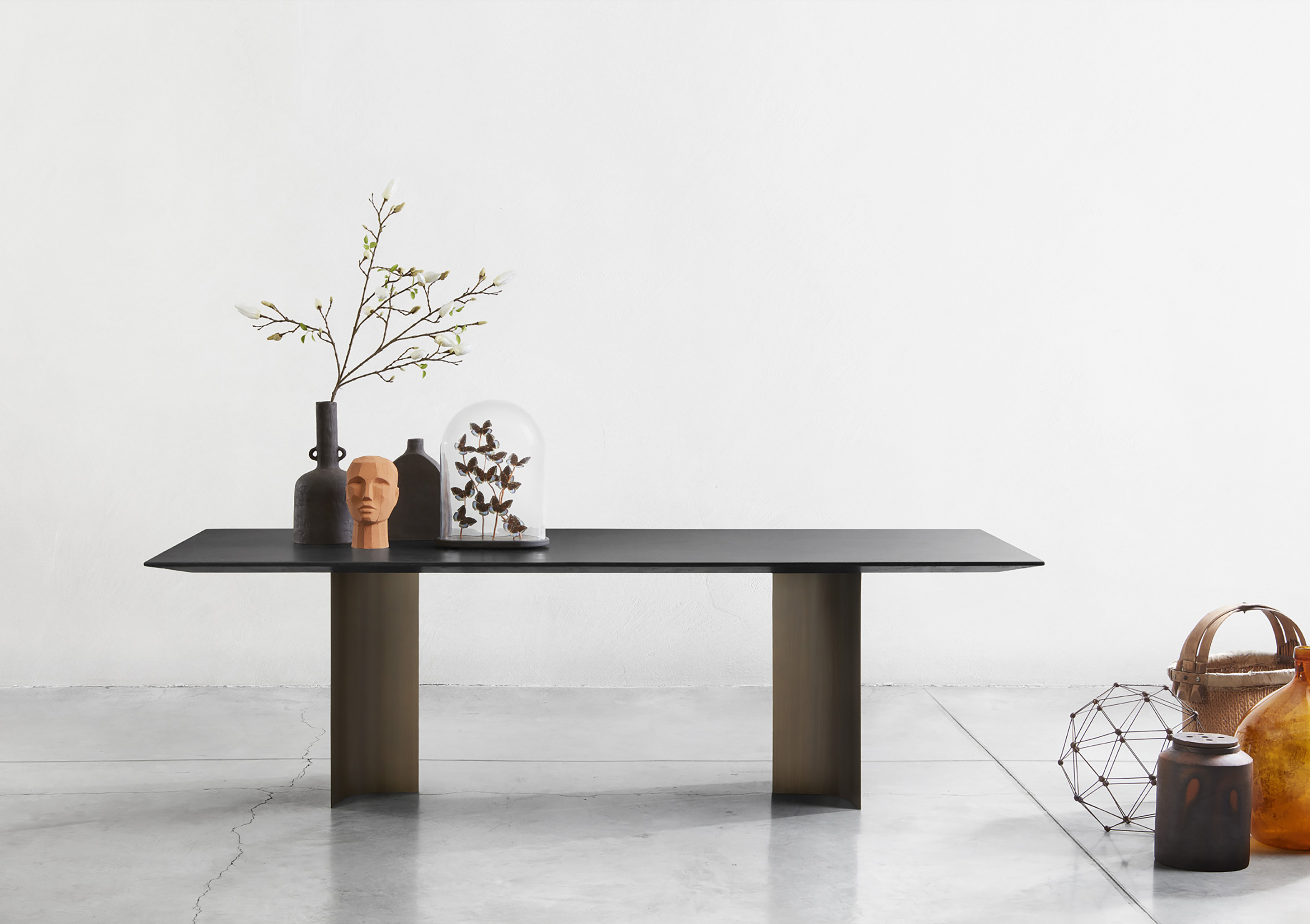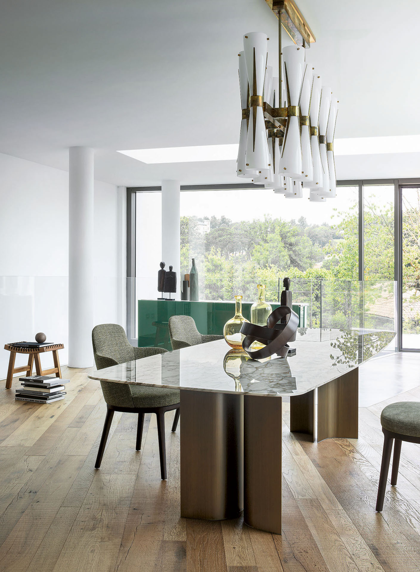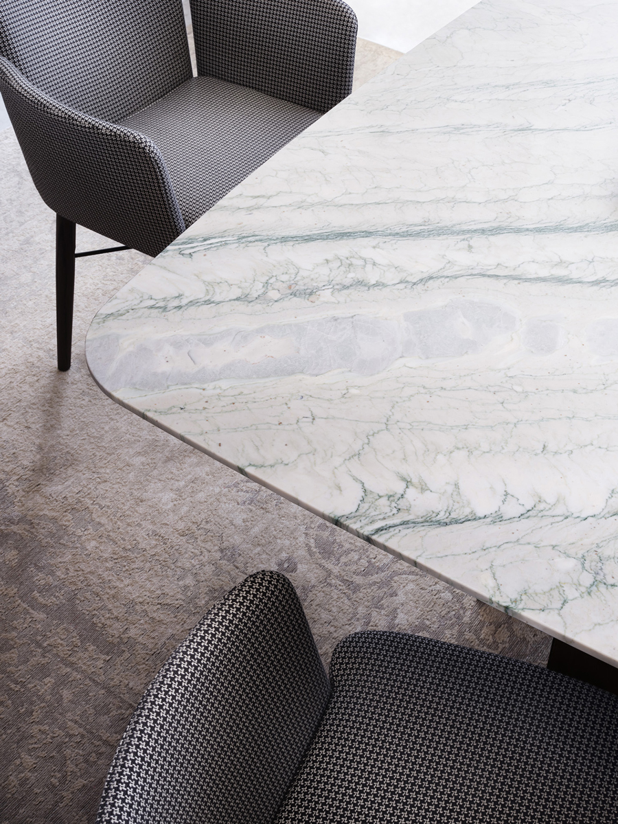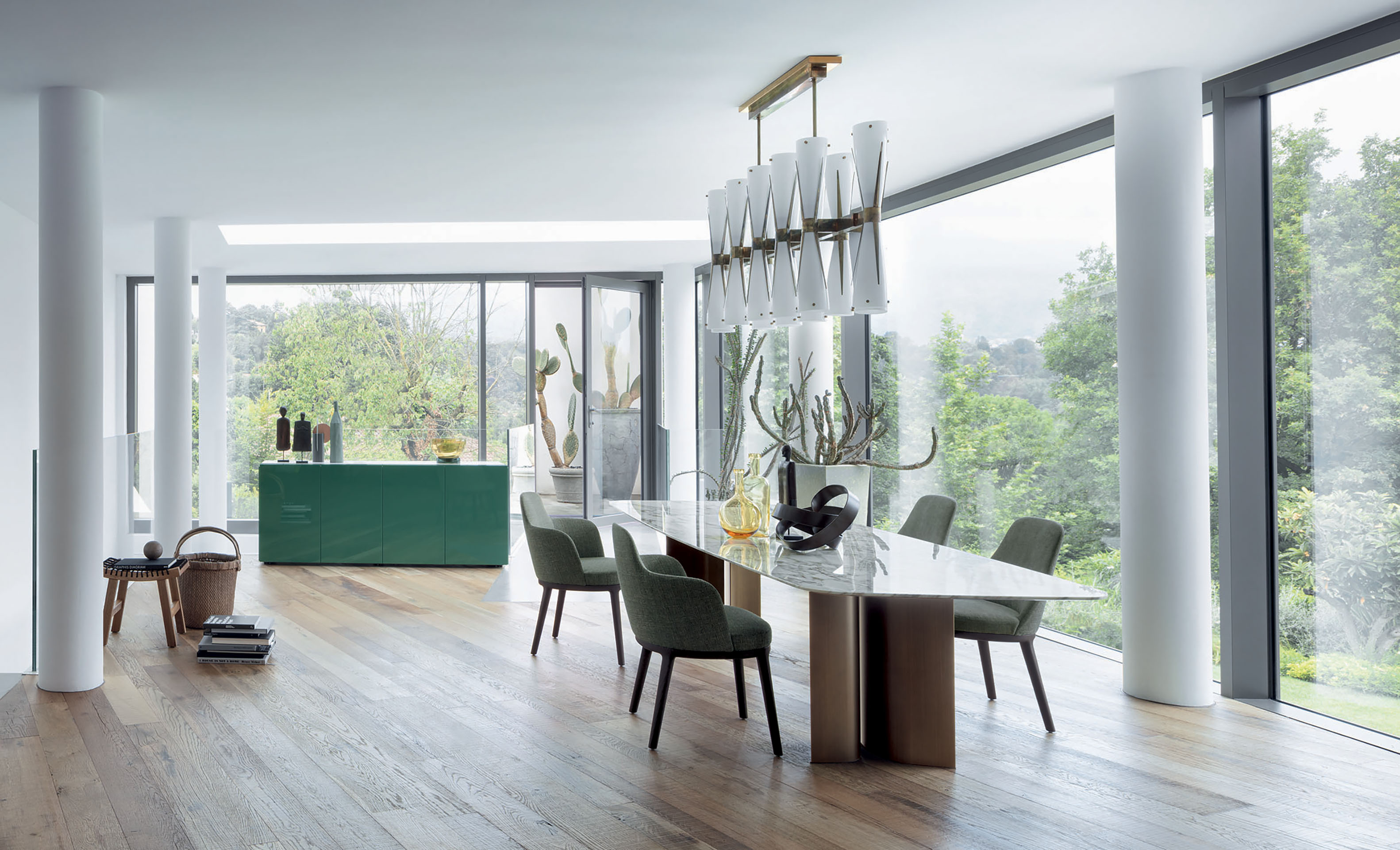 The Gullwing table system, a result of thorough exploration by Gabriele and Oscar Buratti, blends curved lines and diverse materials to create sculptural bases that interact with light and space.