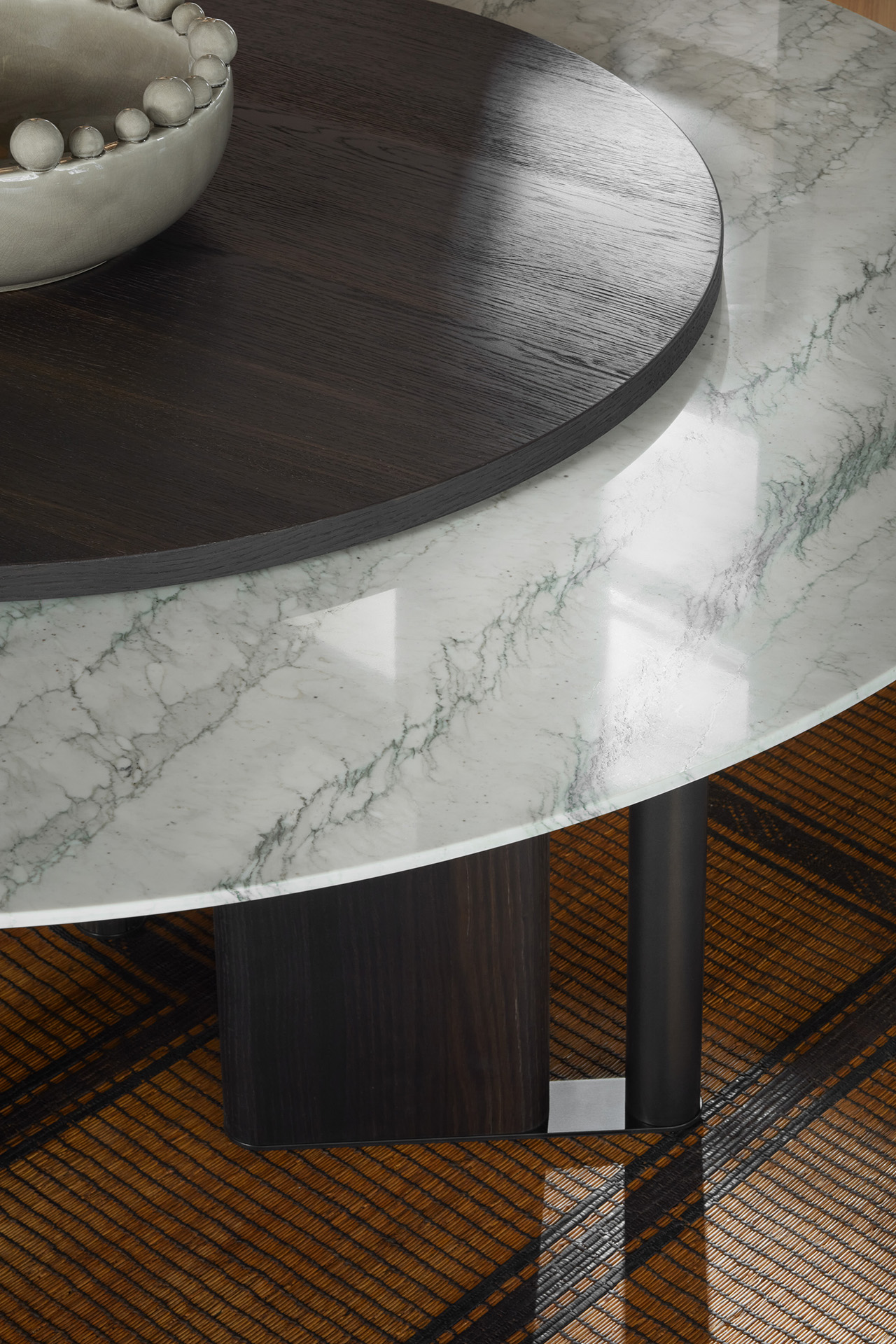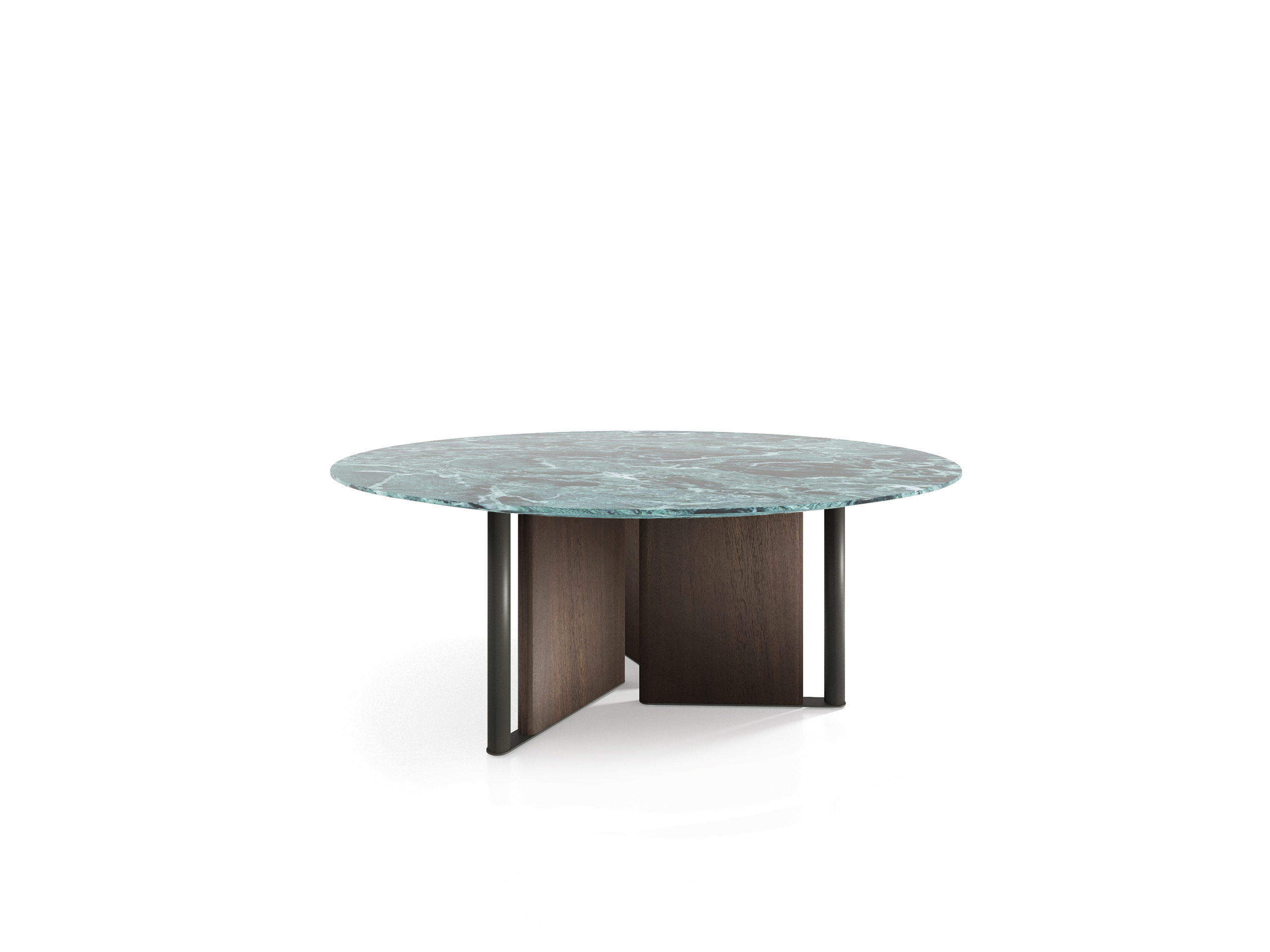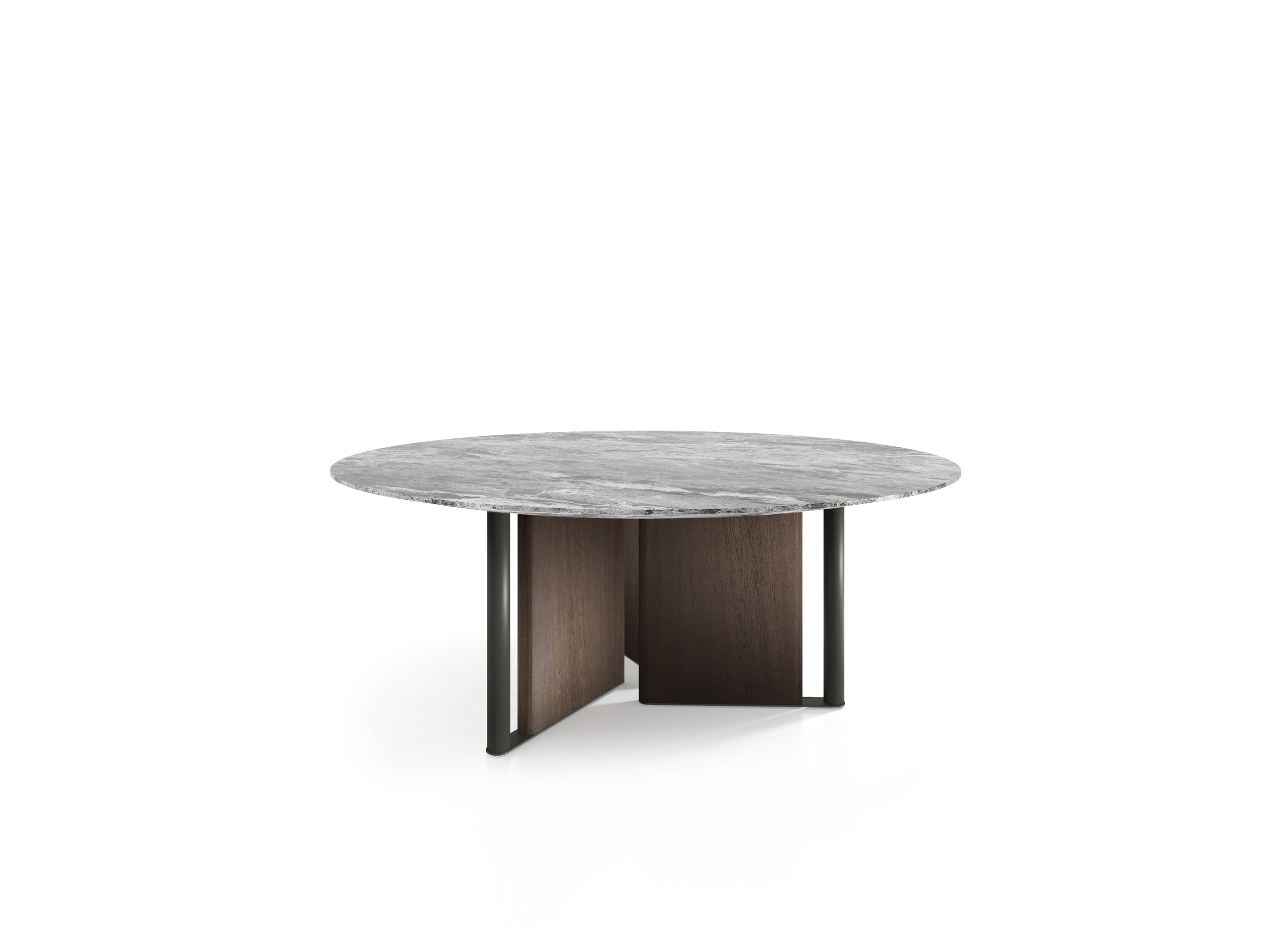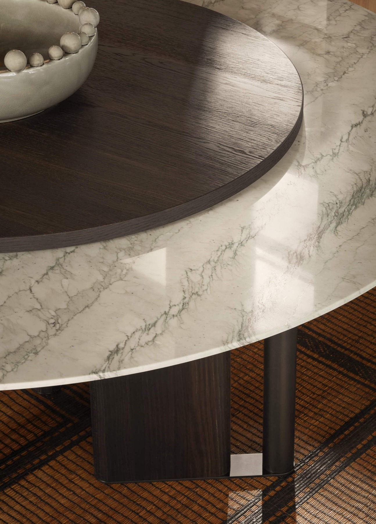 In-Between is a striking table with a base featuring alternating elements that create a sense of space, adding dimensionality and lightness to the living area with its round top.