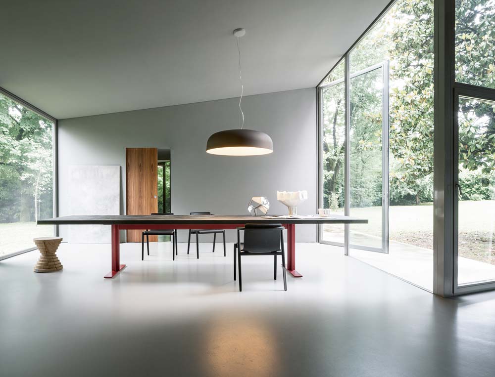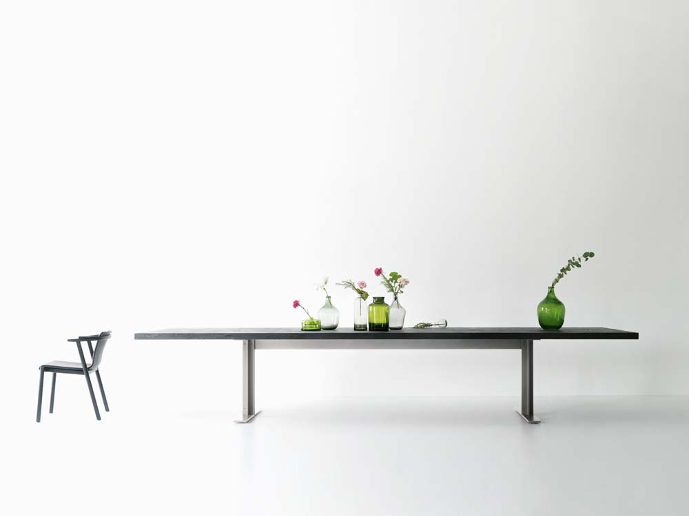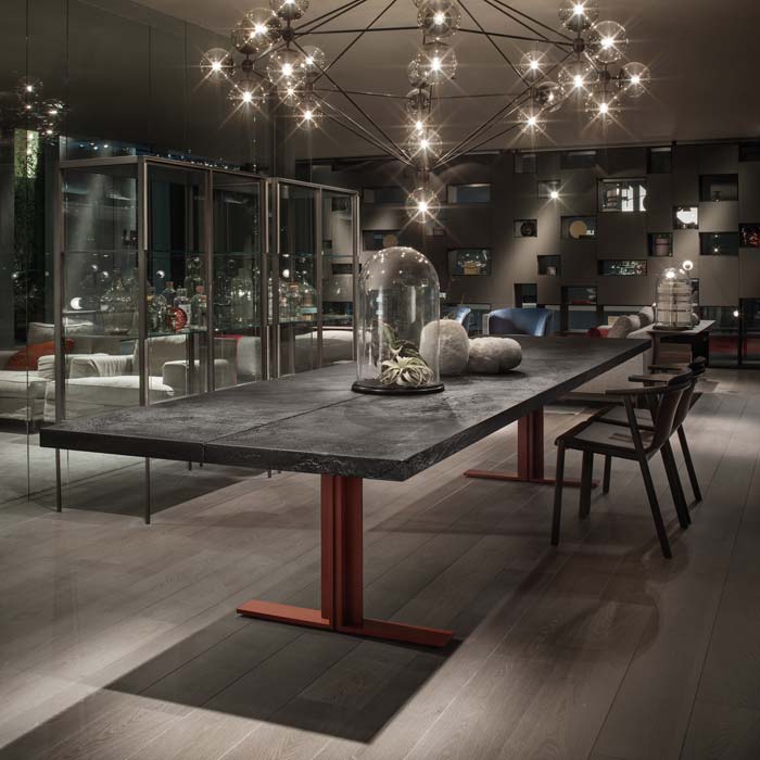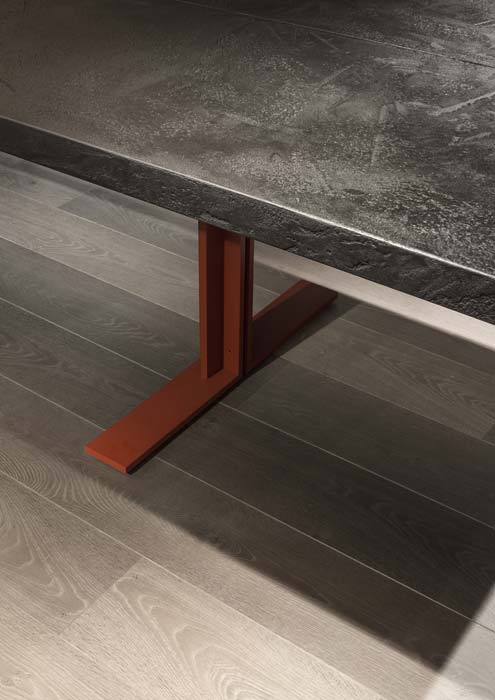In ideal furnishing for a large dining area or refined meeting room, the Memo table is characterised by its discreet design yet imposing scale. Available in two versions: 300×110cm and 400×110cm, its appeal is in the balance and symmetry of its elements - the tabletop in heat-treated oak or Lava stone and metal structure.