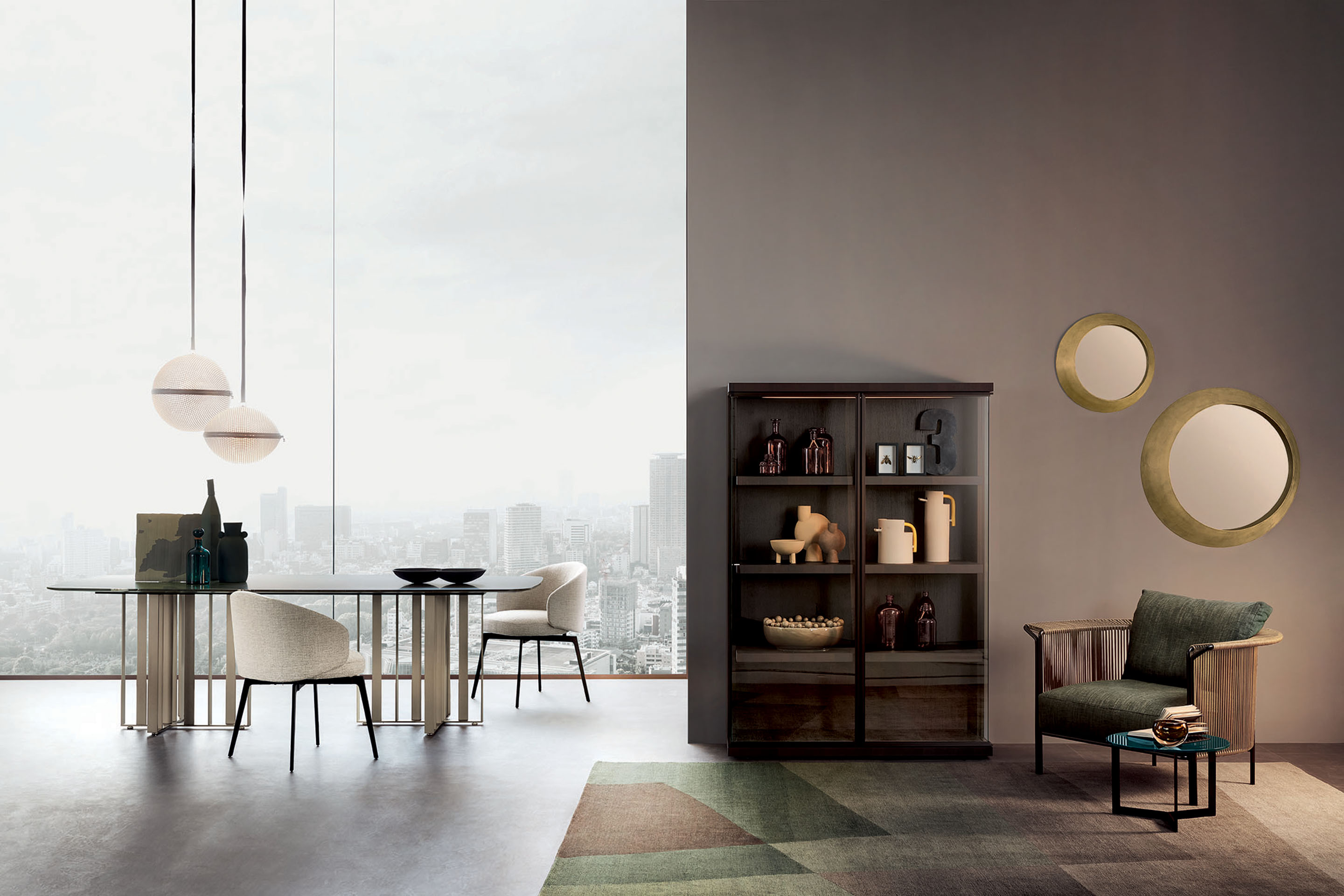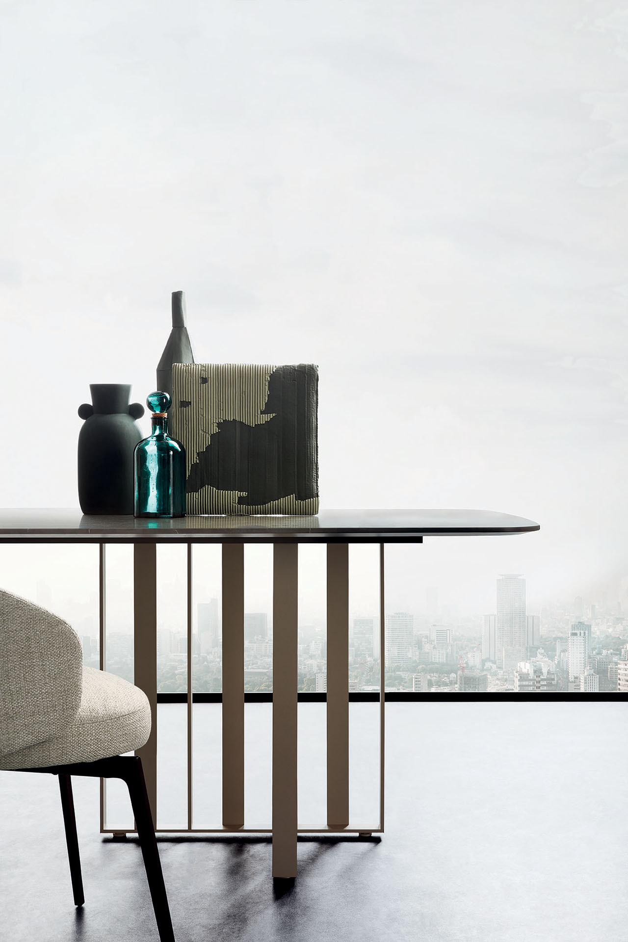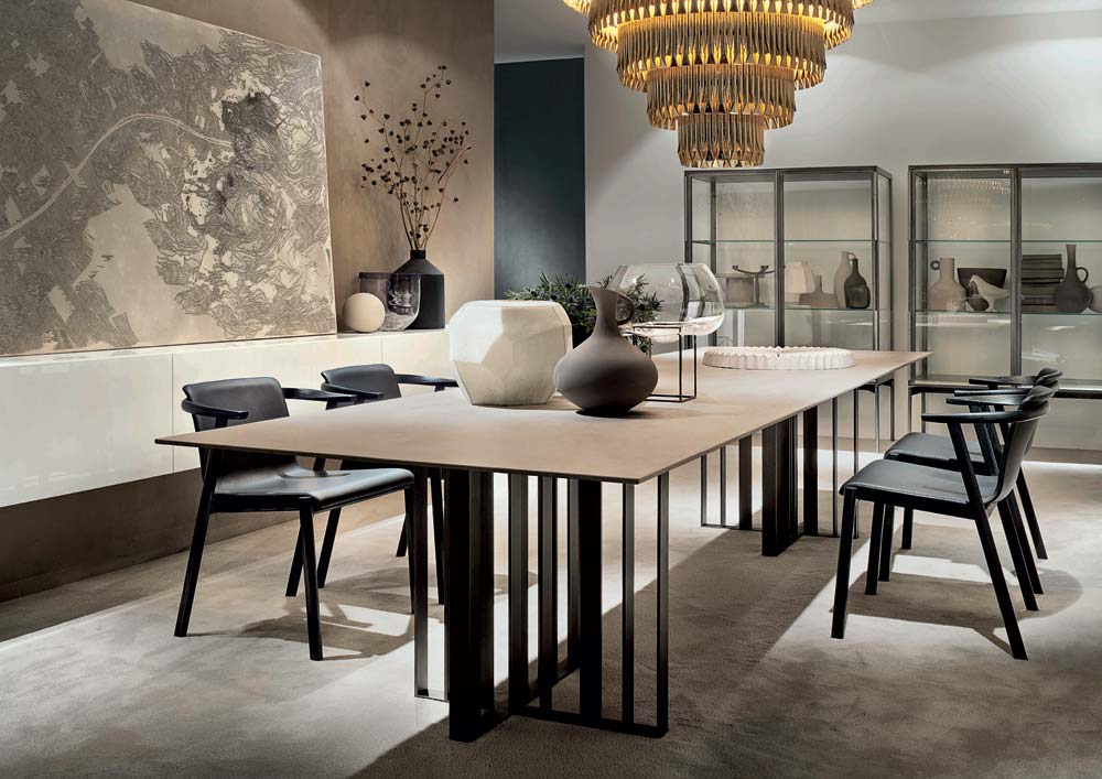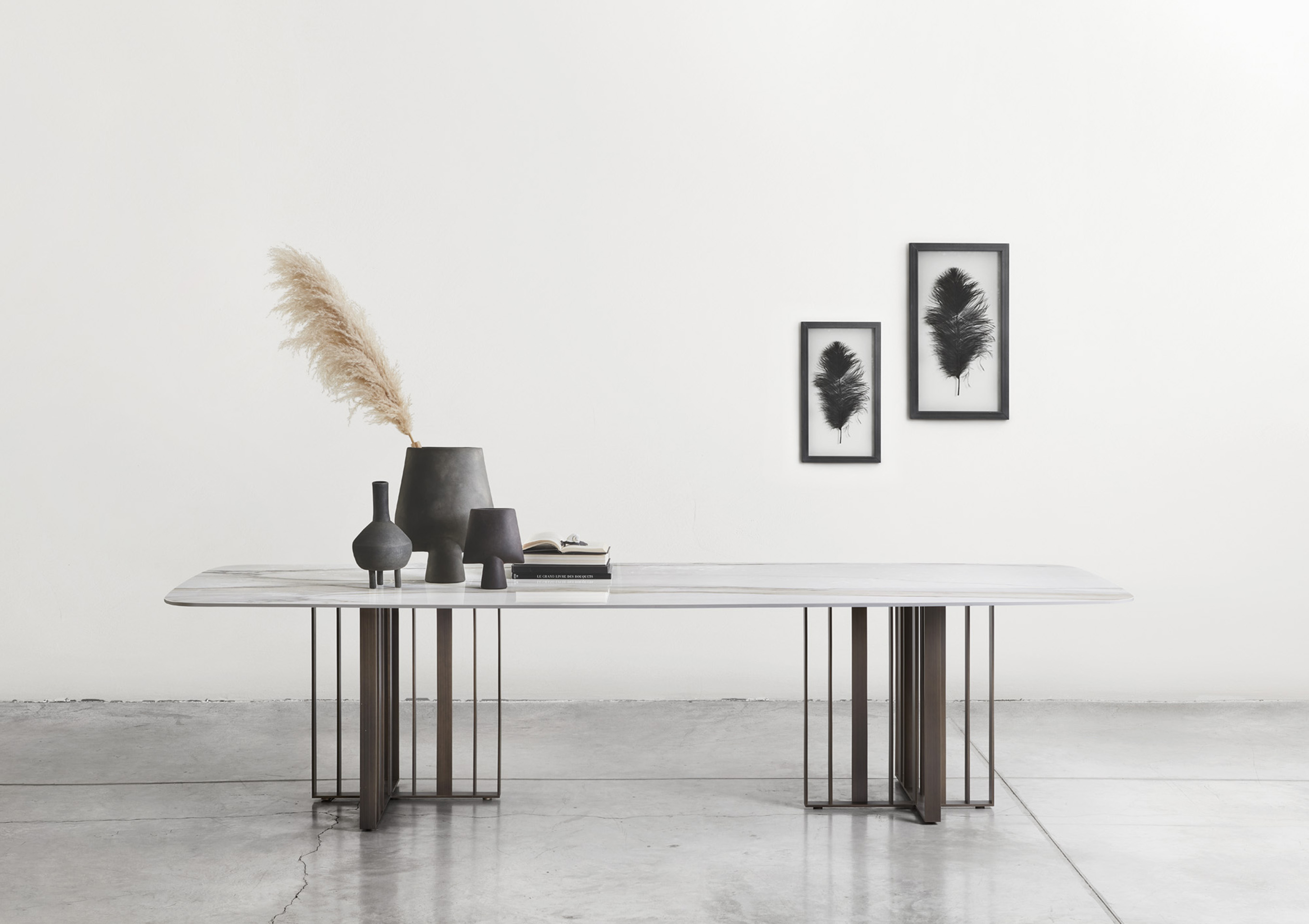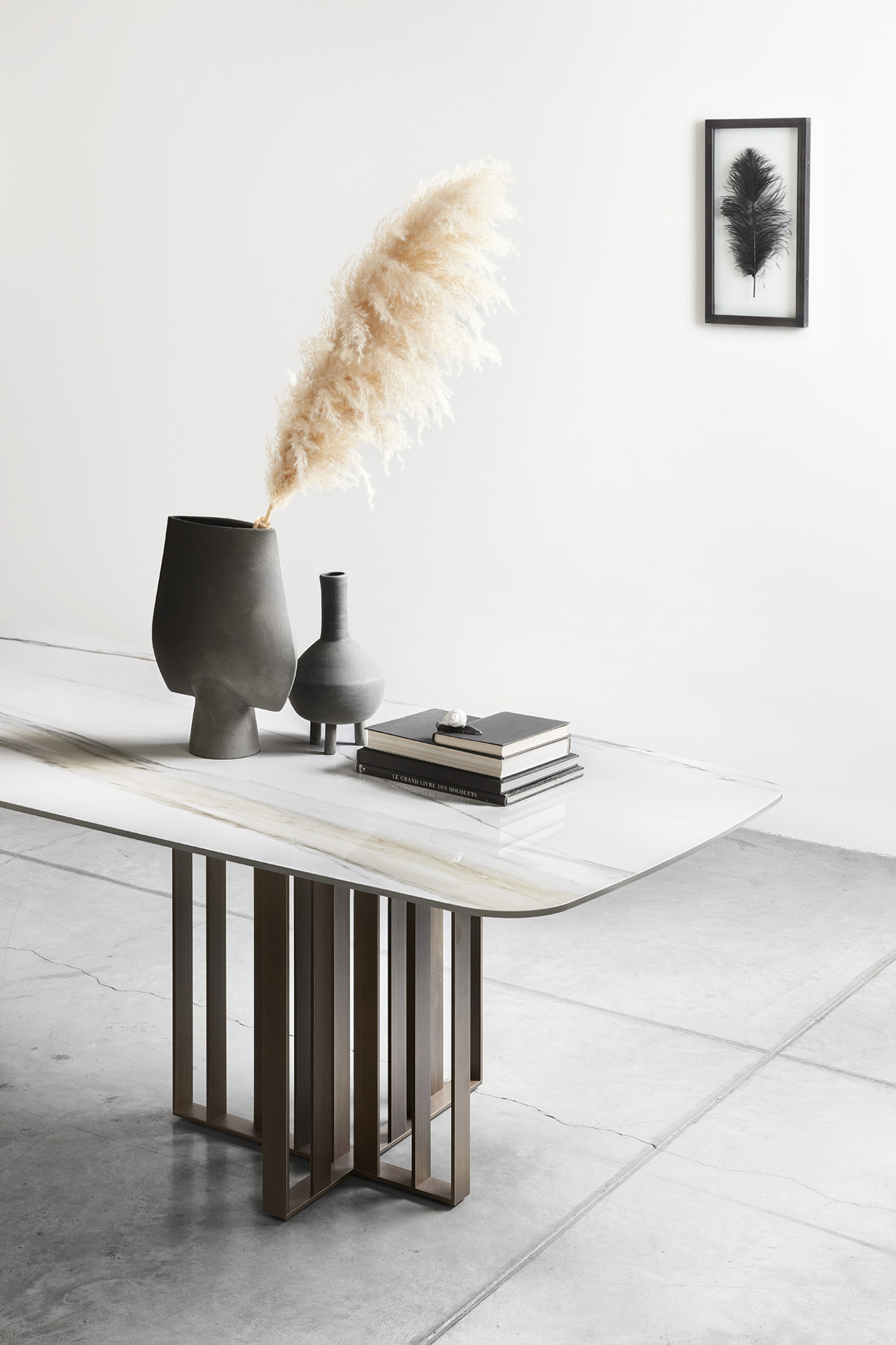 With its sculptural appeal, the Shade dining table is centred around the combination of the base in bronze painted metal and the sleek contrast top. The sculptural pedestal is formed from delicate sheets of metal with a treated bronze finish, arranged in an asymmetrical cross shape. The table top - available in various different materials and finishes - completes the aesthetic effect. The generous size of the table makes it the perfect piece for the centre of a room, whether it be a dining room or meeting room. The name - Shade - is a nod to the shadows created by the metal base.
