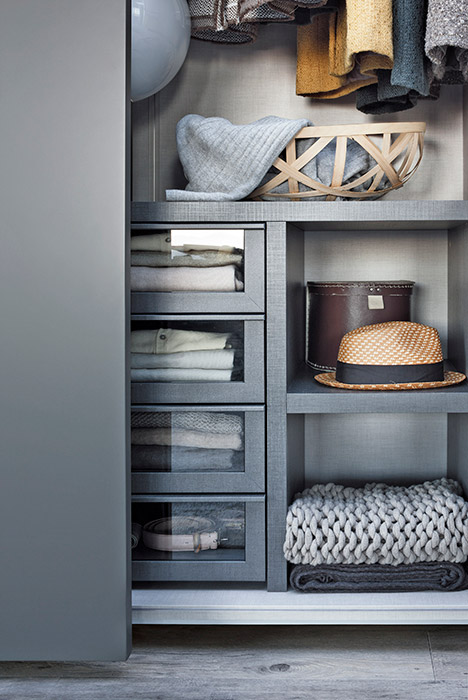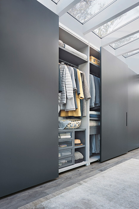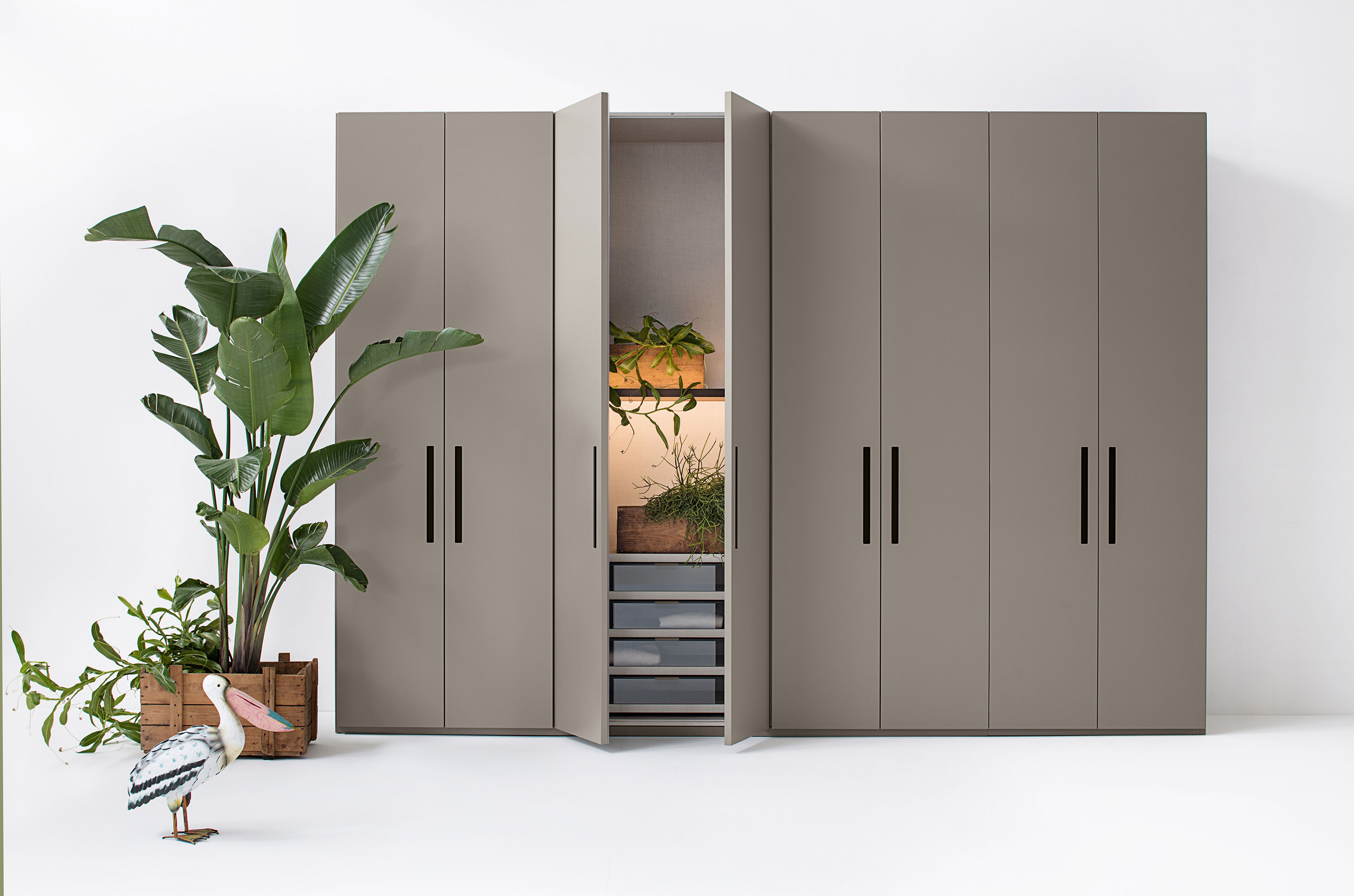 Ellevì by Officinadesign Lema stands out for the handle embedded in the door with tone-on-tone background or in contrast with the door finish. Customisable in depth, it also features wide-ranging internal equipment to offer multiple combinations for any need of order: drawer units, display cases for trousers, belts and shoes. Shelf and hanging bar with built-in light. Without forgetting the precious details in leather and fabric like the mats for drawers and boxes for shirt compartments.