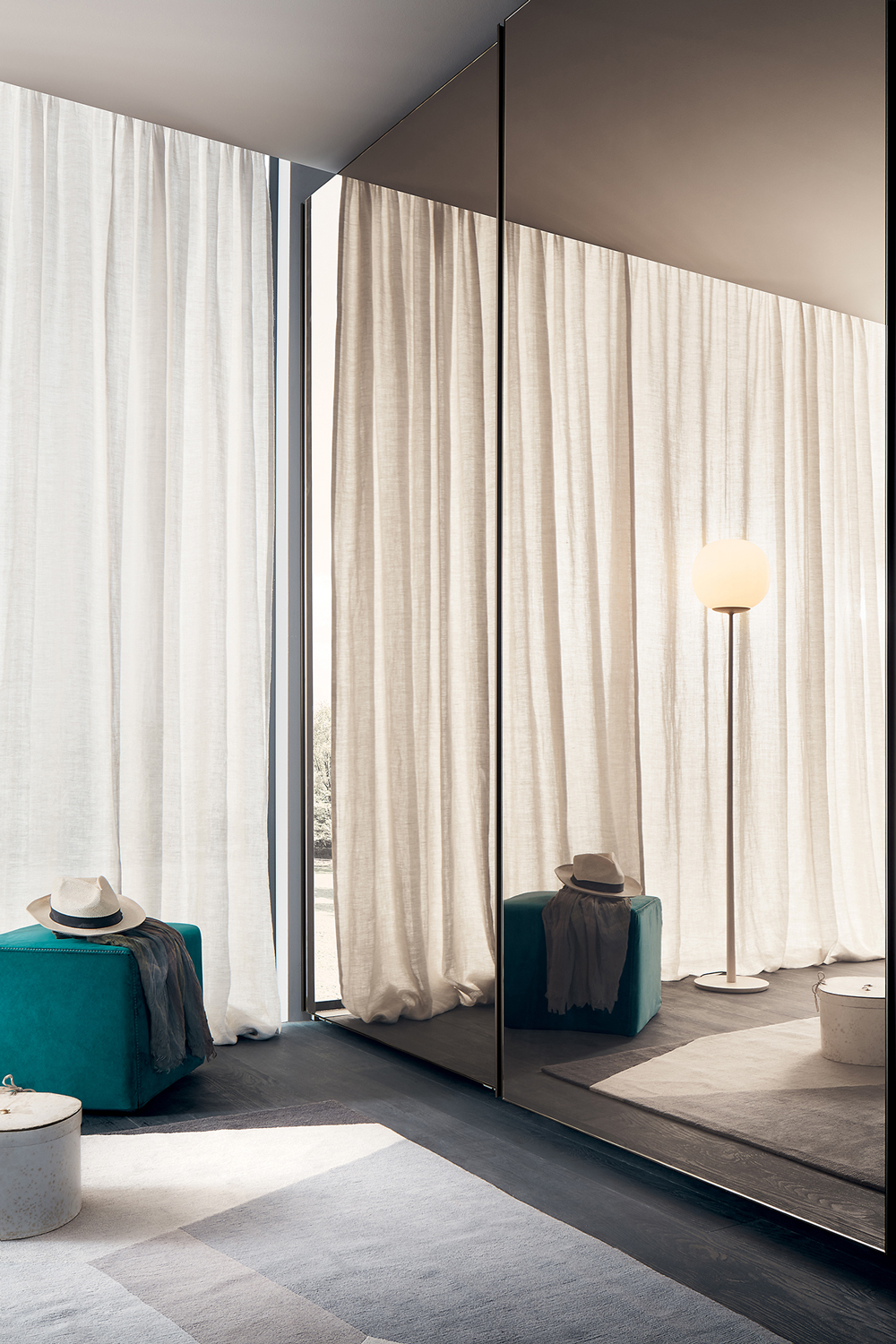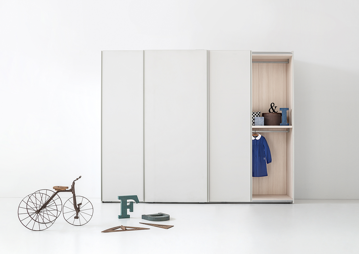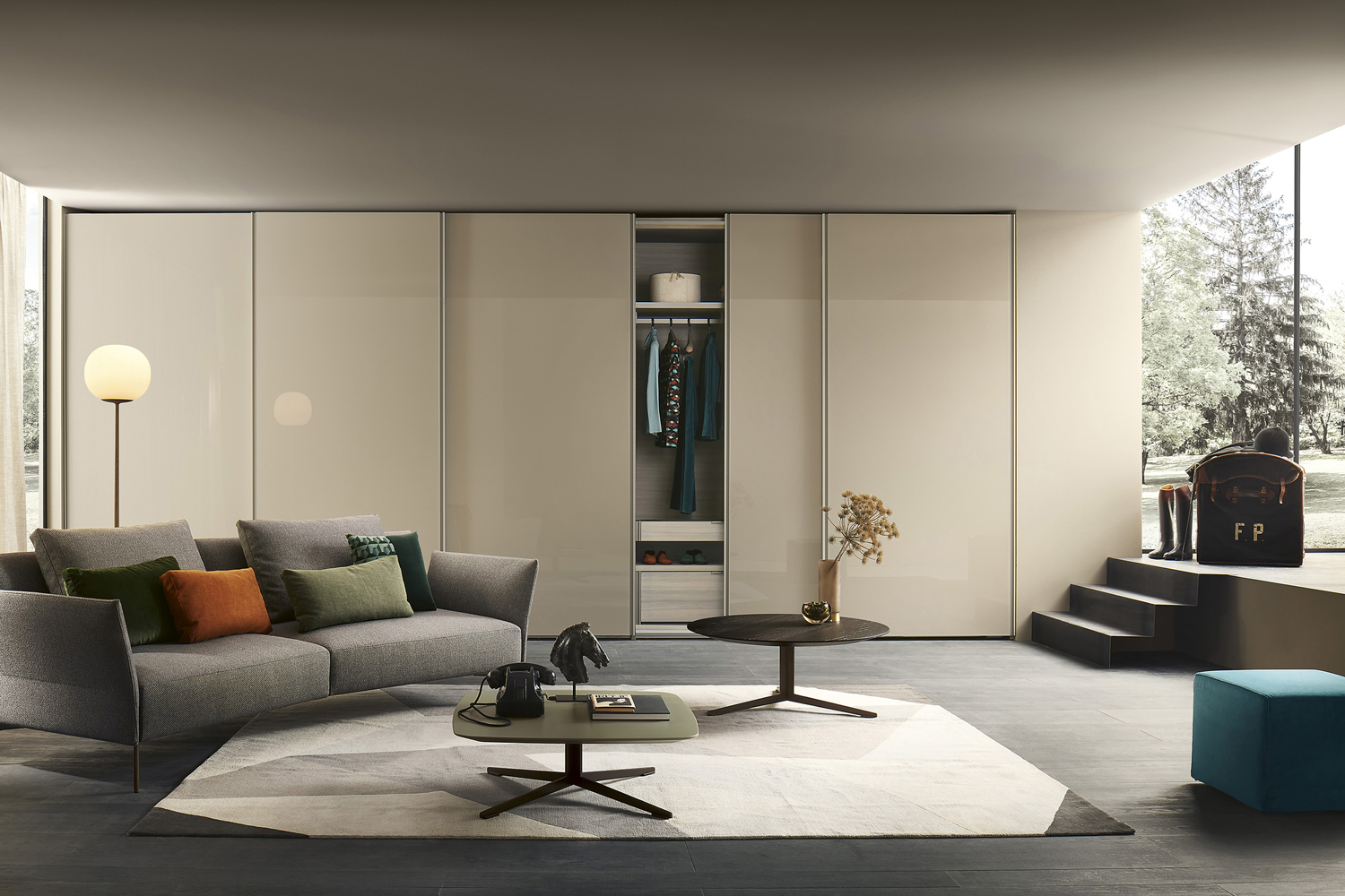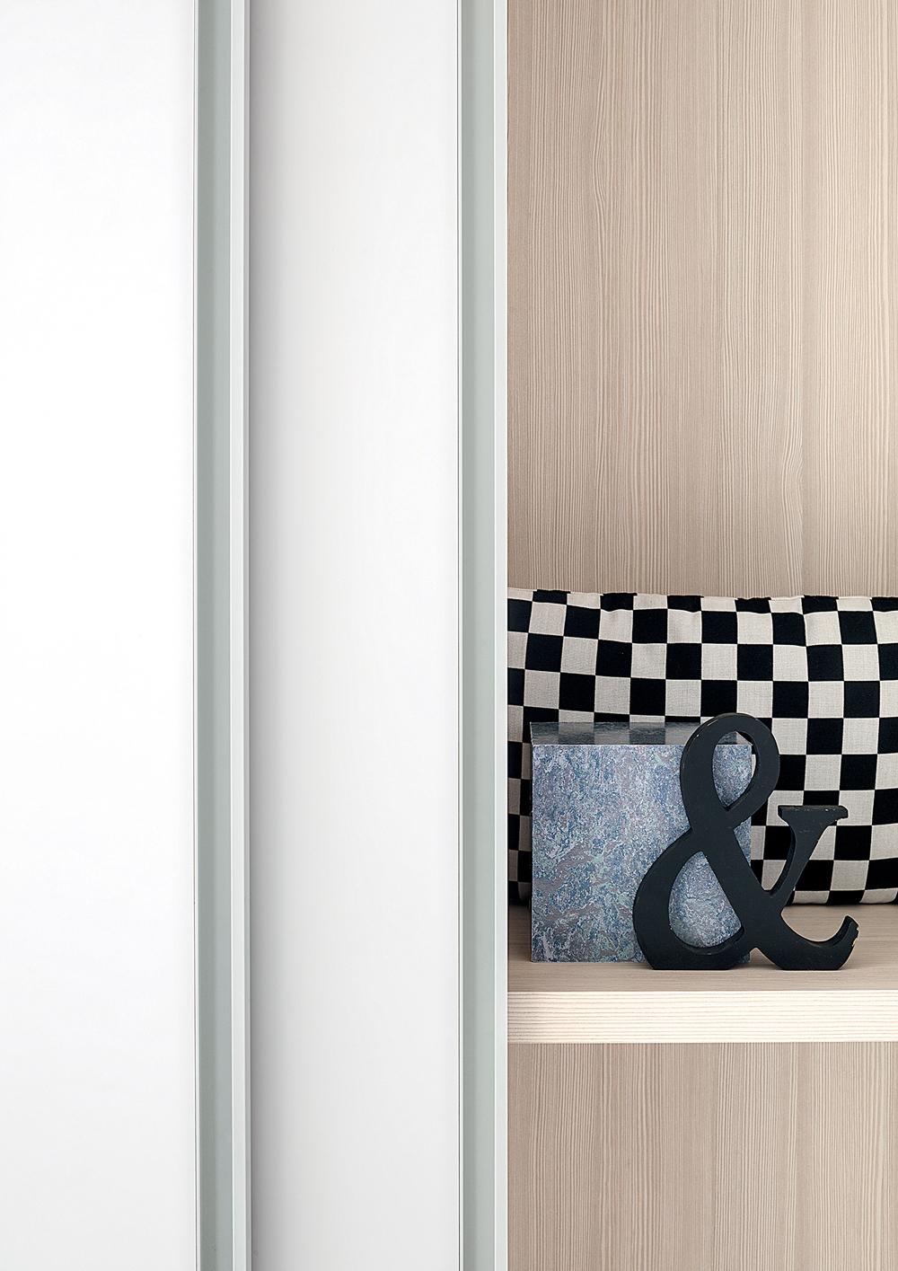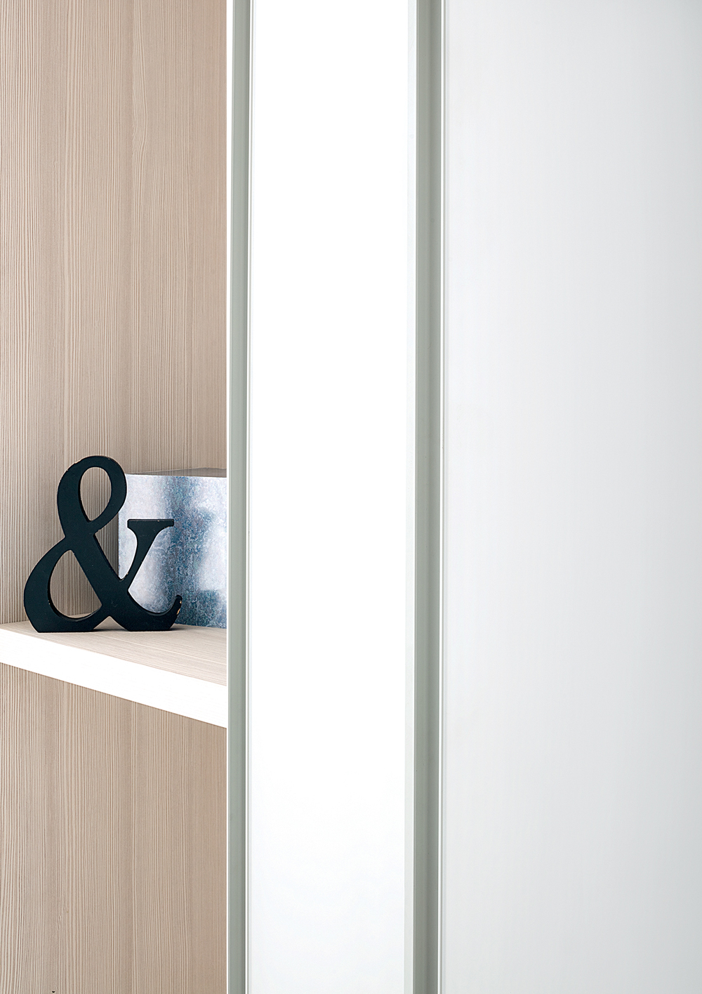 Defined by a vertical slim metallic profile, Emery by Officinadesign LEMA is characterized by refined doors in back-painted acid-etched glass. This special treatment suggests a door surface that is matte and extremely smooth, discreetly concealing the bright interiors finished in new canvas melamine that has a delicate fabric-effect texture. Emery also features wide-ranging internal equipment offering multiple combinations for any need: drawer units, display cases for trousers, belts and shoes. Its shelf and hanging rail come with a built-in light, while not forgetting the precious details in leather and fabric such as mats for drawers and boxes for shirt compartments.