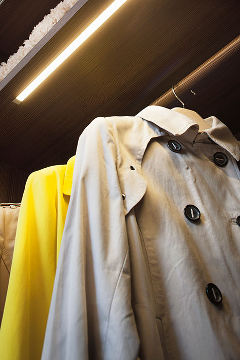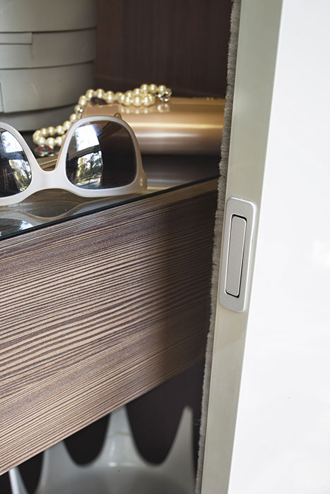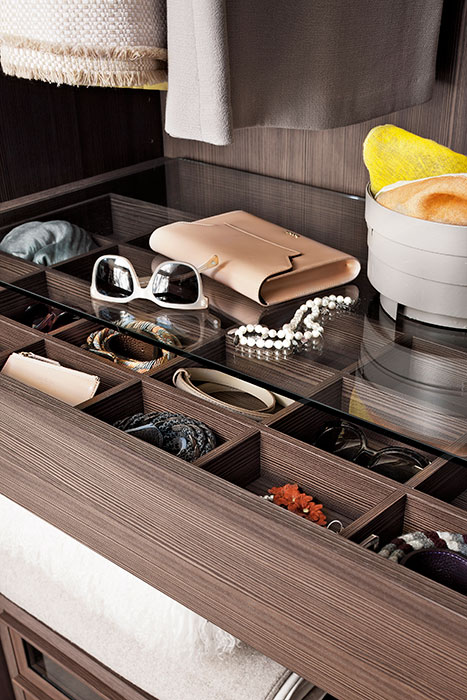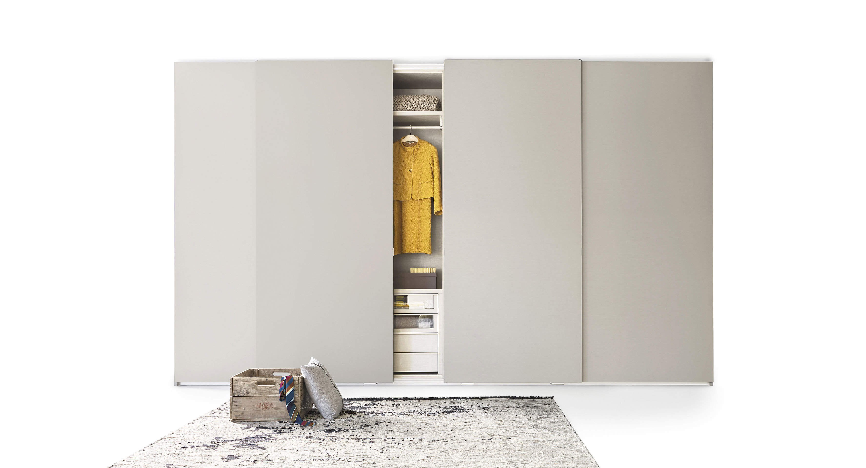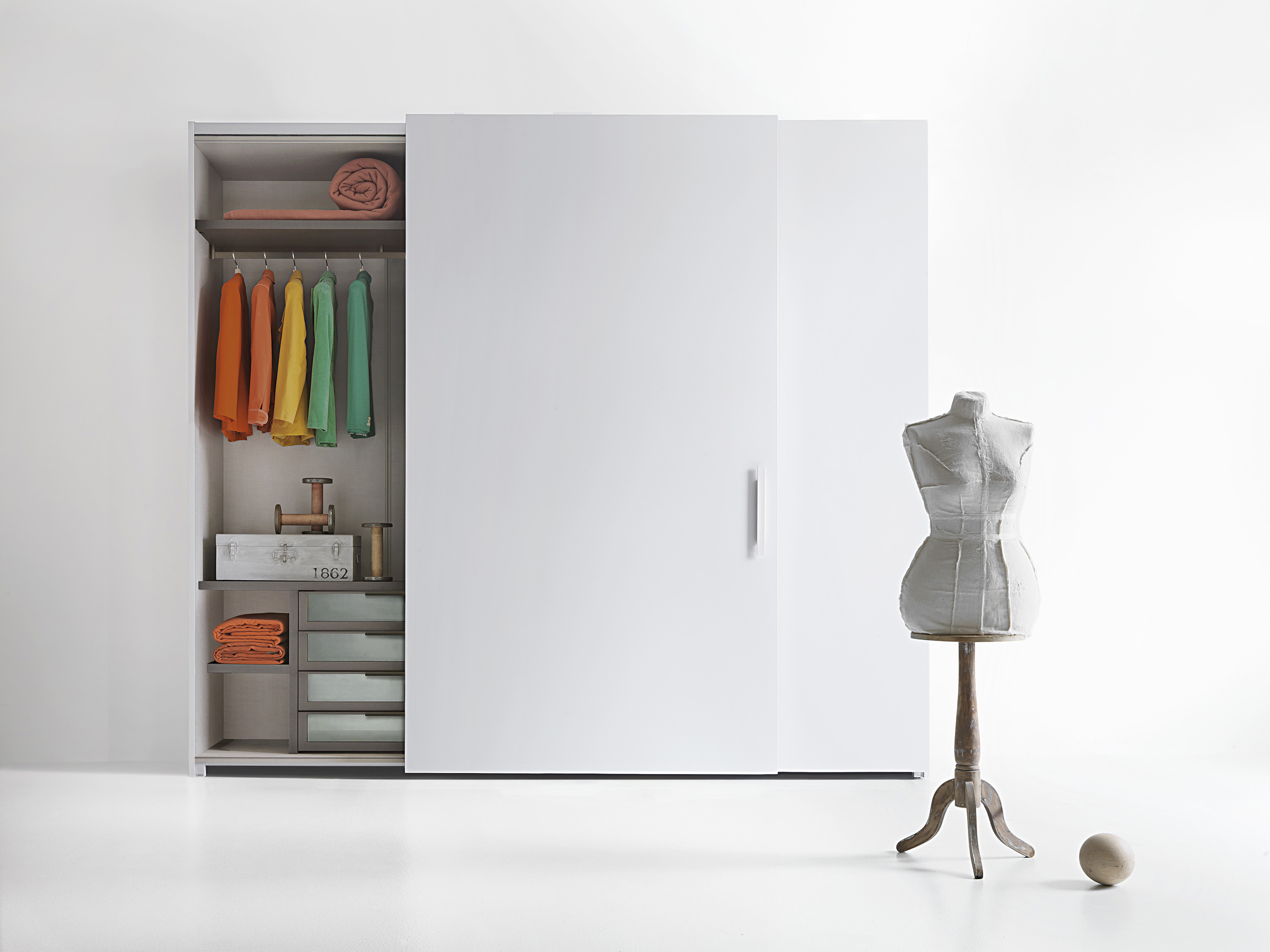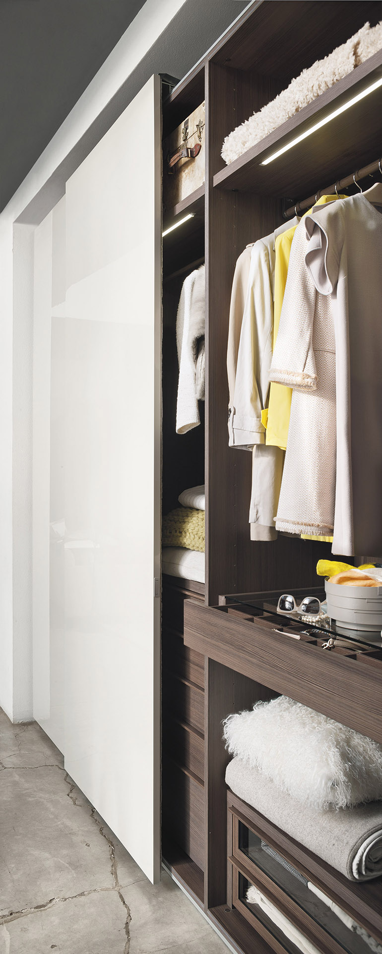 The Prima wardrobe is characterised by its linear form, wide surfaces and without visible handles. In fact, the opening system consists of a small hook handle that is secured to the door thickness, thus hiding it. Customisable in depth, it also features wide-ranging internal equipment to offer multiple combinations for any need: drawer units, display cases for trousers, belts and shoes, shelves and hanging bar with integrated lighting. Available as hinged, sliding and coplanar wardrobes.