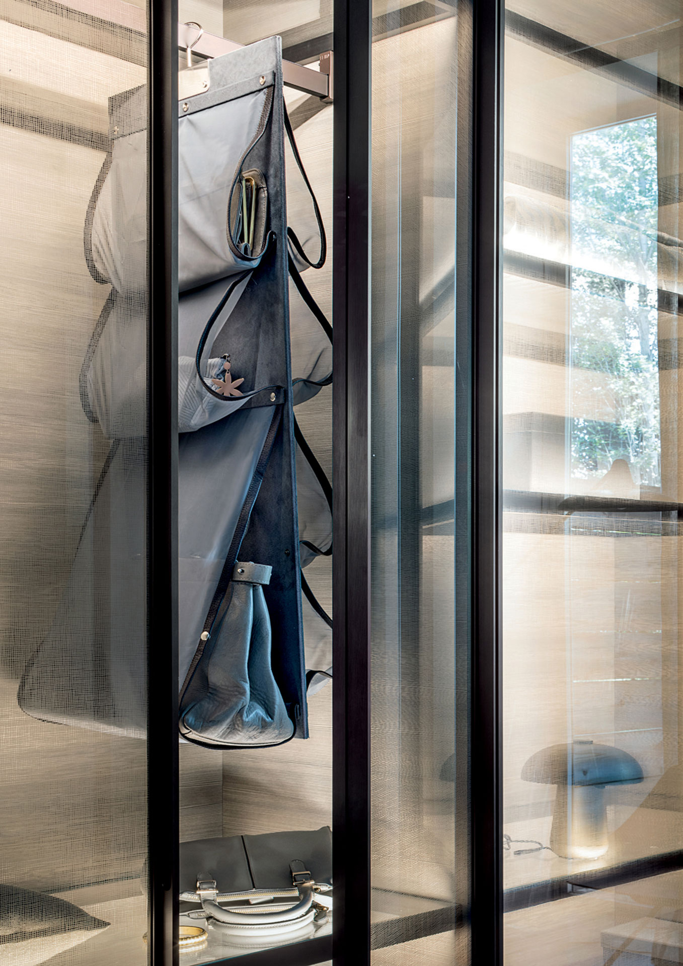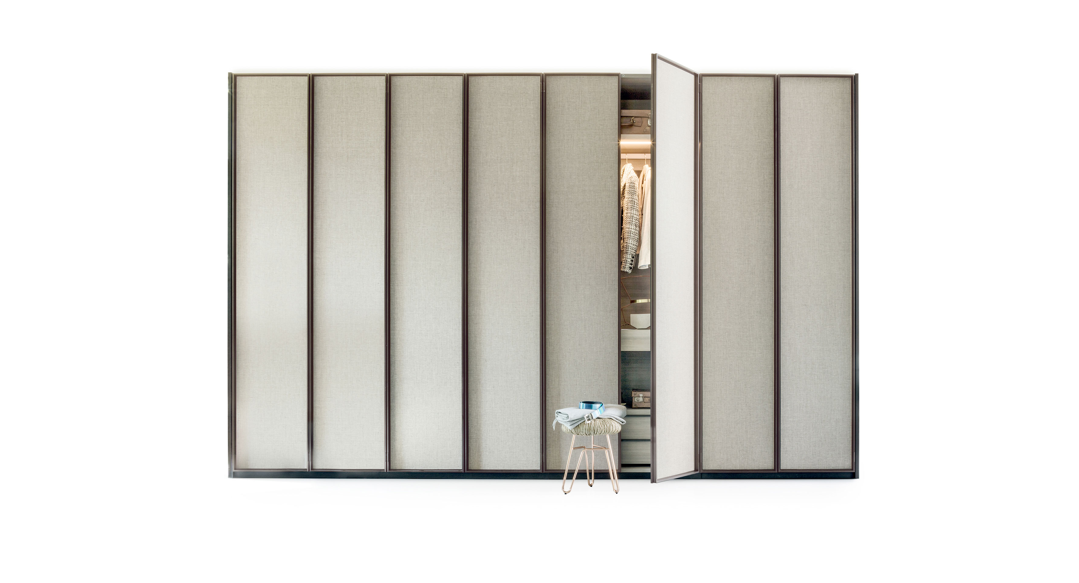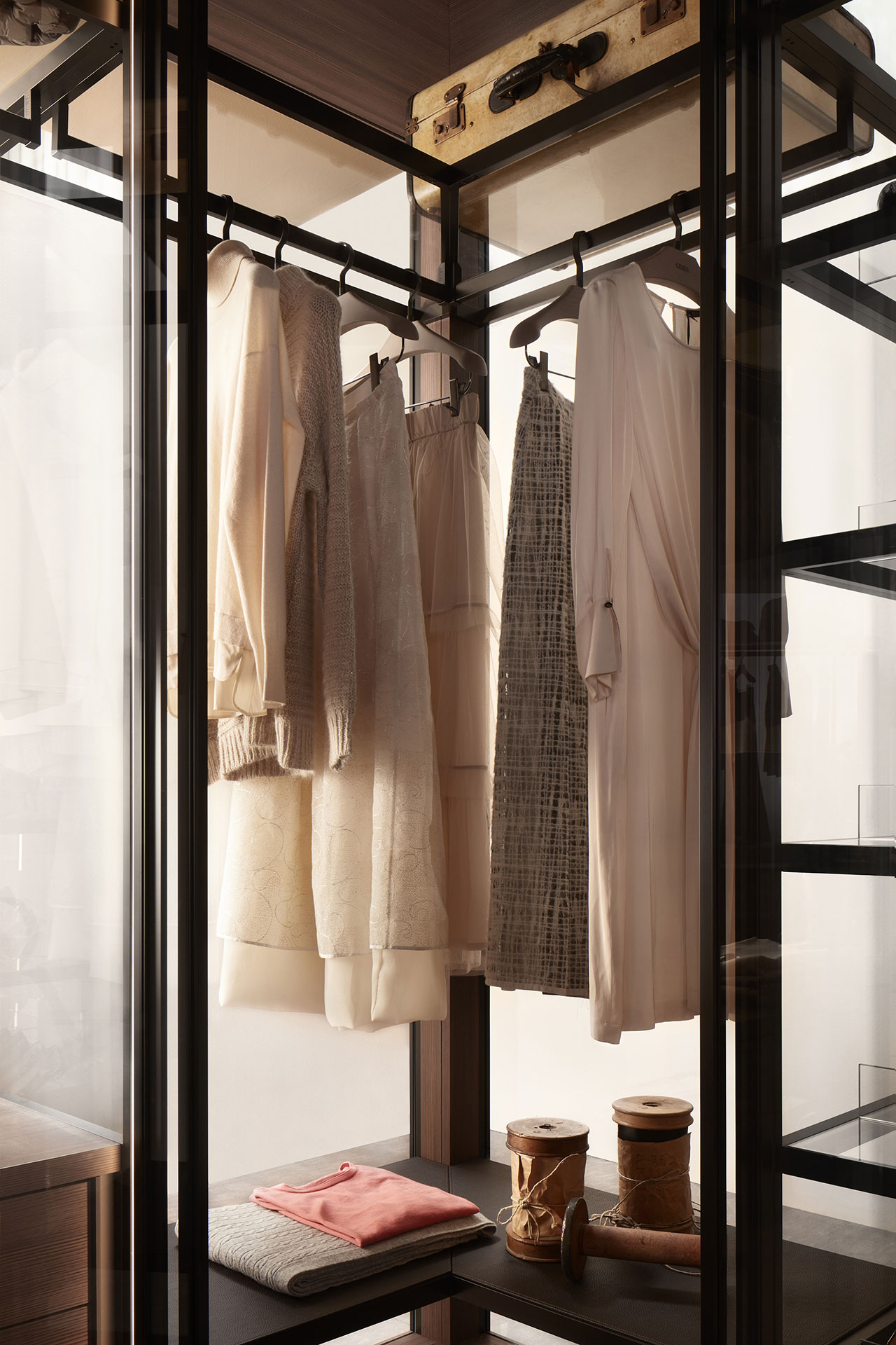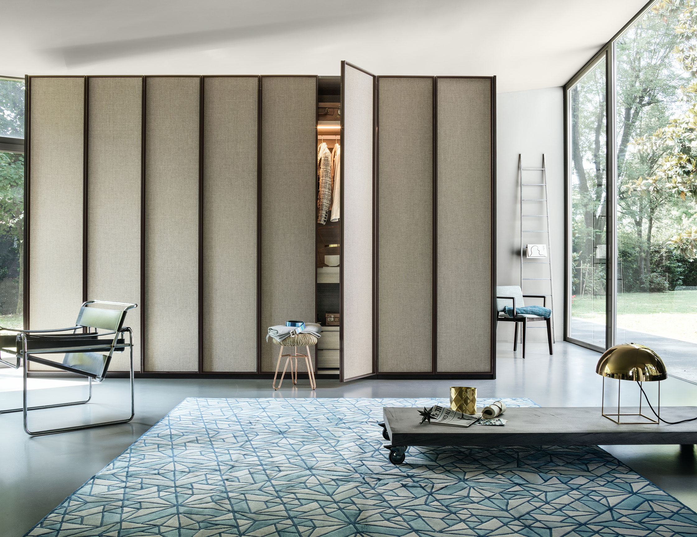 TThe Dandy Armadio al Centimetro by Officinadesign Lema offers versatile modularity and style for home wardrobes. The hinged door version features a metal frame and a wide selection of panels, including transparent, grey smoke, bronzed, and coloured lacquered glass, fabric-serigraphed bronzed glass, mirrors, bronze mirrors, light hide, and decorative fabric-covered panels.