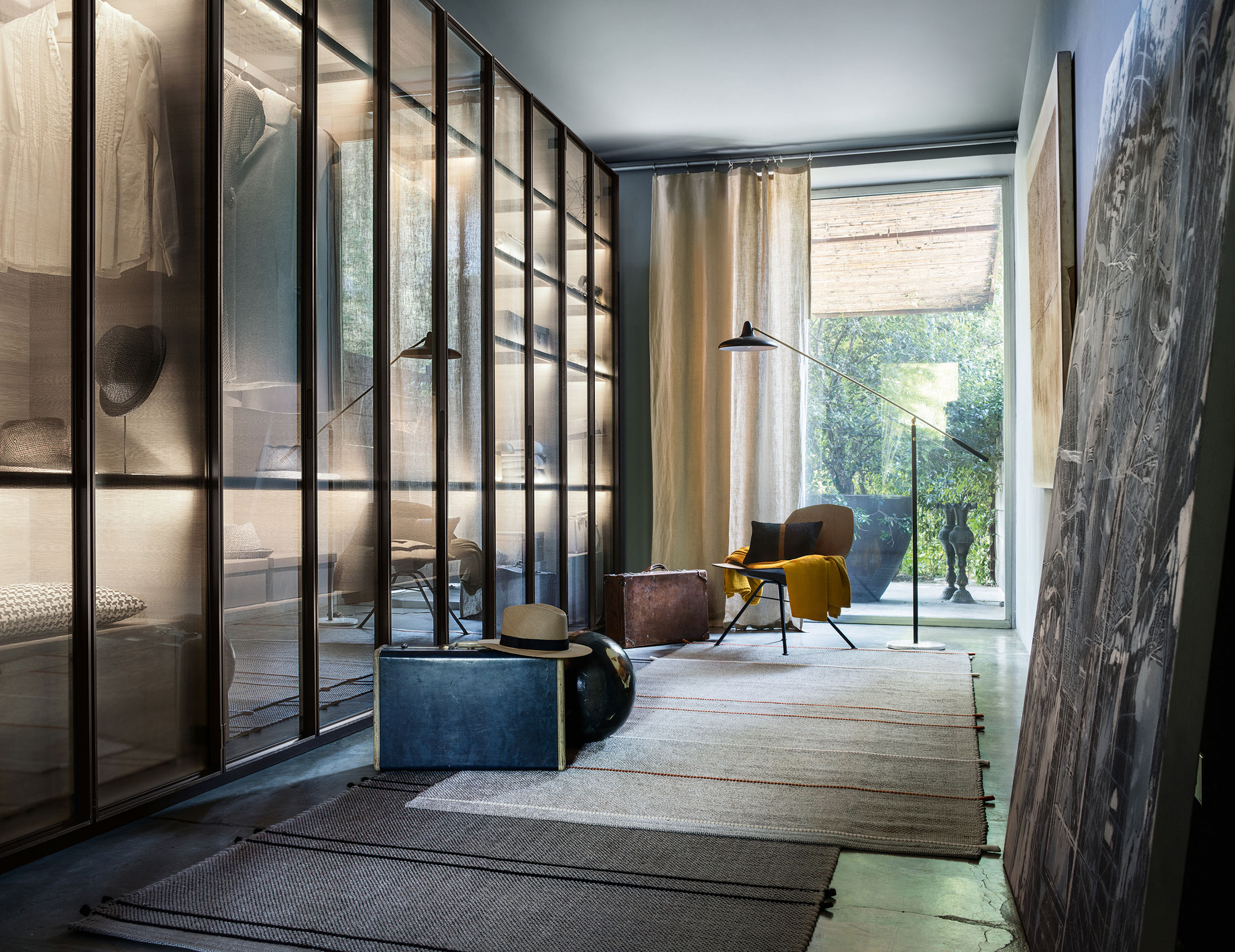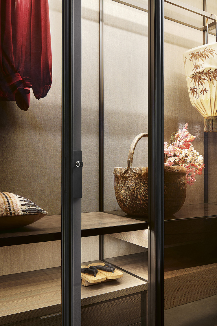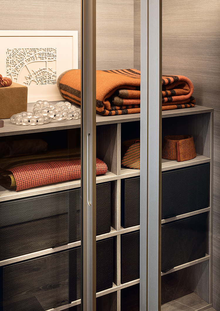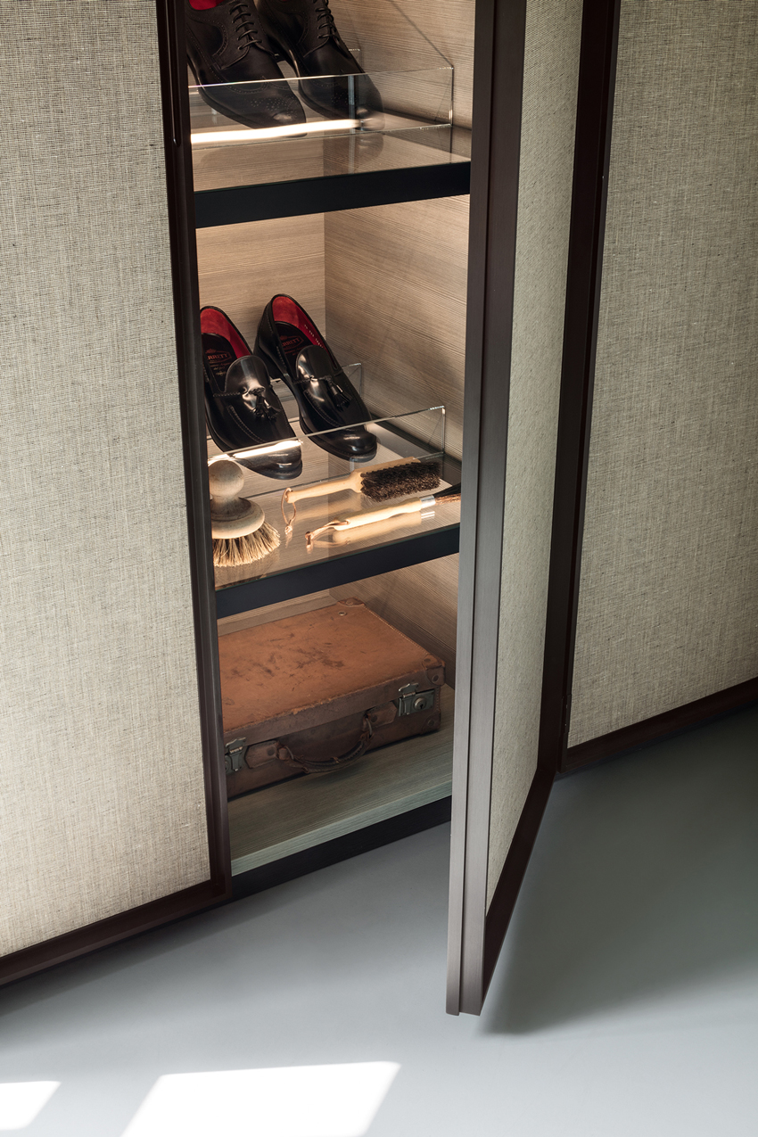 TThe Dandy Armadio al Centimetro by Officinadesign Lema offers versatile modularity and style for home wardrobes. The hinged door version features a metal frame and a wide selection of panels, including transparent, grey smoke, bronzed, and coloured lacquered glass, fabric-serigraphed bronzed glass, mirrors, bronze mirrors, light hide, and decorative fabric-covered panels.