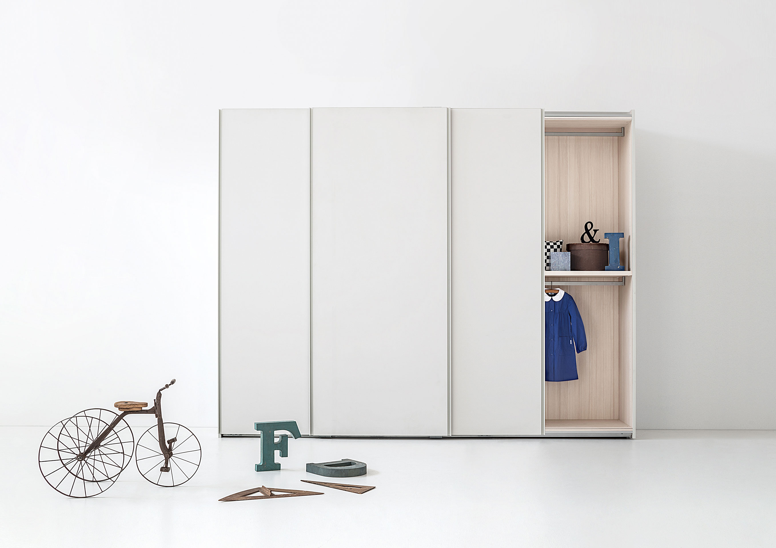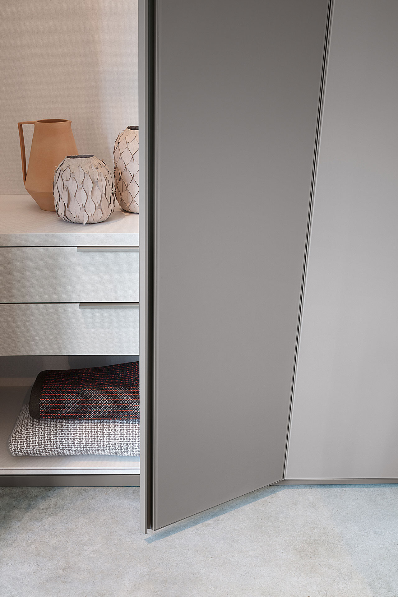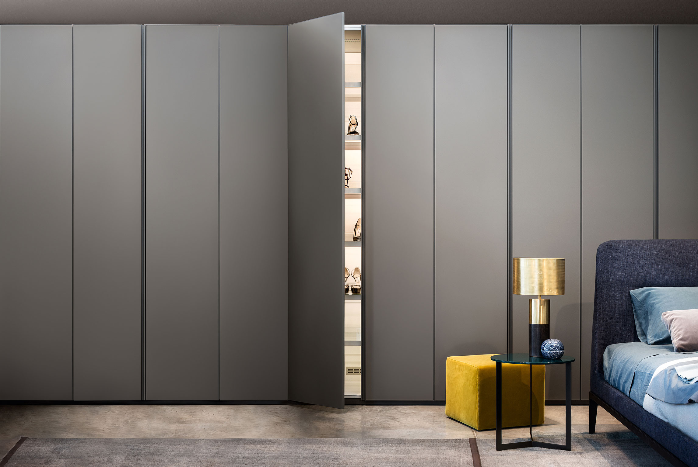Defined by a vertical slim metallic profile, Emery by Officinadesign LEMA is characterized by refined doors in back-painted acid-etched glass. This special treatment suggests a door surface that is matte and extremely smooth, discreetly concealing the bright interiors finished in new canvas melamine that has a delicate fabric-effect texture. Emery also features wide-ranging internal equipment offering multiple combinations for any need: drawer units, display cases for trousers, belts and shoes. Its shelf and hanging rail come with a built-in light, while not forgetting the precious details in leather and fabric such as mats for drawers and boxes for shirt compartments.