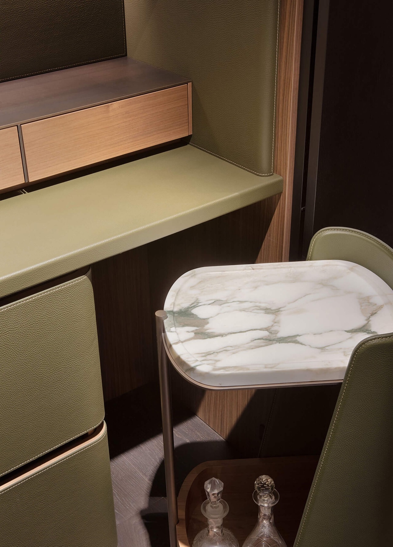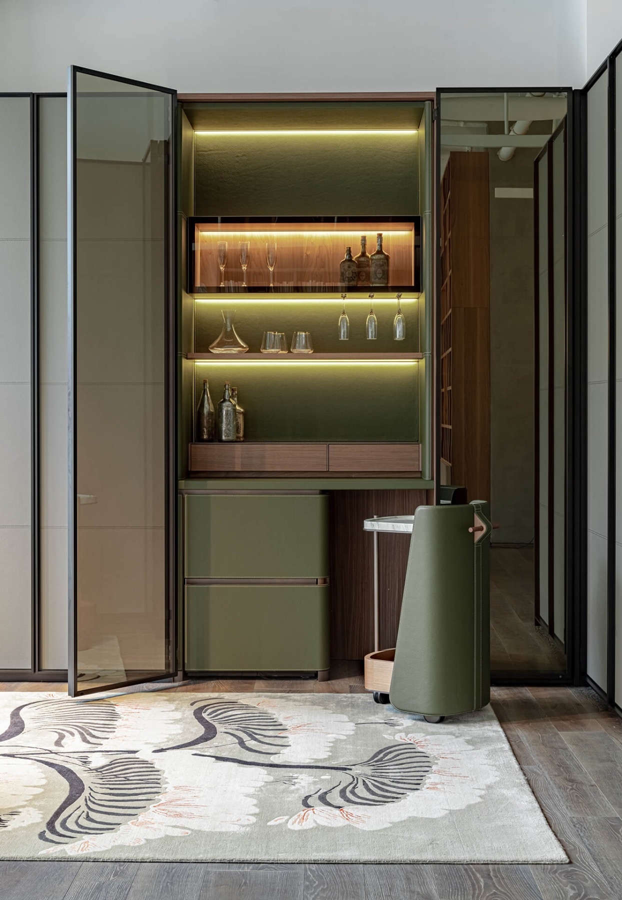 Eureka evolves into a multifunctional bar unit designed for contemporary living. Integrated with the Armadio al Centimetro, it features leather or suede panelling that conceals elegant storage for glassware and fine spirits. Fully customisable and equipped with a retractable trolley, it offers refined functionality and can house advanced refrigeration solutions with effortless style.