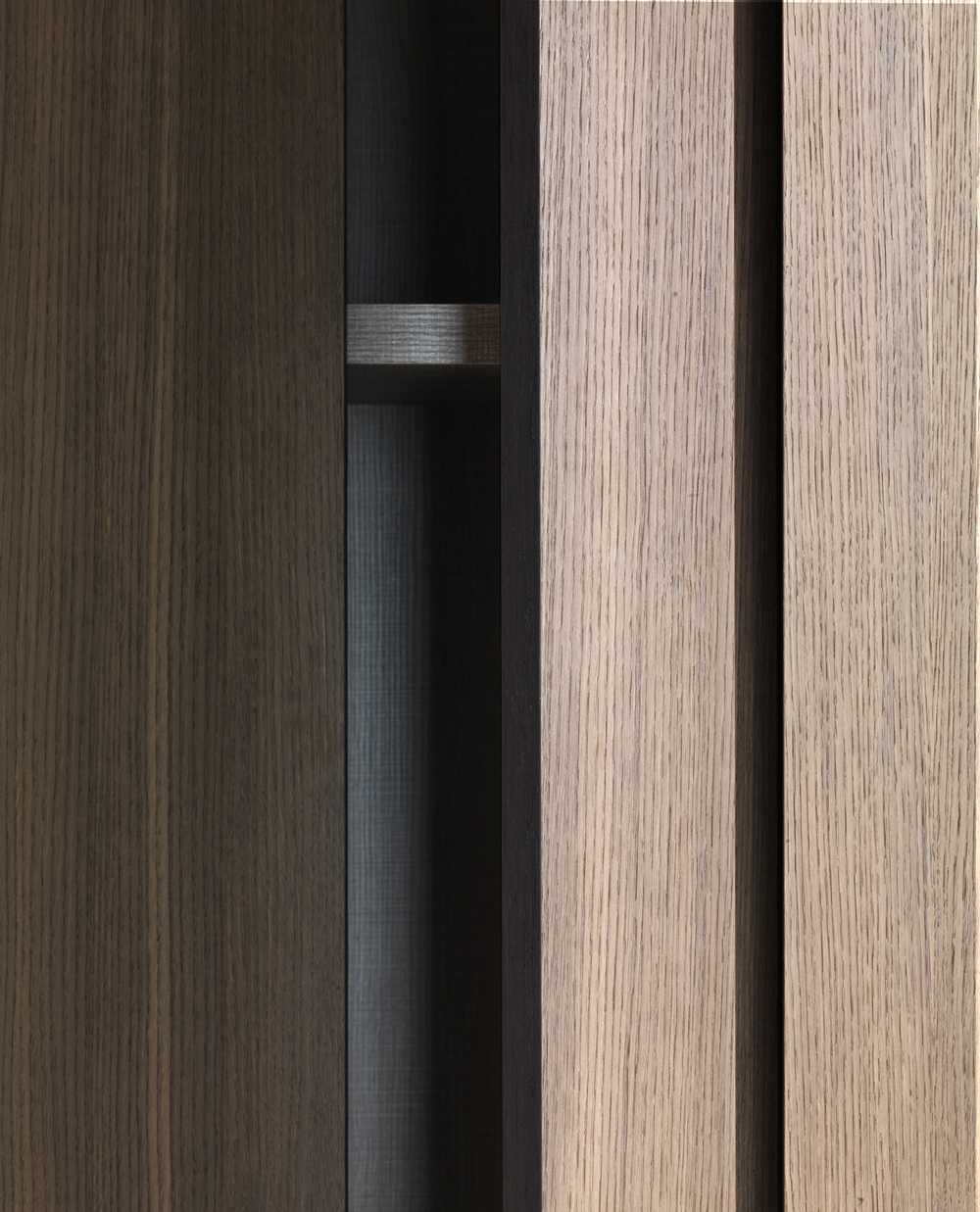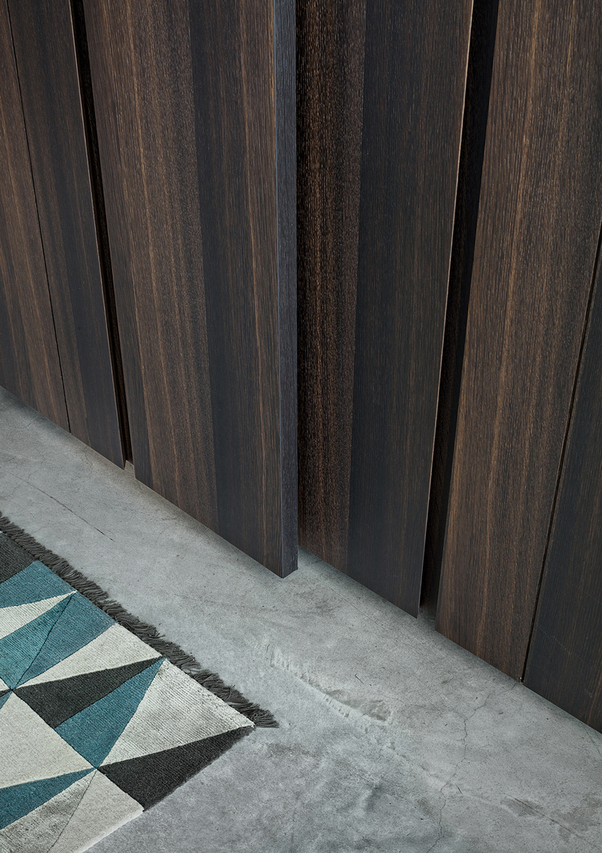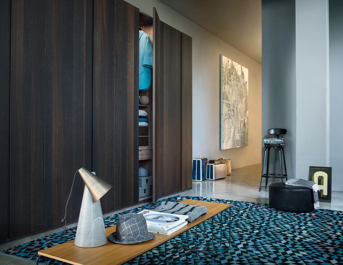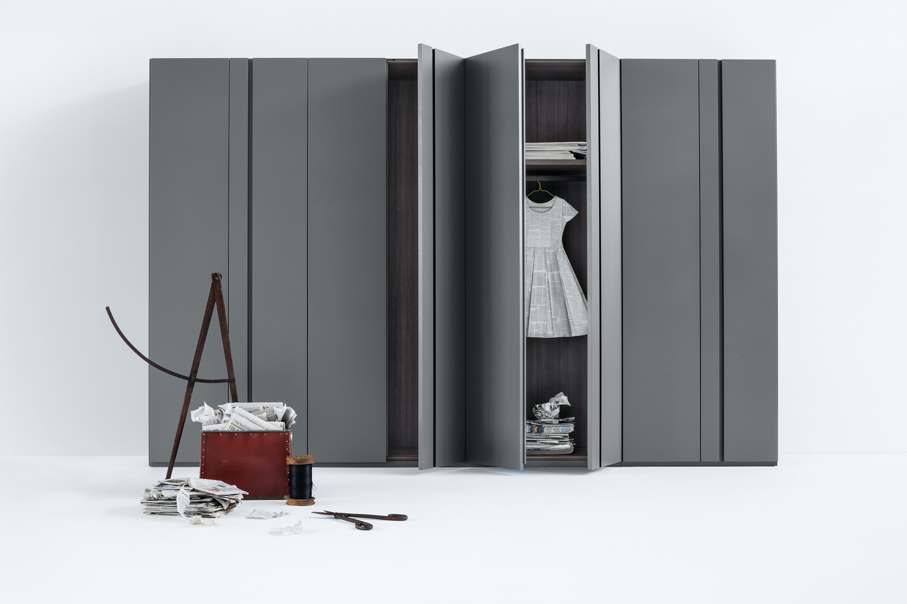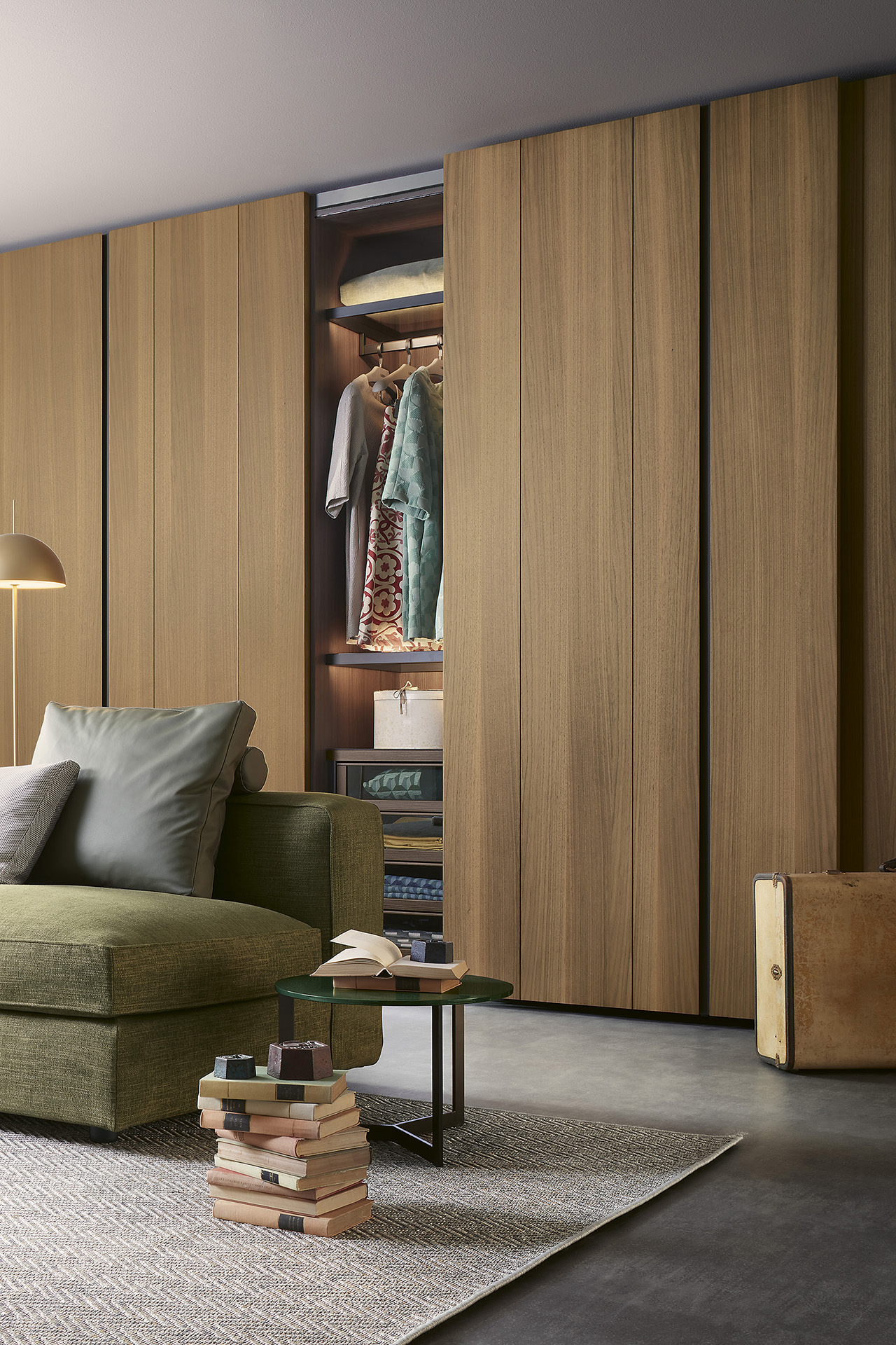 Graphic marks on the surface distinguish the Naica wardrobe system. The grooves which follow the entire height of the door create a harmonious flow along the entire wall. Adaptable in width with wide-ranging internal equipment offering multiple combinations for any need: drawer units, display cases for trousers, belts and shoes, shelves and hanging bar with integrated lighting. Available hinged, sliding and coplanar.