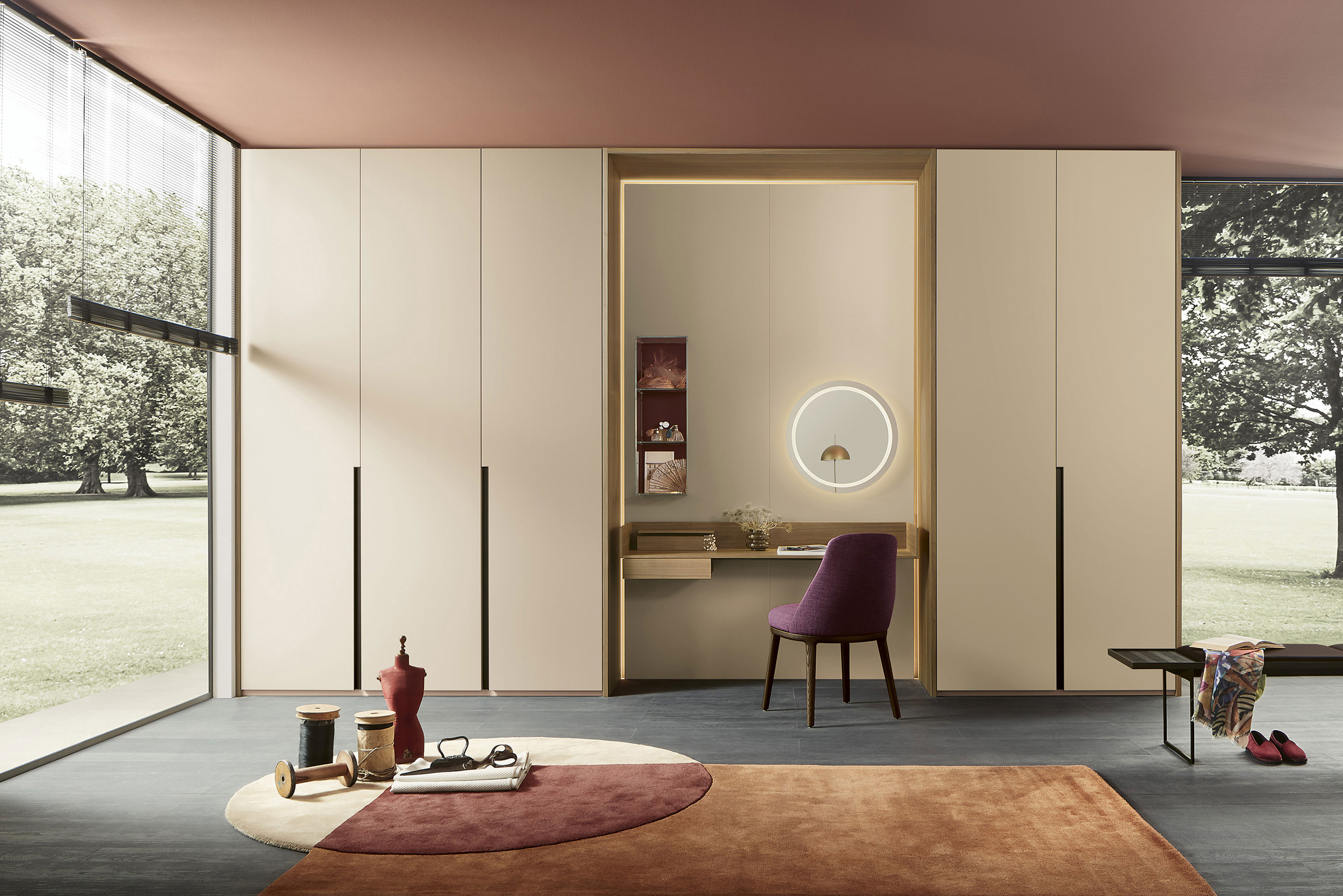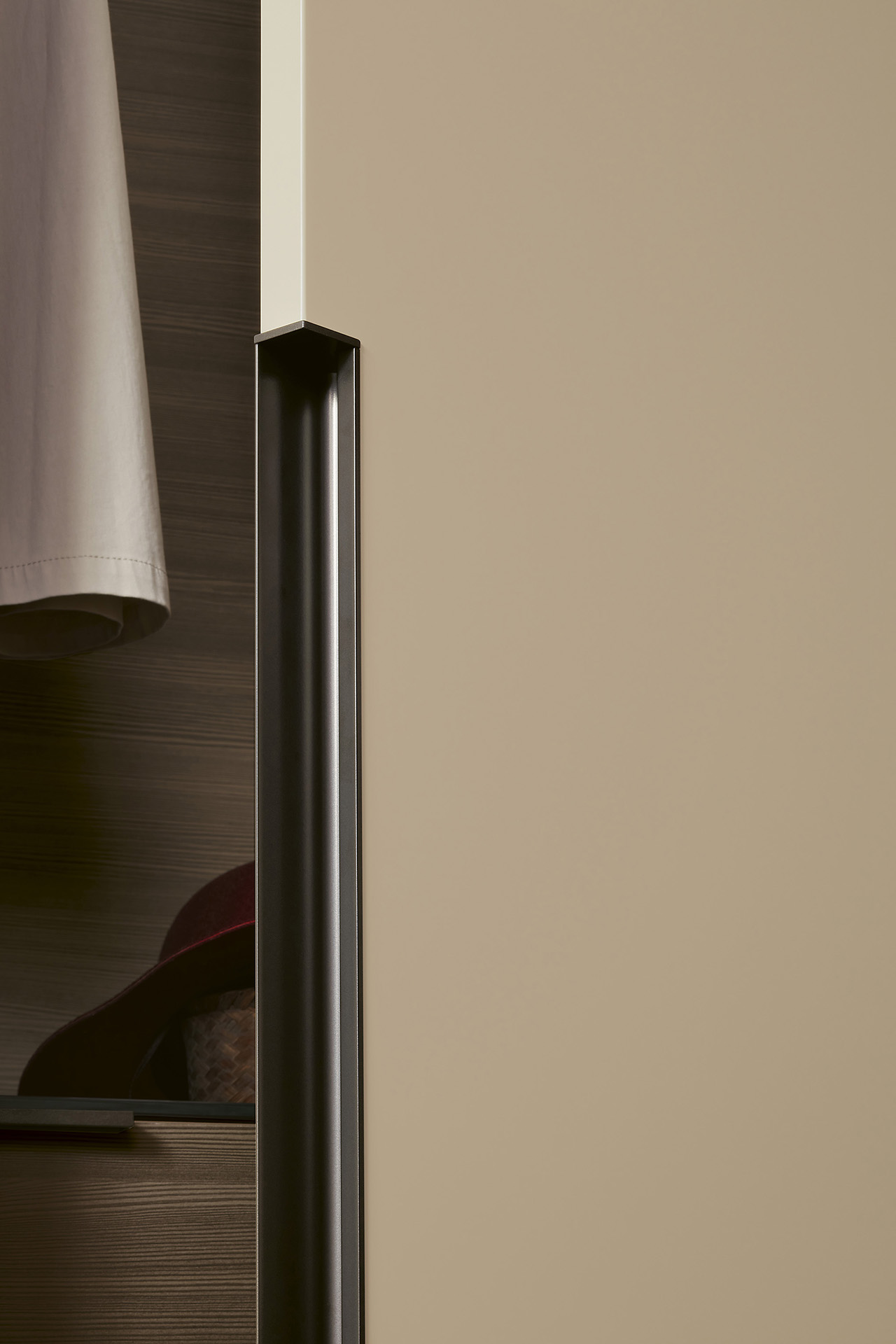 Choose from a rich palette of finishes — melamine, matte lacquer, Carbone oak, Noce-L, and thermo-treated oak — paired with recessed handles in bronze or matte lacquer.