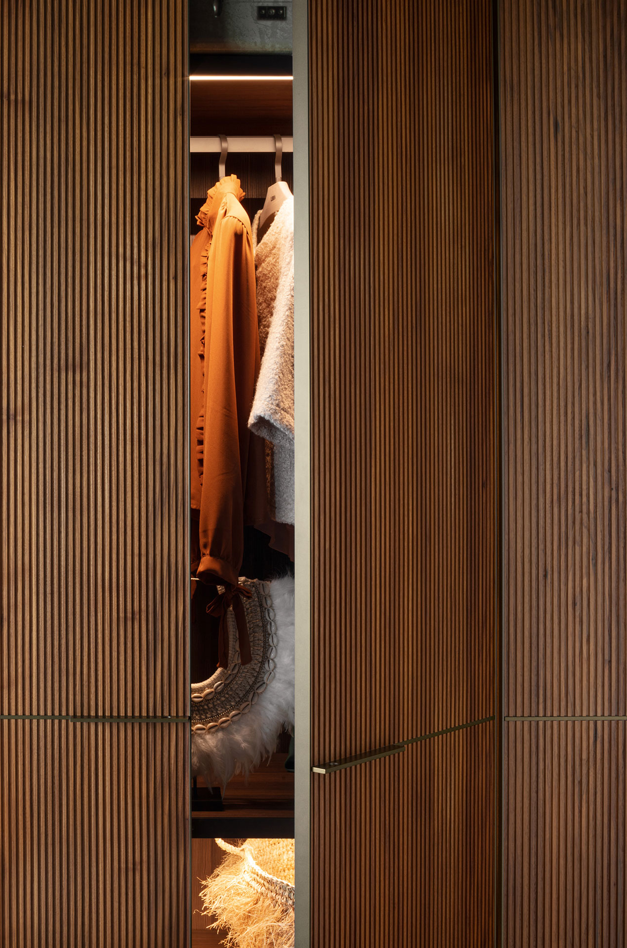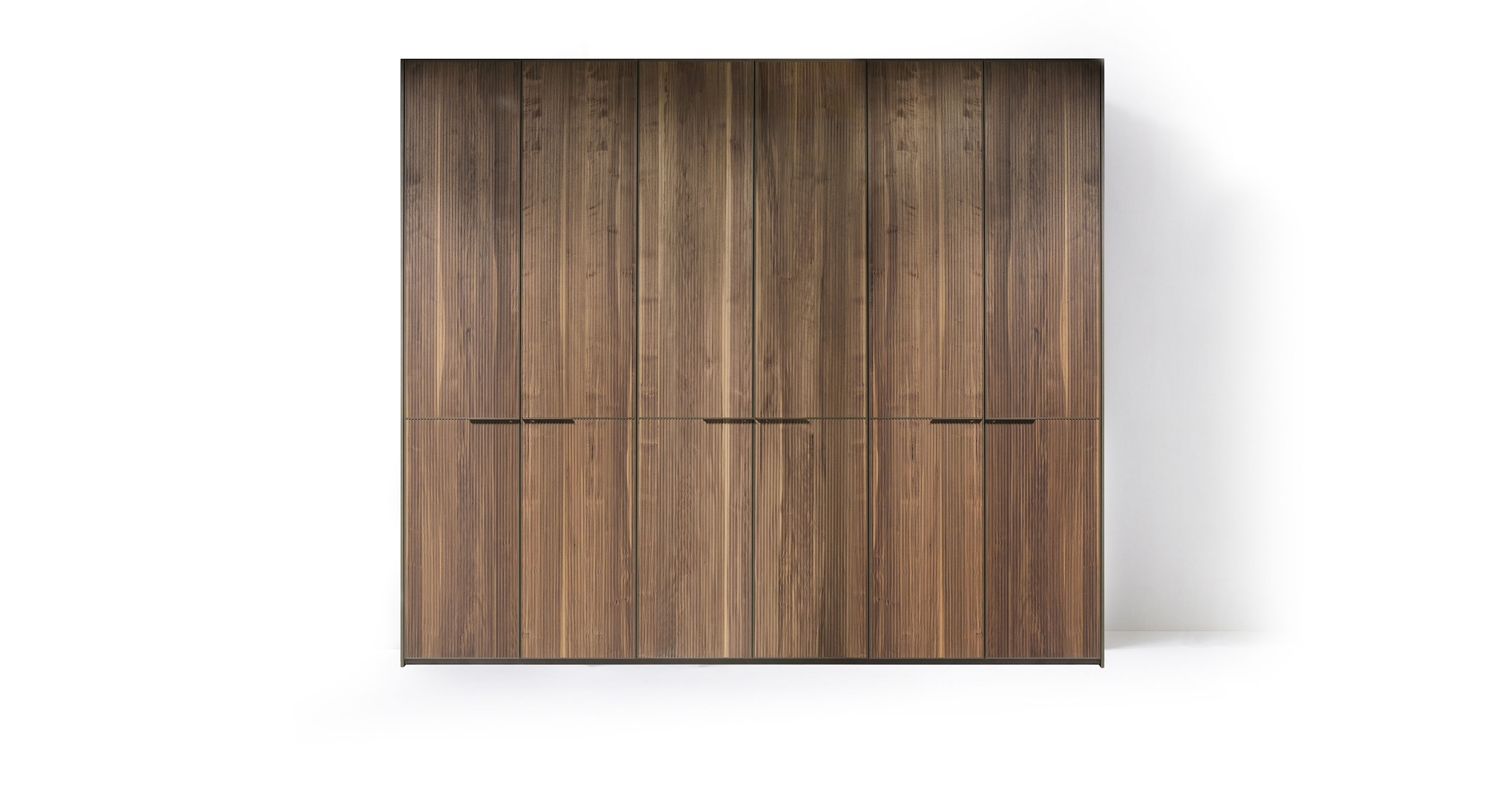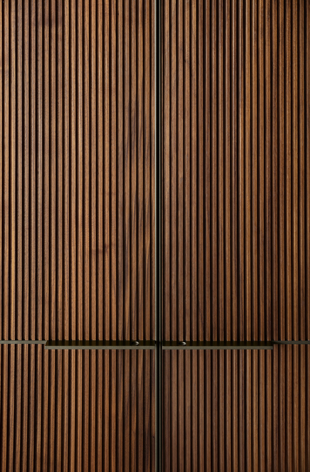 Defined by the textured micro-slat effect of solid Canaletto walnut doors, Seryasse offers a three-dimensional vertical elegance softened by bronze-painted handles.