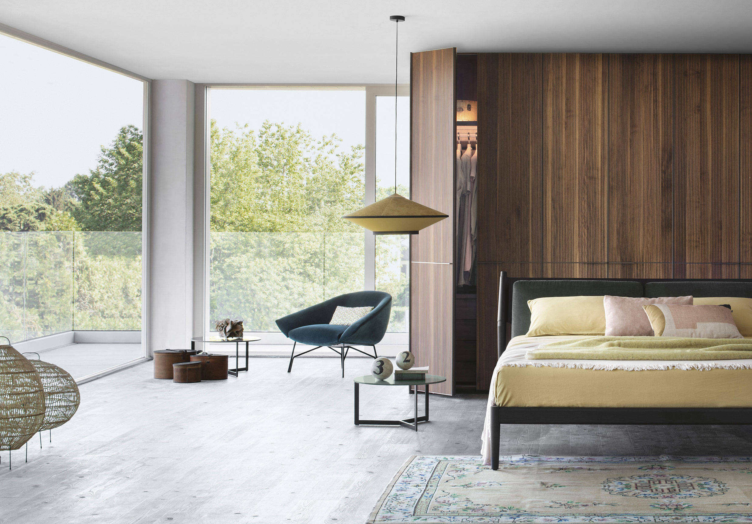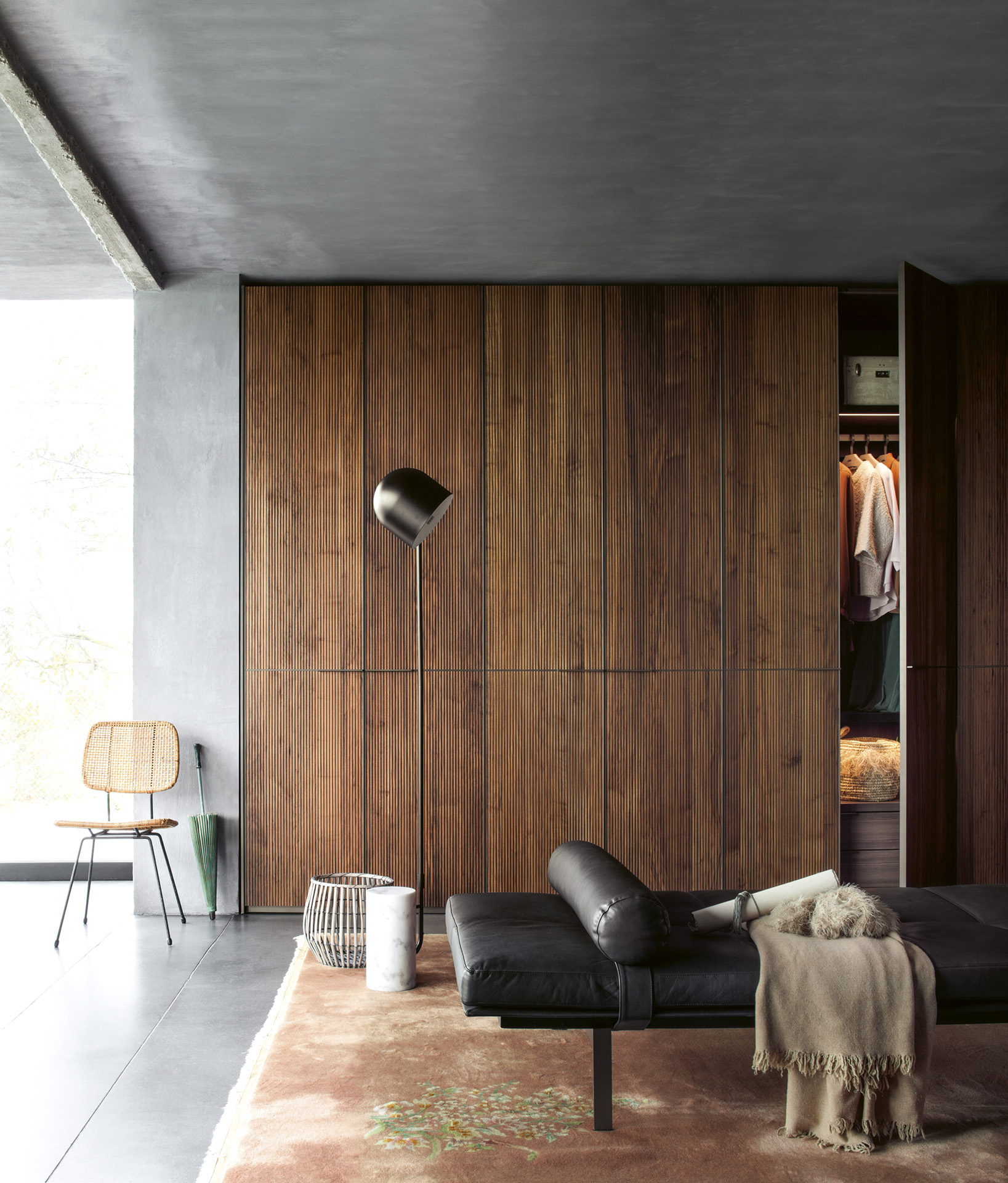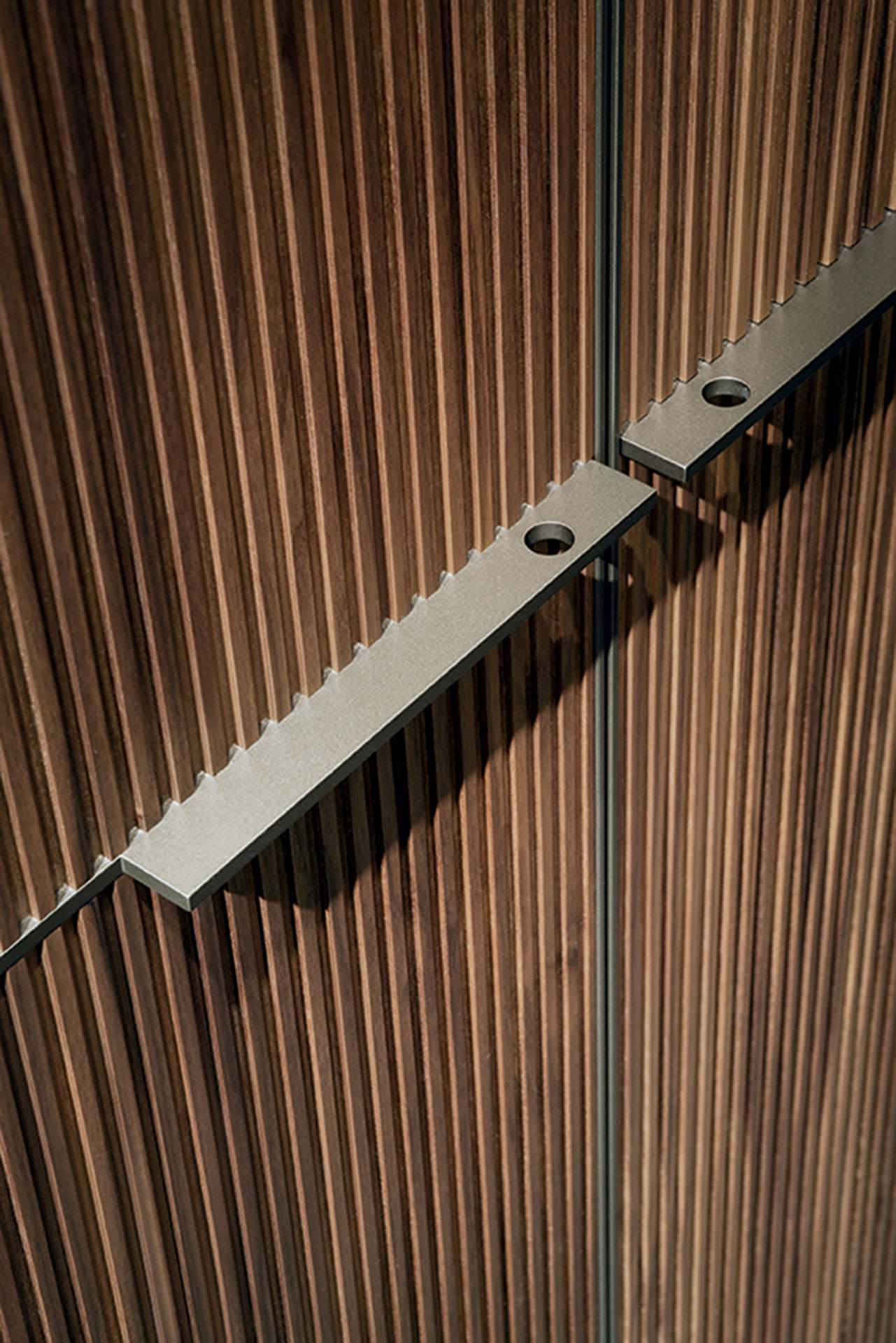 Defined by the textured micro-slat effect of solid Canaletto walnut doors, Seryasse offers a three-dimensional vertical elegance softened by bronze-painted handles.