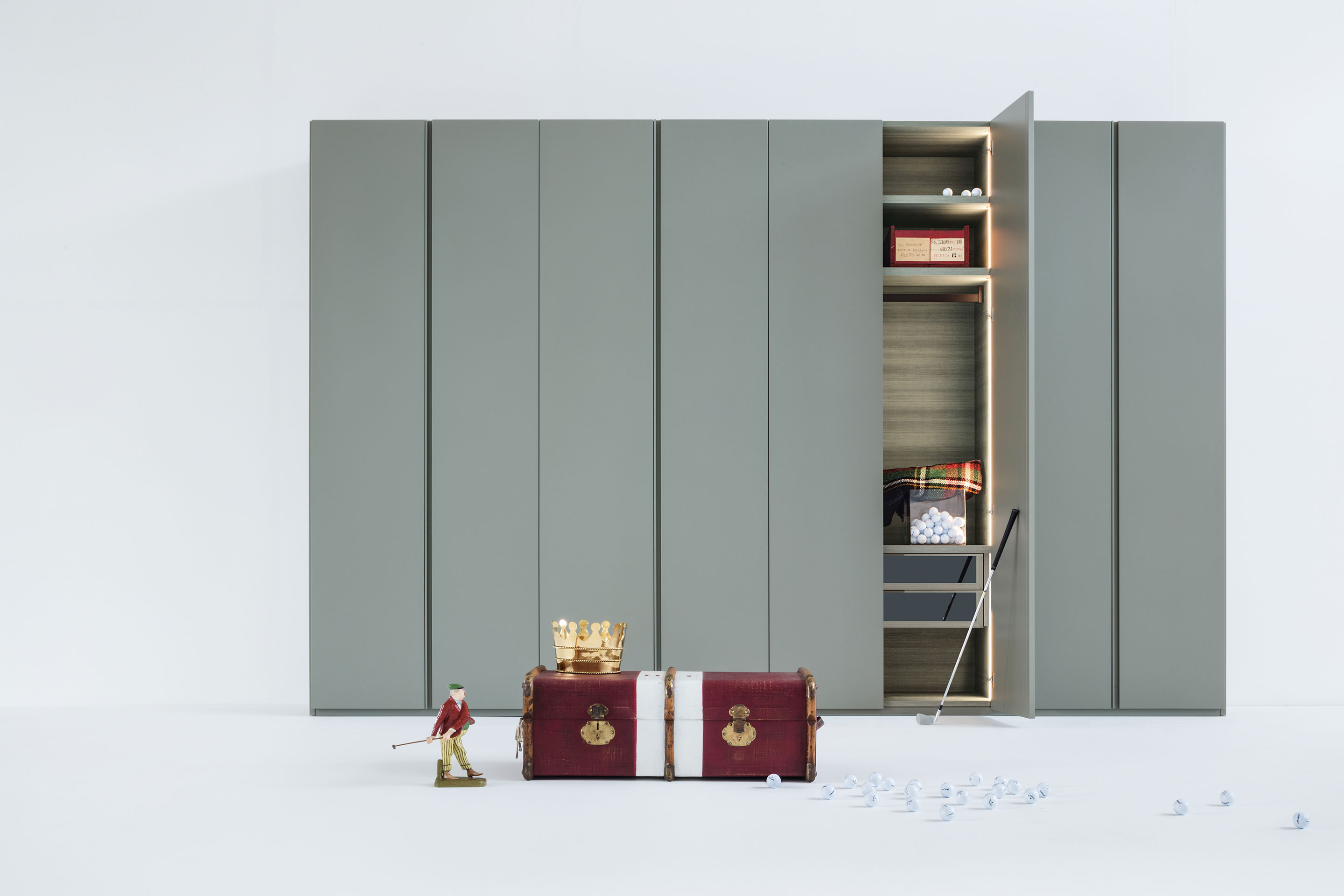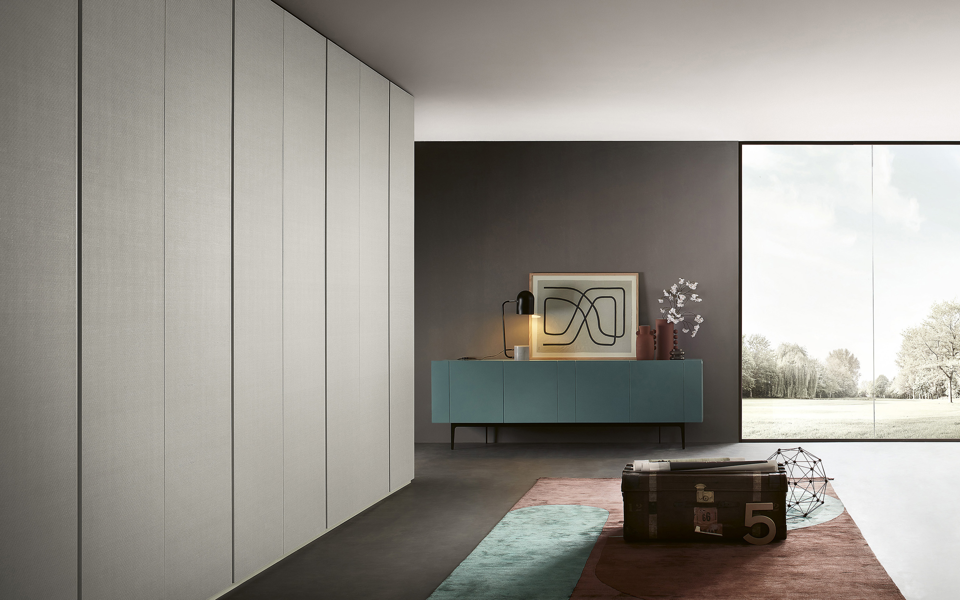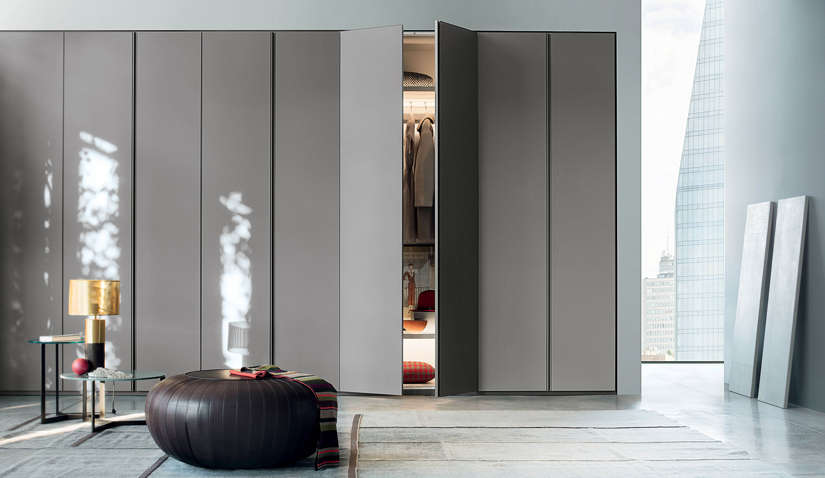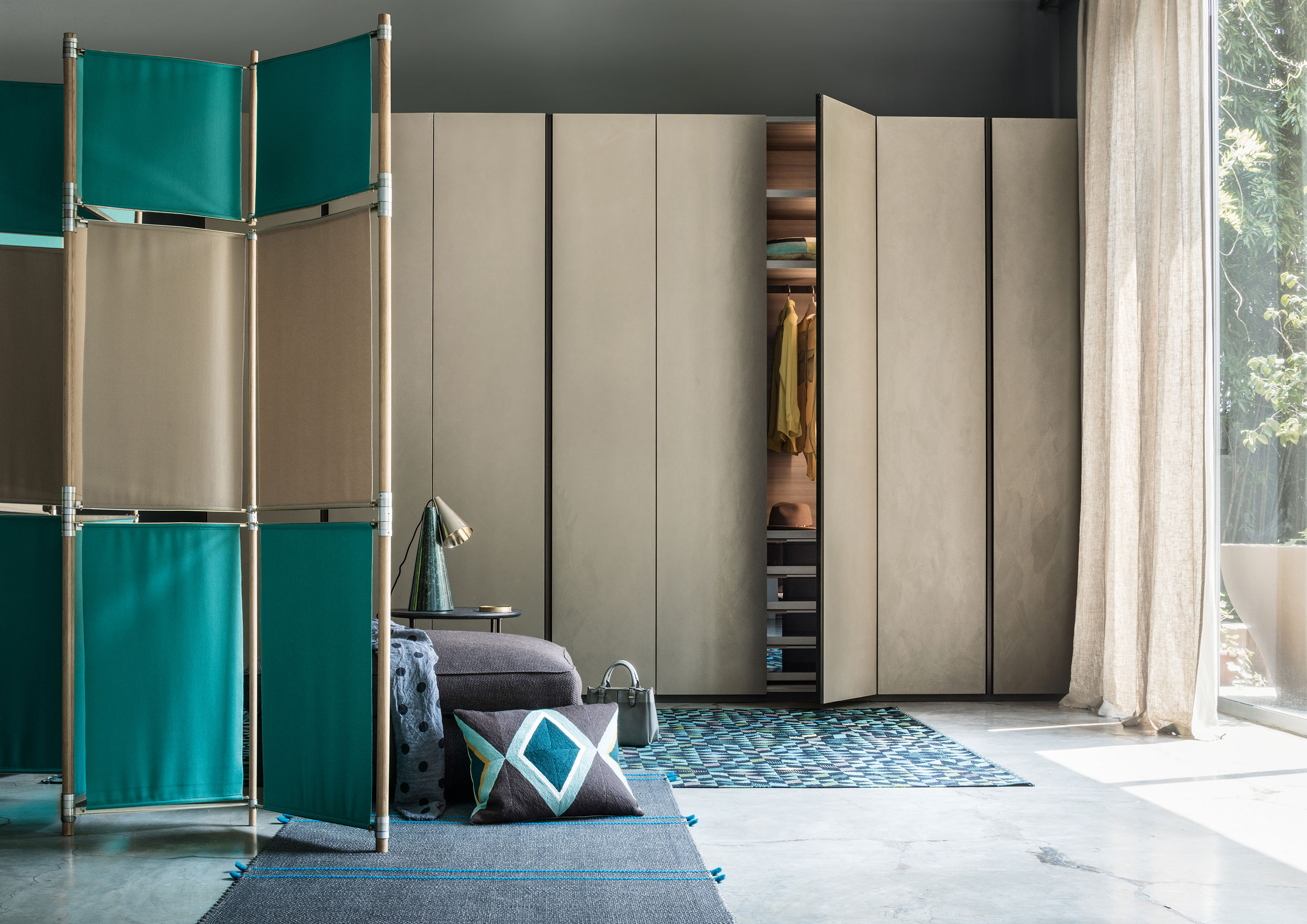 Distinguished by an elegant vertical metal profile, Text by Officinadesign LEMA is available with hinged, sliding or coplanar doors. Extremely versatile, it is perfect for custom-designed homes, adaptable in height, width and depth, and available for corner solutions.