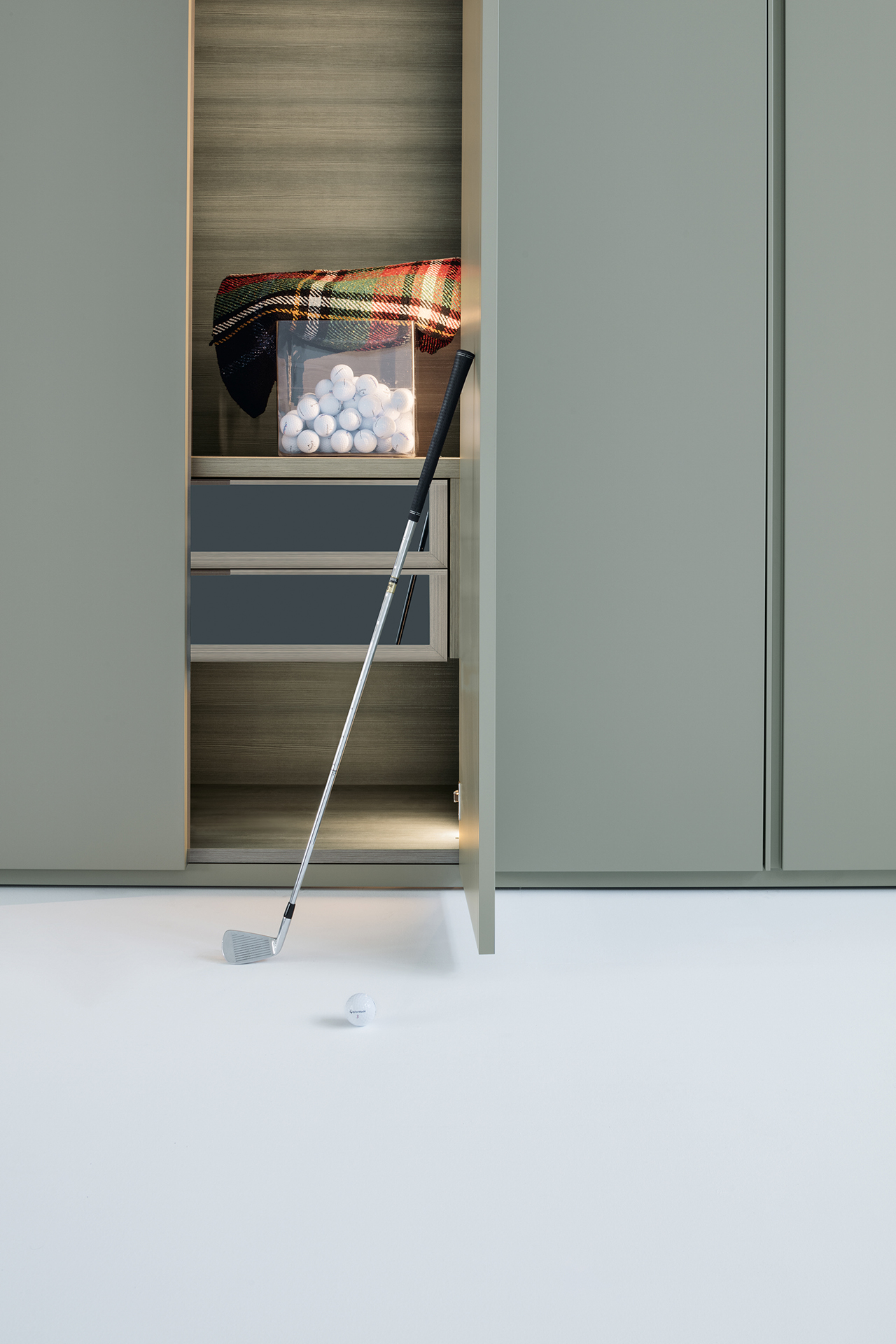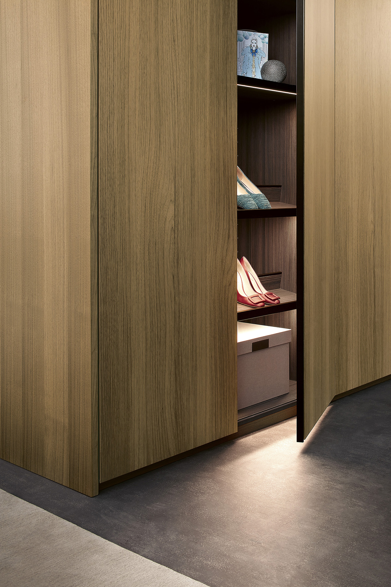 The handle can also be customised in bronze or lacquered colour, matching the doors. Wide-ranging internal equipment options offer customisation to suit any need. Drawer units, display cases for trousers, belts and shoes, shelves and hanging rail with built-in lights are completed with luxury details in leather and sumptuous fabrics for a wardrobe that is truly elegant.