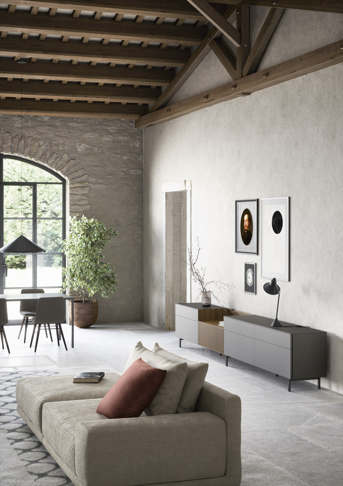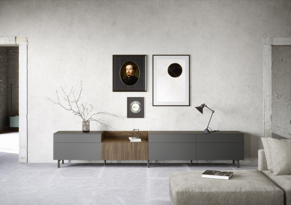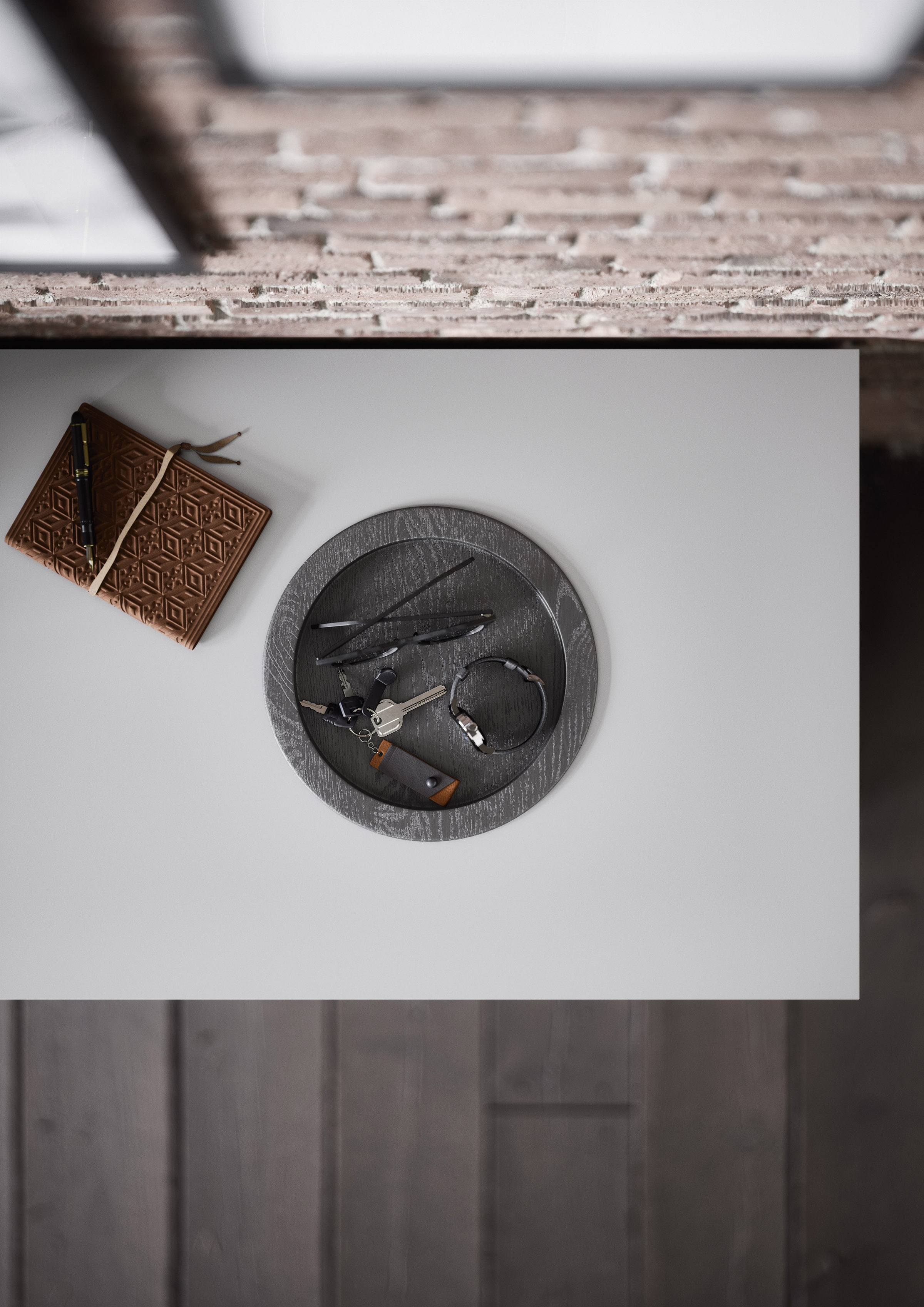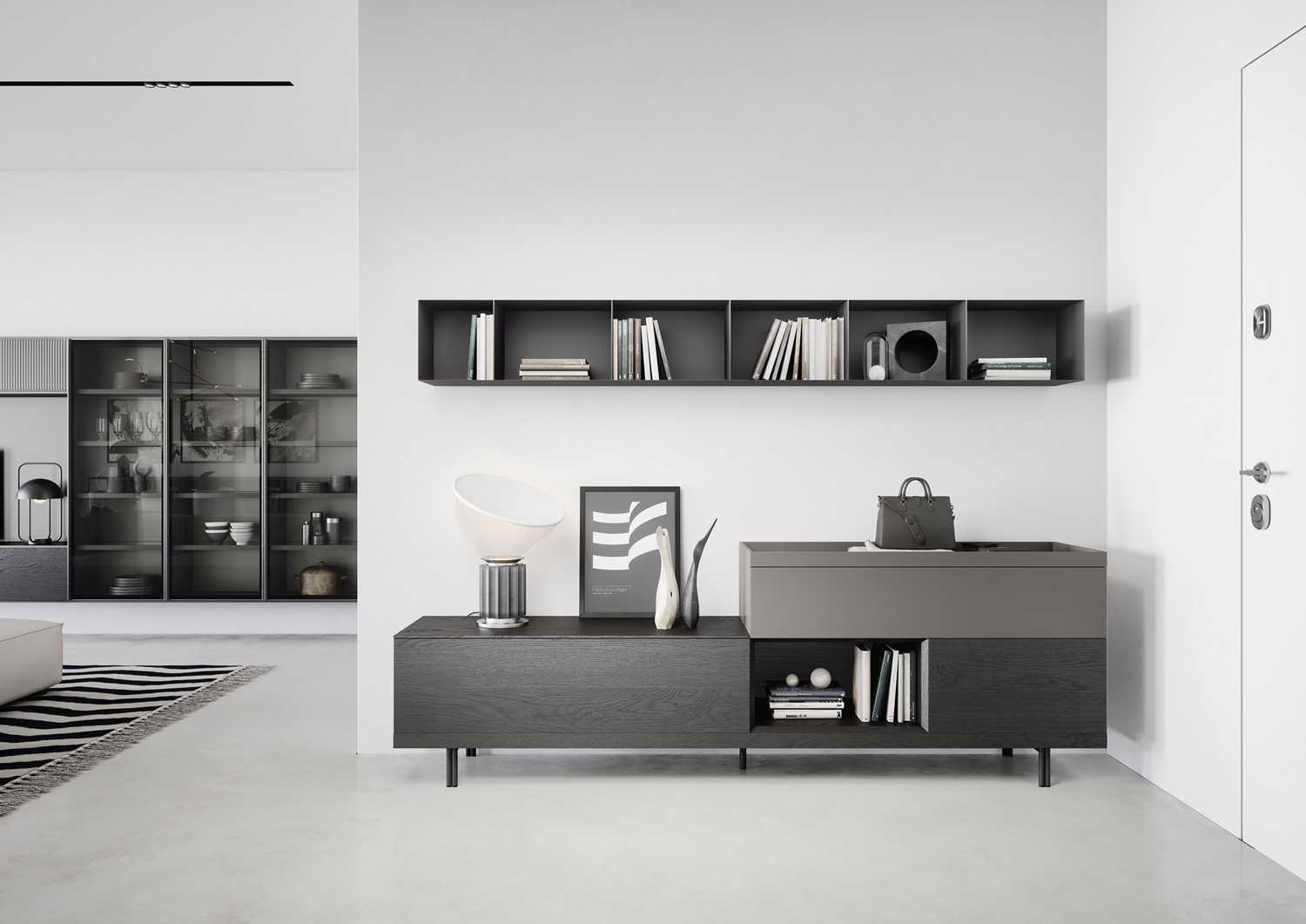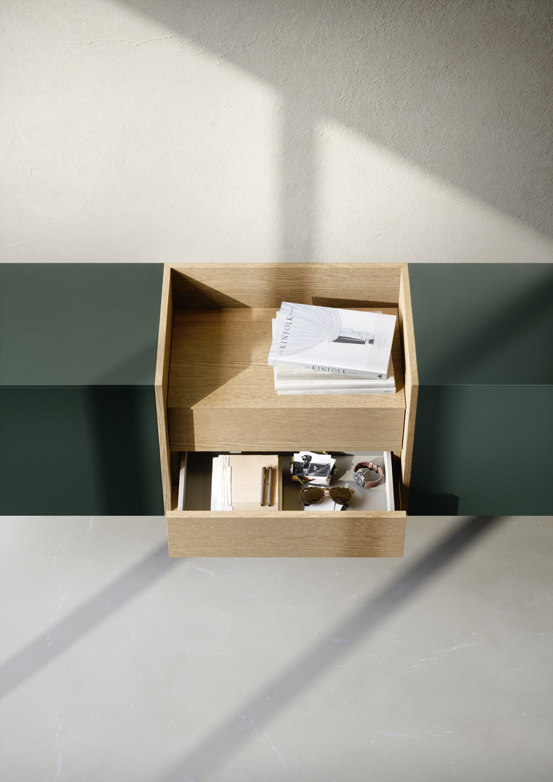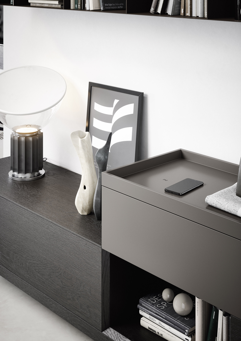 Accessories like the Side side panel, upstand top, Tray-C recessed tray, and tray top by Philippe Nigro integrate seamlessly with modular base and storage units, offering visual coherence and elegance in multiple catalogue finishes.