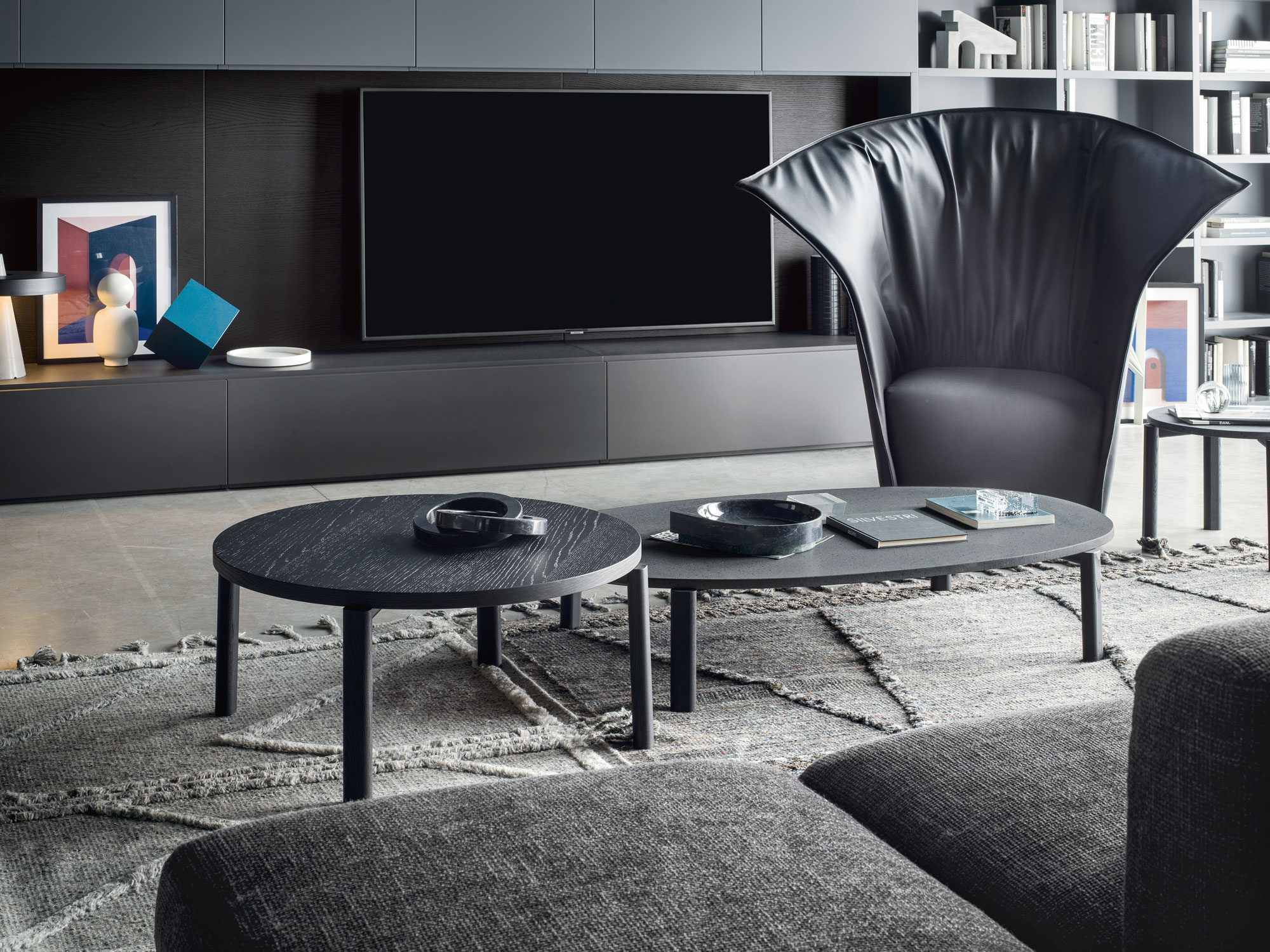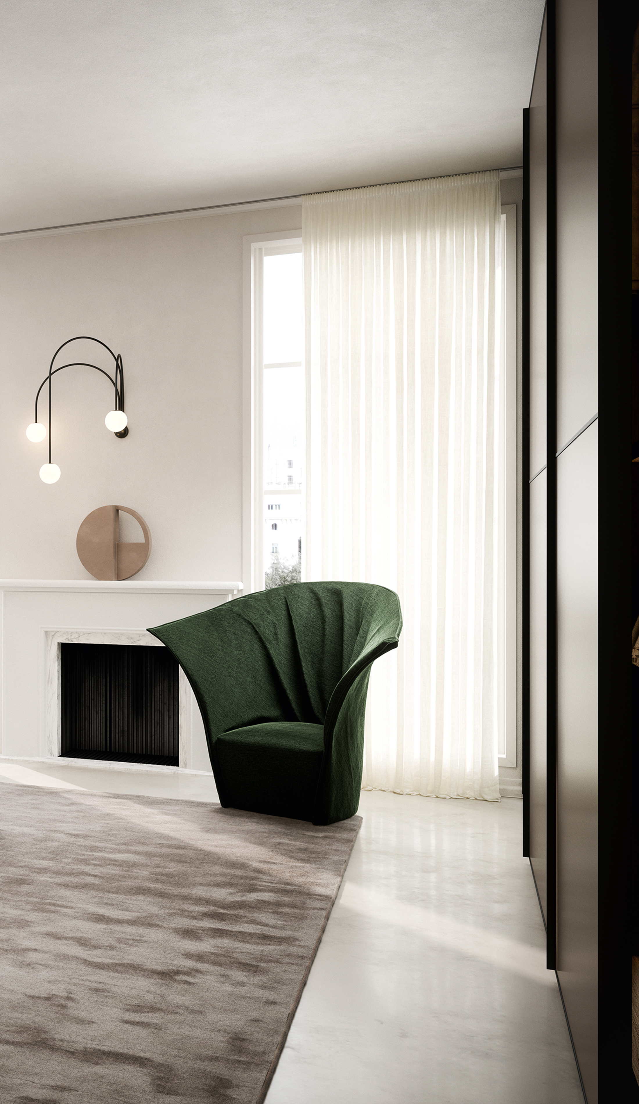 The original and wonderfully elegant Artichoke armchair features a simple, enveloping, and moldable shape that invites you into sink into its comfortable embrace. It is available in fabric, imitation leather, or felt, with either a swivel or fixed base.