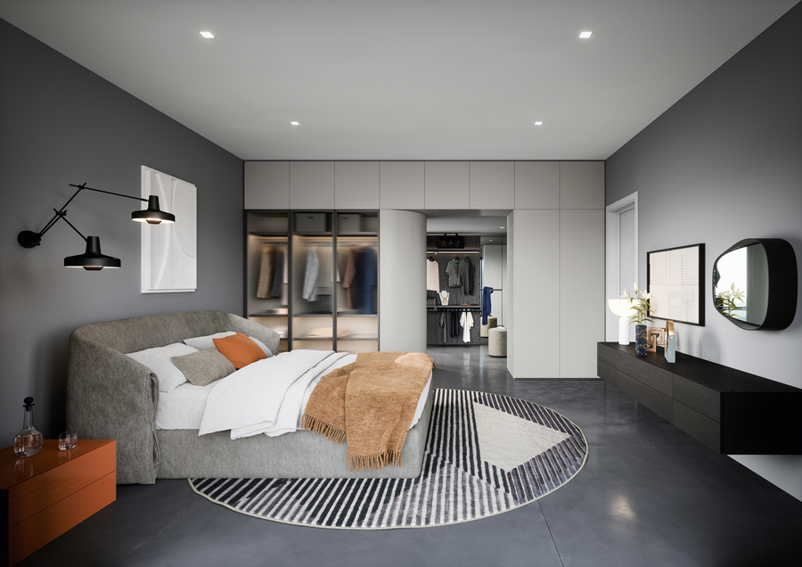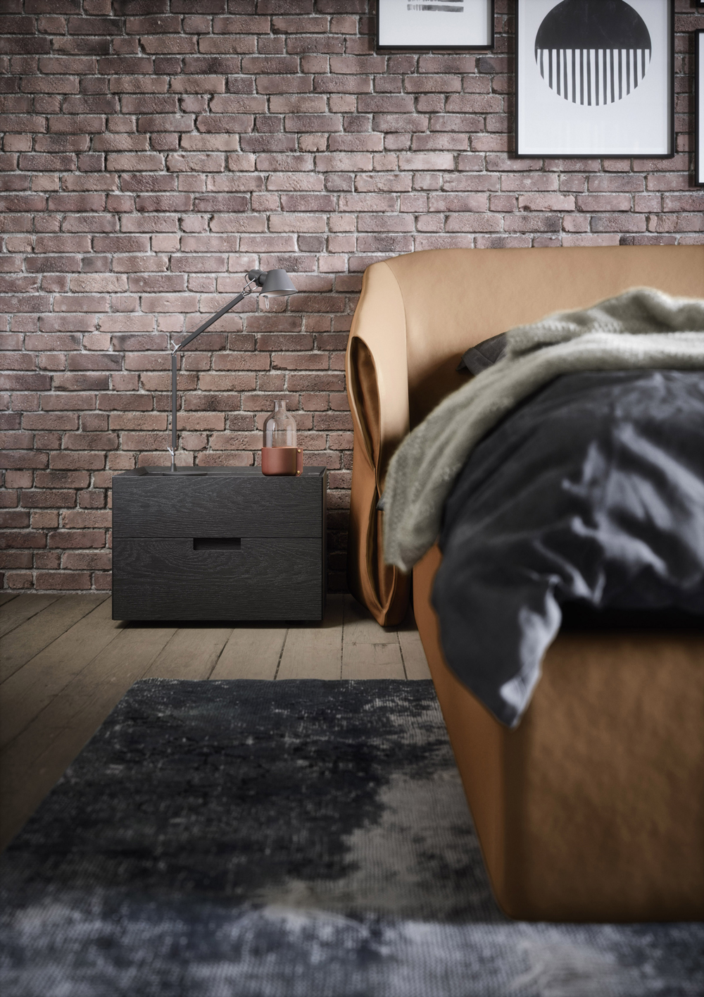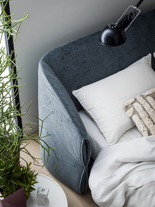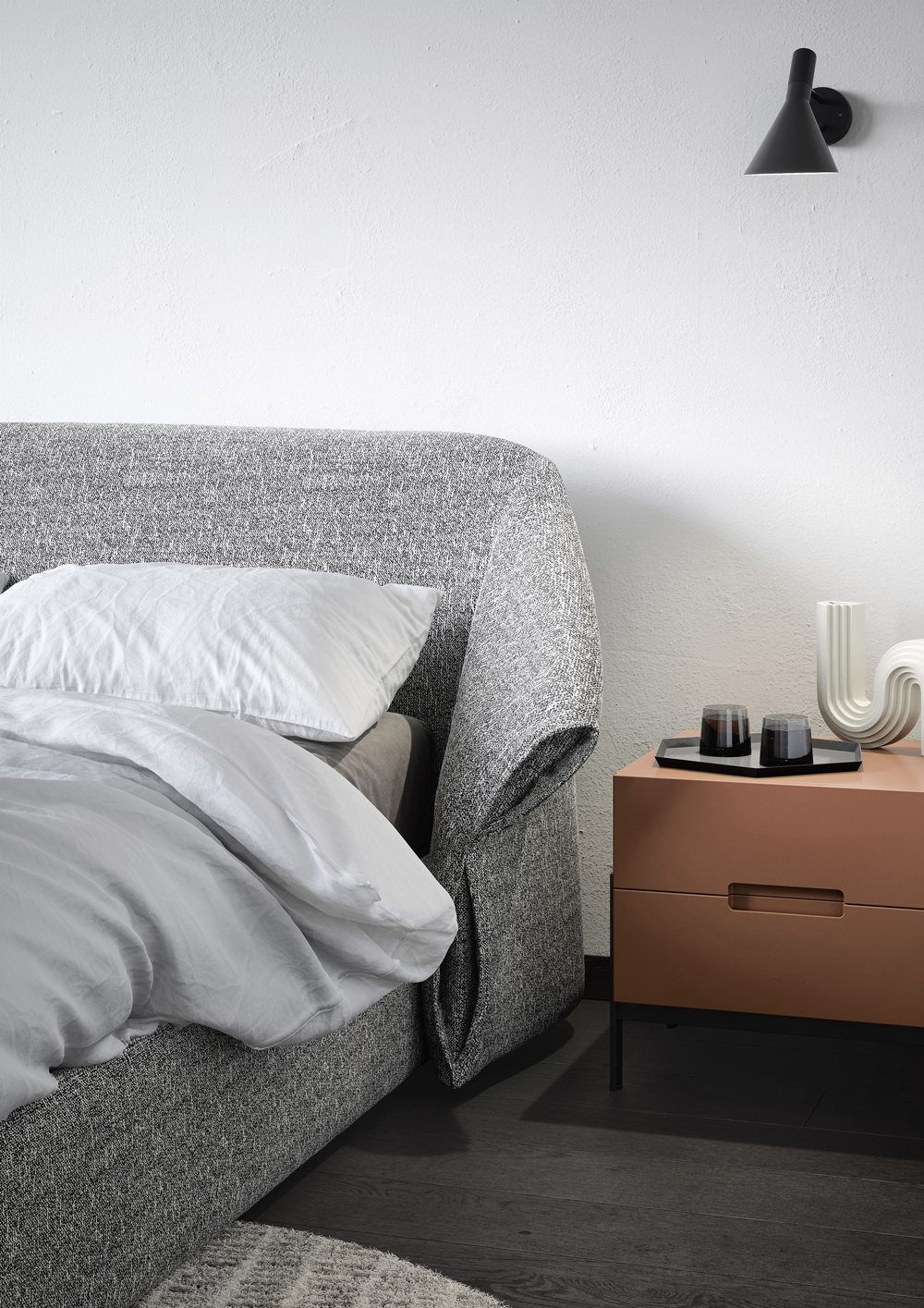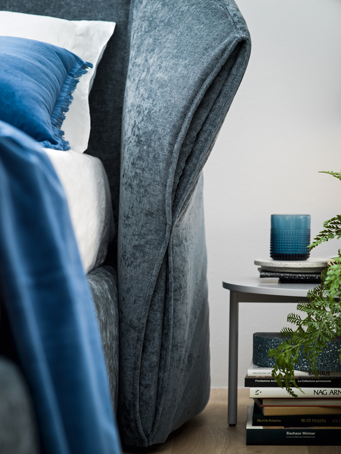Designed by Valeria Carlesso, Hide is a fully upholstered bed with a distinctive curved headboard that embraces you visually. It offers customization options for upholstery and includes a storage base with manual or motorized lift for added convenience in bed-making.
