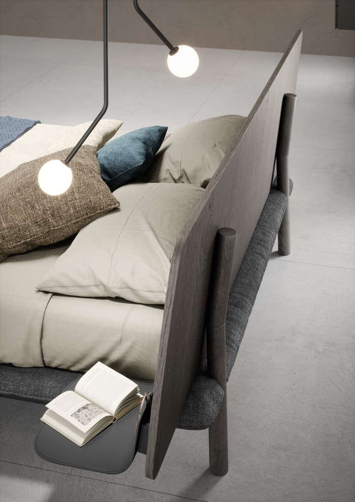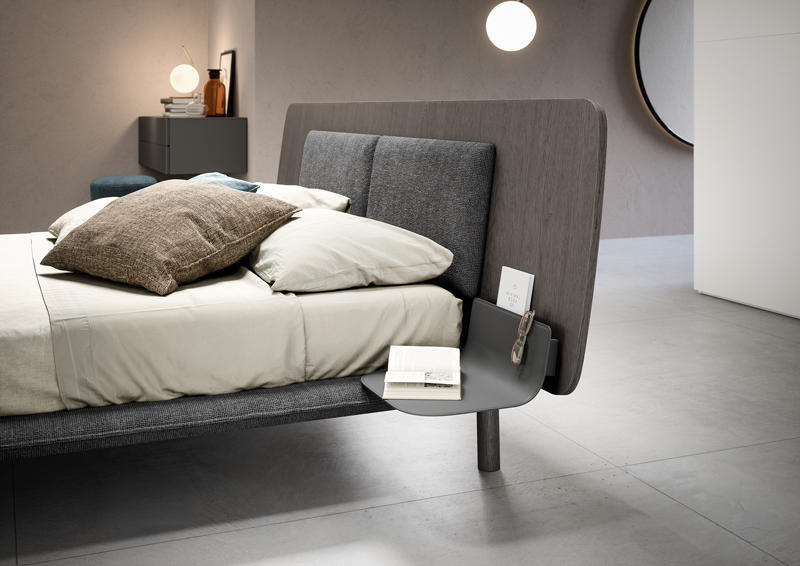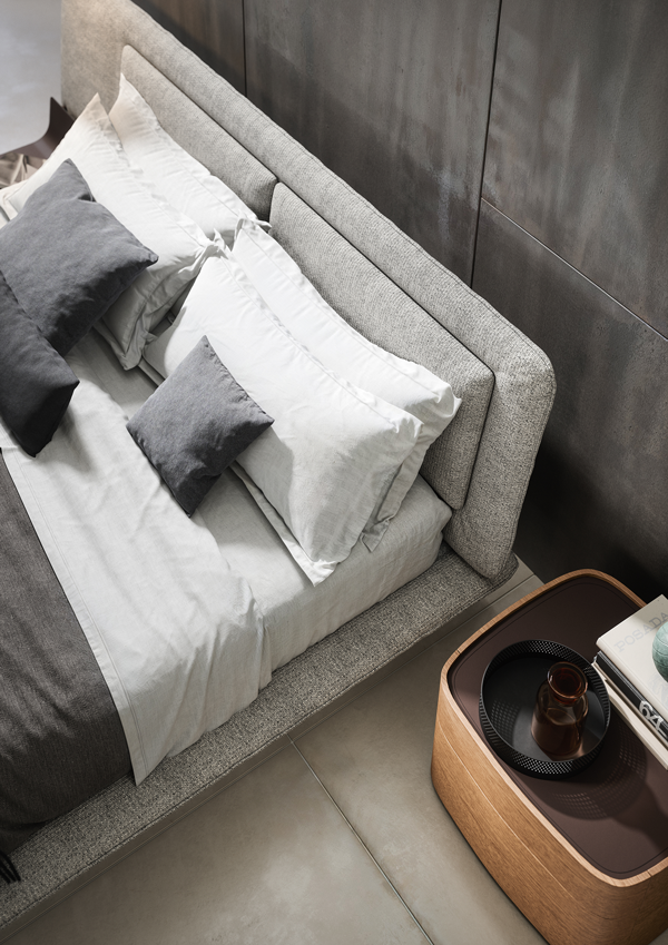 Bold and distinctive, the Matisse bed features a statement headboard—optionally padded with one or both sides extended to hold elegant leather trays that serve as built-in bedside tables.