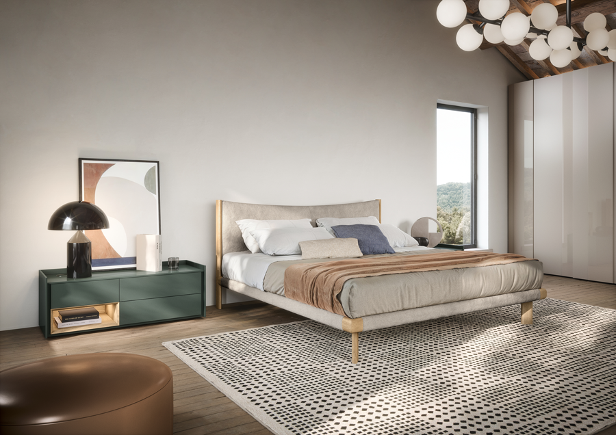 Inspired by Japanese aesthetics, Mizu features a gently curved headboard that embodies simplicity and harmony. The wooden frame, with its exposed corners, can be customised with fabric covers for a subtle, elegant touch.