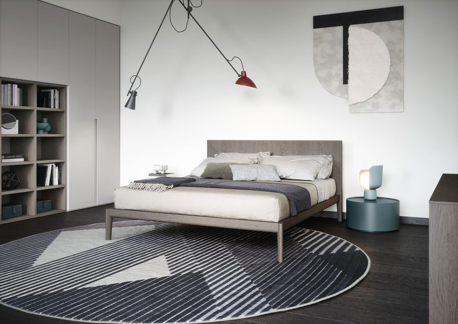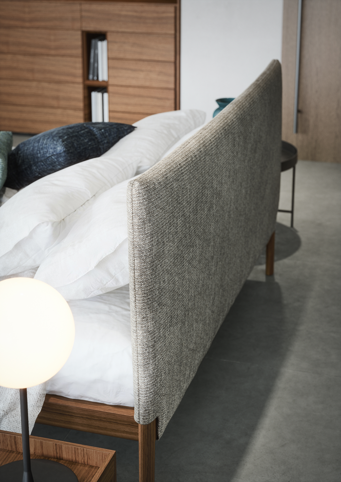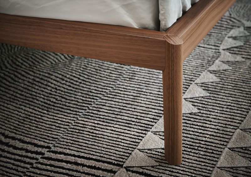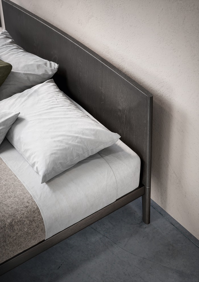 Neos pairs a generous, customisable headboard with a sleek frame set on solid wood legs angled at 45°, creating a sense of balance, lightness, and refined modernity in any bedroom.