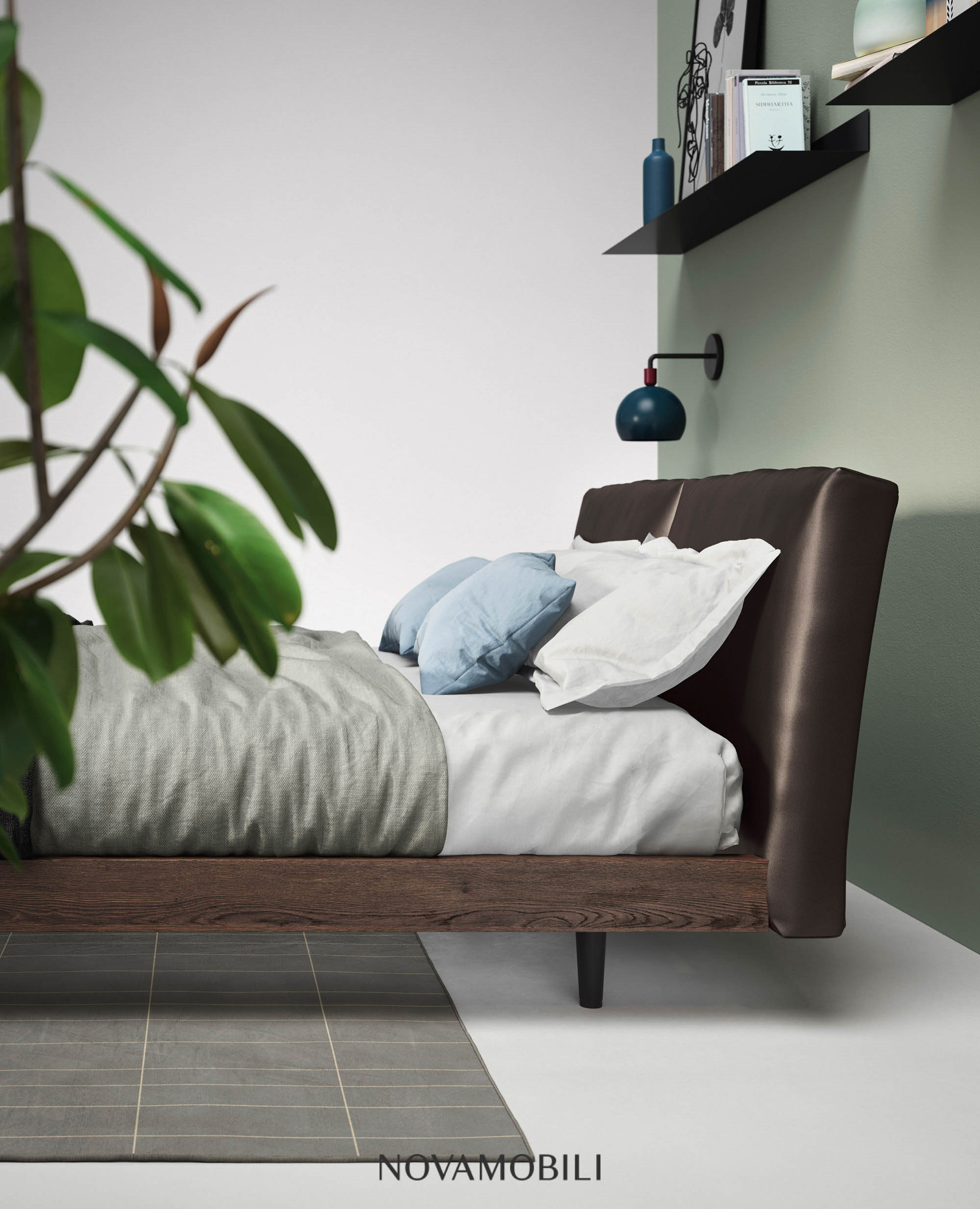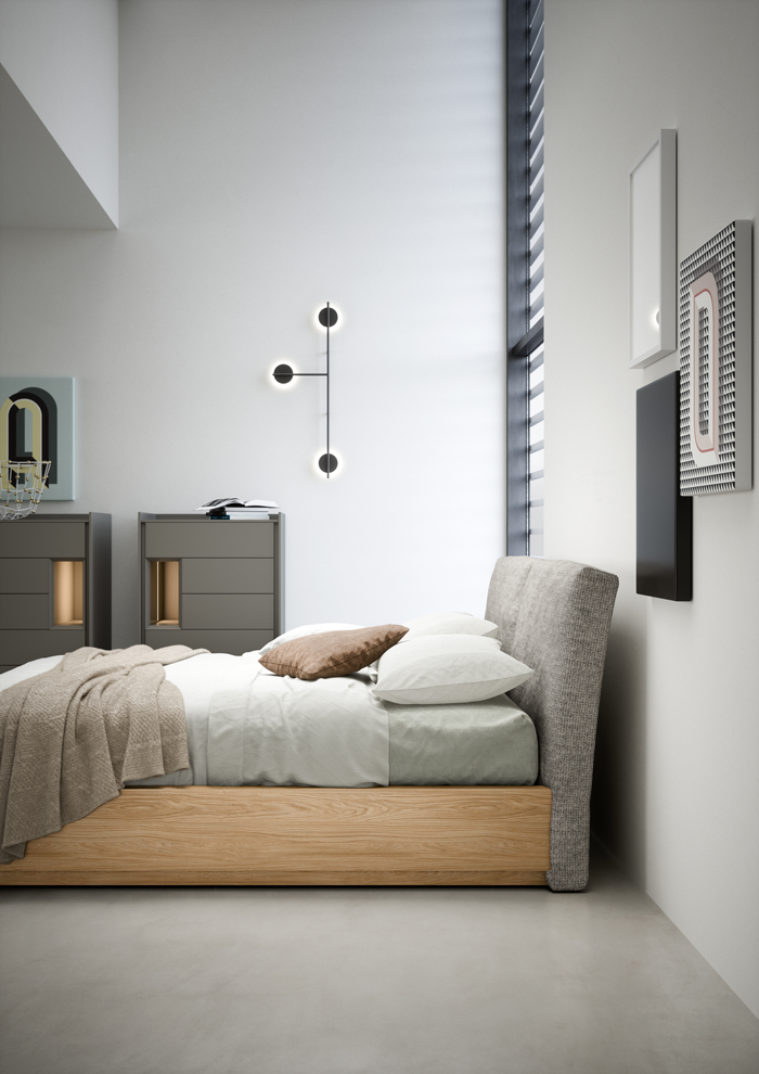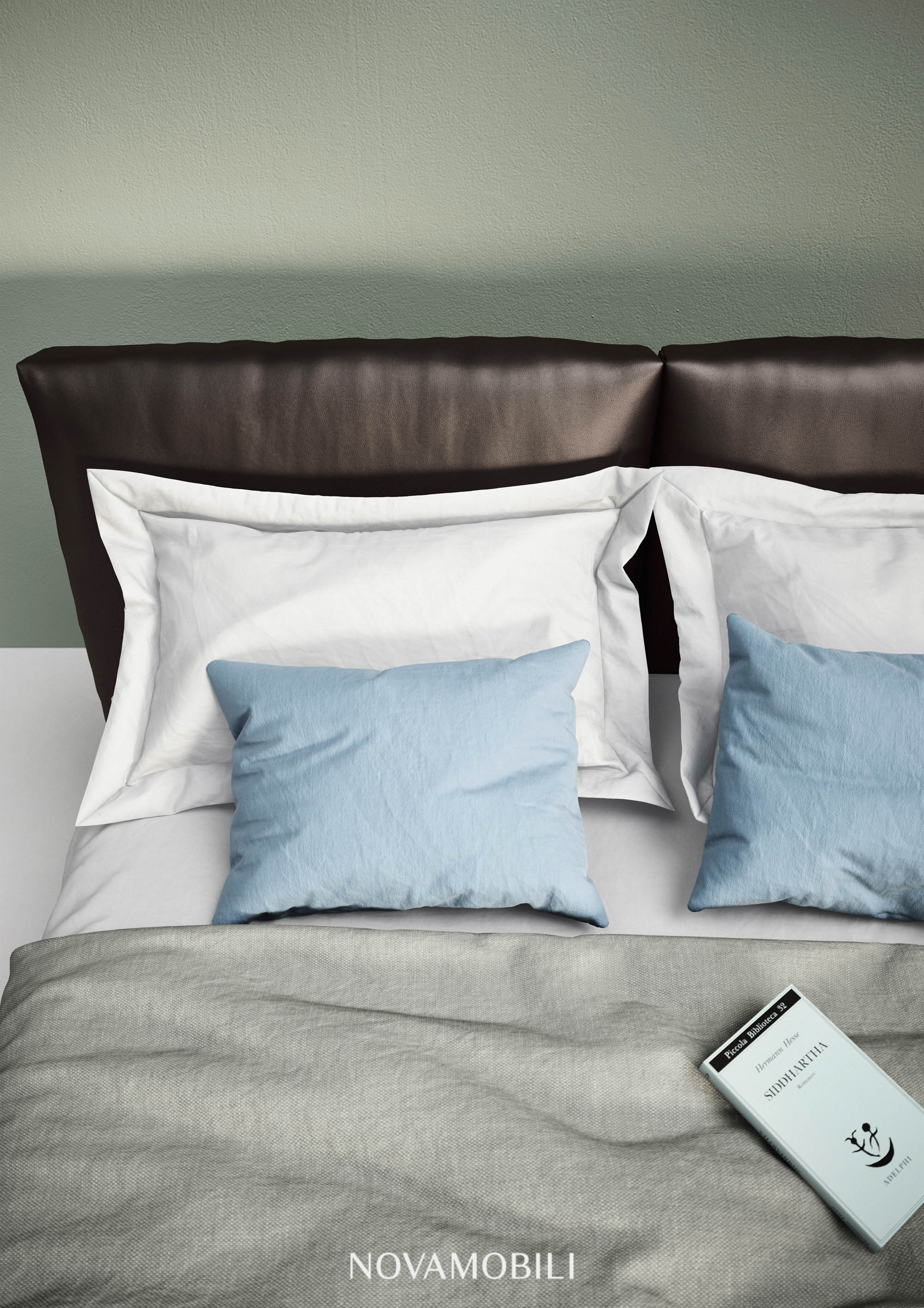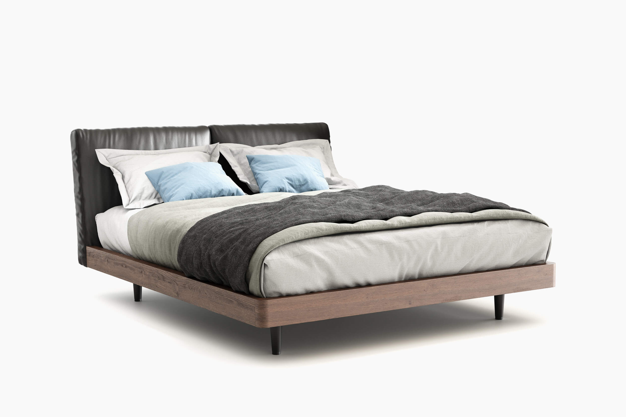 The minimal geometry of the Nido bed mergers technical tradition and modern looks. This elegant bed fits well in any setting: from a contemporary to a more classic interior. The bed surround's geometric shapes, with mitered detailing on the corners and square legs, pair beautifully with the linear design of the padded headboard, made up of two big cushions with refined stitching. The bed surround is available in the eco-wood or lacquered finishes in any of the available colors, as well as with a storage base option.