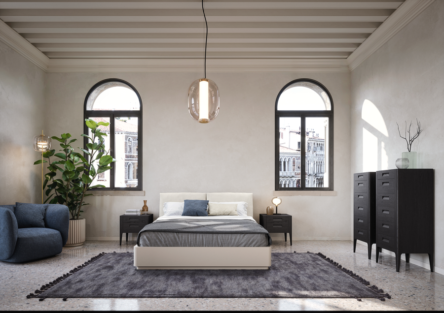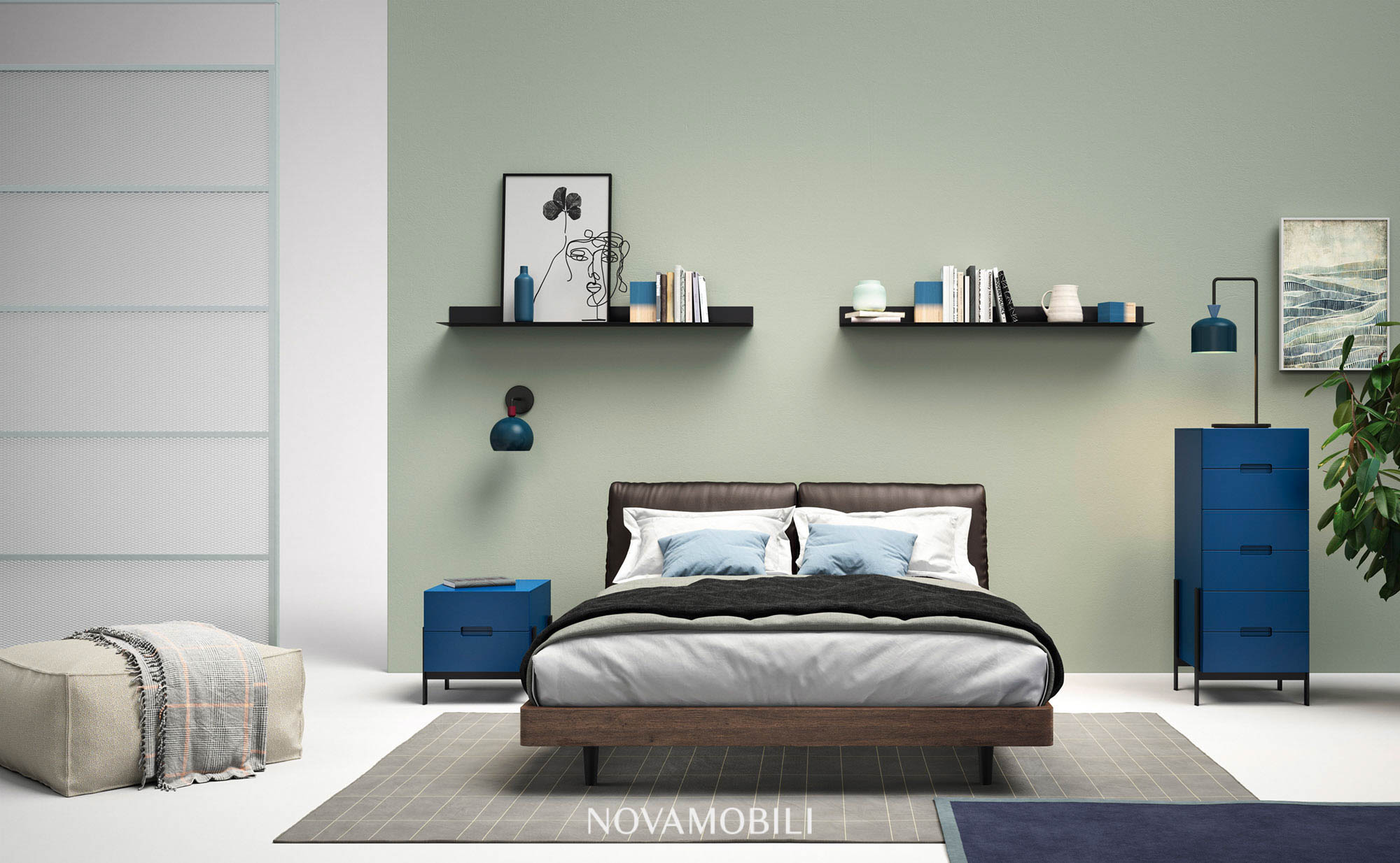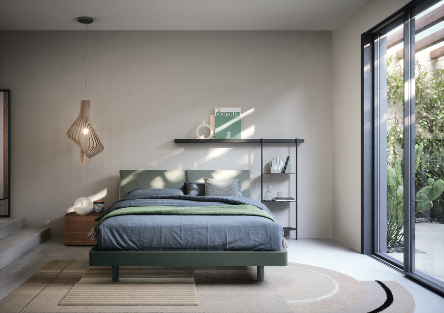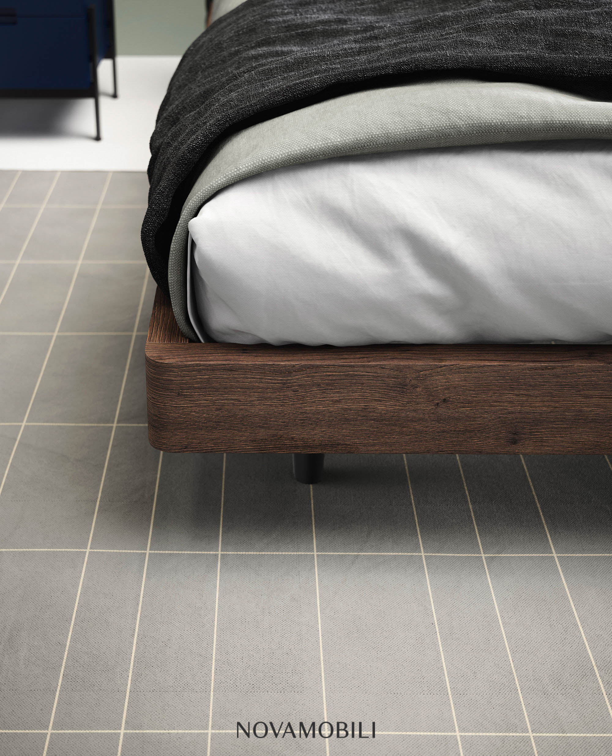 The minimal geometry of the Nido bed mergers technical tradition and modern looks. This elegant bed fits well in any setting: from a contemporary to a more classic interior. The bed surround's geometric shapes, with mitered detailing on the corners and square legs, pair beautifully with the linear design of the padded headboard, made up of two big cushions with refined stitching. The bed surround is available in the eco-wood or lacquered finishes in any of the available colors, as well as with a storage base option.