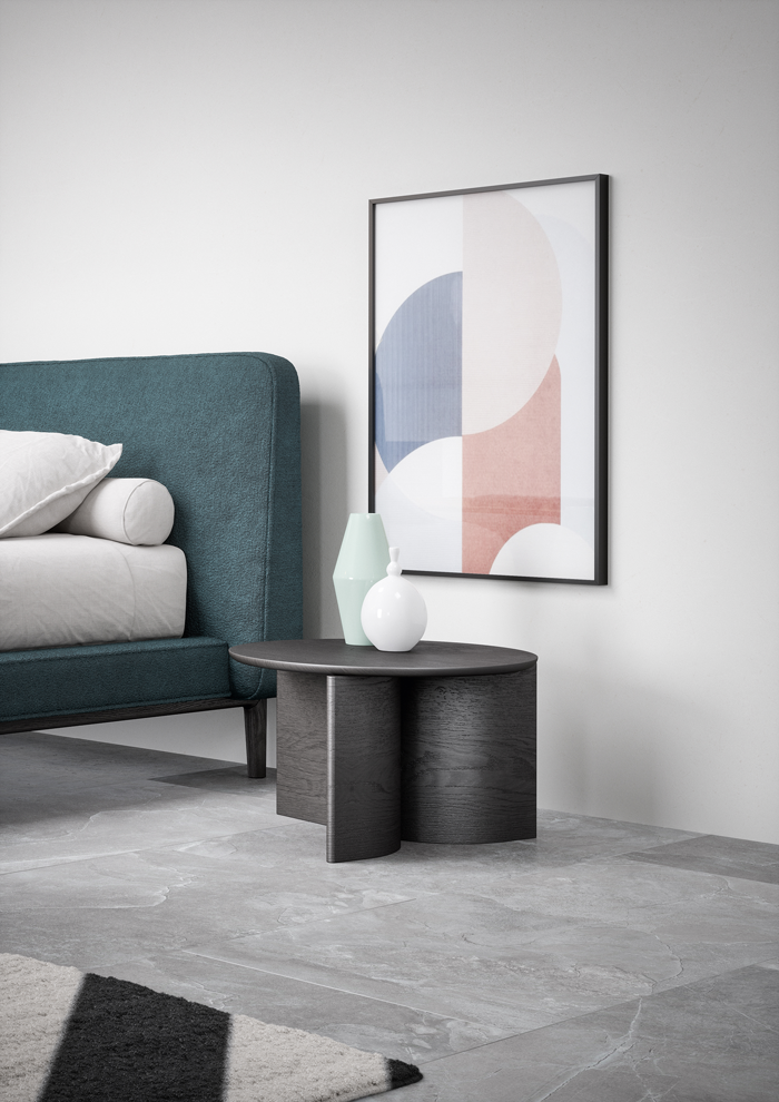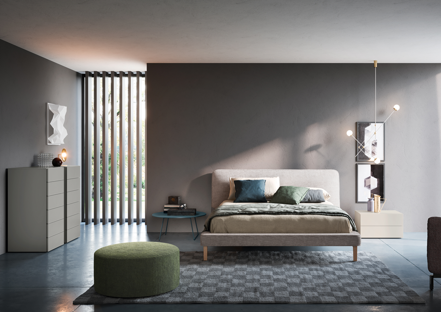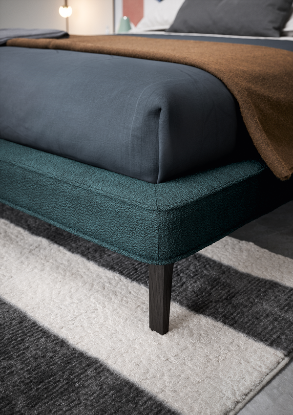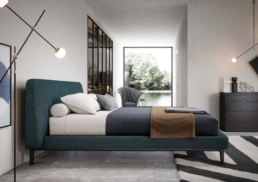 Seeyou stands out with its generous padded headboard, featuring a softly tapered cushion that adds sculptural elegance. Set on wooden legs, the extended frame gives the bed a light, understated presence.