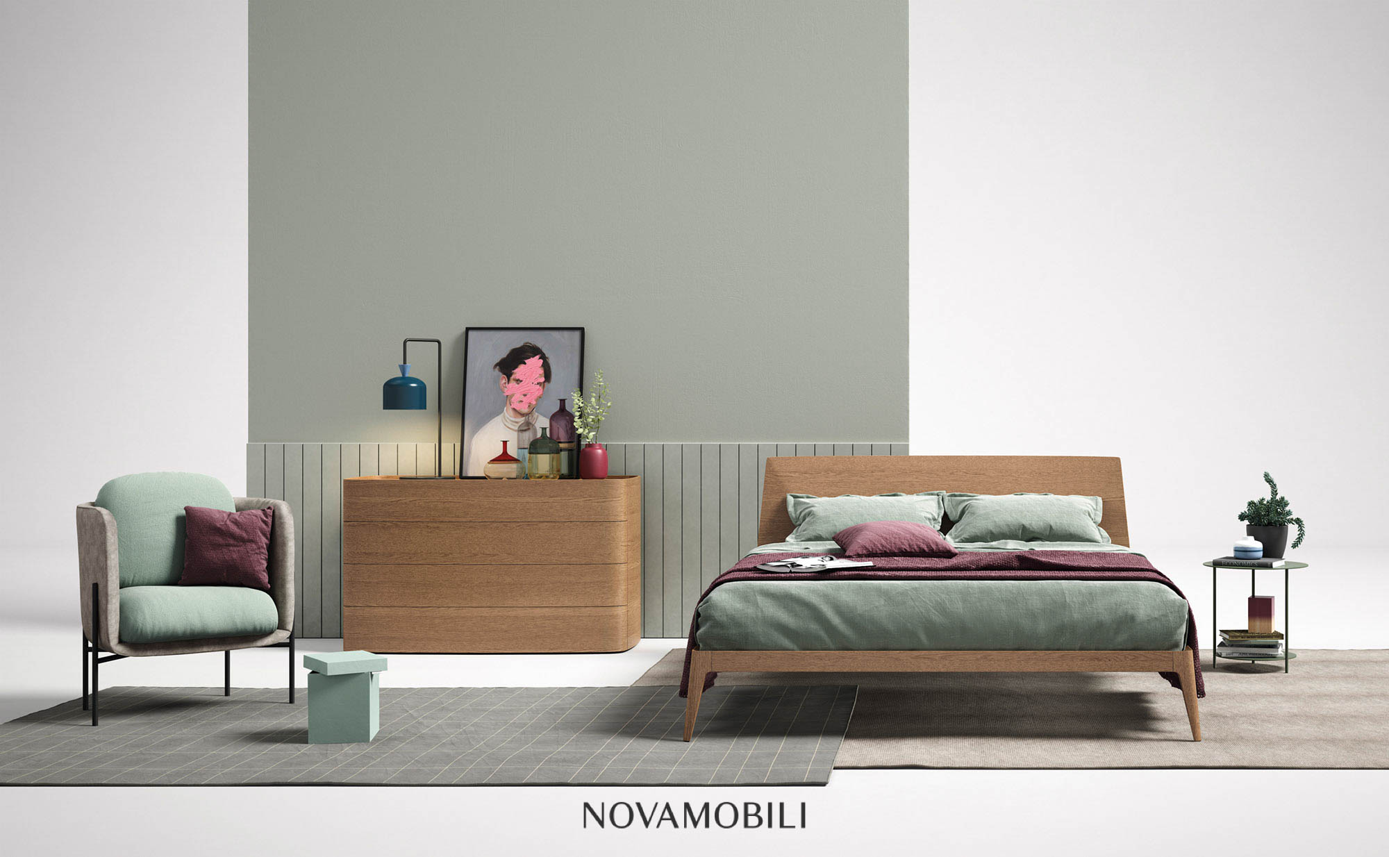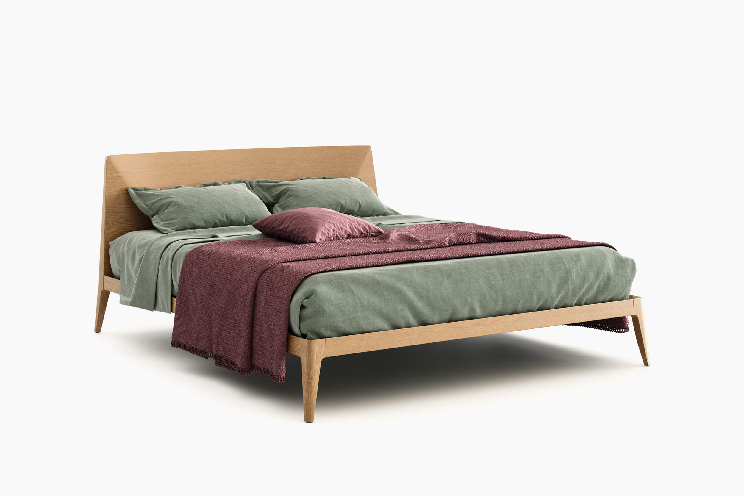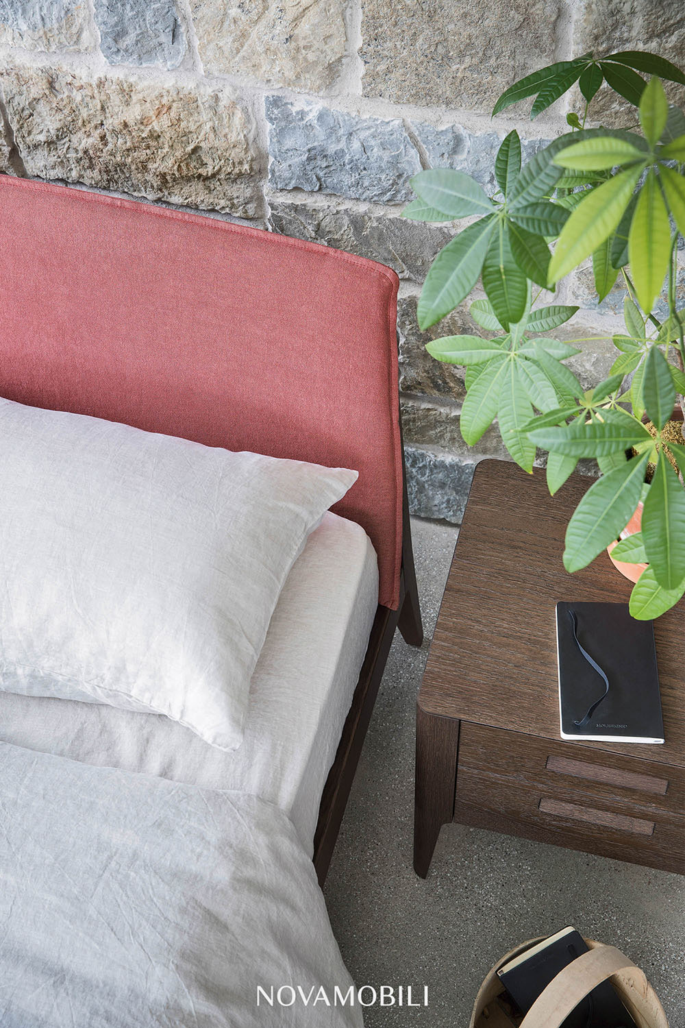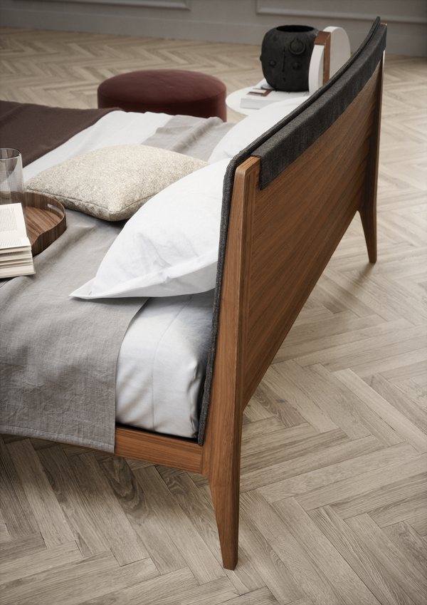 The Siri bed stands out for its distinctive, simple, and timeless design. The frame is available in the veneered finishes rovere miele and rovere terra while the Siri Soft headboard cover adorning the headboard is an optional extra available in any of the fabric, imitation leather, and leather options.