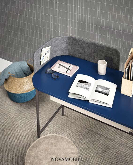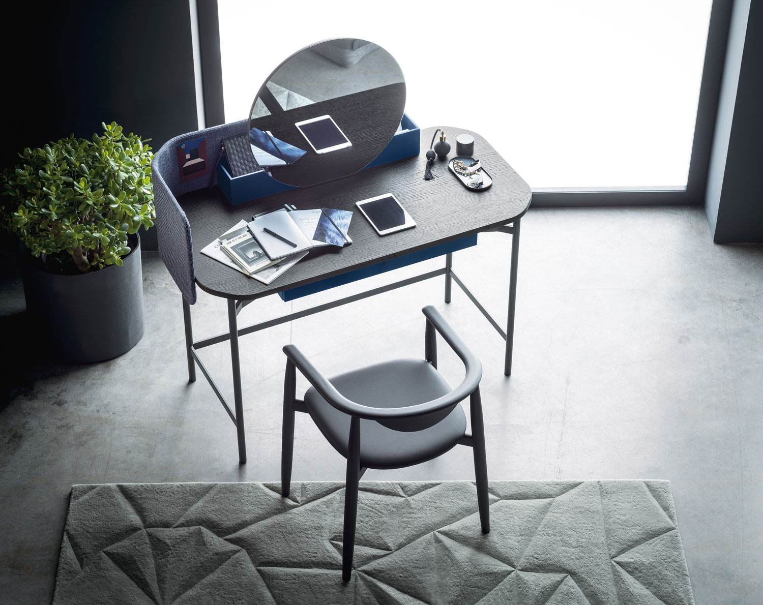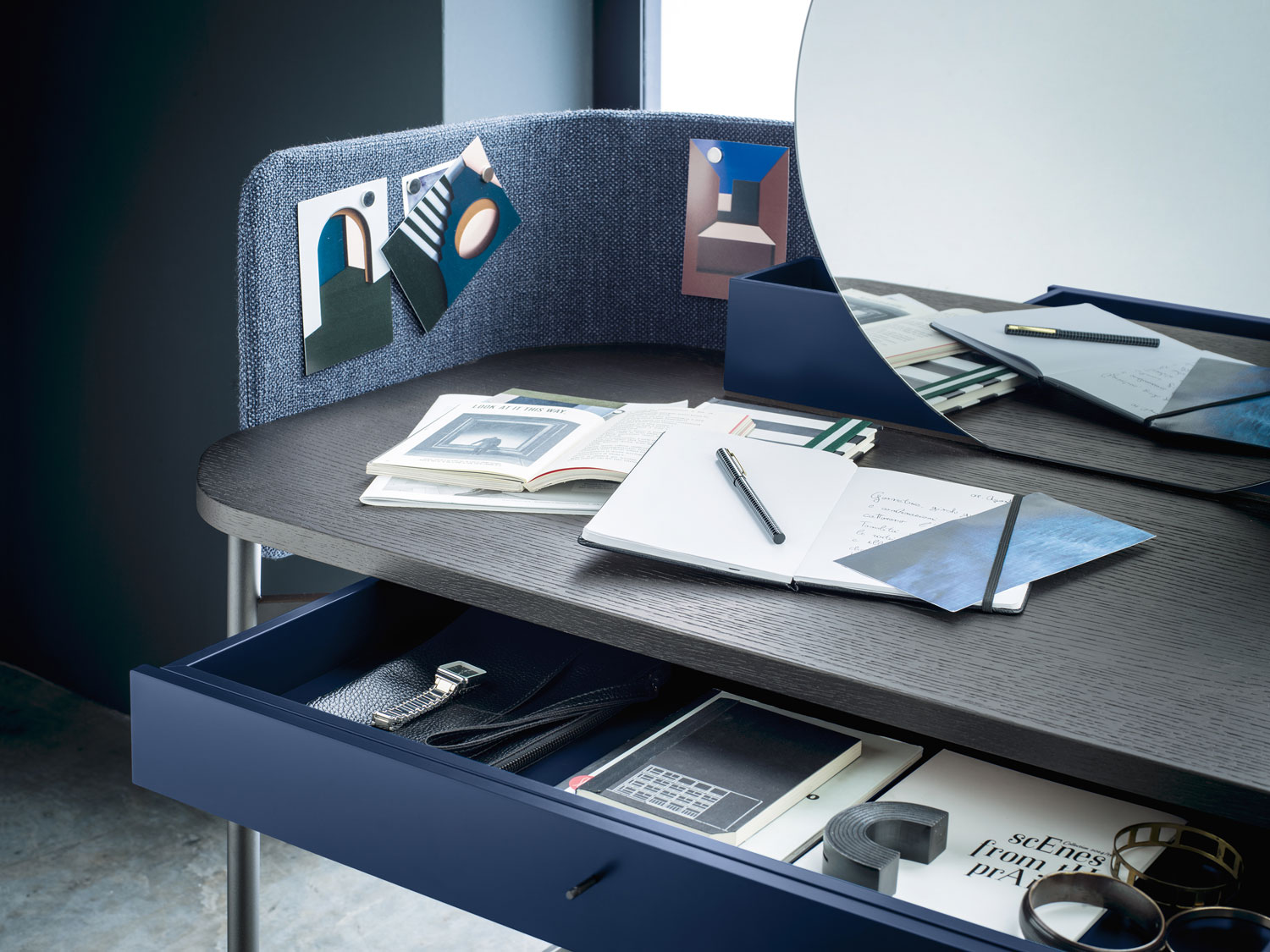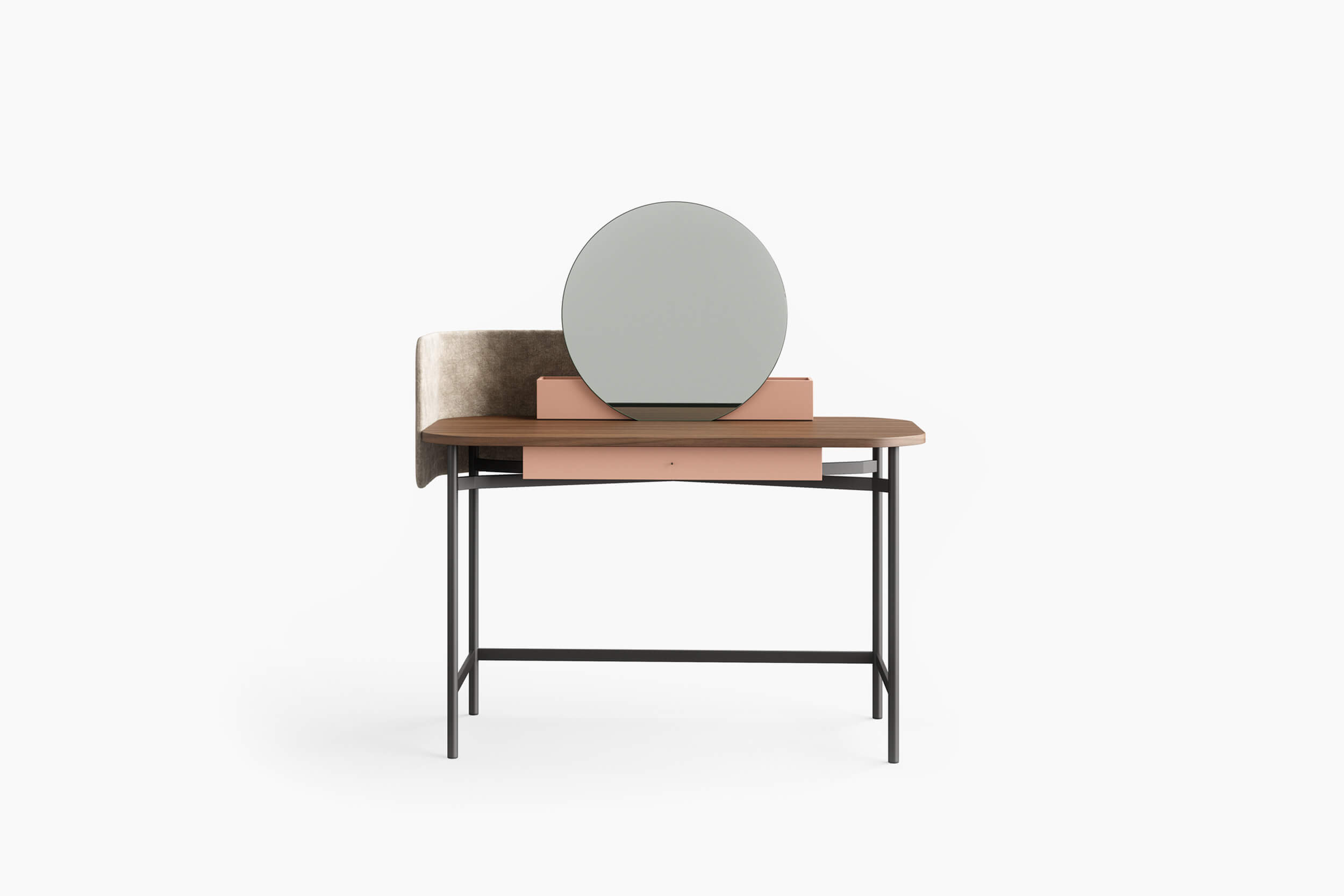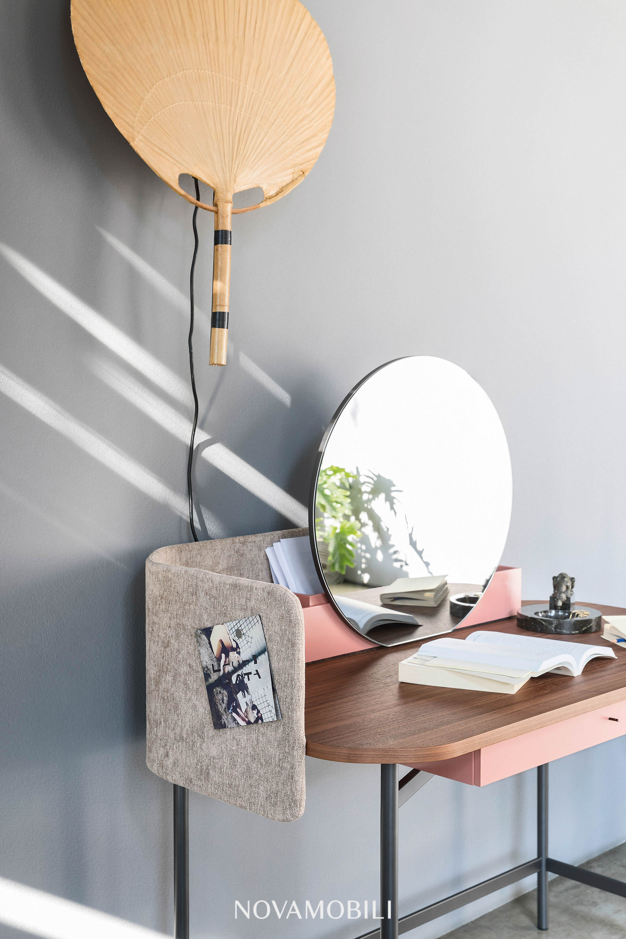 Delicate and elegant, the Ninfea desk's top with rounded shapes sits on slender metal legs, with an under-mounted drawer and a privacy screen upholstered in removable fabric or imitation leather. The small screen can double as a magnetic noticeboard. The desk, which is ideal for recreating a study nook in the bedroom, has a dressing table-like setup with its wooden caddy and circular mirror.