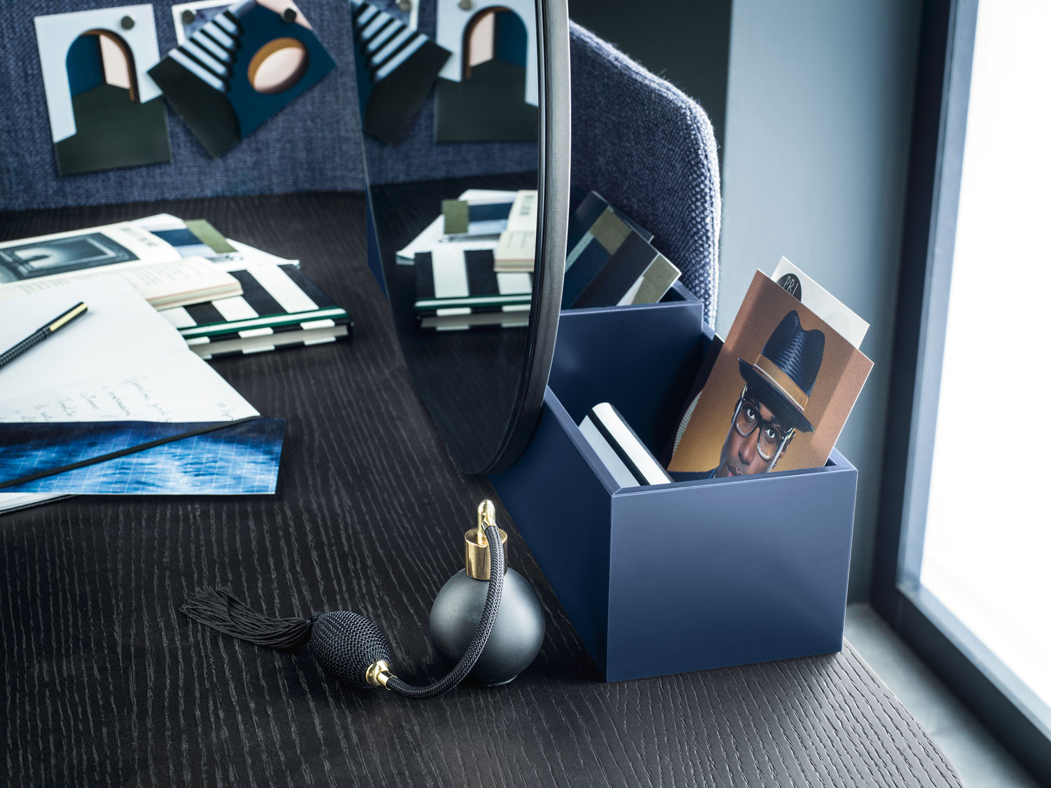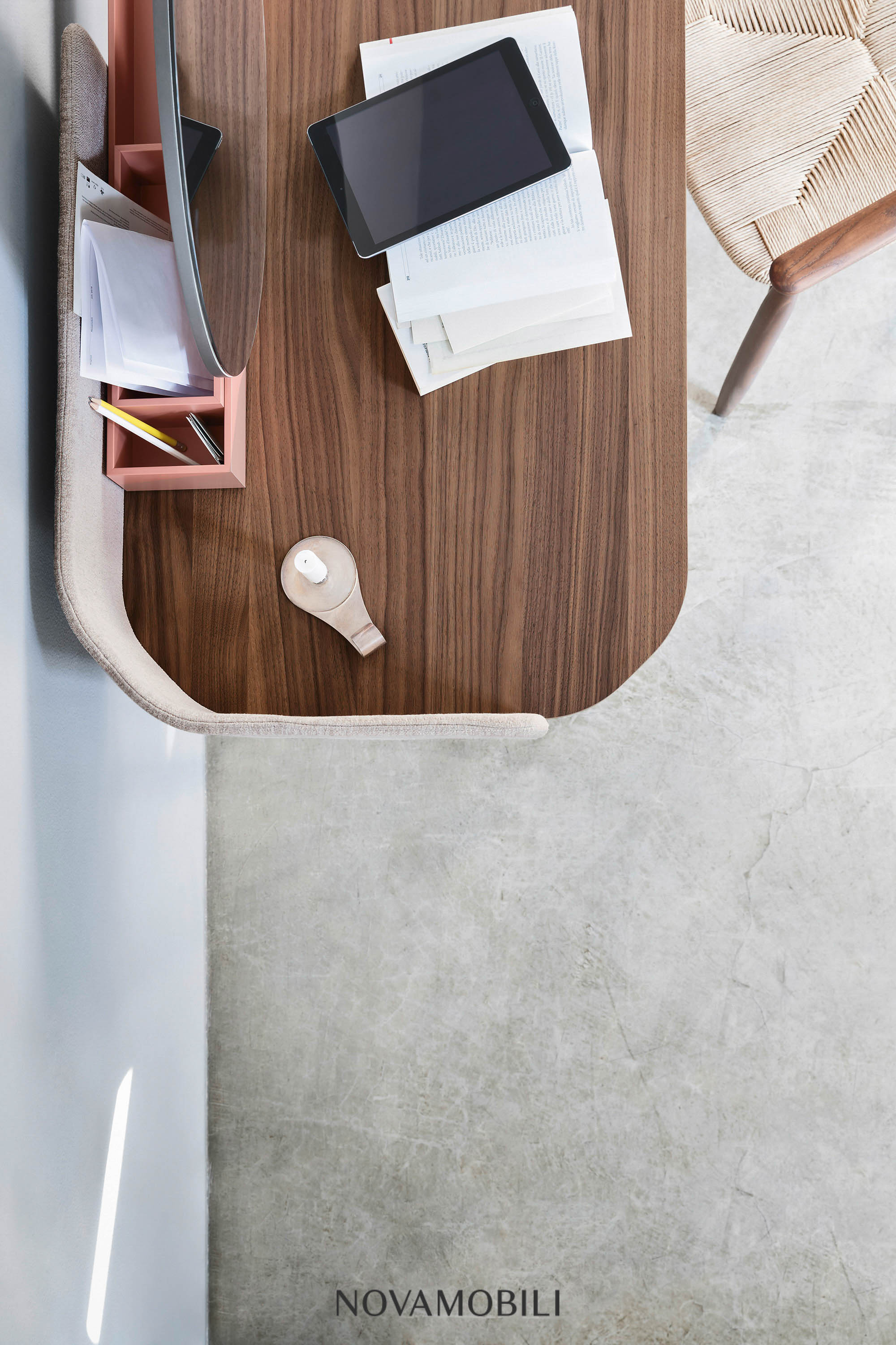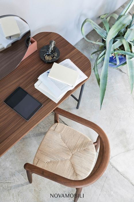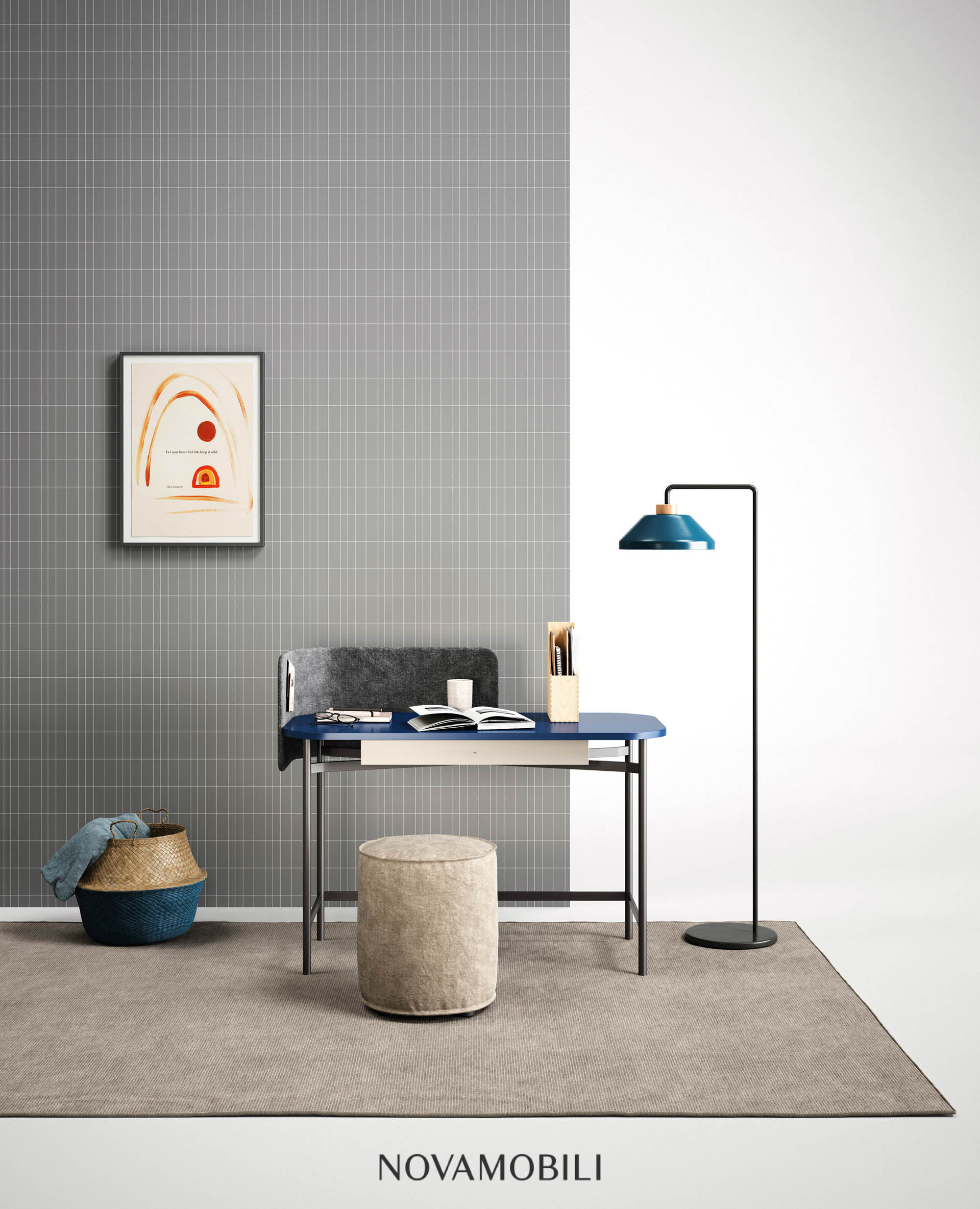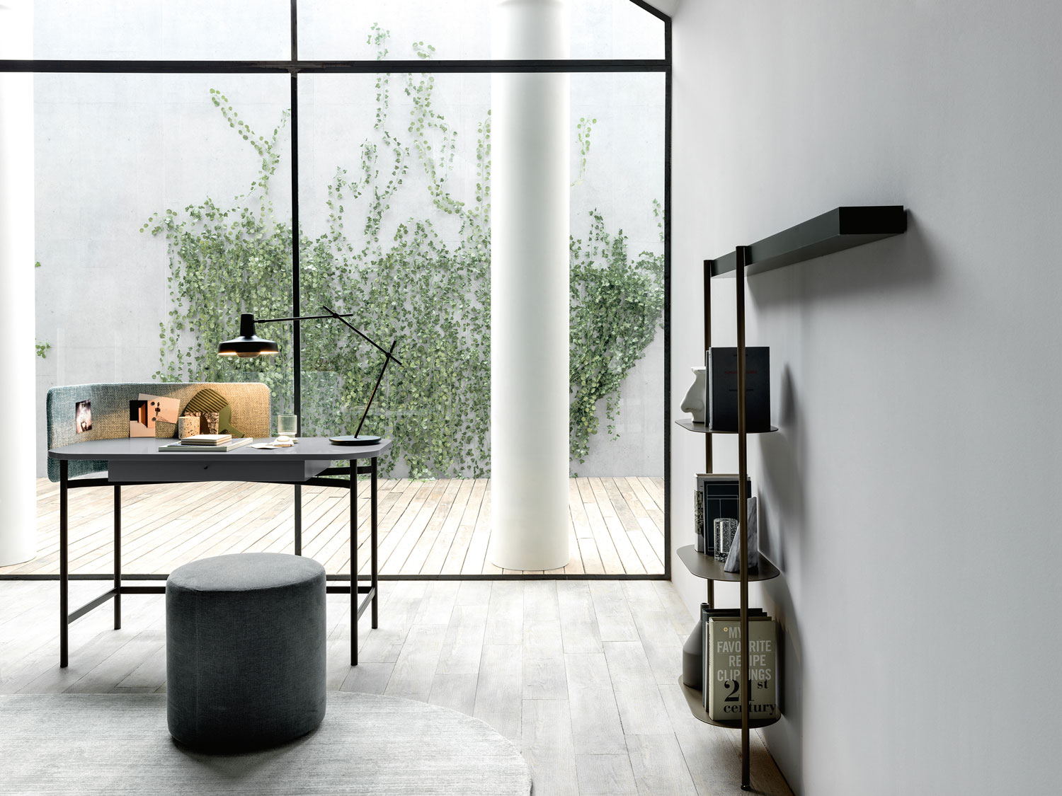 Delicate and elegant, the Ninfea desk's top with rounded shapes sits on slender metal legs, with an under-mounted drawer and a privacy screen upholstered in removable fabric or imitation leather. The small screen can double as a magnetic noticeboard. The desk, which is ideal for recreating a study nook in the bedroom, has a dressing table-like setup with its wooden caddy and circular mirror.
