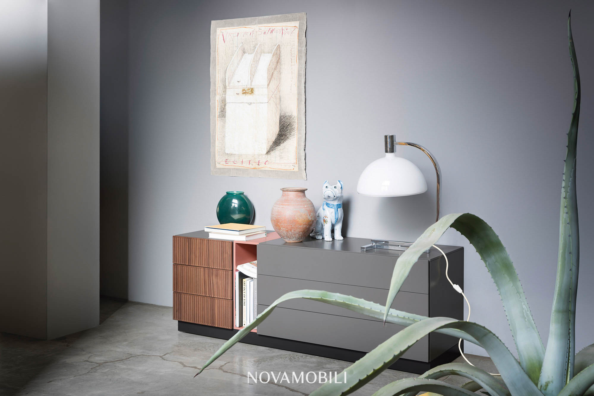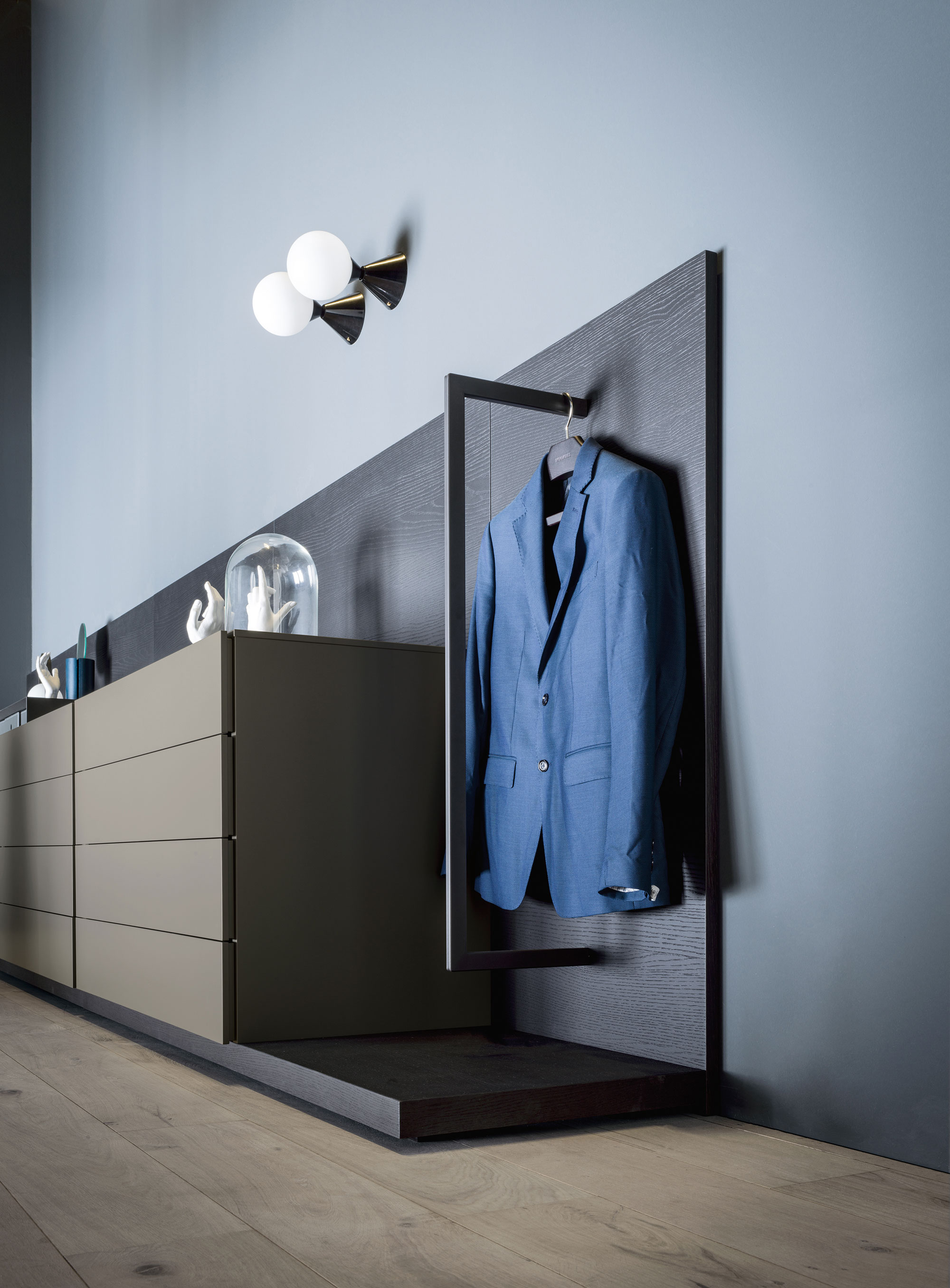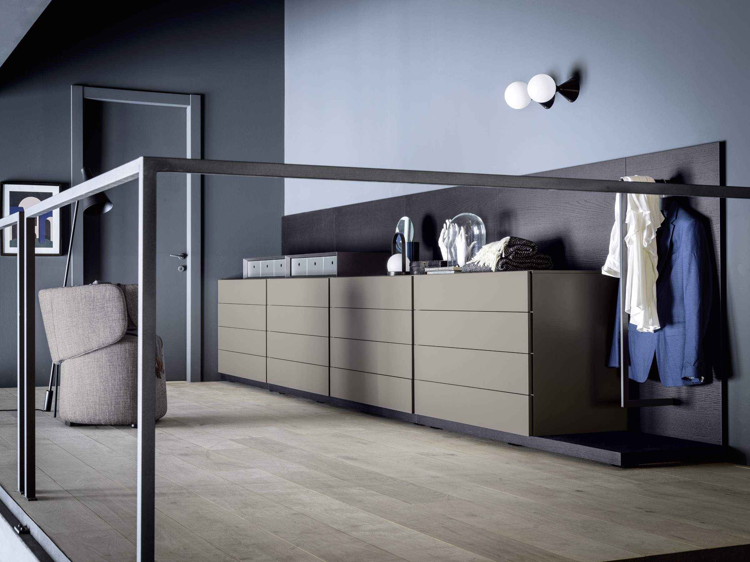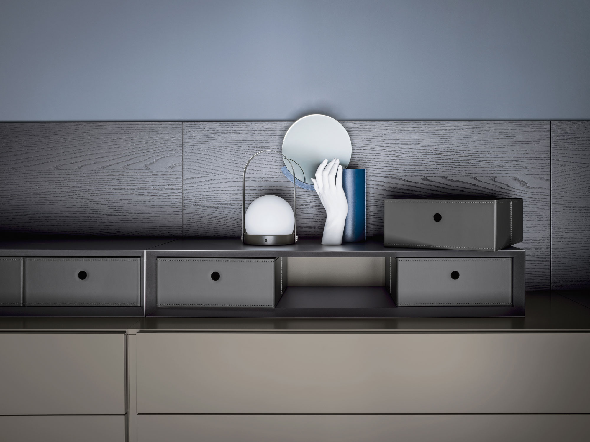Easy System is a design that stands out for its pared-back look, impressive versatility, and endless furniture solutions. Drawer units and bedside tables become part of a more extensive system that can also include wall paneling - with or without shelves - floor benches, clothes racks, mirrors, open shelving, freestanding arrangements, desks, and Box 12 storage units. Each of the system components can be customized with an extensive range of finishes, including noce canaletto for drawers with Rays fronts.