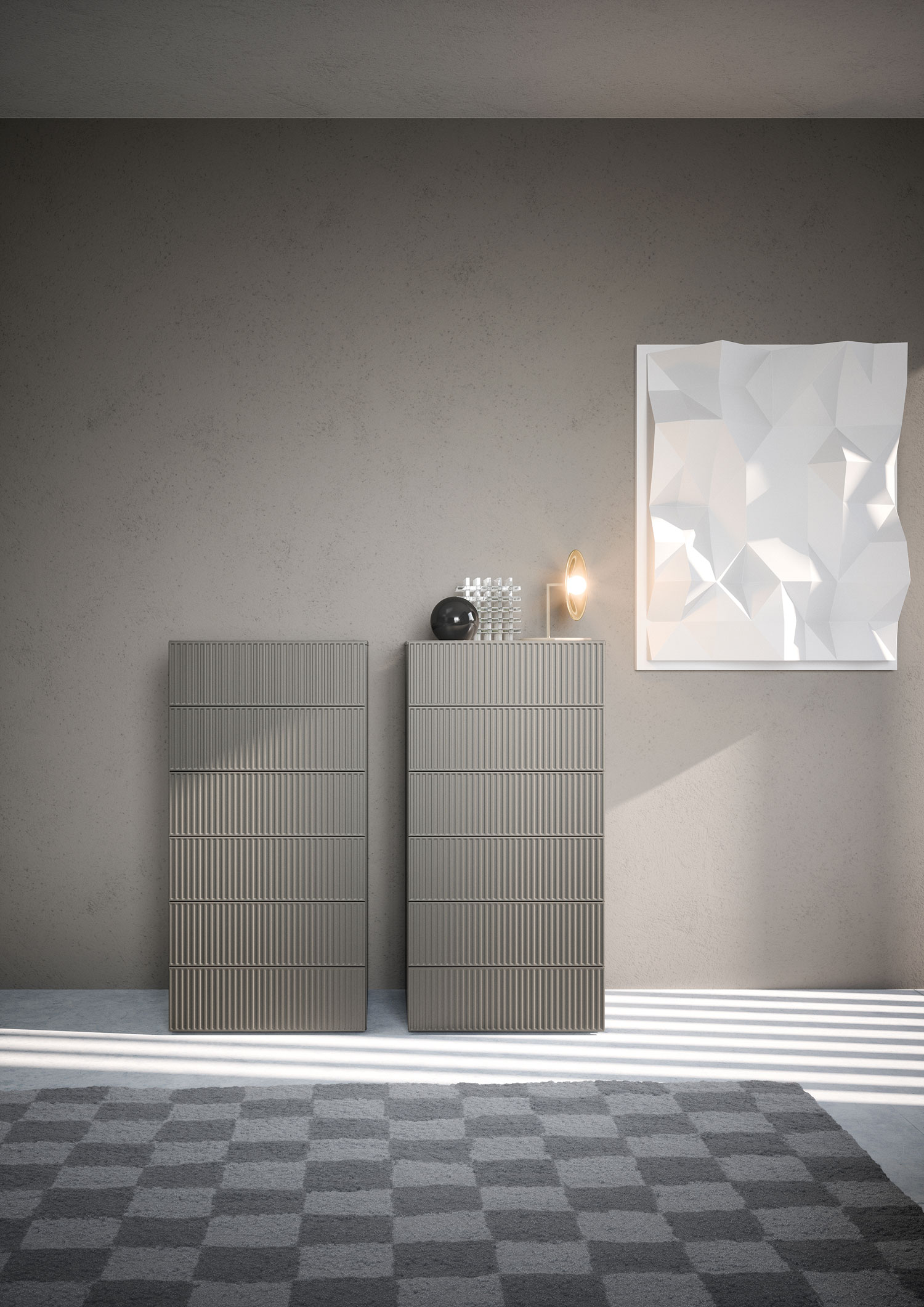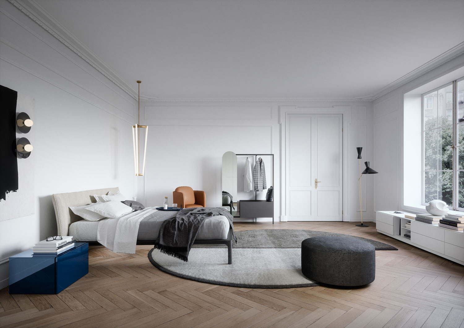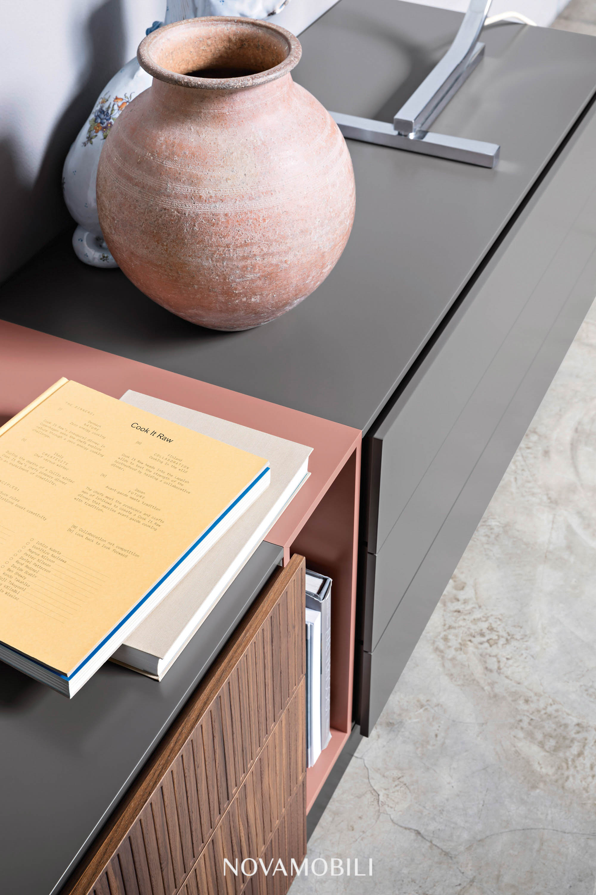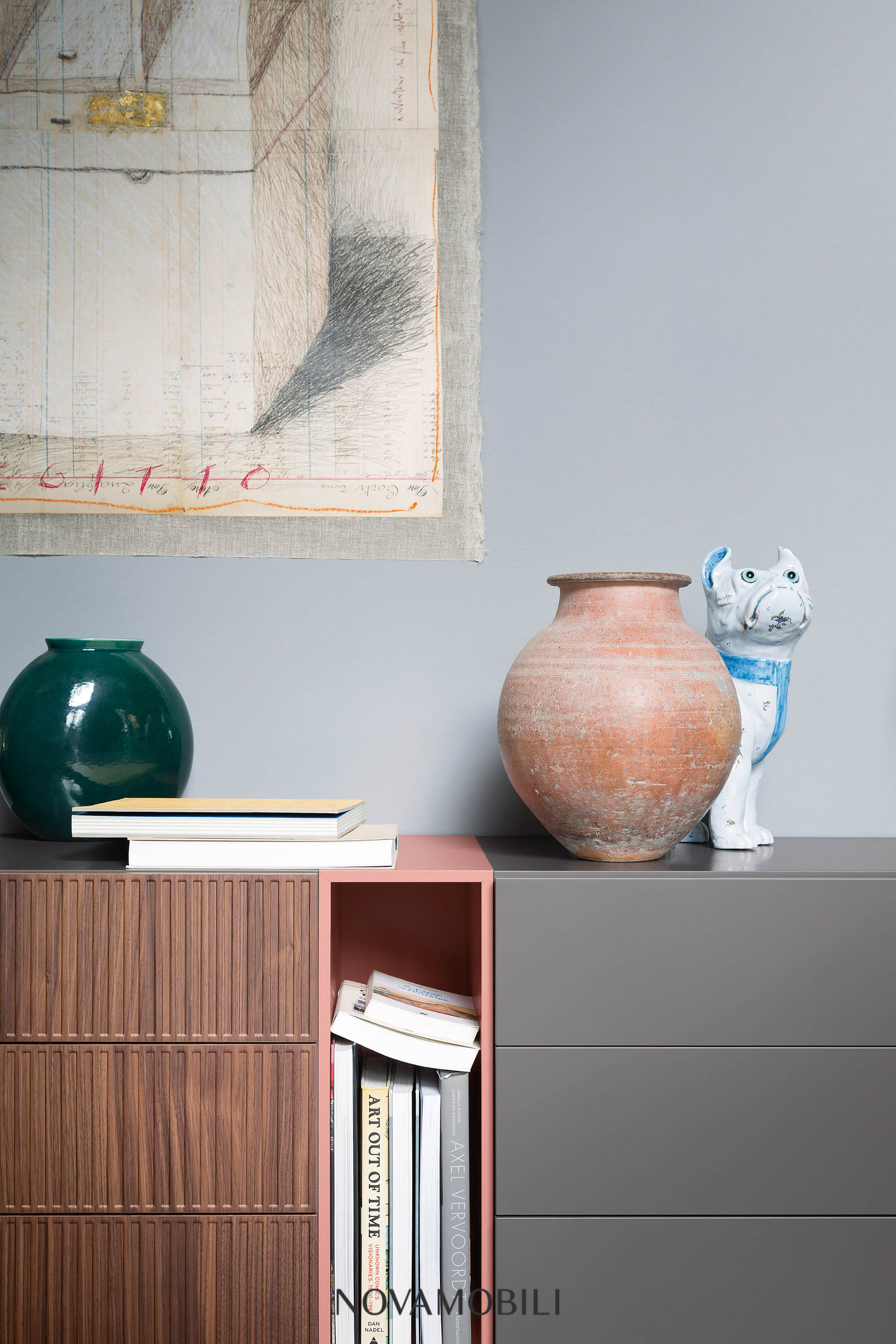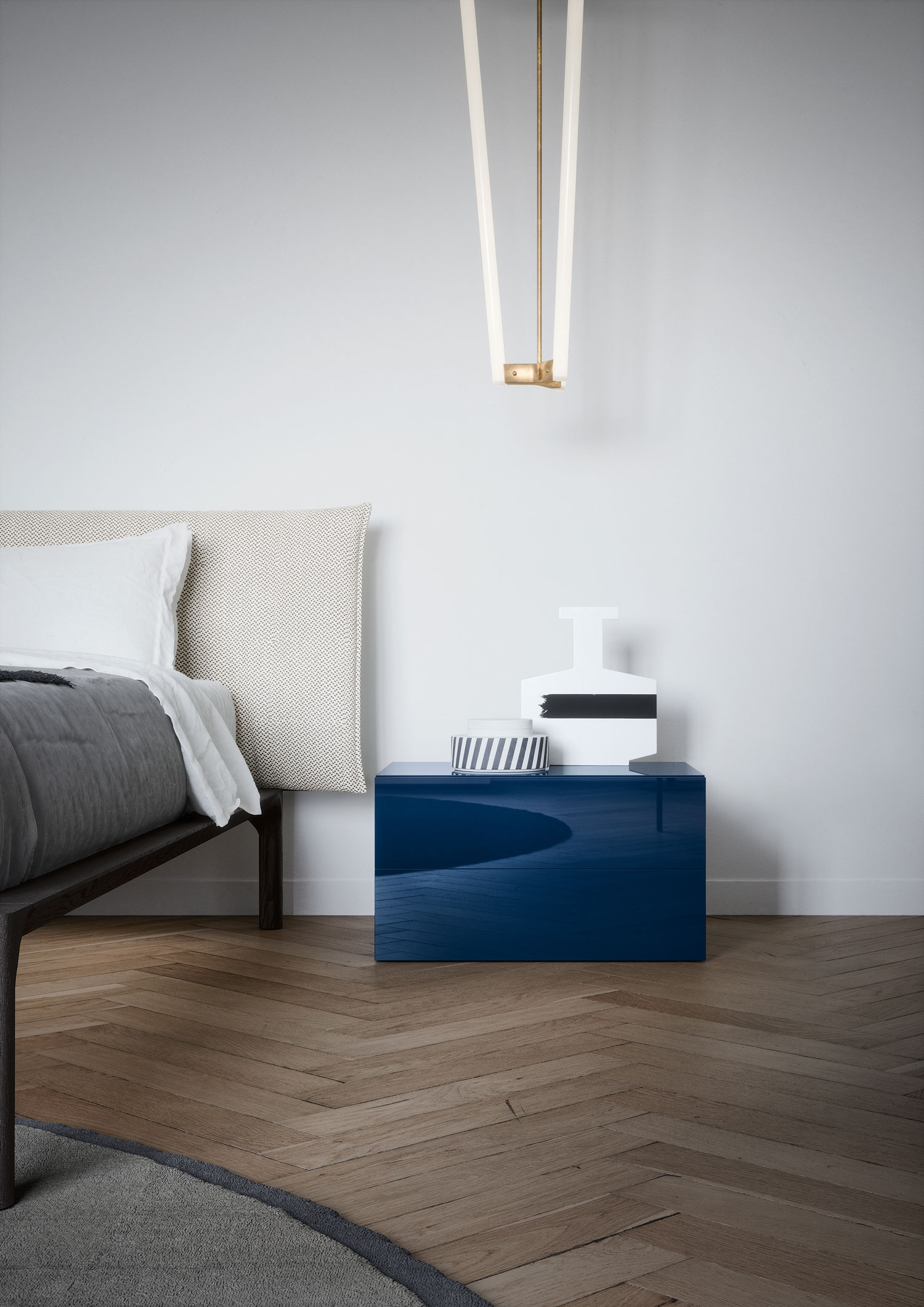 Easy System is a design that stands out for its pared-back look, impressive versatility, and endless furniture solutions. Drawer units and bedside tables become part of a more extensive system that can also include wall paneling - with or without shelves - floor benches, clothes racks, mirrors, open shelving, freestanding arrangements, desks, and Box 12 storage units. Each of the system components can be customized with an extensive range of finishes, including noce canaletto for drawers with Rays fronts.