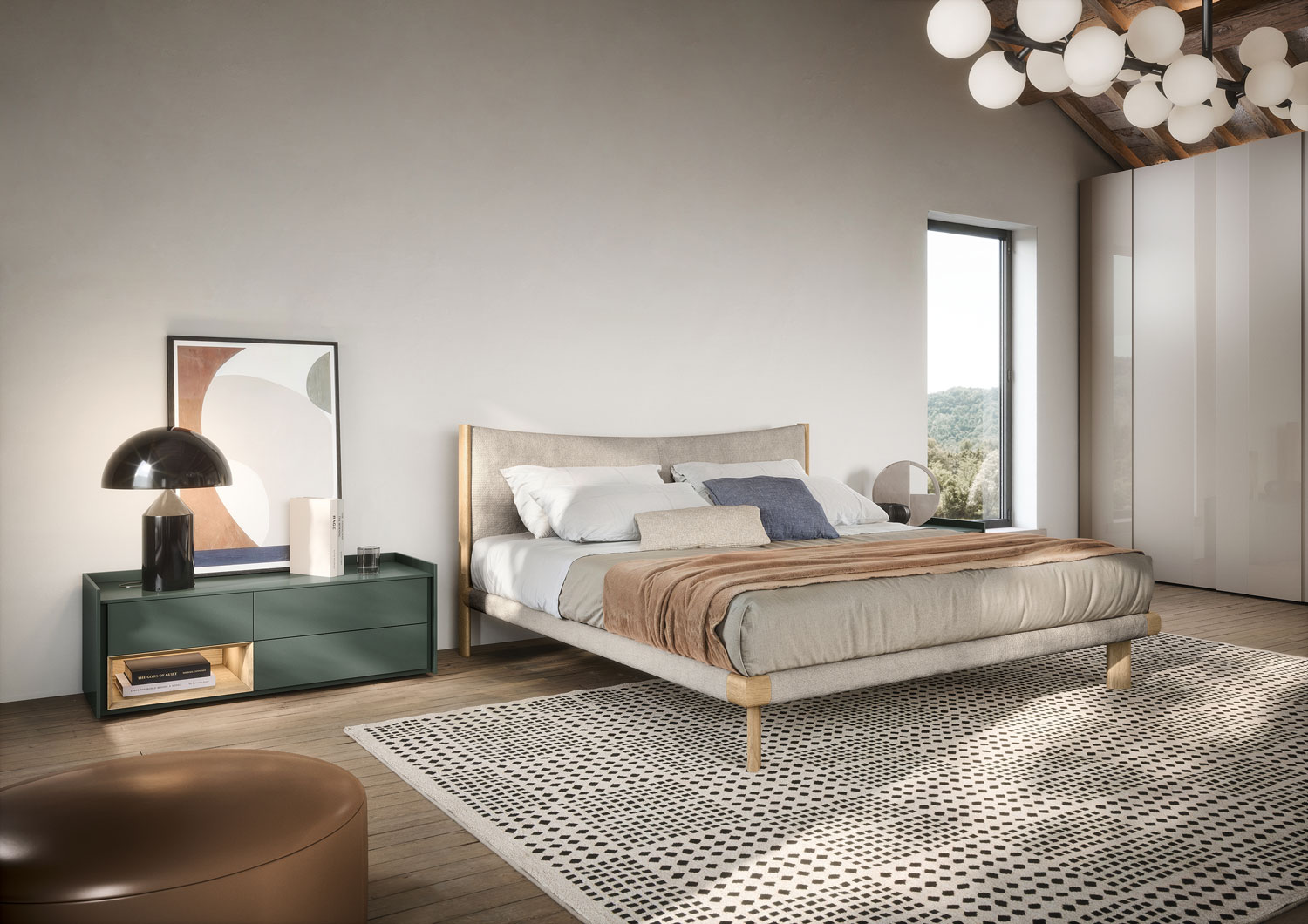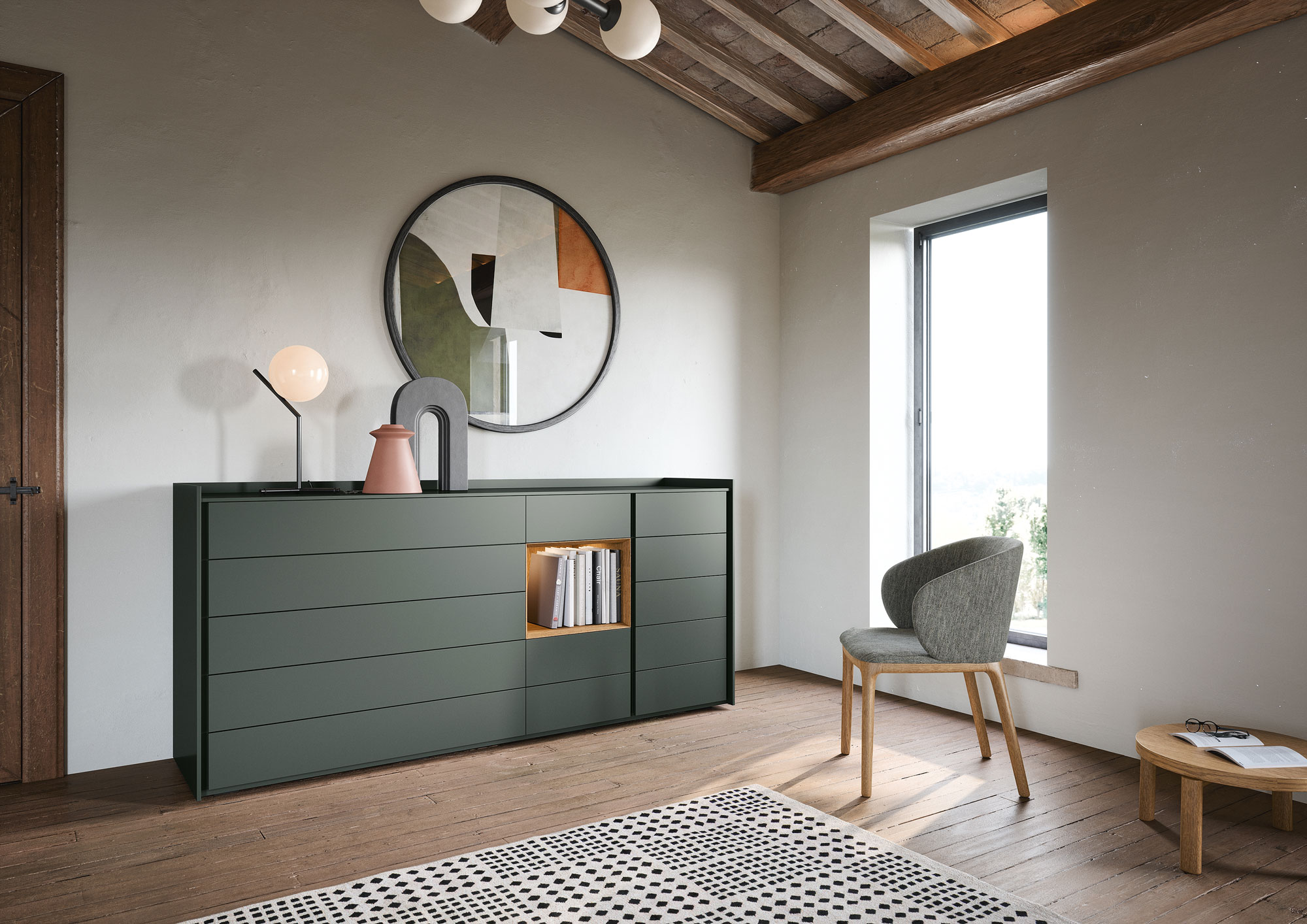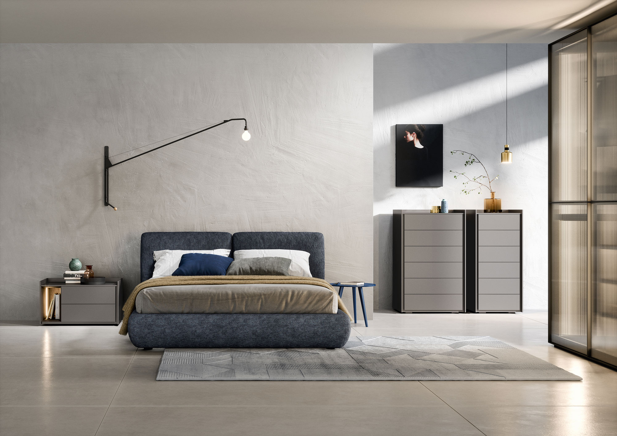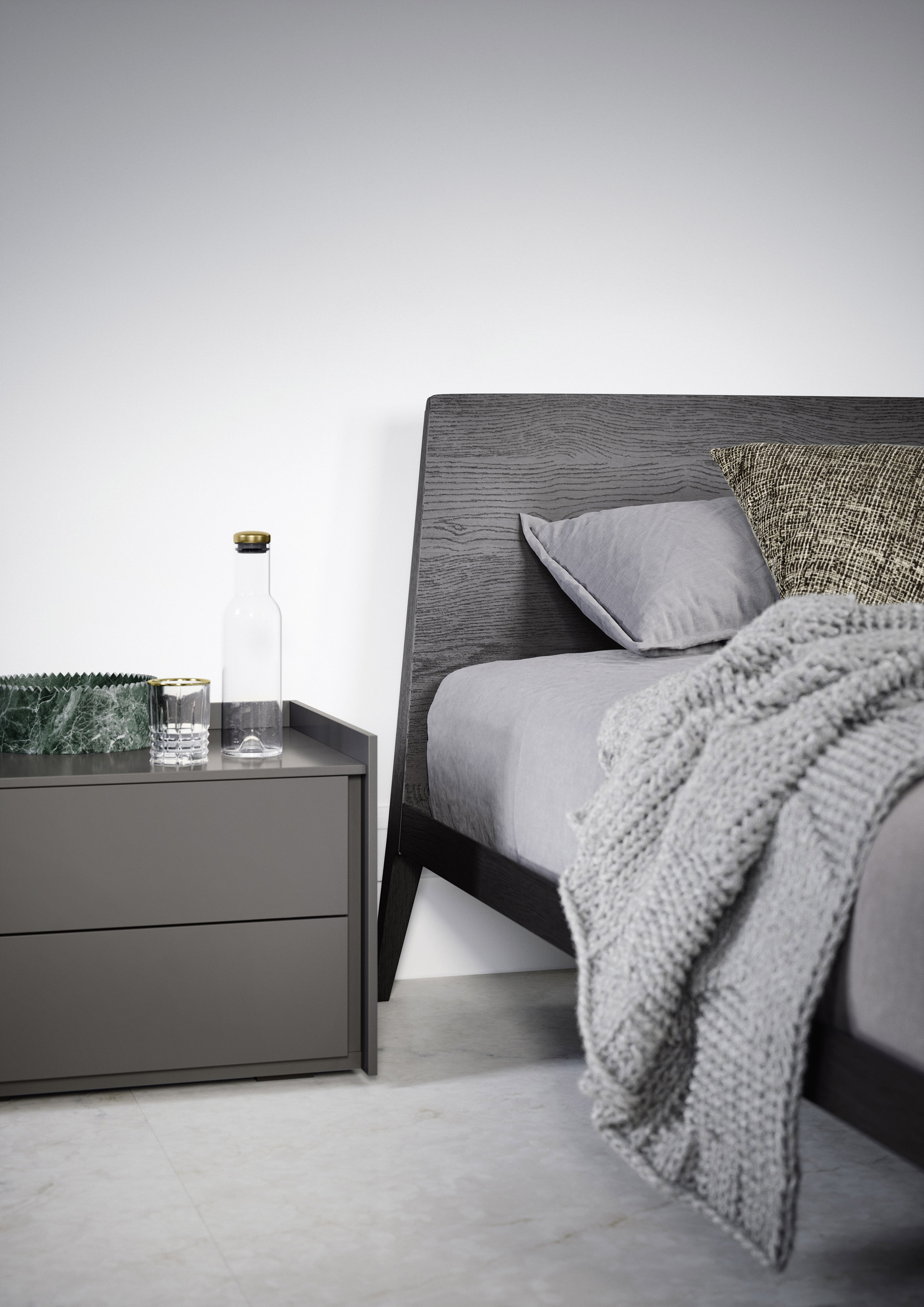 Sly offers versatile drawer-modules designed to complement Tetris open units, allowing for various configurations from spacious chests to minimalist bedside tables, optionally equipped with undermounted wireless charging.