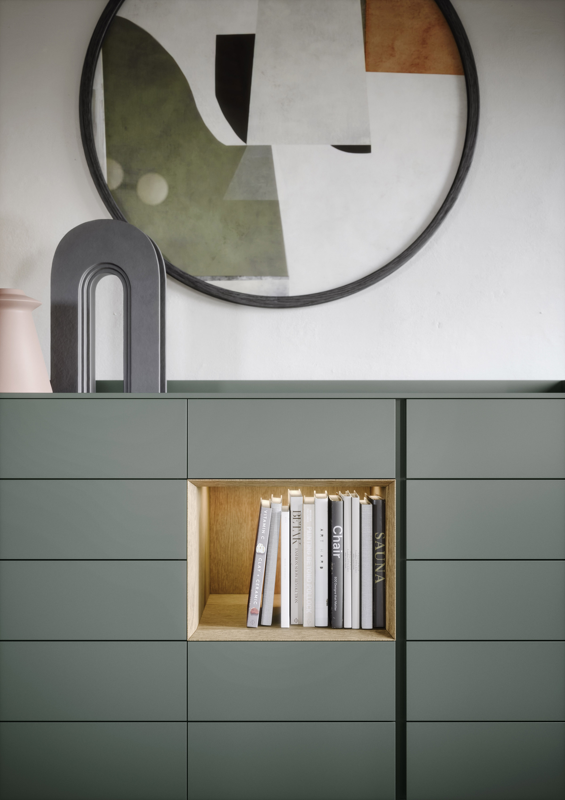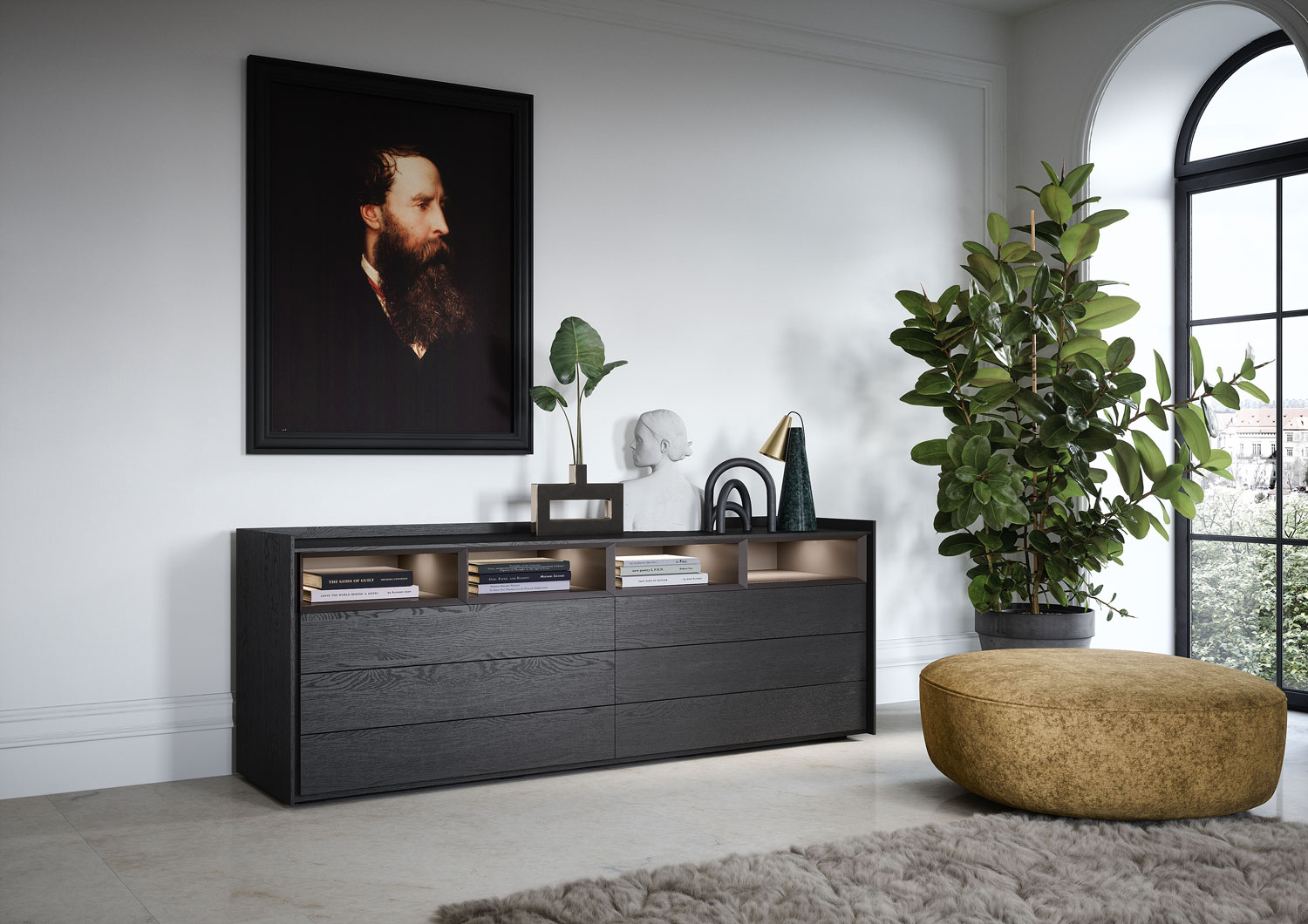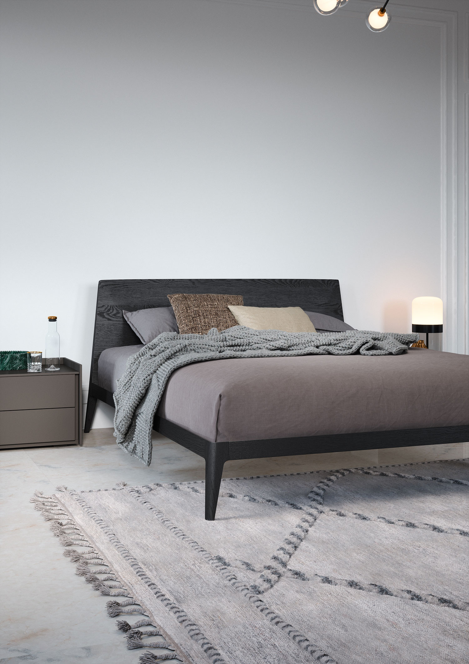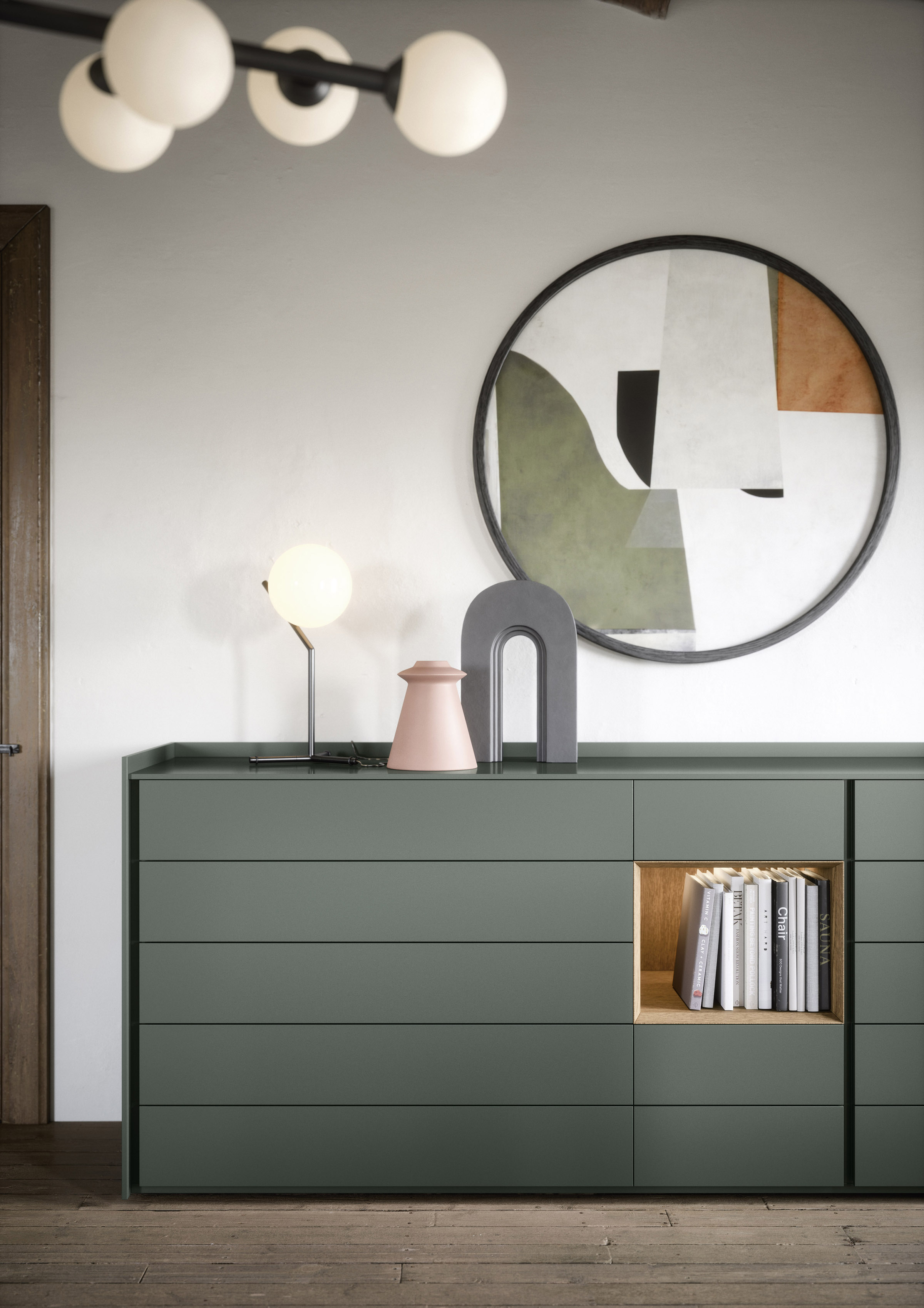 Sly offers versatile drawer-modules designed to complement Tetris open units, allowing for various configurations from spacious chests to minimalist bedside tables, optionally equipped with undermounted wireless charging.