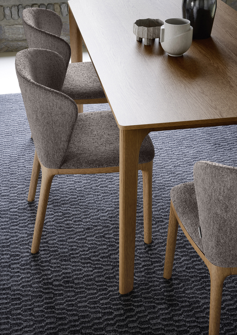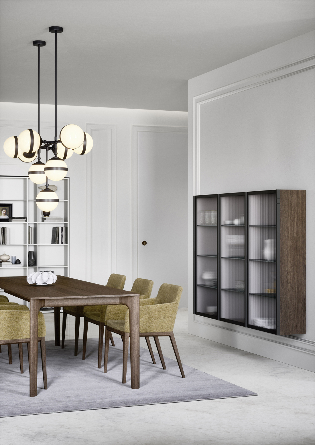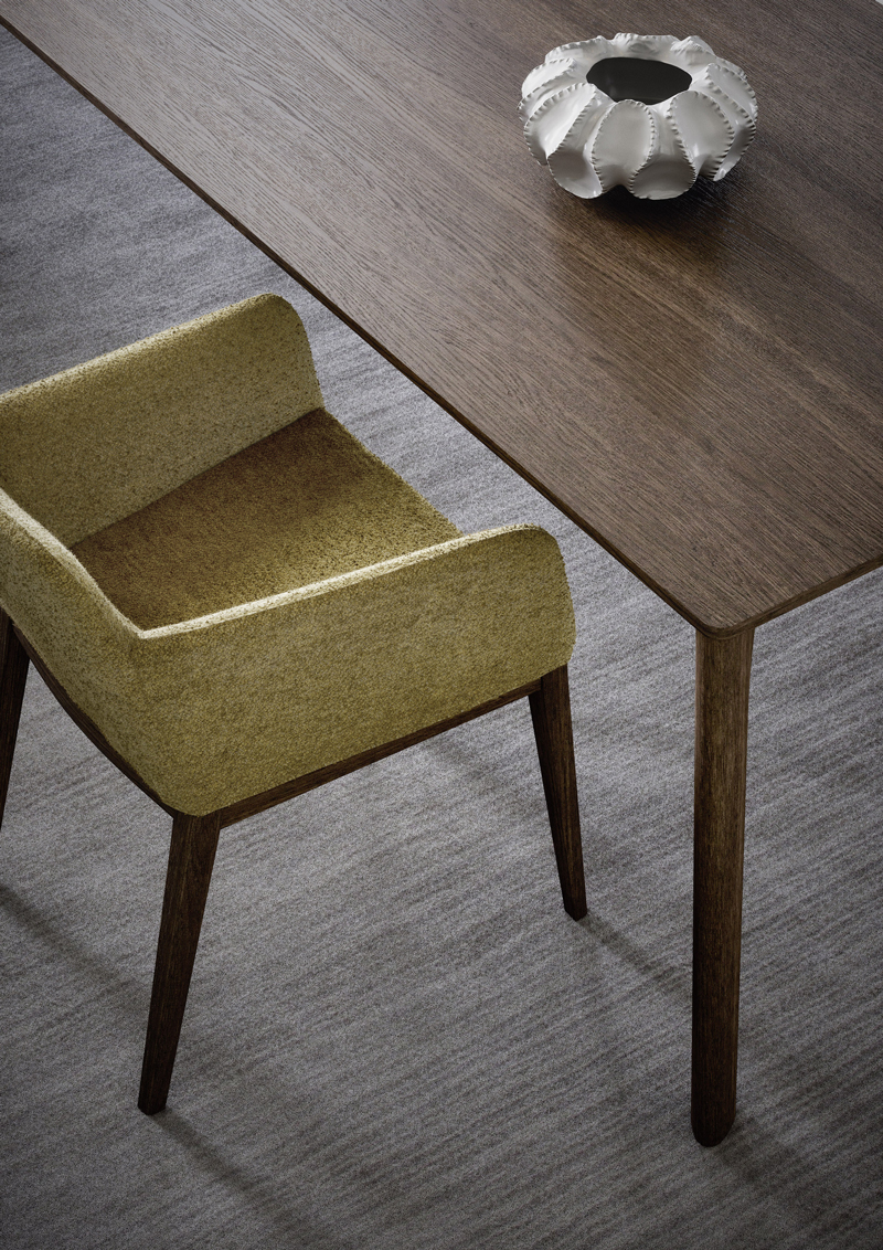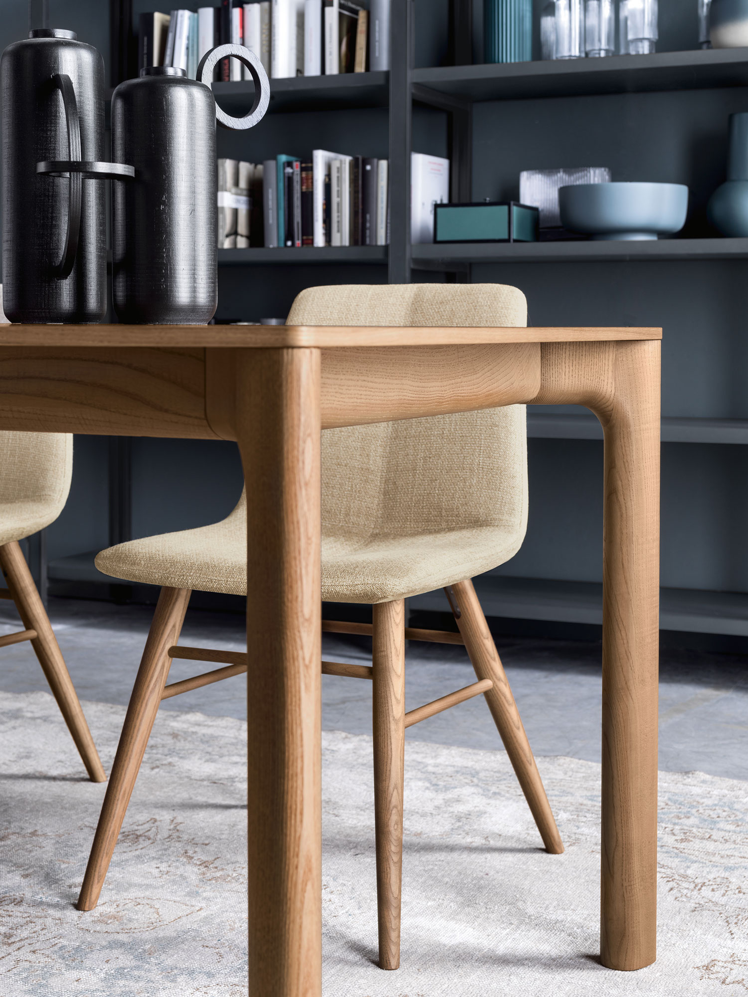 Level, crafted by Matteo Zorzenoni, features a gently curved frame supporting a sleek tabletop with rounded edges. It stretches to accommodate up to ten people, blending minimalist shapes with warm wood finishes.