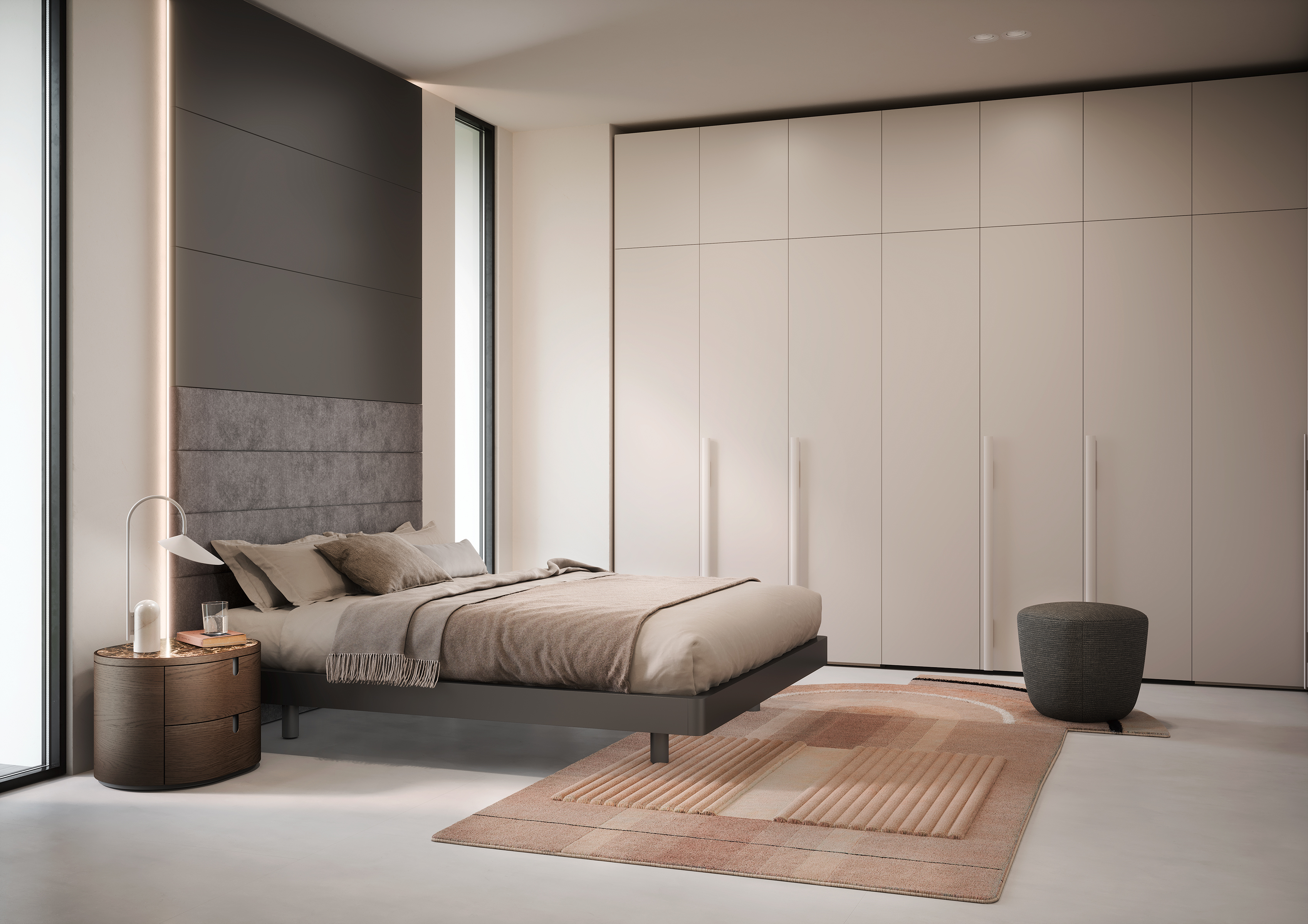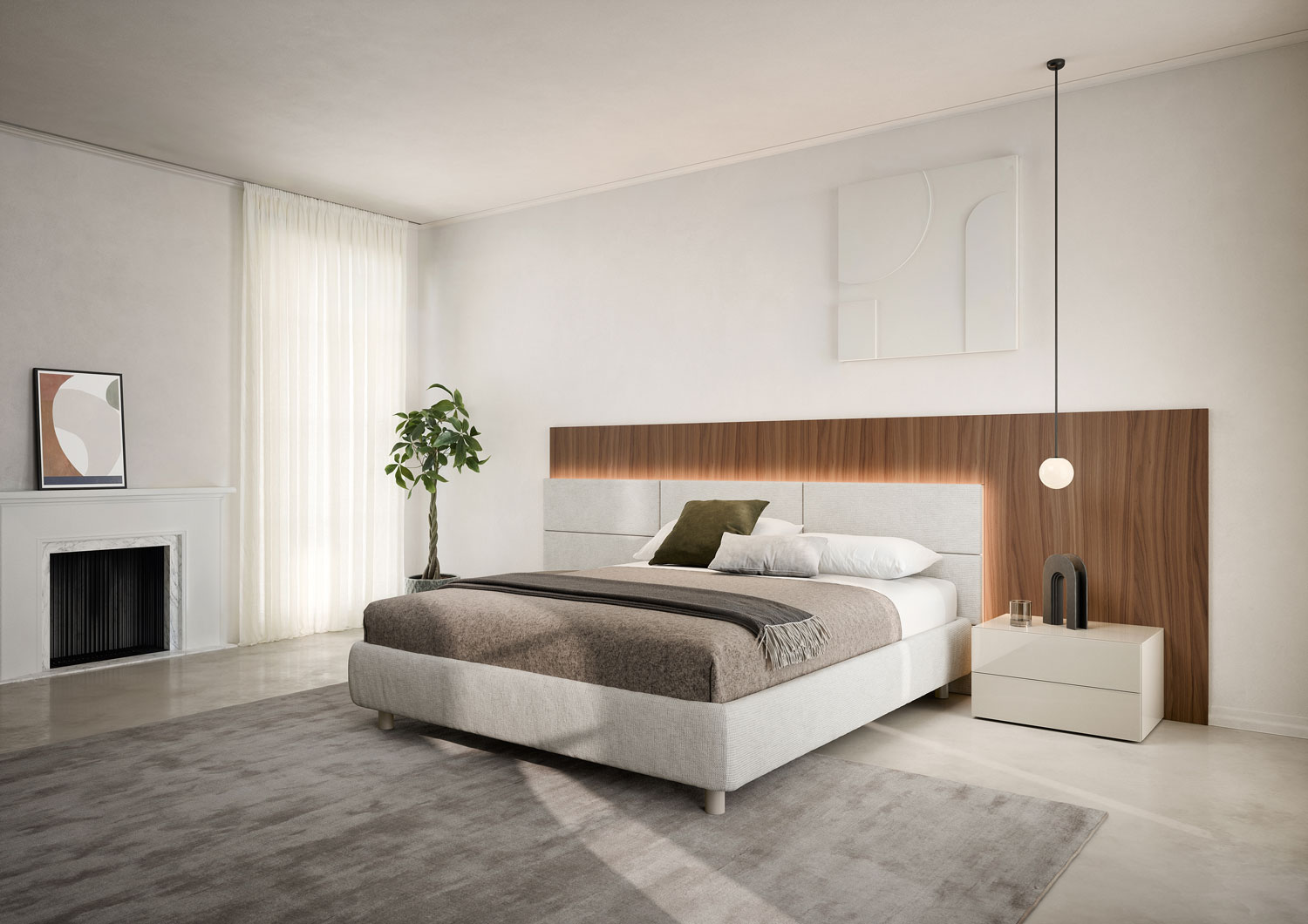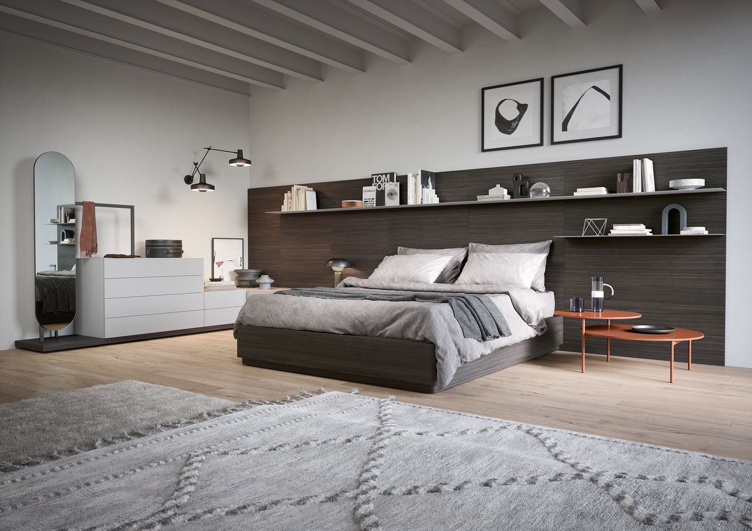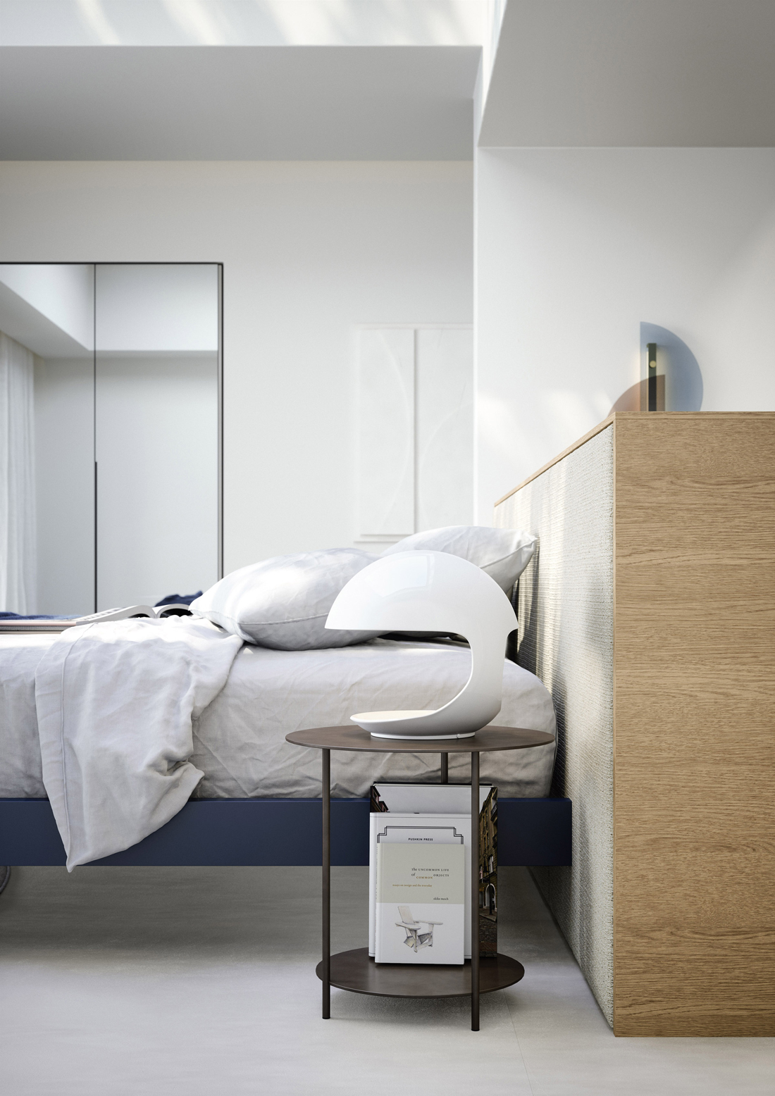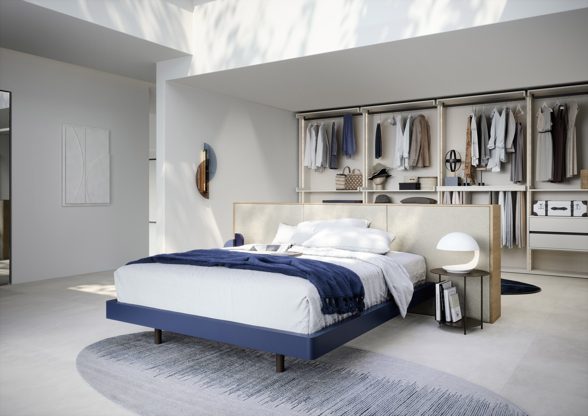 The Space headboard enhances the bedroom with its decorative functionality. It can accommodate Duo metal shelves or a clothes rack, serve as wall paneling, or a padded version in removable fabric. Available in various finishes with optional LED backlighting.