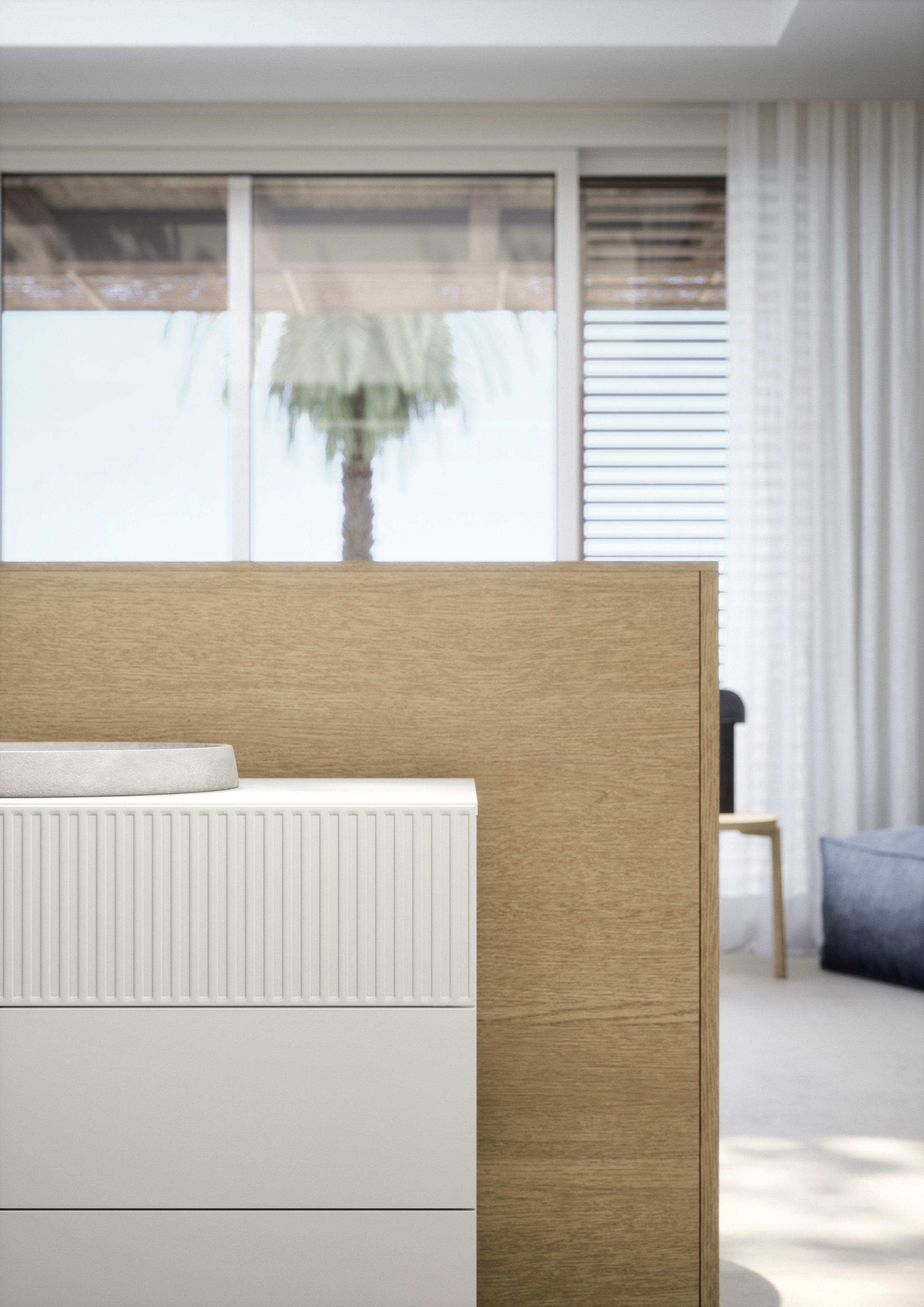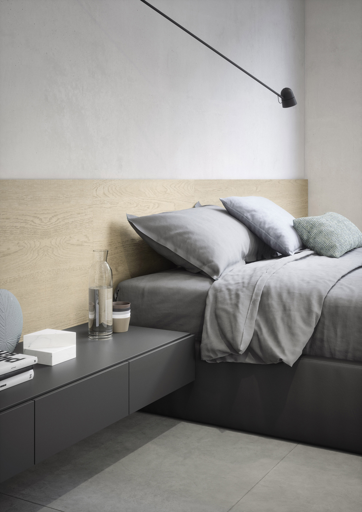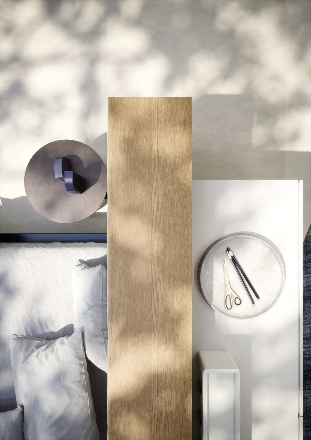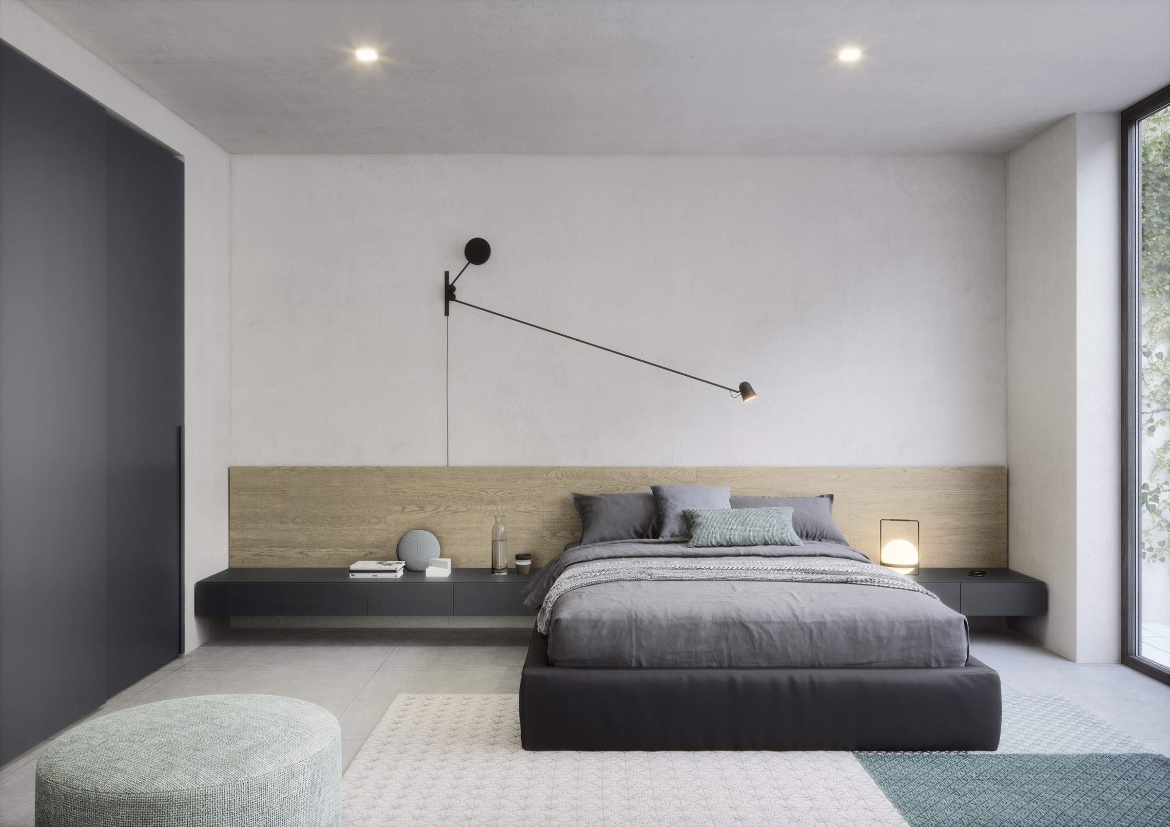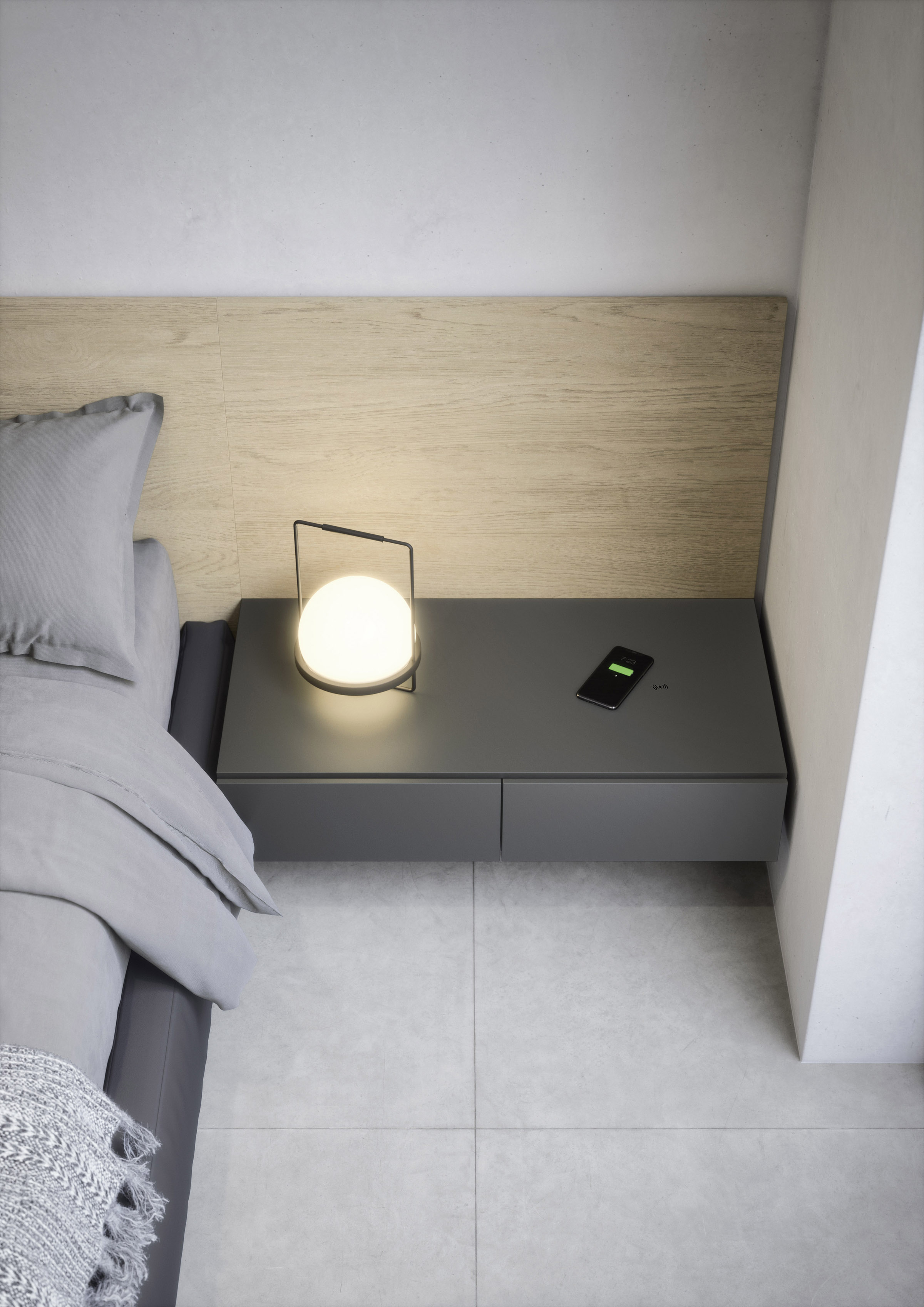 The Space headboard enhances the bedroom with its decorative functionality. It can accommodate Duo metal shelves or a clothes rack, serve as wall paneling, or a padded version in removable fabric. Available in various finishes with optional LED backlighting.