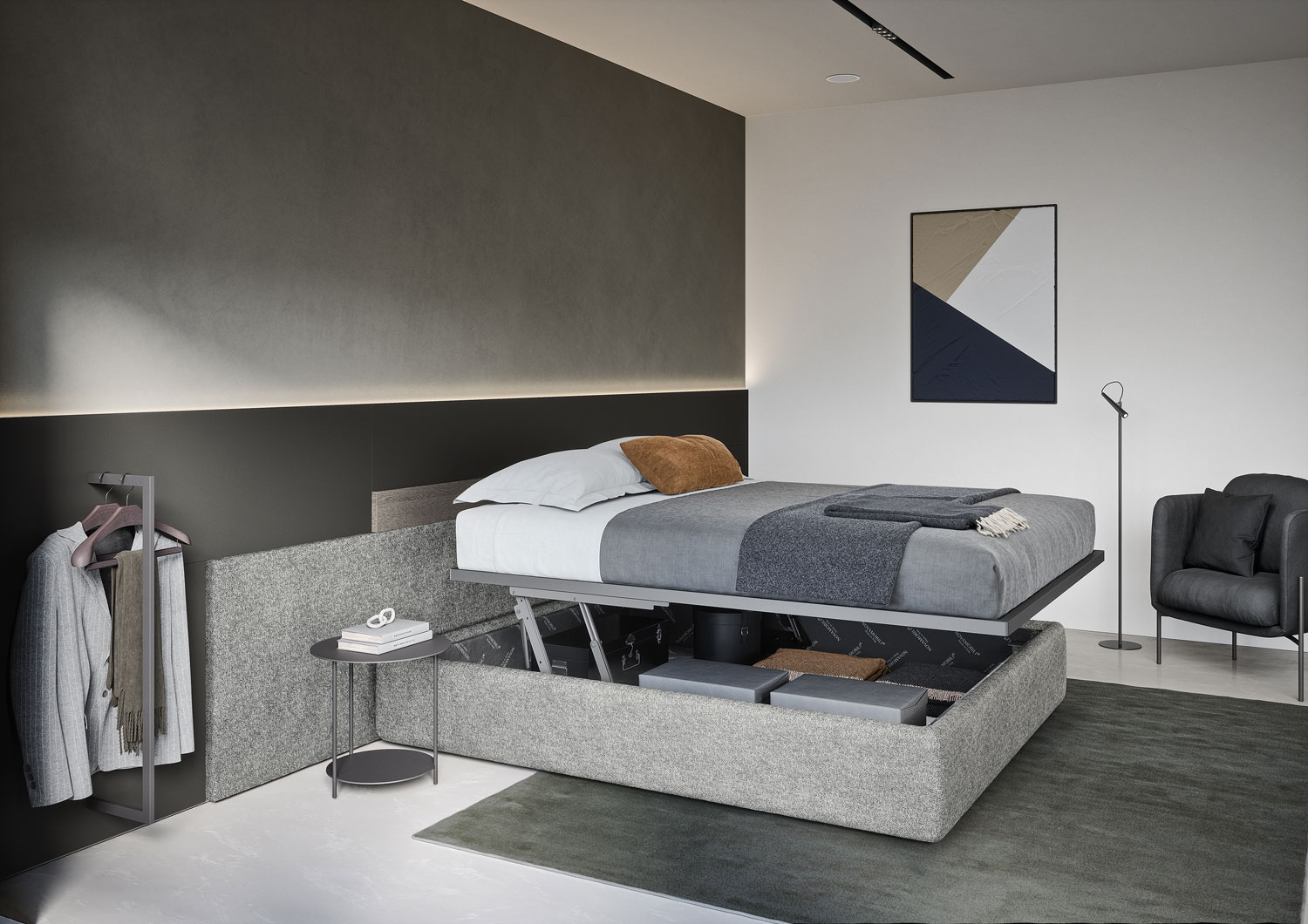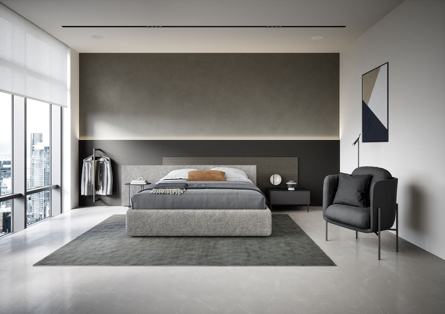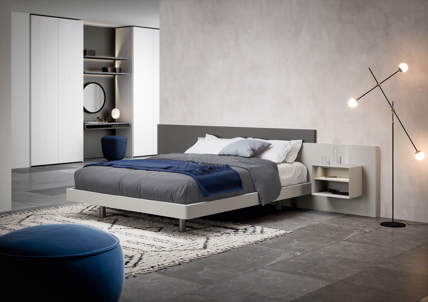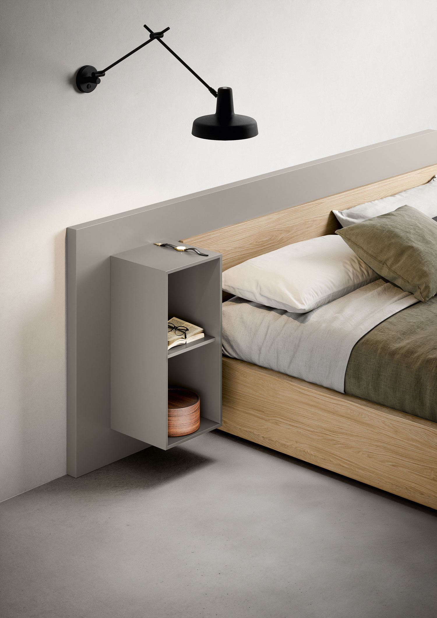 The Time wall-mounted headboard features two overlapping panels of varying heights, allowing for mixing two finishes such as imitation leather and removable fabric. It integrates with optional wall units like Box 12 and Tetris, enhancing bedroom versatility with varied bed surround combinations.