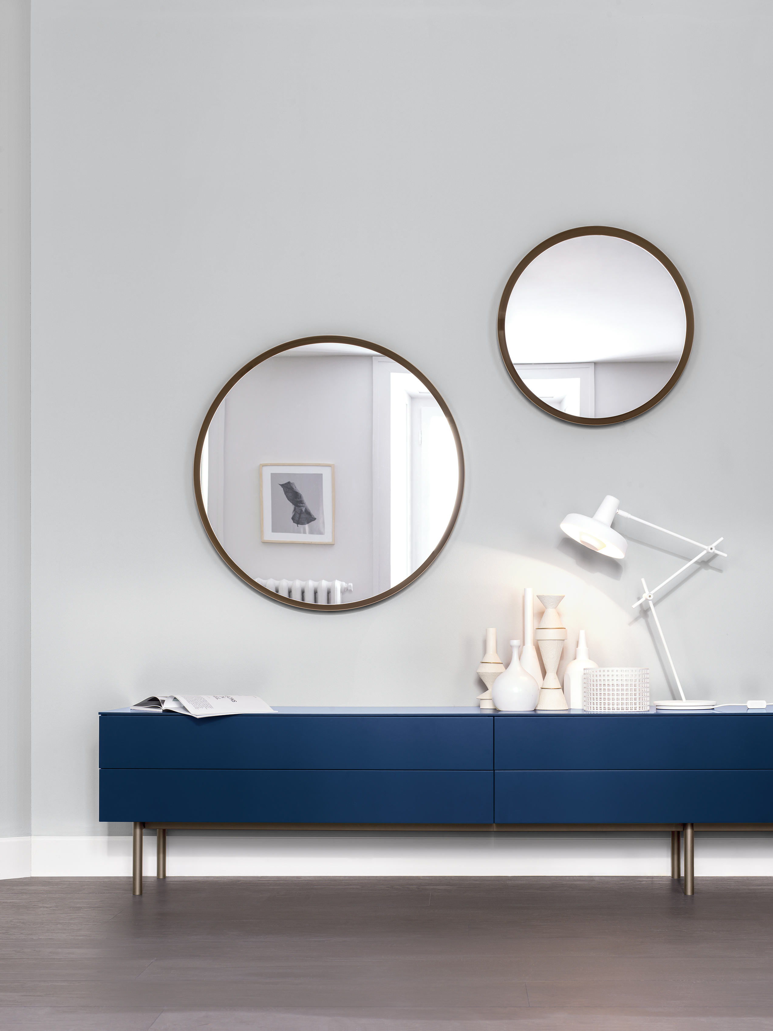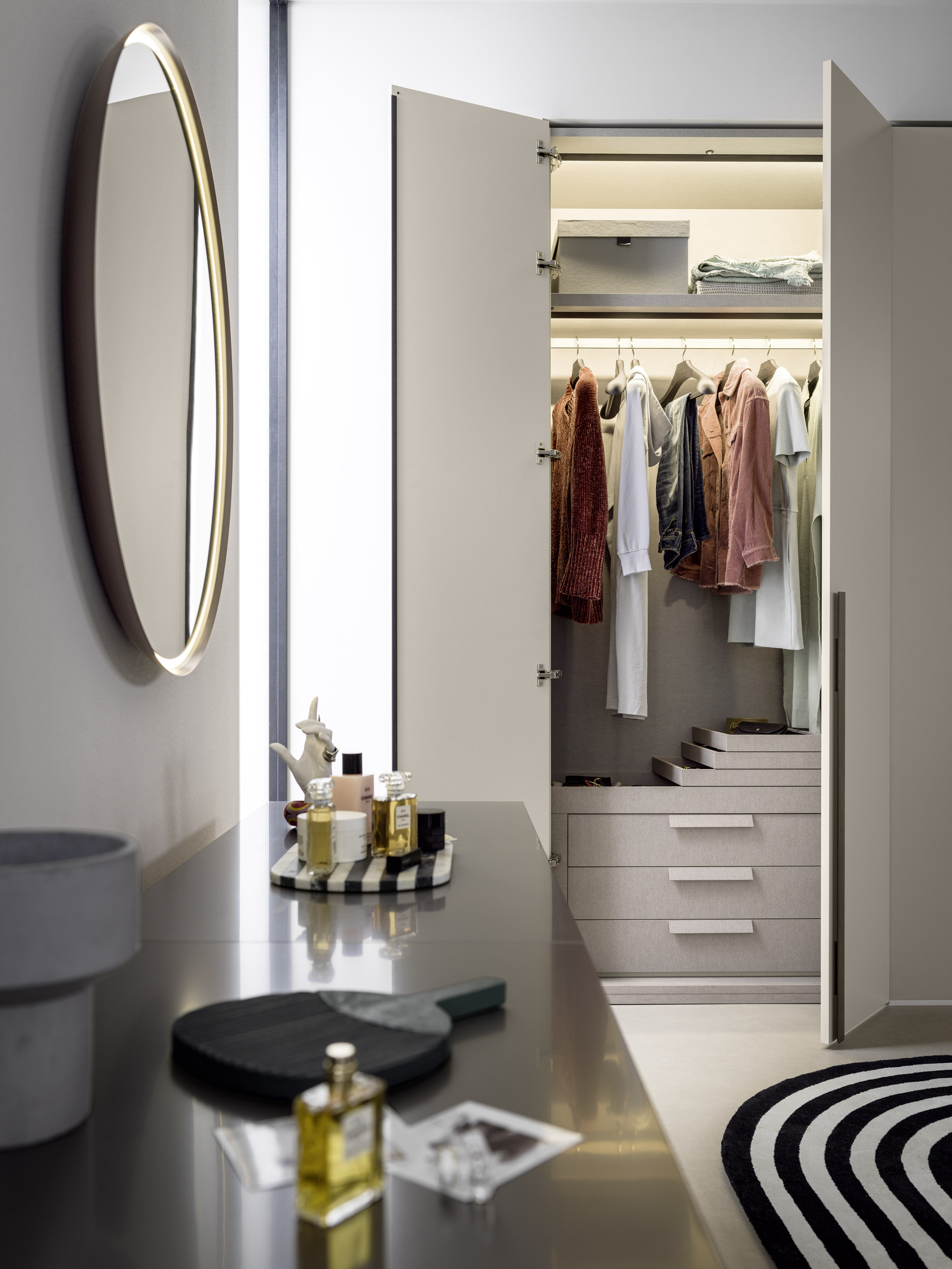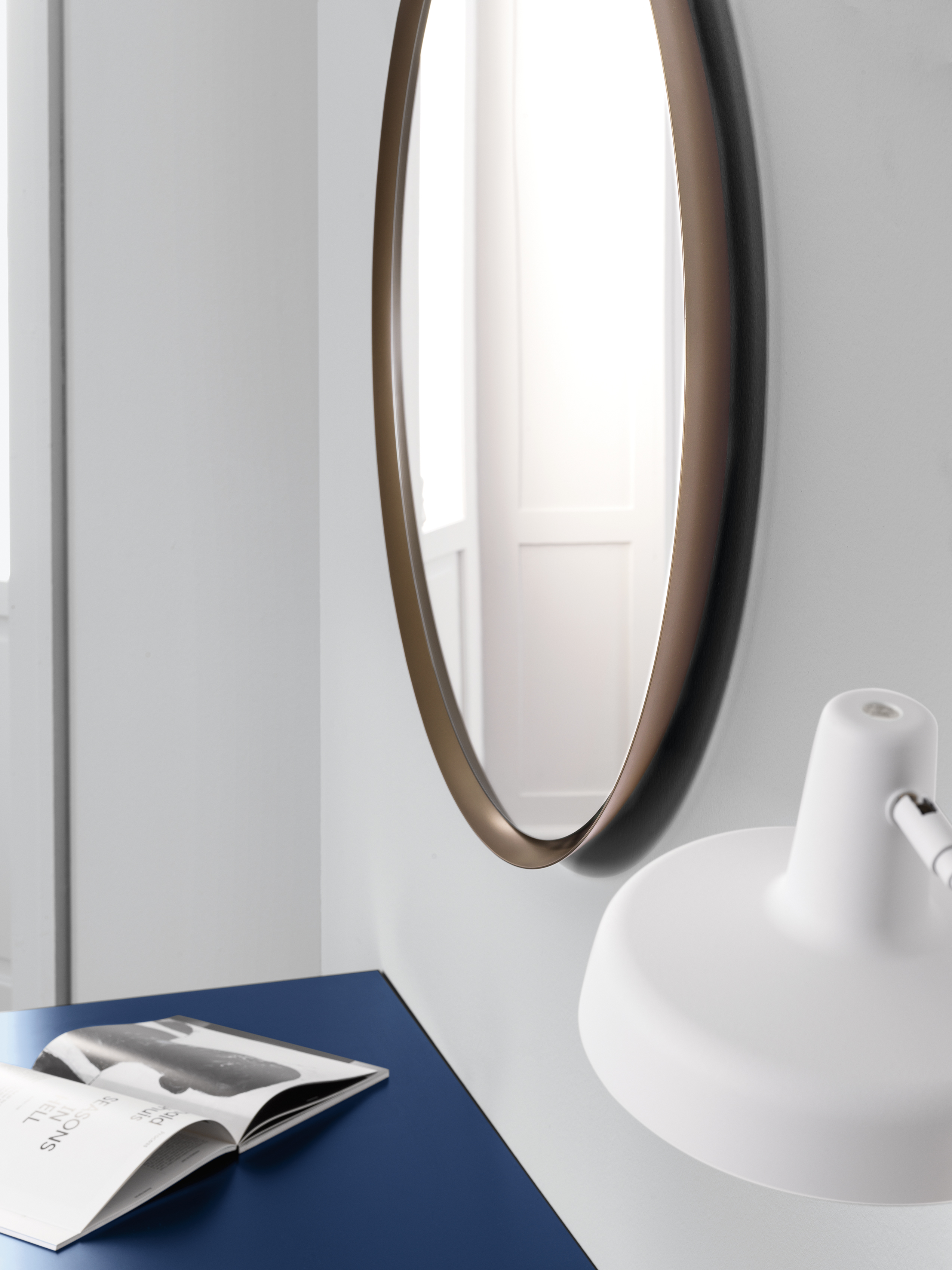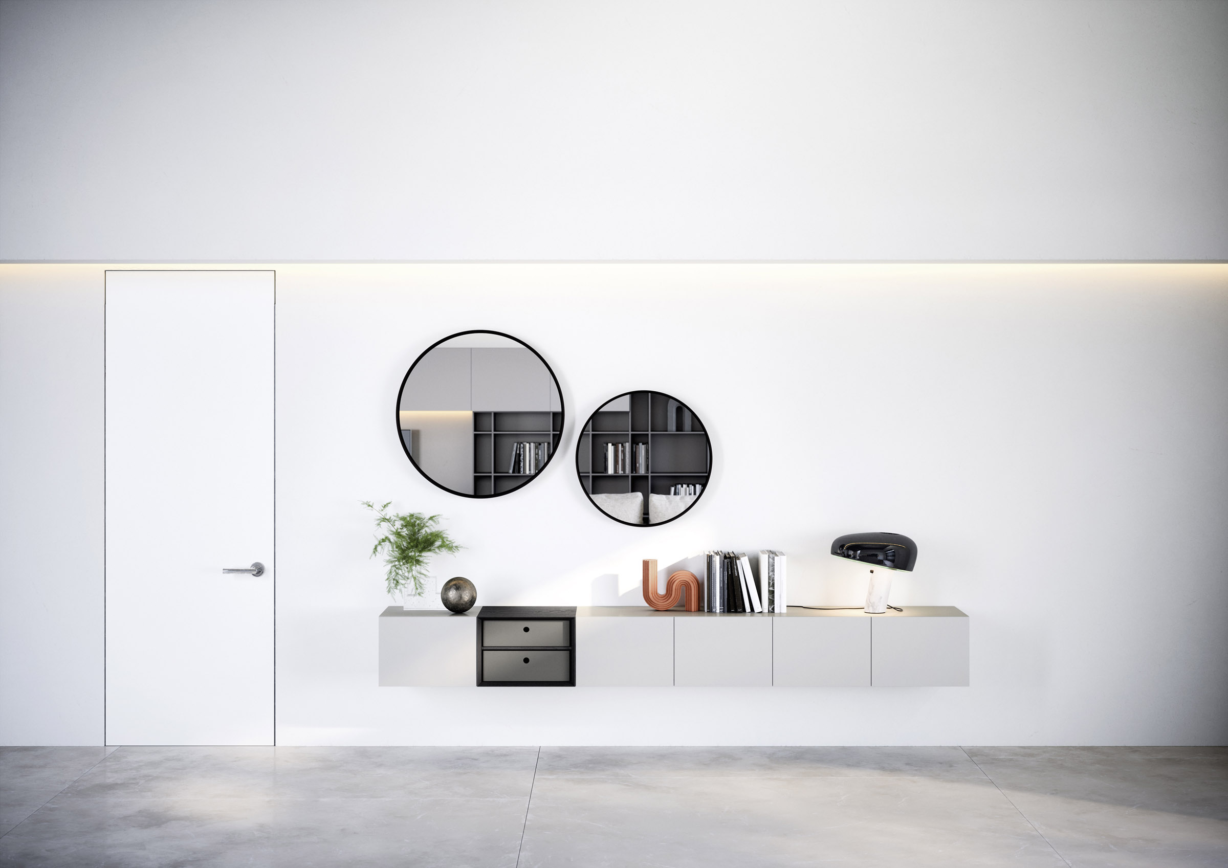 Deep is a circular mirror available in small and large sizes. It features optional built-in lighting and can be customized in various matt lacquered colors to complement furniture in entry halls, lounges, or bedrooms.