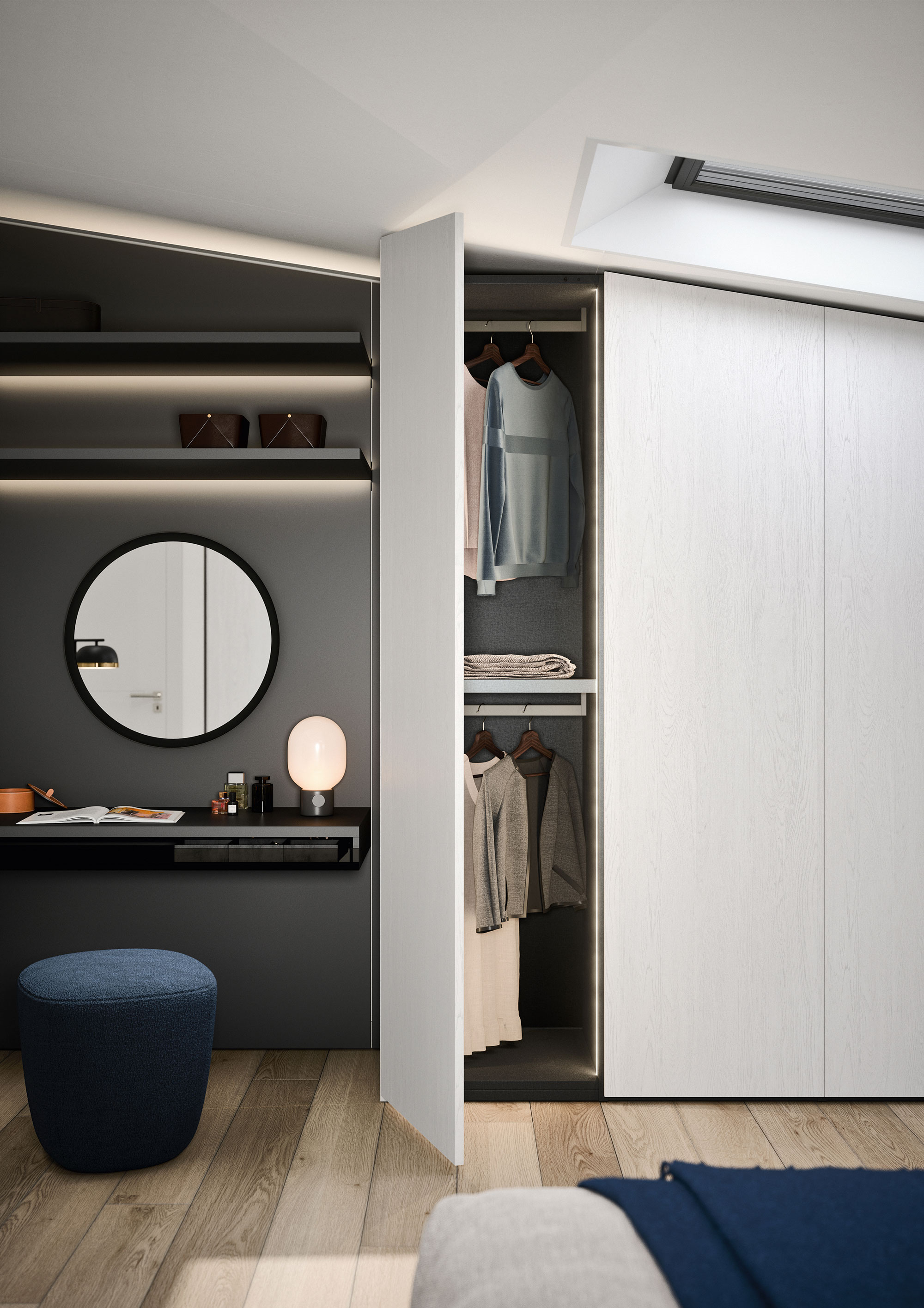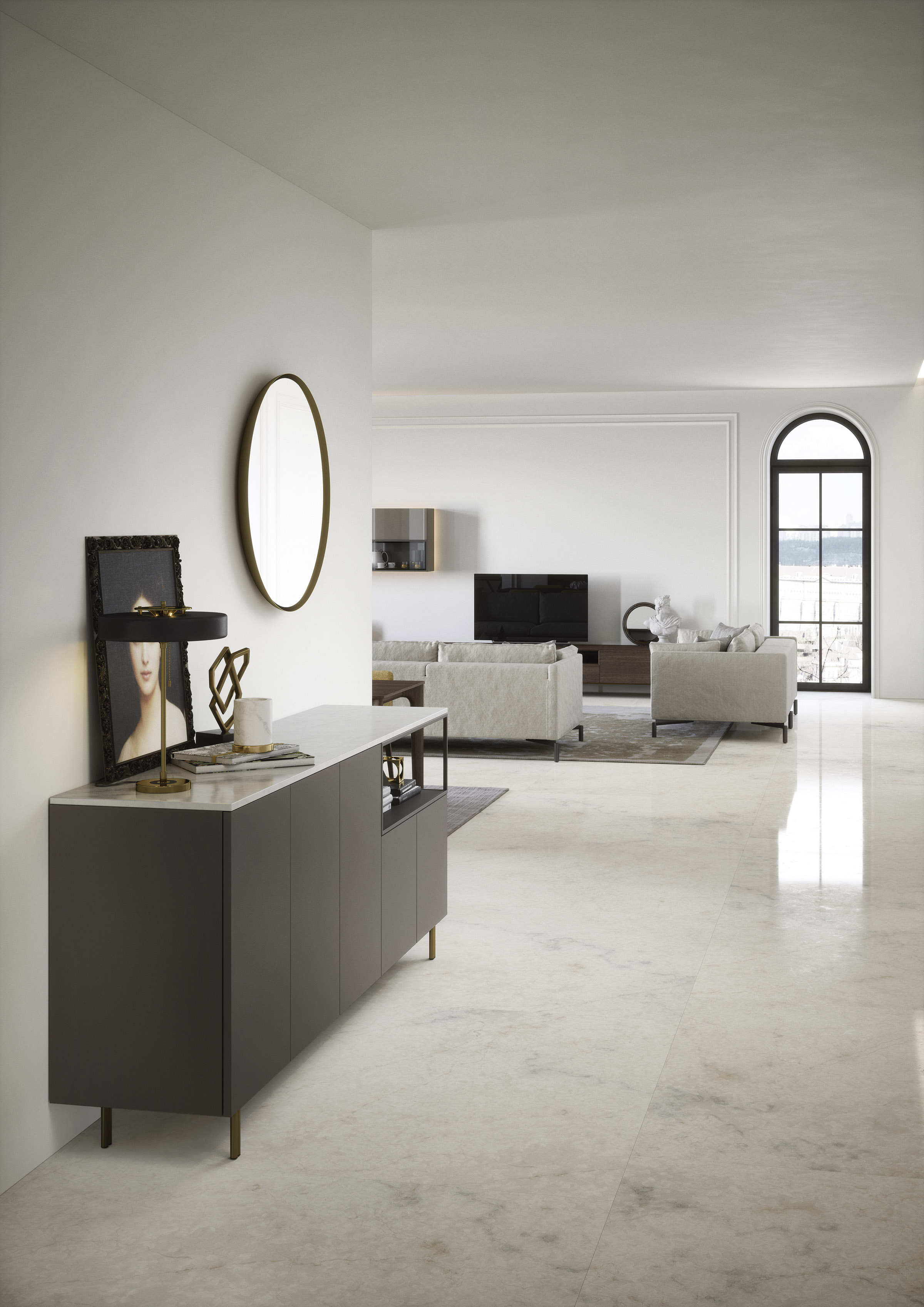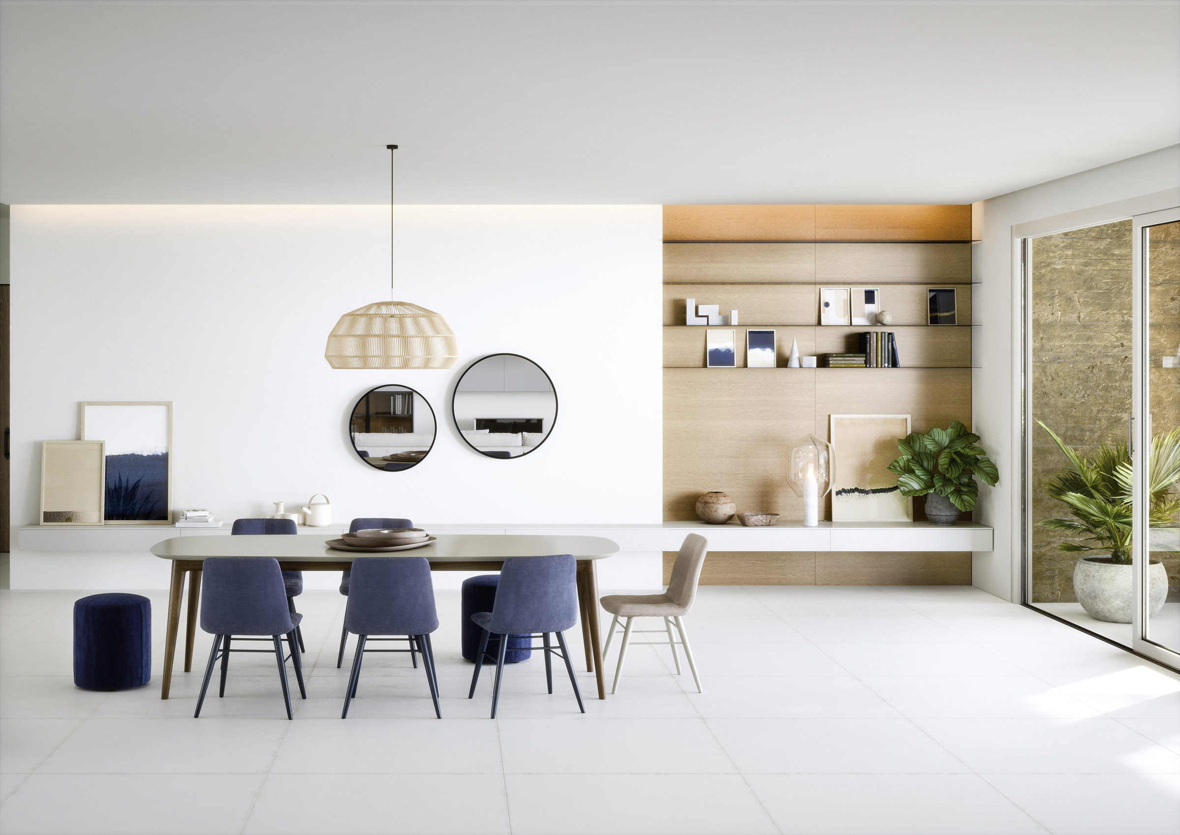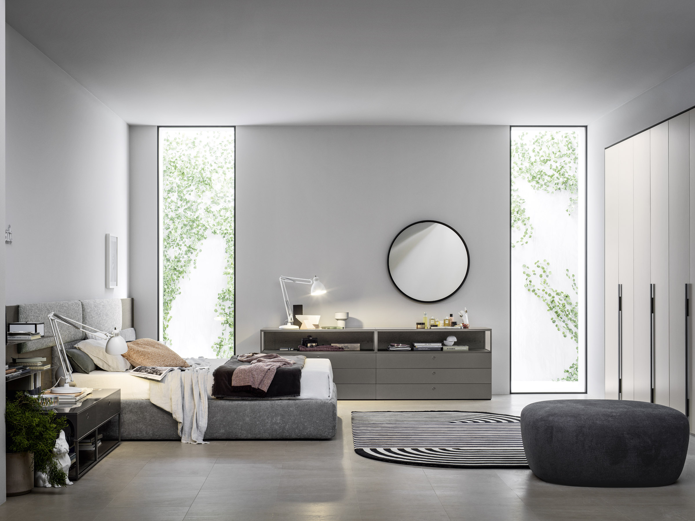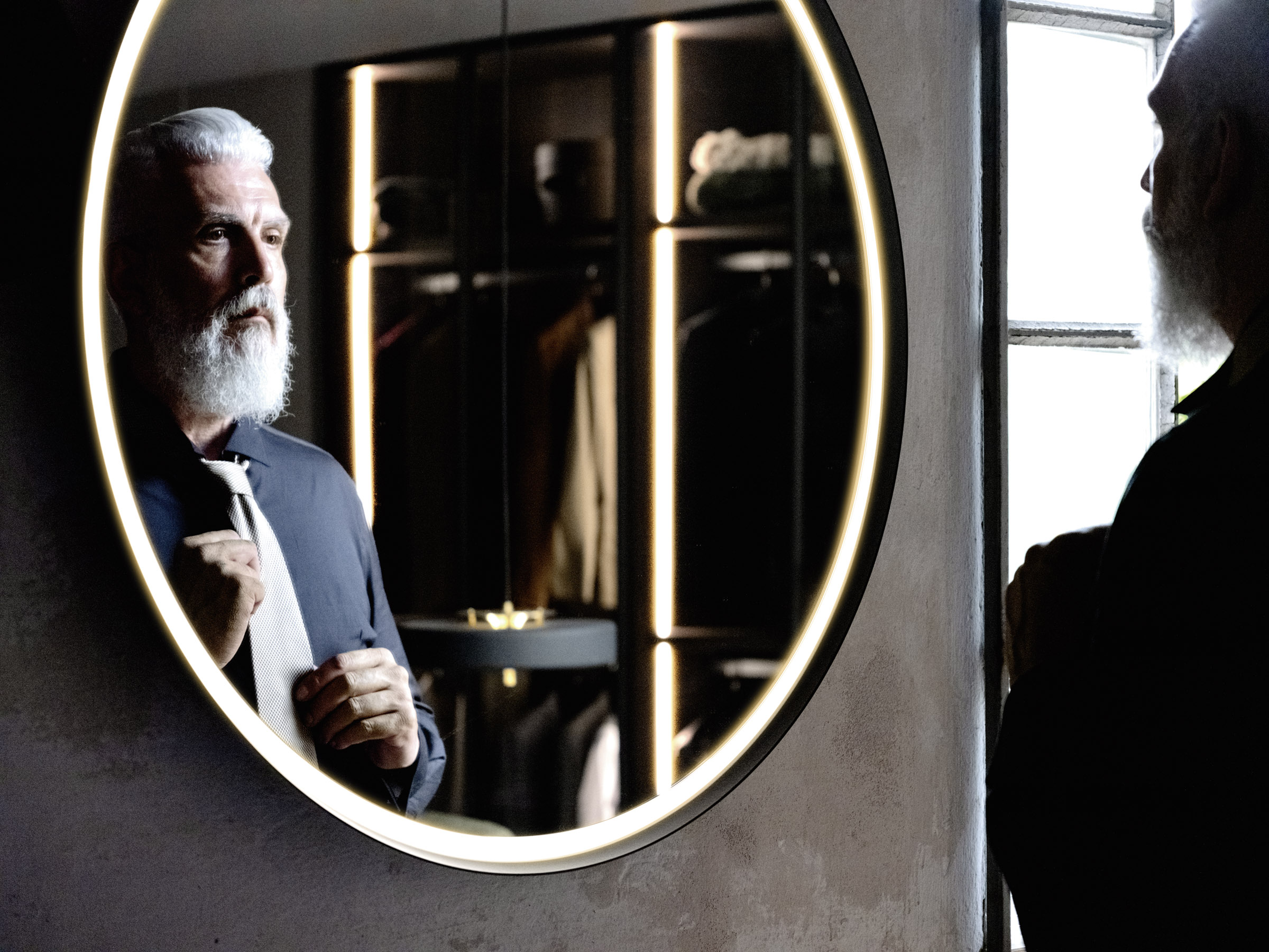 Deep is a circular mirror available in small and large sizes. It features optional built-in lighting and can be customized in various matt lacquered colors to complement furniture in entry halls, lounges, or bedrooms.