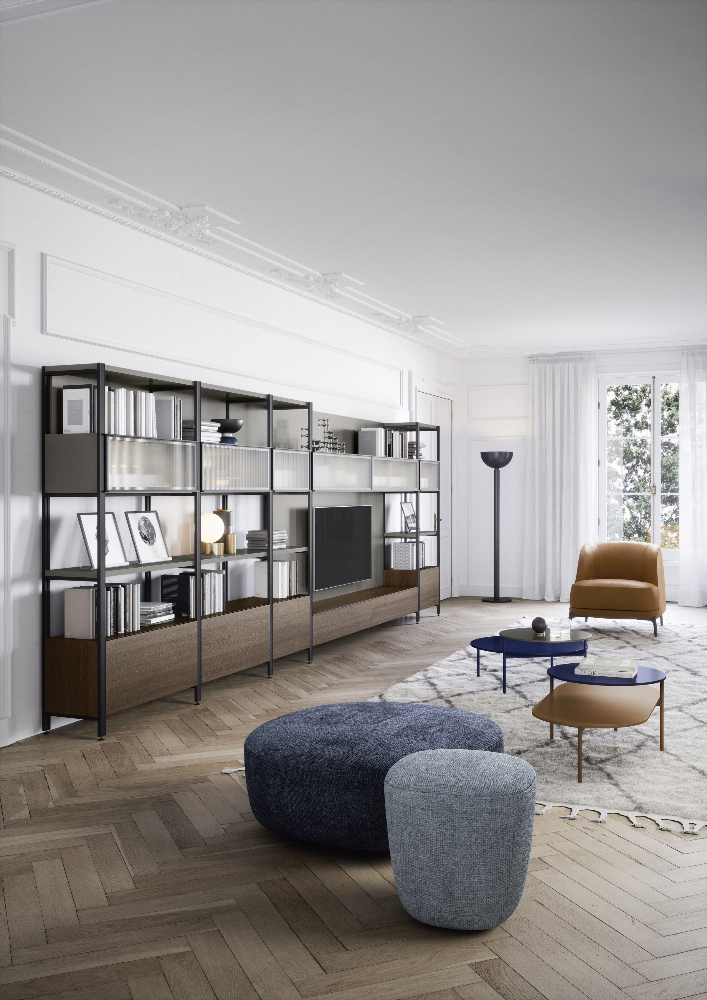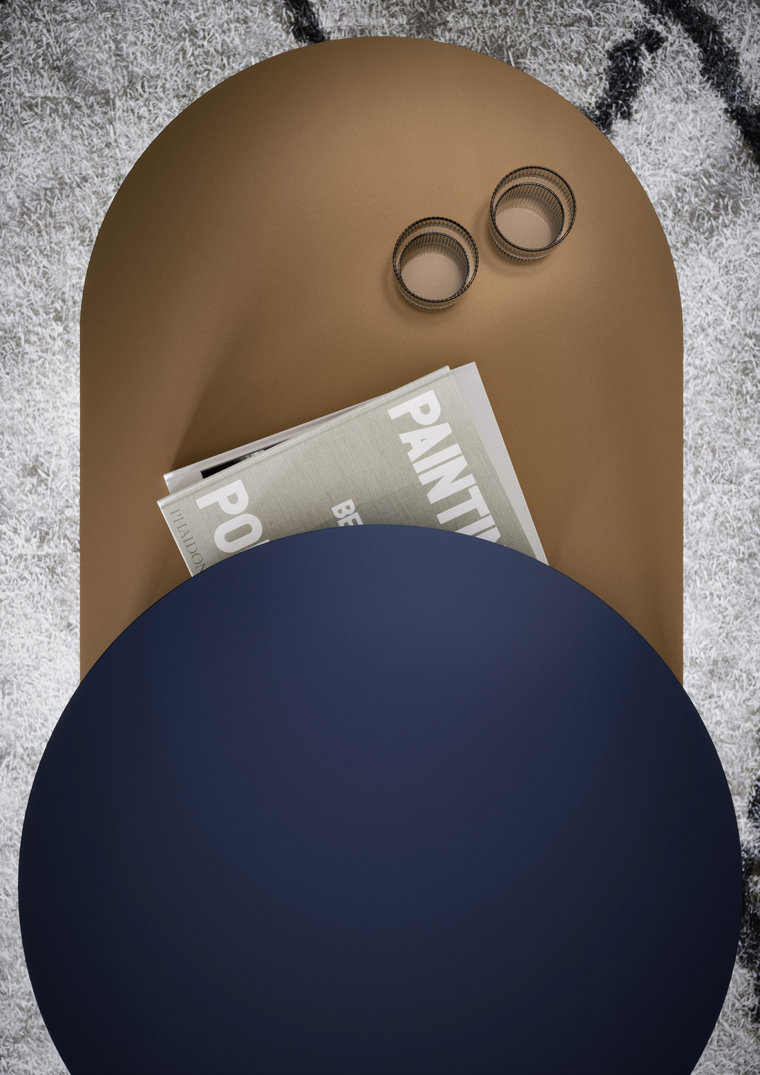 The Kin coffee table, envisioned by Zanellato/Bortotto, boasts an elegant design intended to command attention in any living room. Its slender metal legs uphold dual tops arranged at varying heights in four distinct setups.