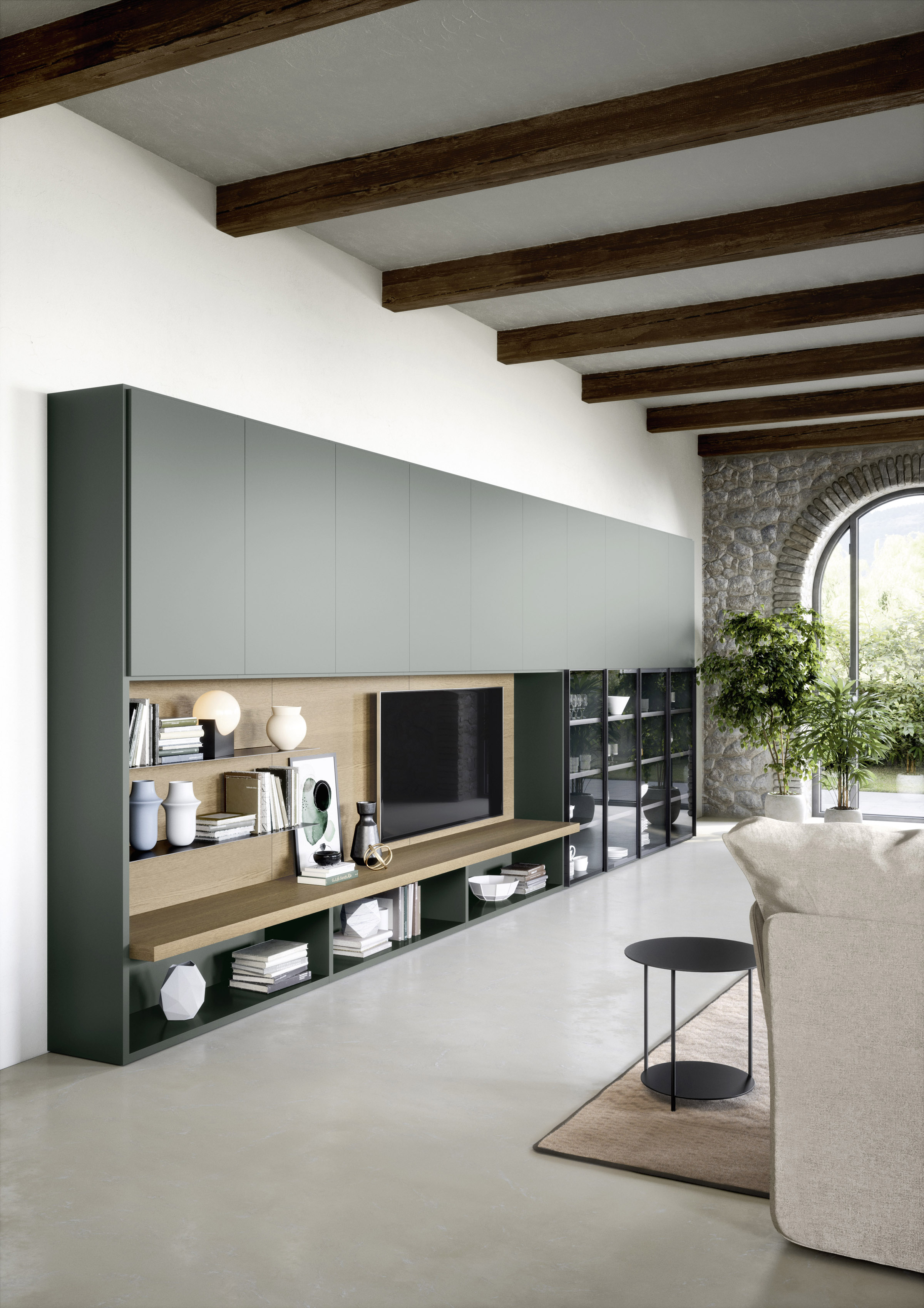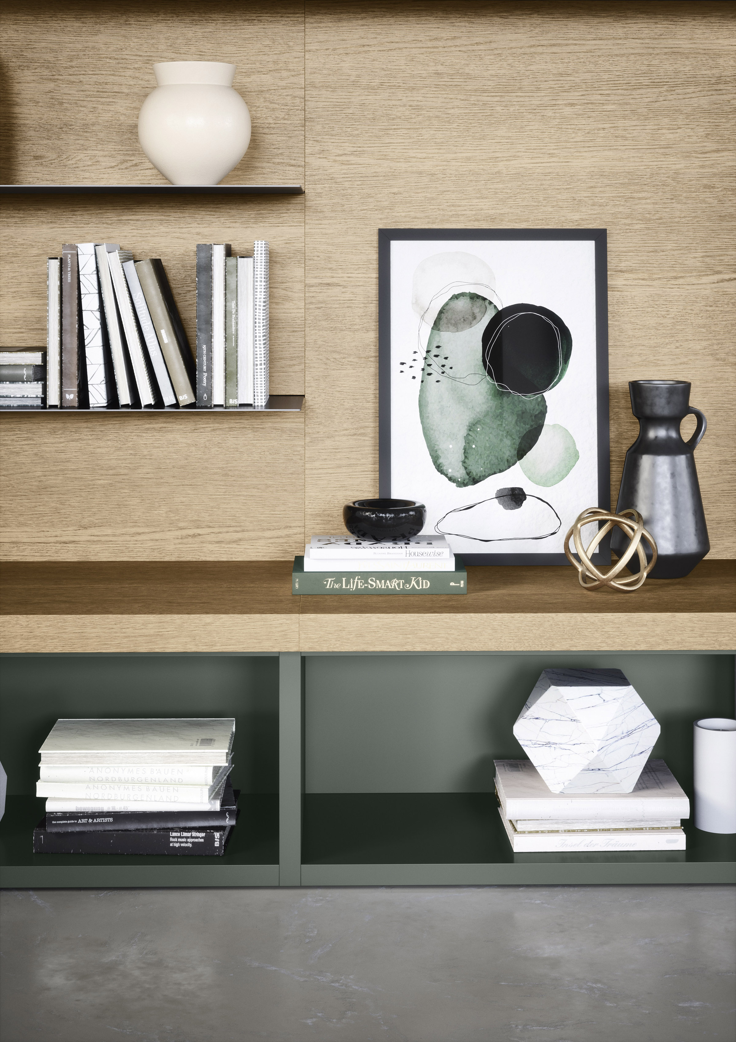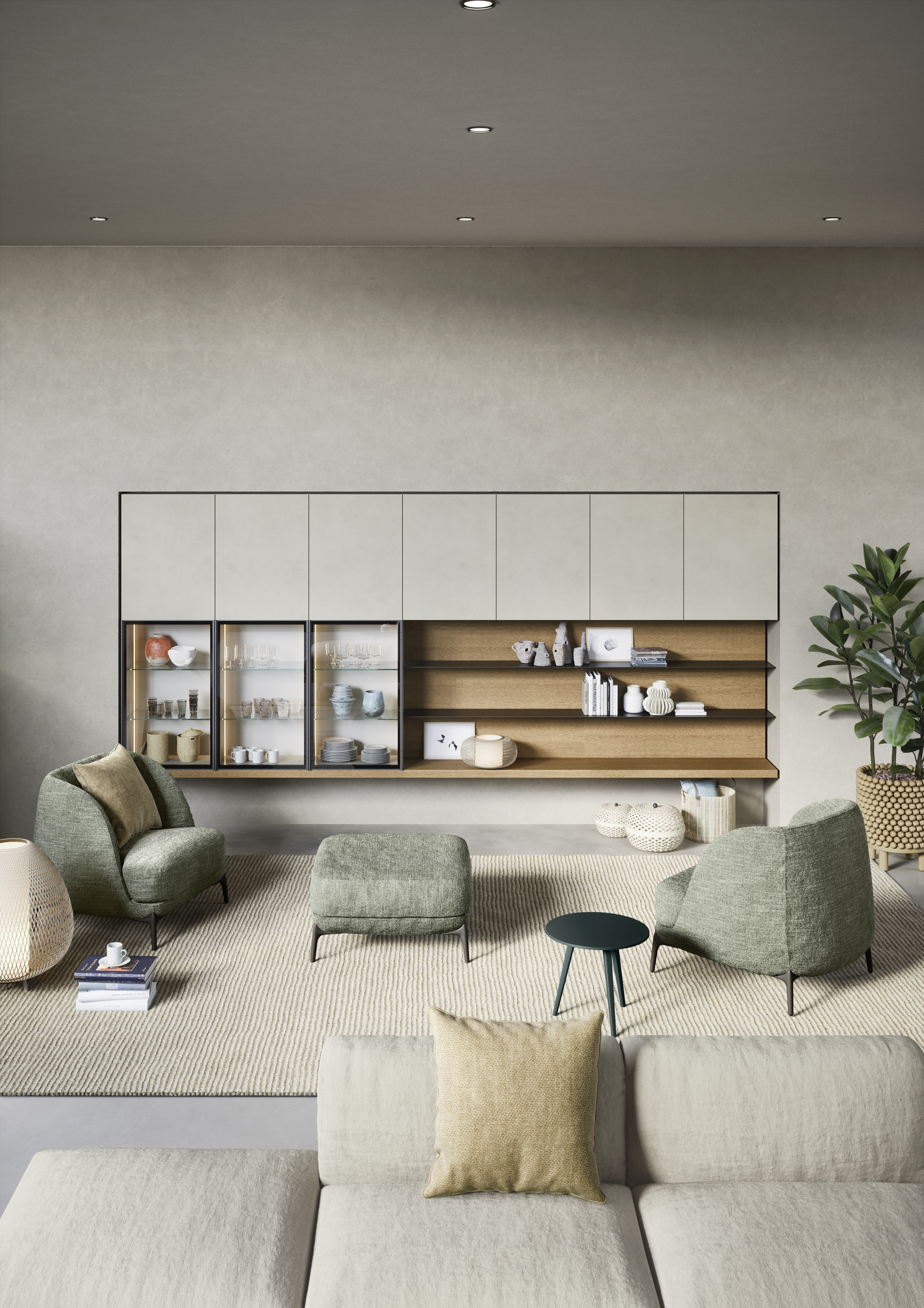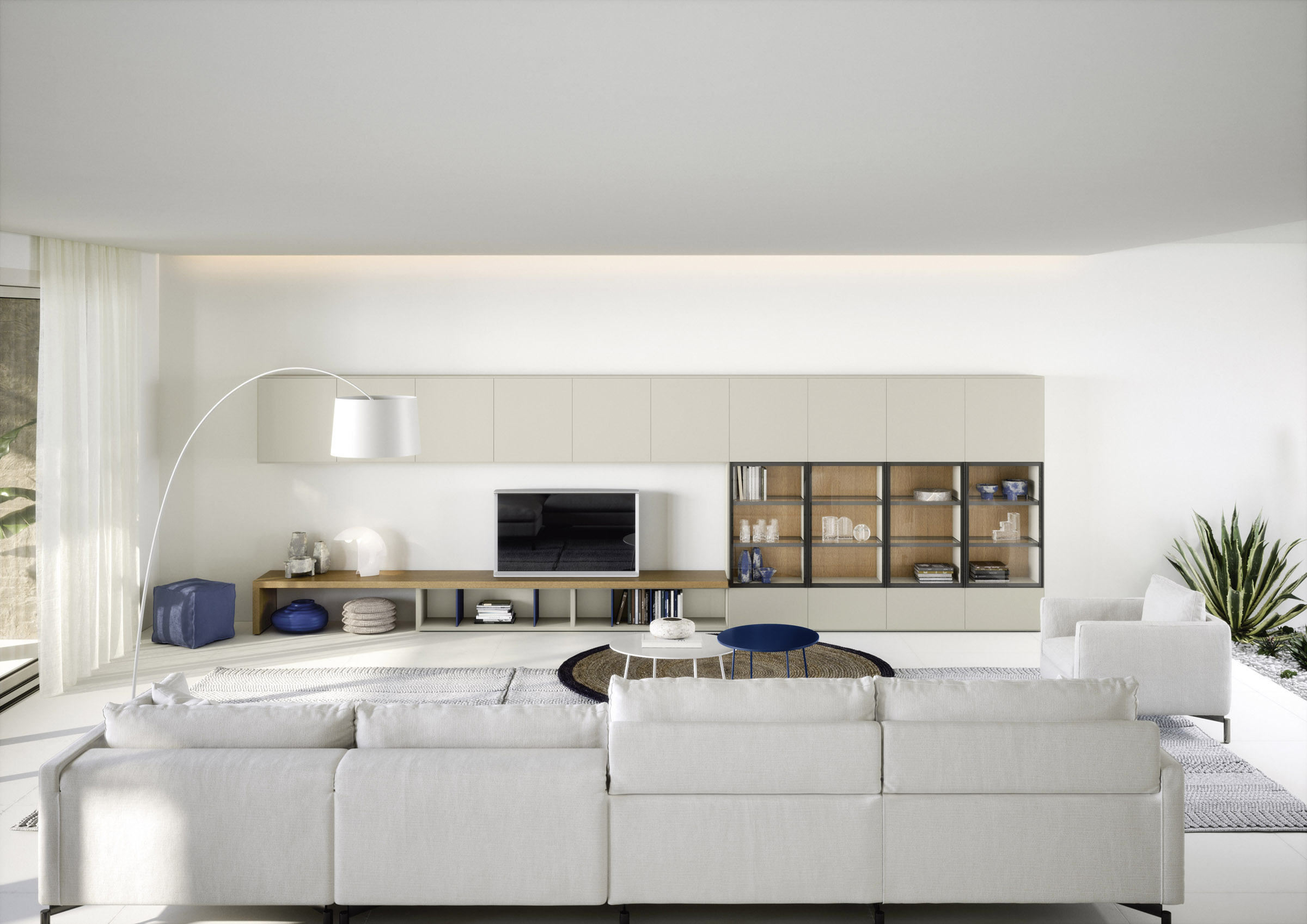 Shelves and wall-mounted tops, featuring a minimalist design, effectively transform living room walls into stylish display areas. Available in a variety of sizes, thicknesses, depths, and finishes, they offer versatile options for showcasing decor.