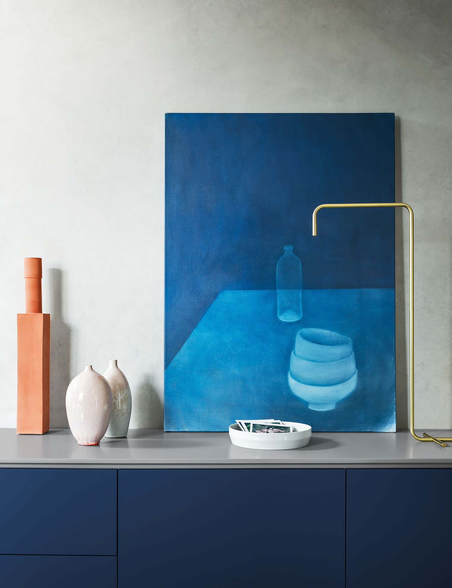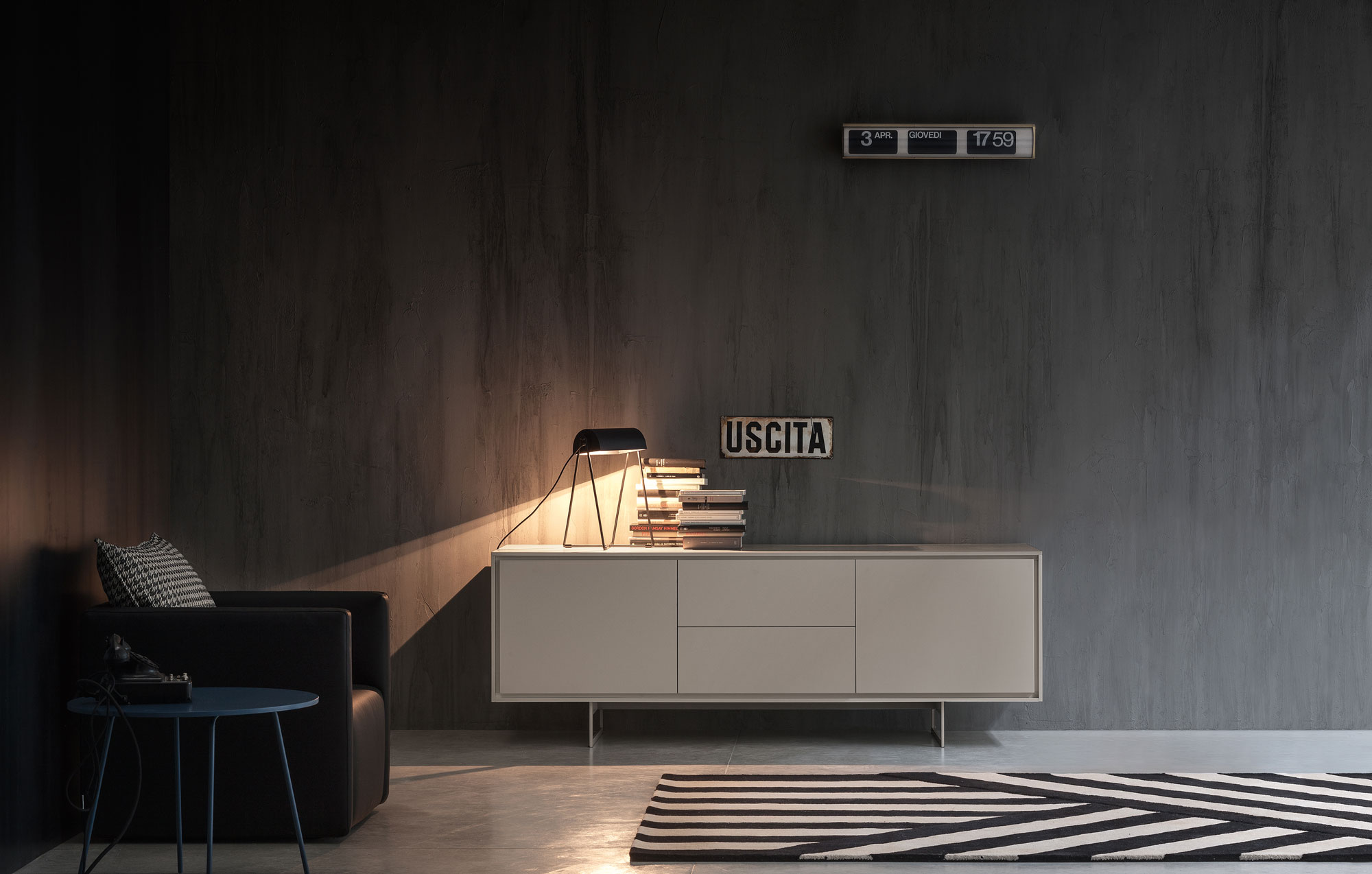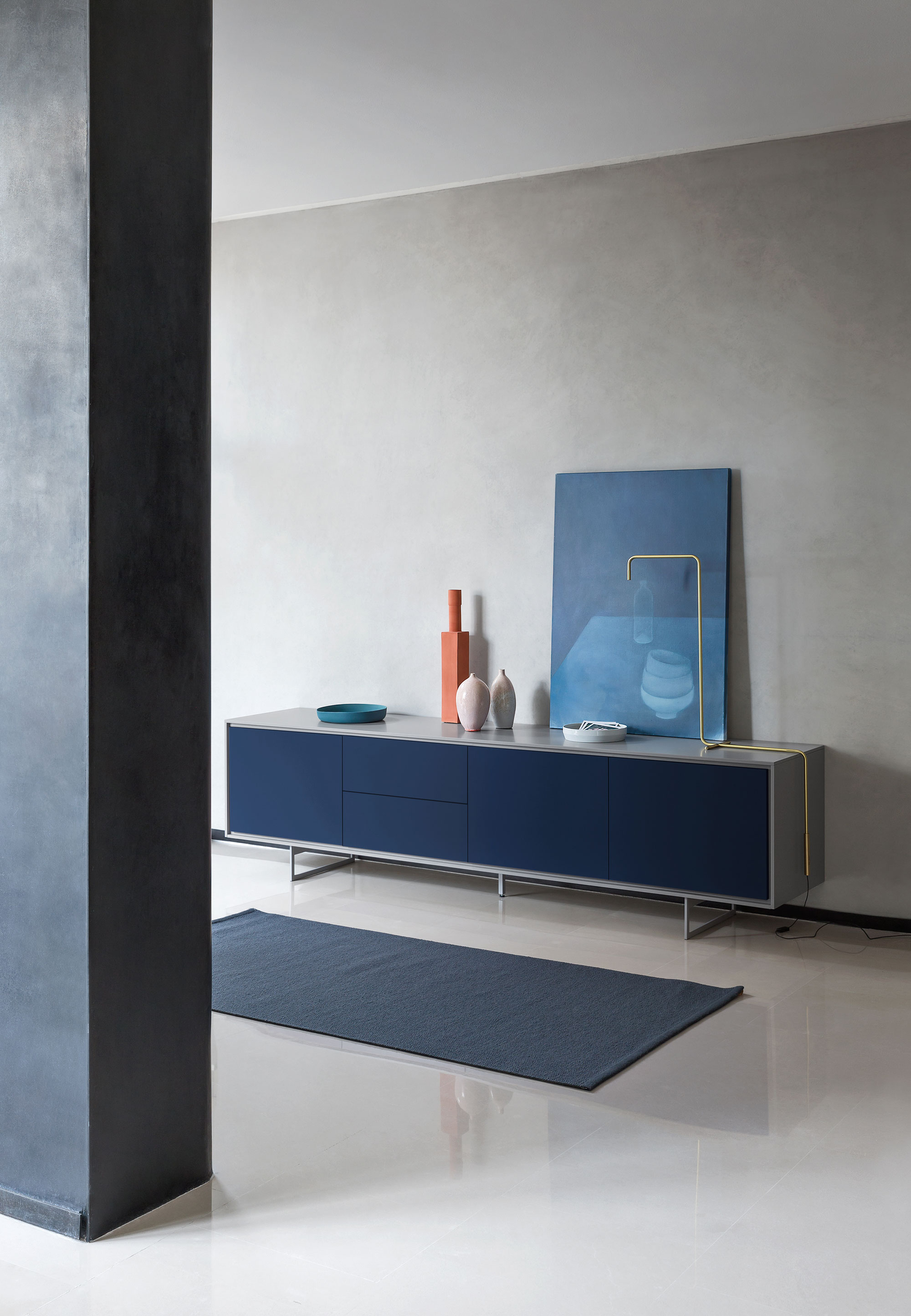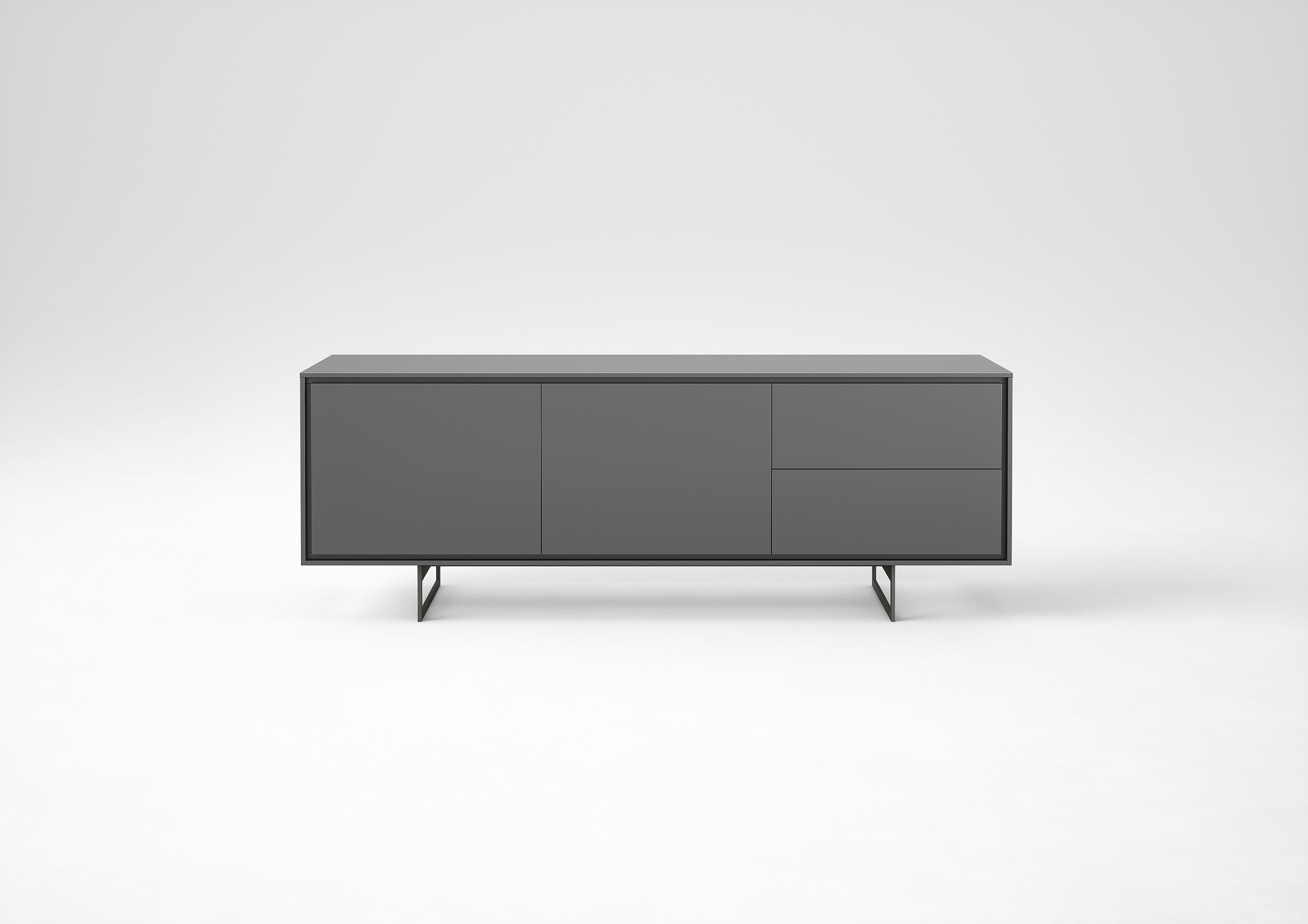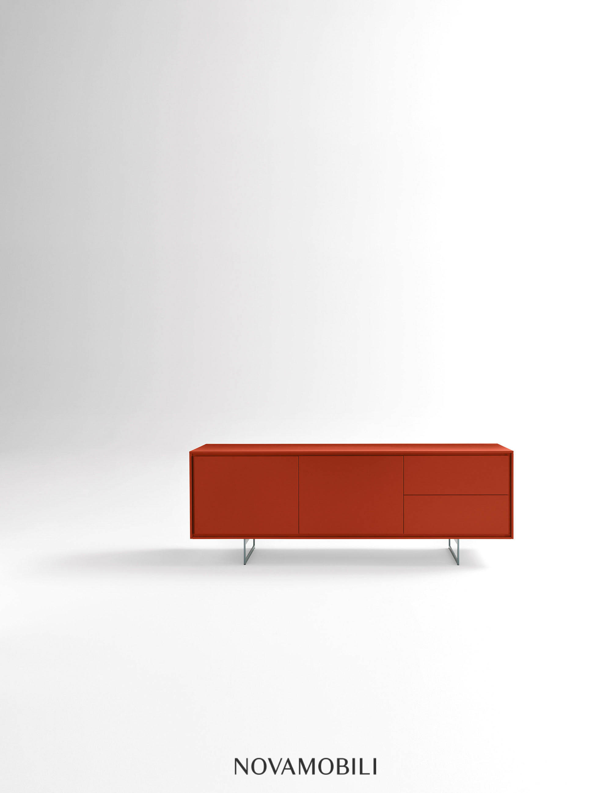 Standing on slim chrome or lacquered metal legs, the Shadows sideboard features a profile that runs all the way around the edge of the doors and drawers. It is available in any of the matt lacquered finishes.