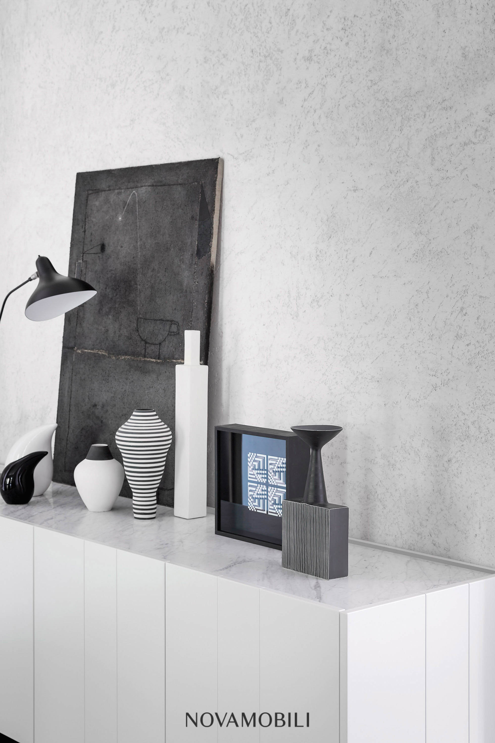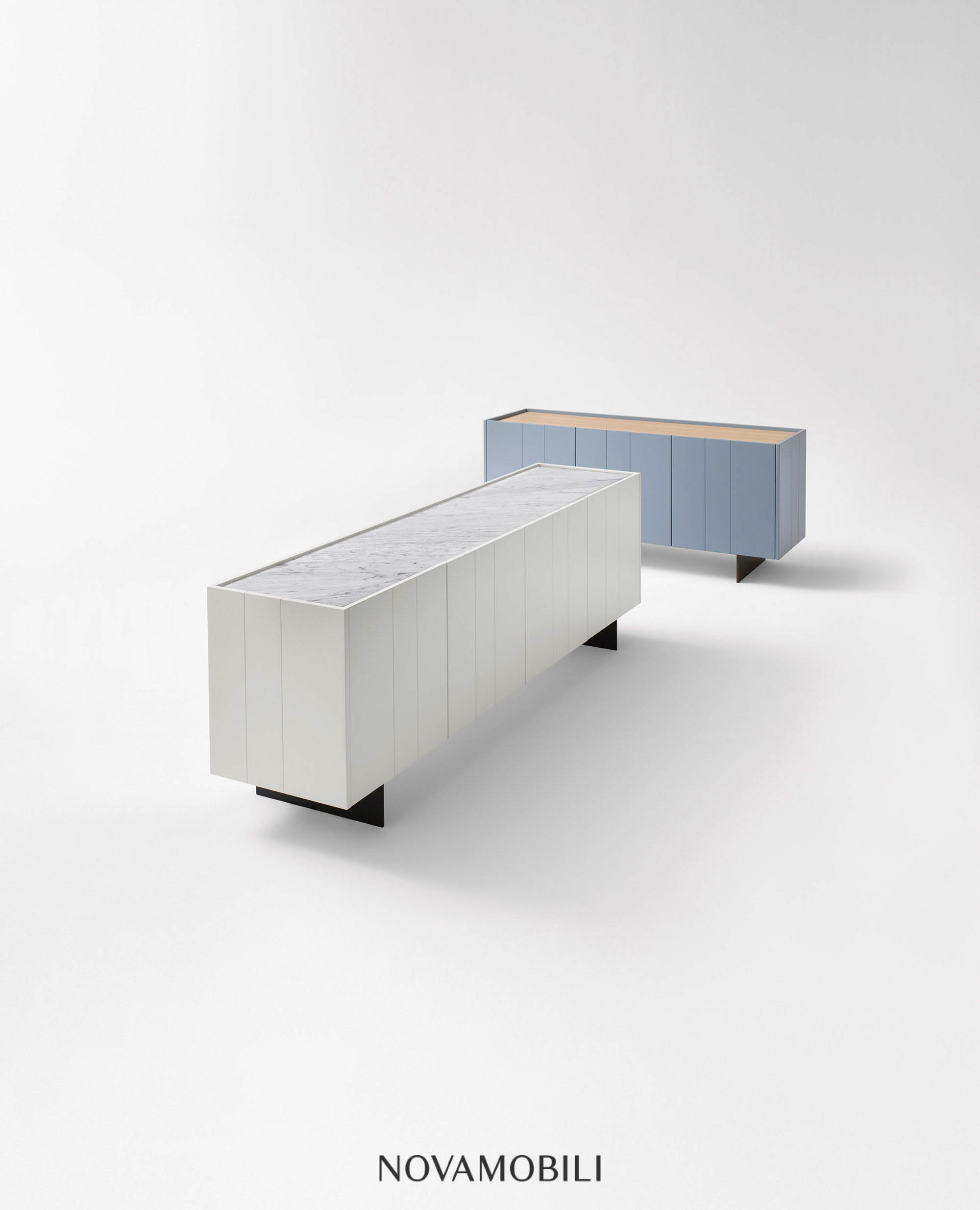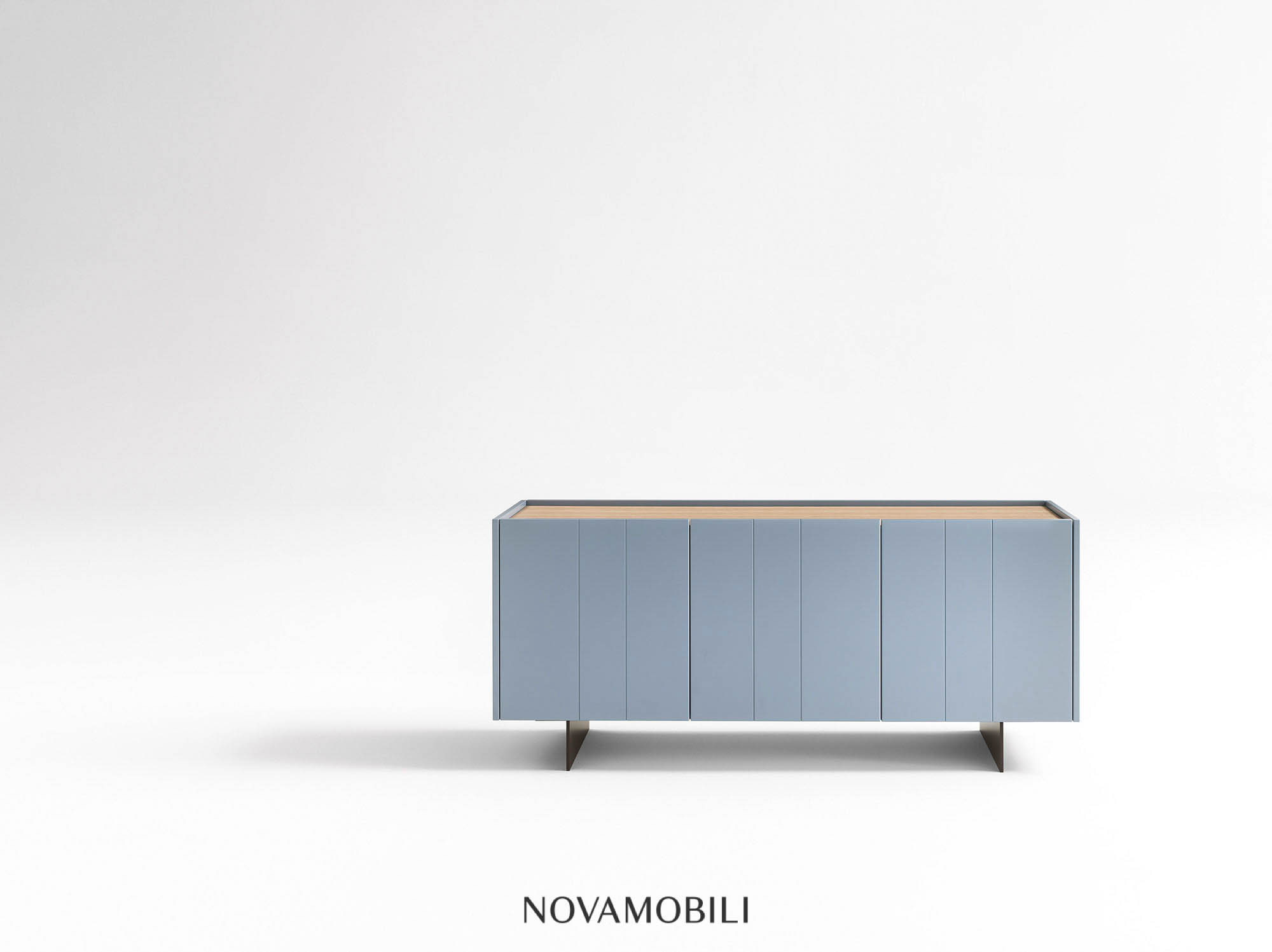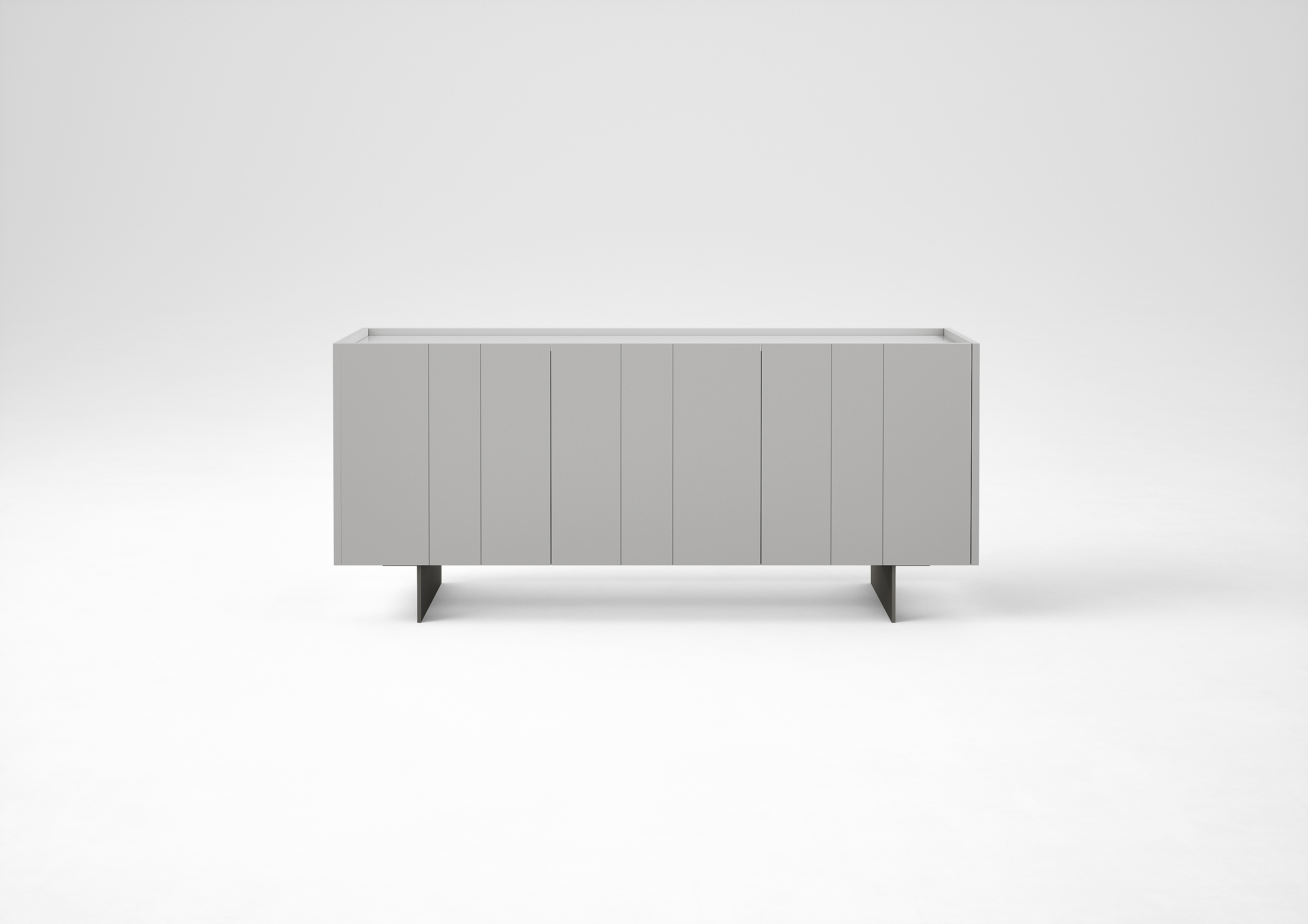 The run of vertical lines brings rhythm and movement to the Stripe sideboard. The tops of its doors can be gripped for opening, and the sideboard stands on vertical blades of chrome-finish metal. It is available in any of the matt or gloss lacquered colors.